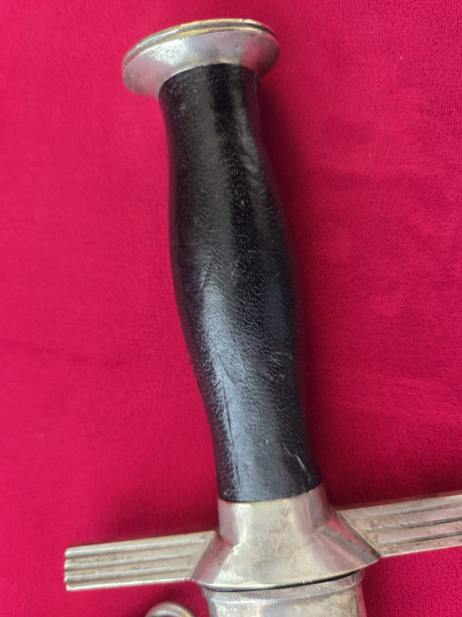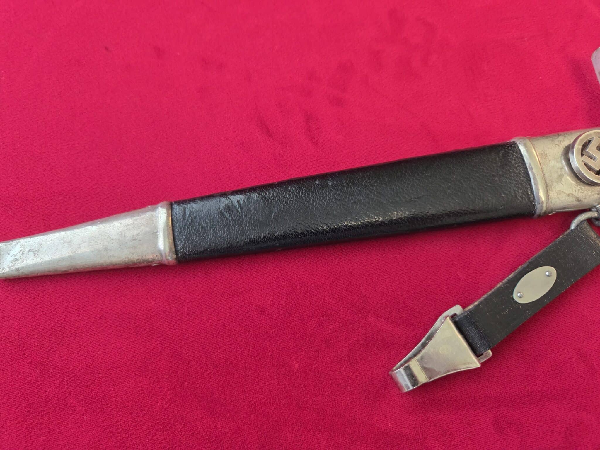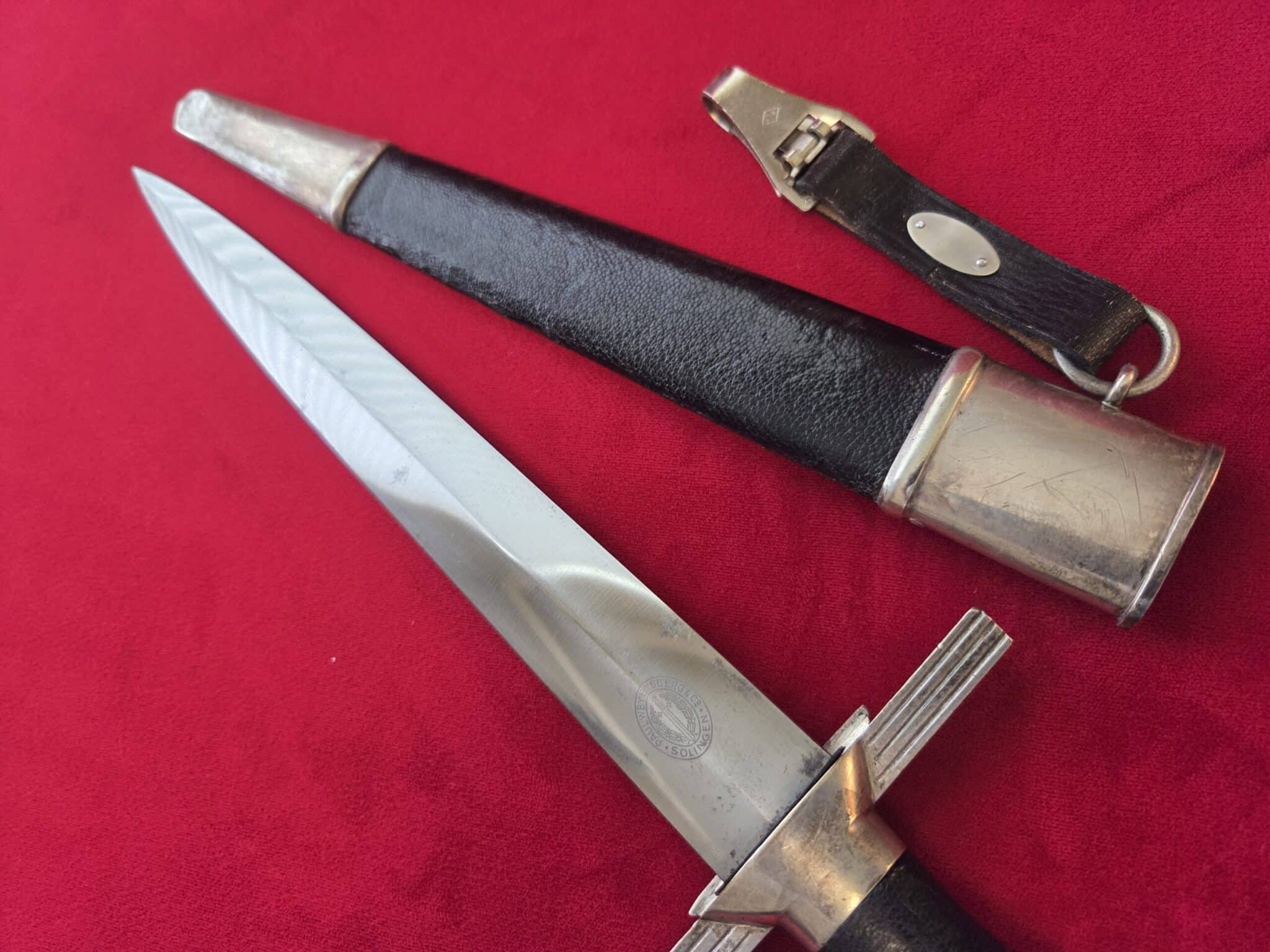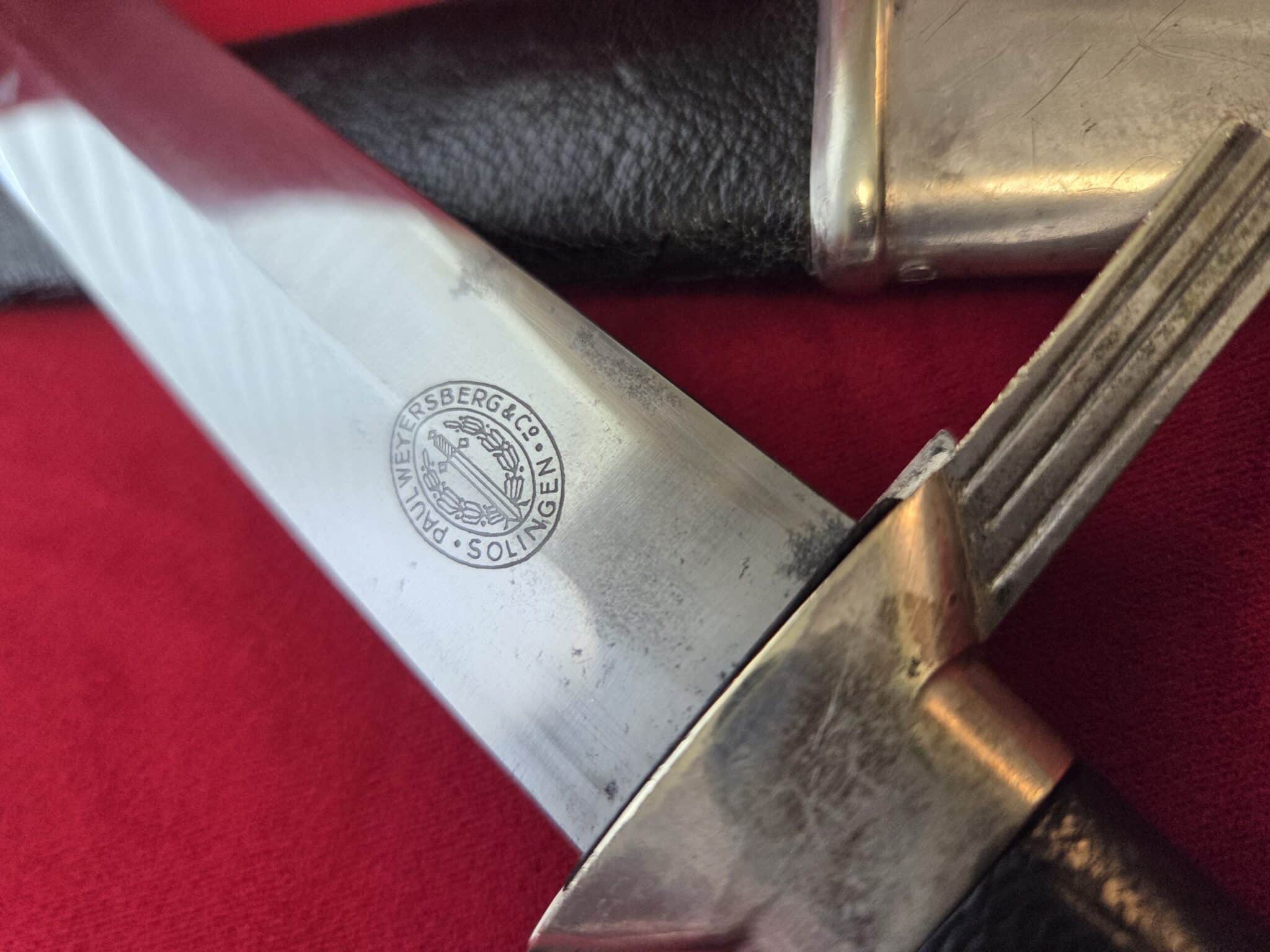 Paul Weyersberg & Co./Solingen in double ovals around the firm’s trademark “Sword-and-Wreath” logo. Hilt fittings show age/wear. The crossguard has the art deco stylized RLB eagle on obverse langet. Black wooden grip shows minor wear, some small indentations on both sides but no cracks or chips. 1st pattern RLB insignia is properly pinned to the obverse grip and shows no wear to enamel. Blade grades EX++ showing light surface wear/runner marks and speckling but no nicks to the cutting edges or damage to the black leather buffer pad. Black leather scabbard shows wear but no tears. Scabbard fittings have all screws in place and lower fitting tip is dented on both sides. Dagger is complete with black leather hanger.