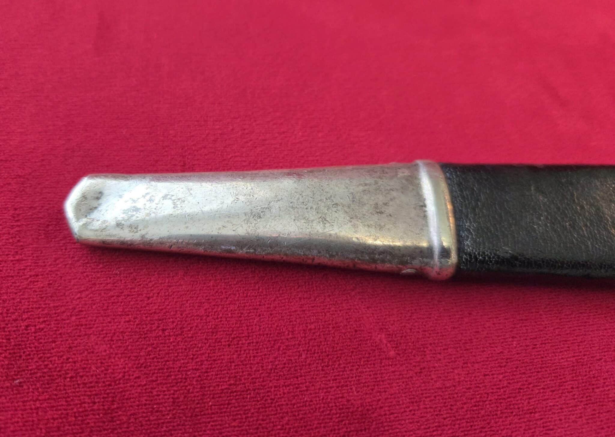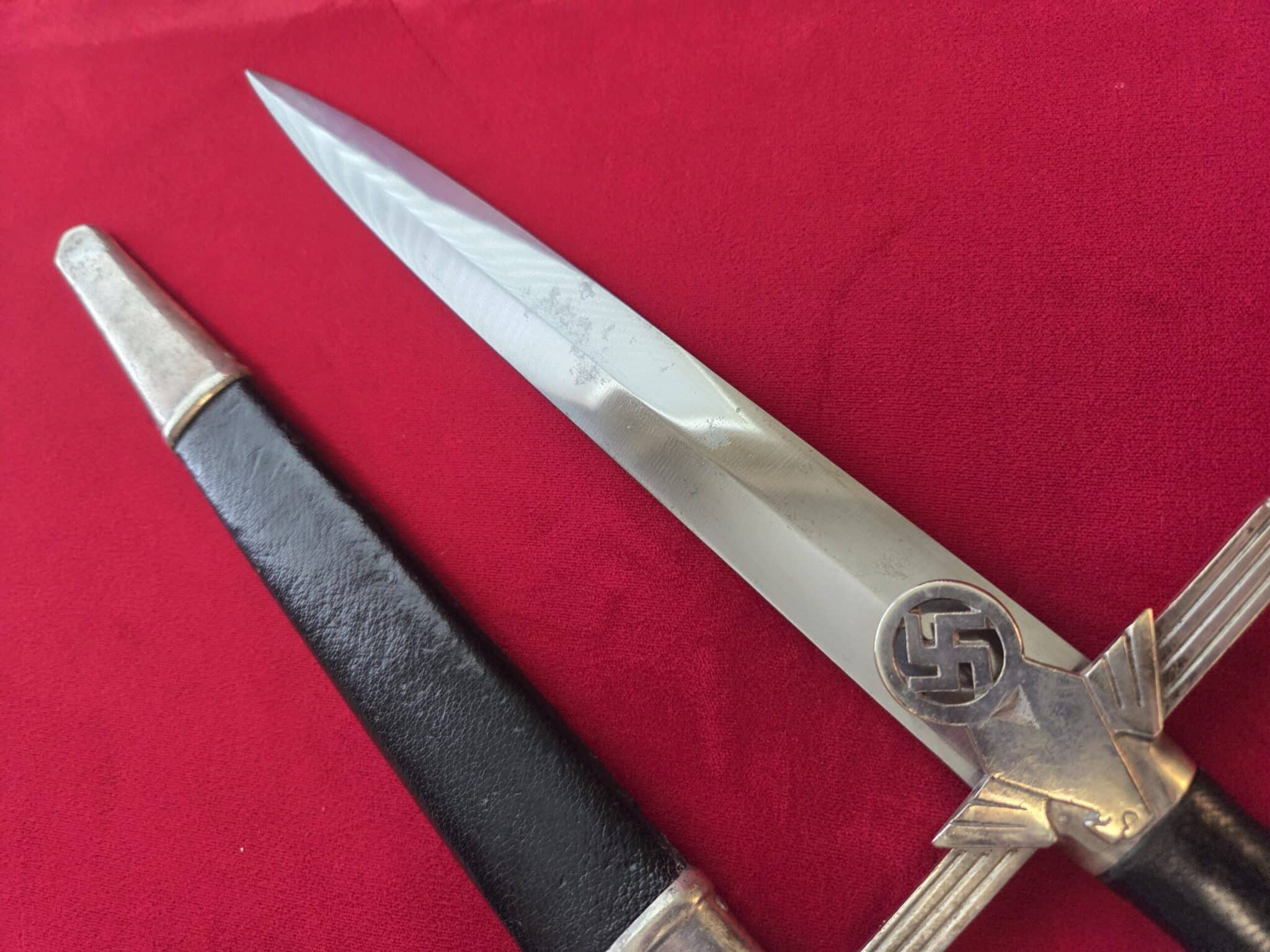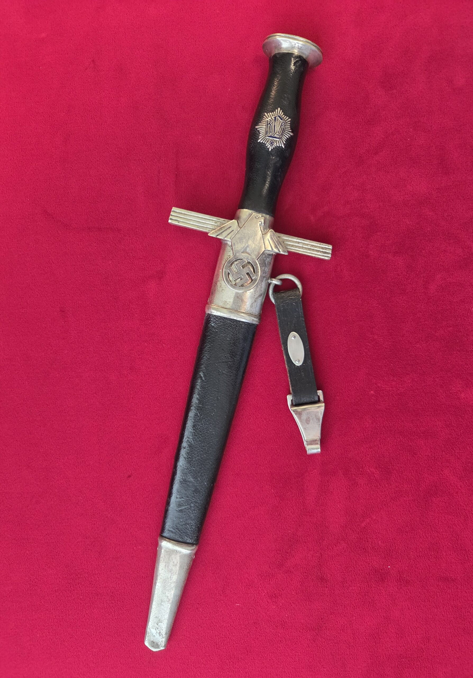 Paul Weyersberg & Co./Solingen in double ovals around the firm’s trademark “Sword-and-Wreath” logo. Hilt fittings show age/wear. The crossguard has the art deco stylized RLB eagle on obverse langet. Black wooden grip shows minor wear, some small indentations on both sides but no cracks or chips. 1st pattern RLB insignia is properly pinned to the obverse grip and shows no wear to enamel. Blade grades EX++ showing light surface wear/runner marks and speckling but no nicks to the cutting edges or damage to the black leather buffer pad. Black leather scabbard shows wear but no tears. Scabbard fittings have all screws in place and lower fitting tip is dented on both sides. Dagger is complete with black leather hanger.