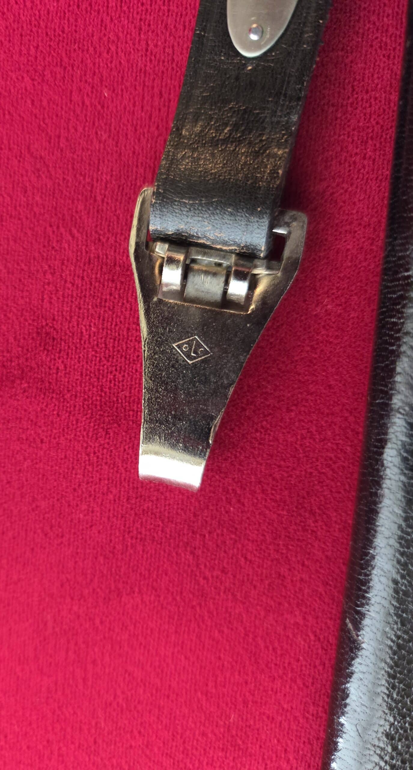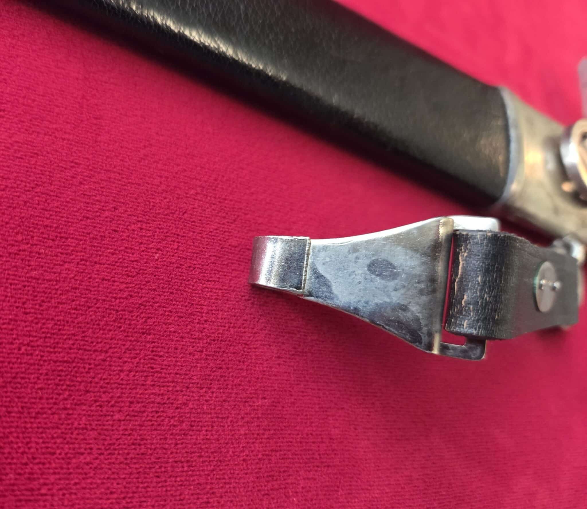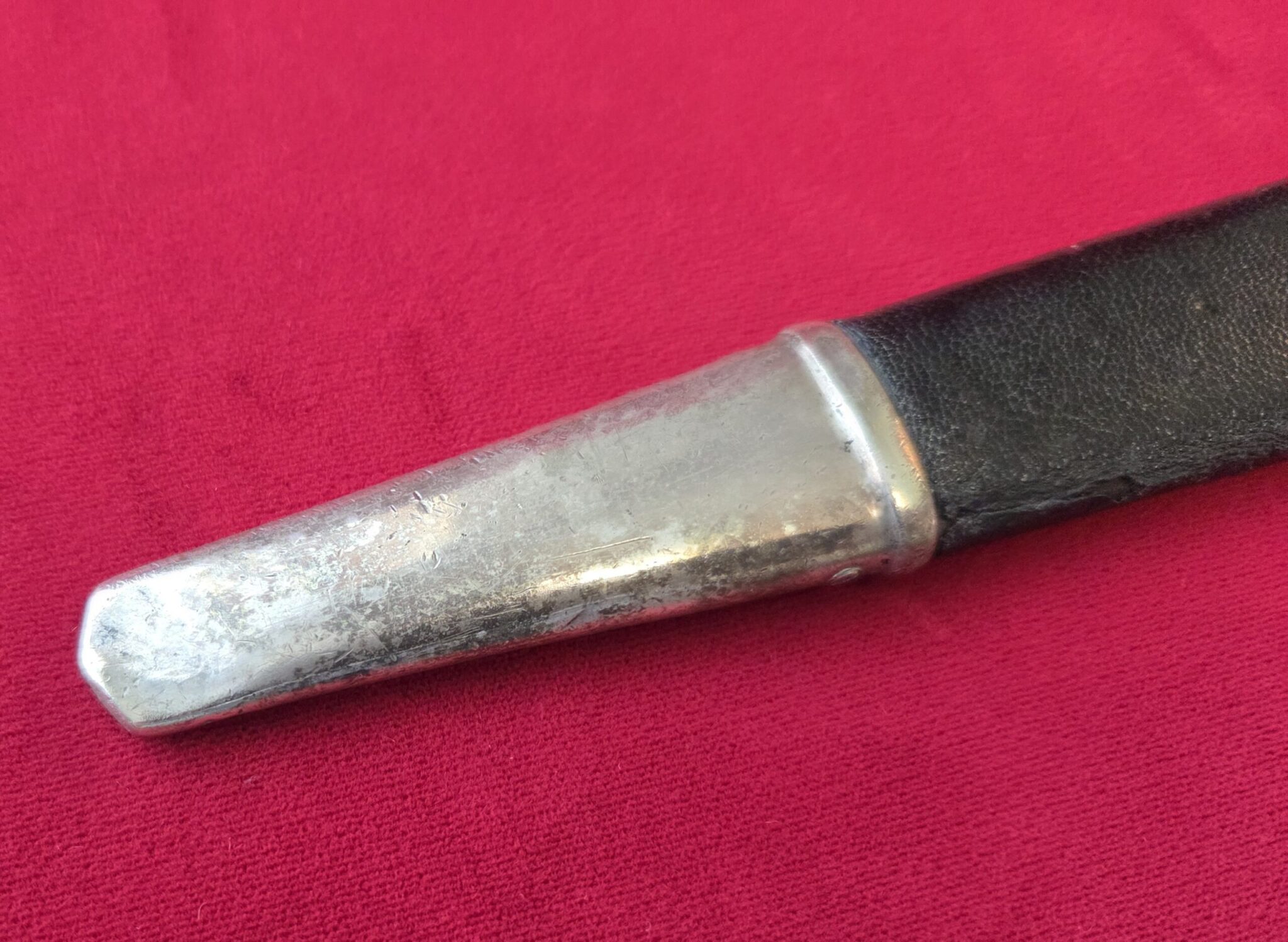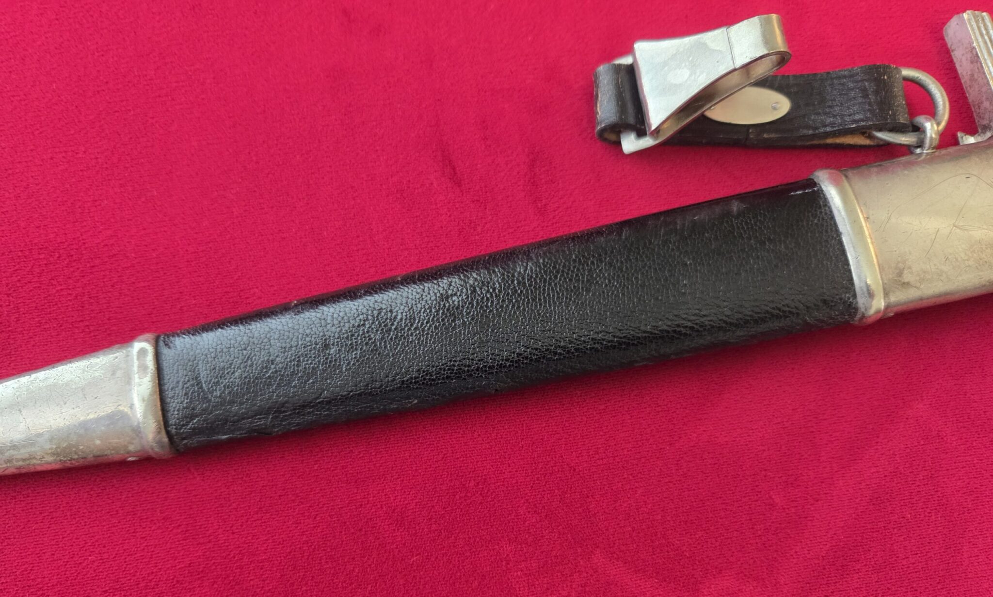Paul Weyersberg & Co./Solingen in double ovals around the firm’s trademark “Sword-and-Wreath” logo. Hilt fittings show age/wear. The crossguard has the art deco stylized RLB eagle on obverse langet. Black wooden grip shows minor wear, some small indentations on both sides but no cracks or chips. 1st pattern RLB insignia is properly pinned to the obverse grip and shows no wear to enamel. Blade grades EX++ showing light surface wear/runner marks and speckling but no nicks to the cutting edges or damage to the black leather buffer pad. Black leather scabbard shows wear but no tears. Scabbard fittings have all screws in place and lower fitting tip is dented on both sides. Dagger is complete with black leather hanger.