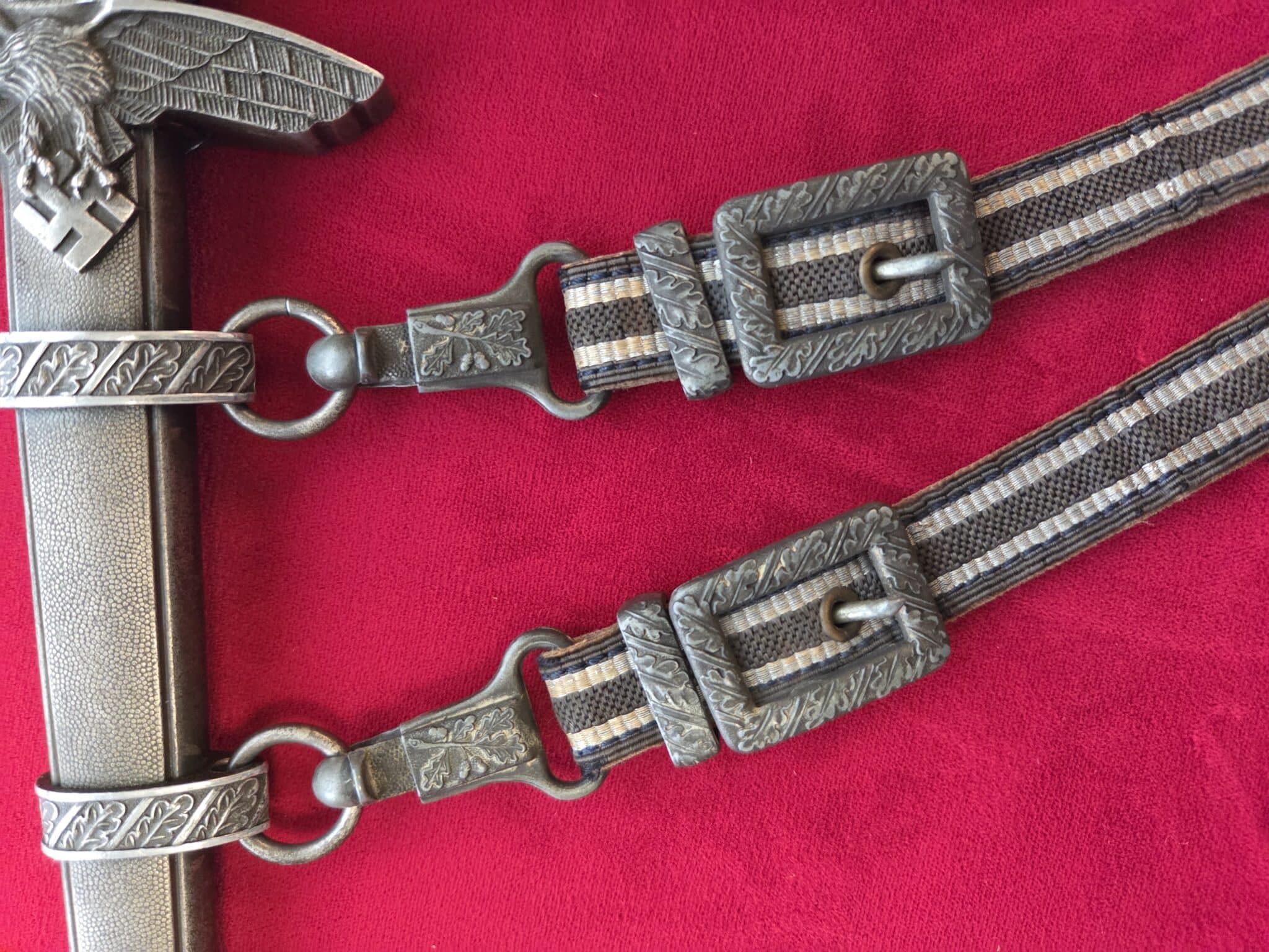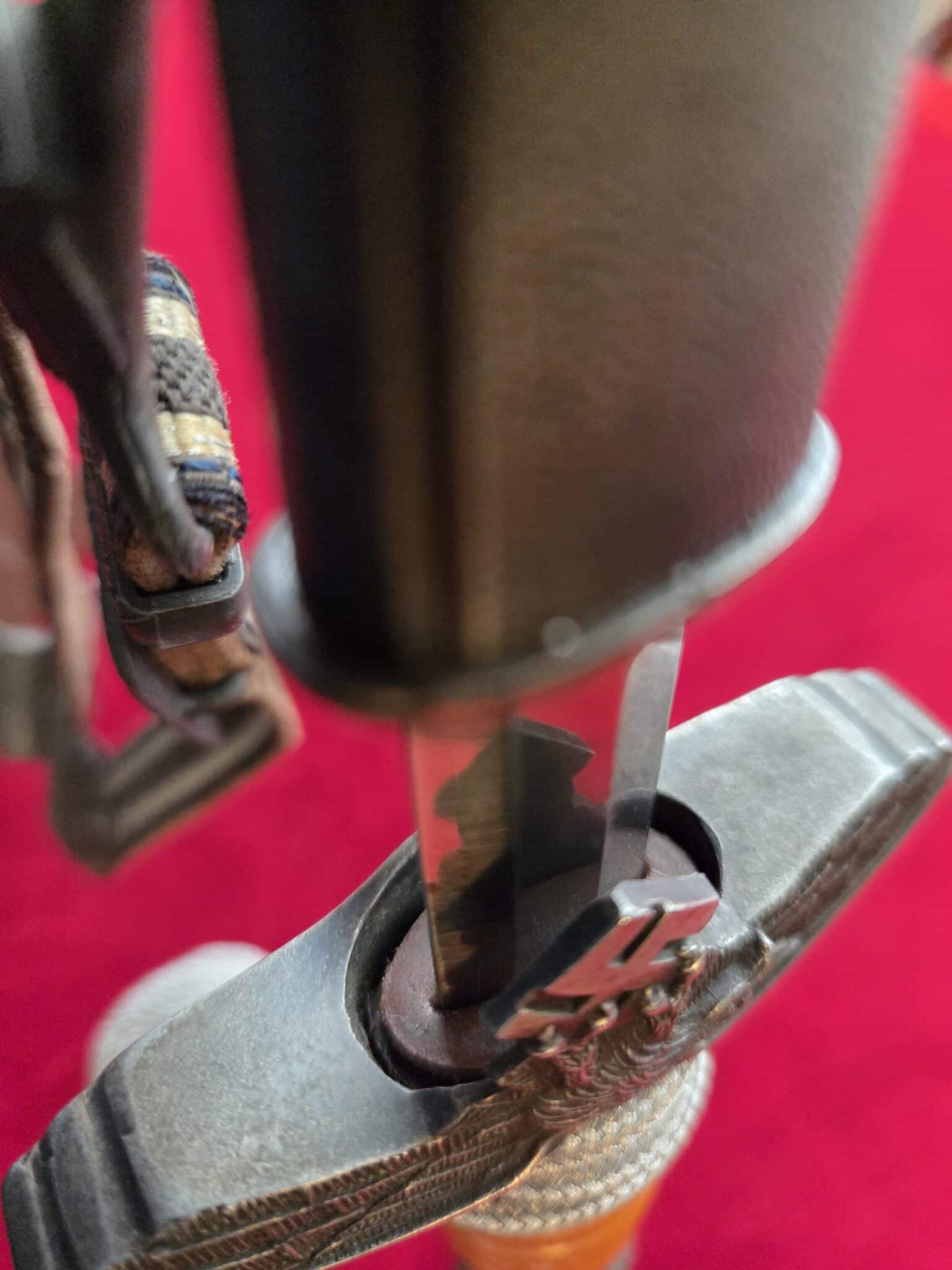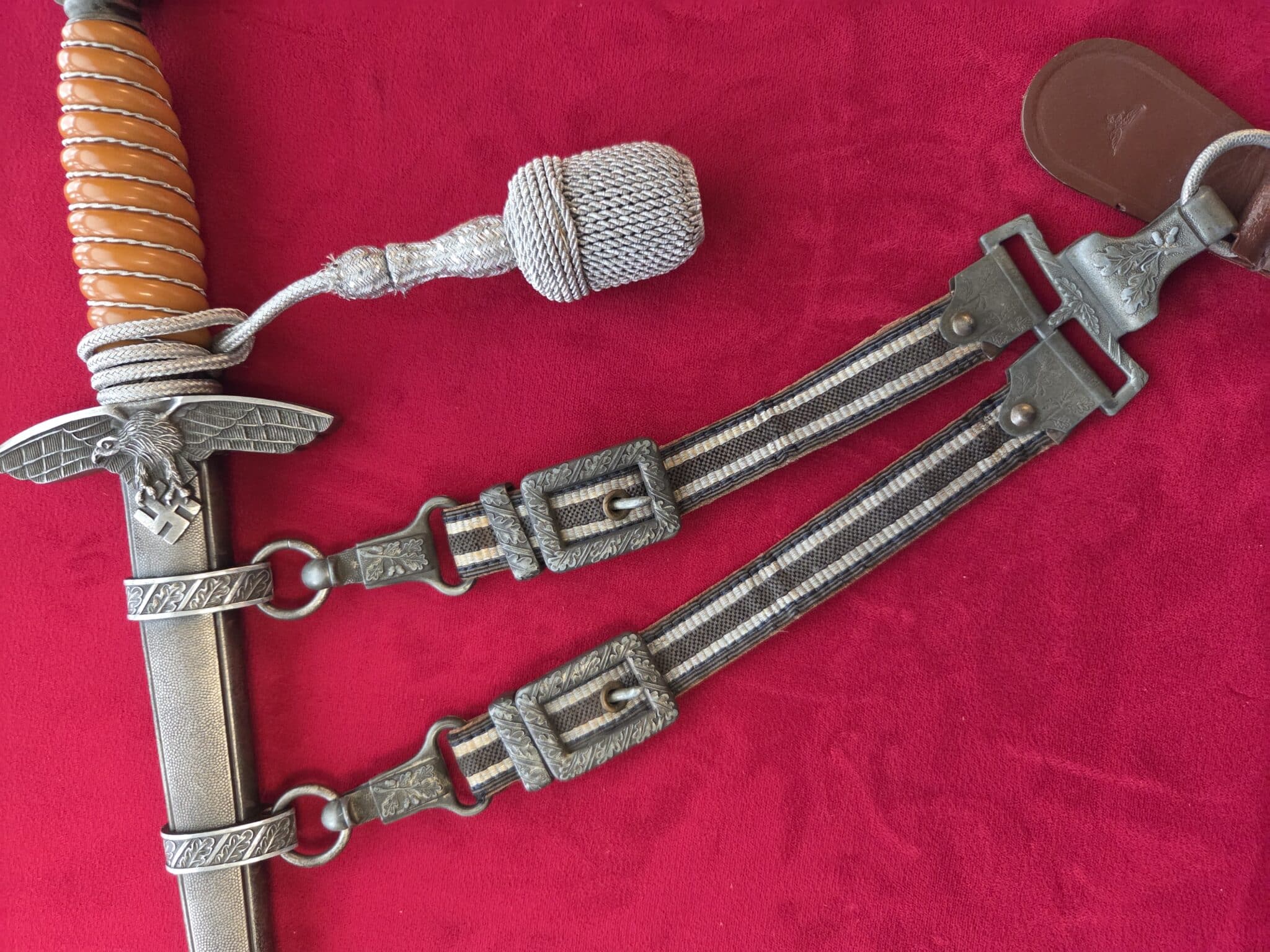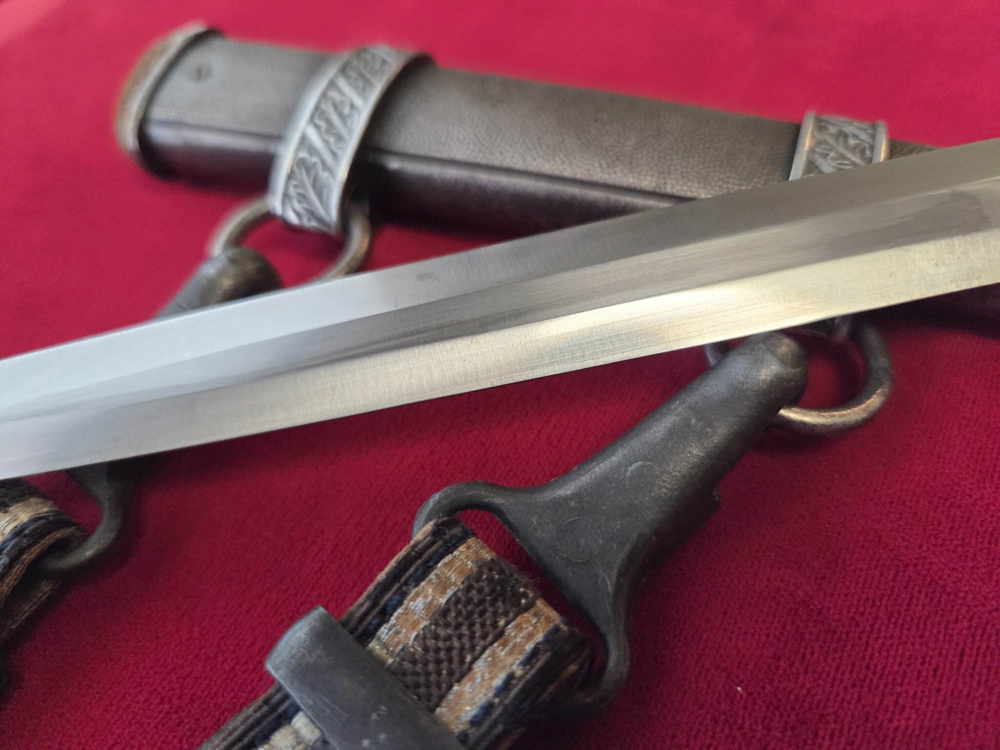 Anton Wingen (knight) maker marked. Blade is free of pitting with no sharpening to edge, and tip of the blade remains in a point. The hilt fittings are dark burnished and very detailed. The orange grip has a silver springy wire wrap. The scabbard is dent free and is dark burnished like the hilt fittings. Scabbard has two suspension bands with oak leaves and two o-rings for connecting the included hangers. Hangers are in EXC++ condition with no fraying and clips in proper working order. Complete with a brown leather teardrop belt loop with eagle stamped on obverse side. MINT condition.