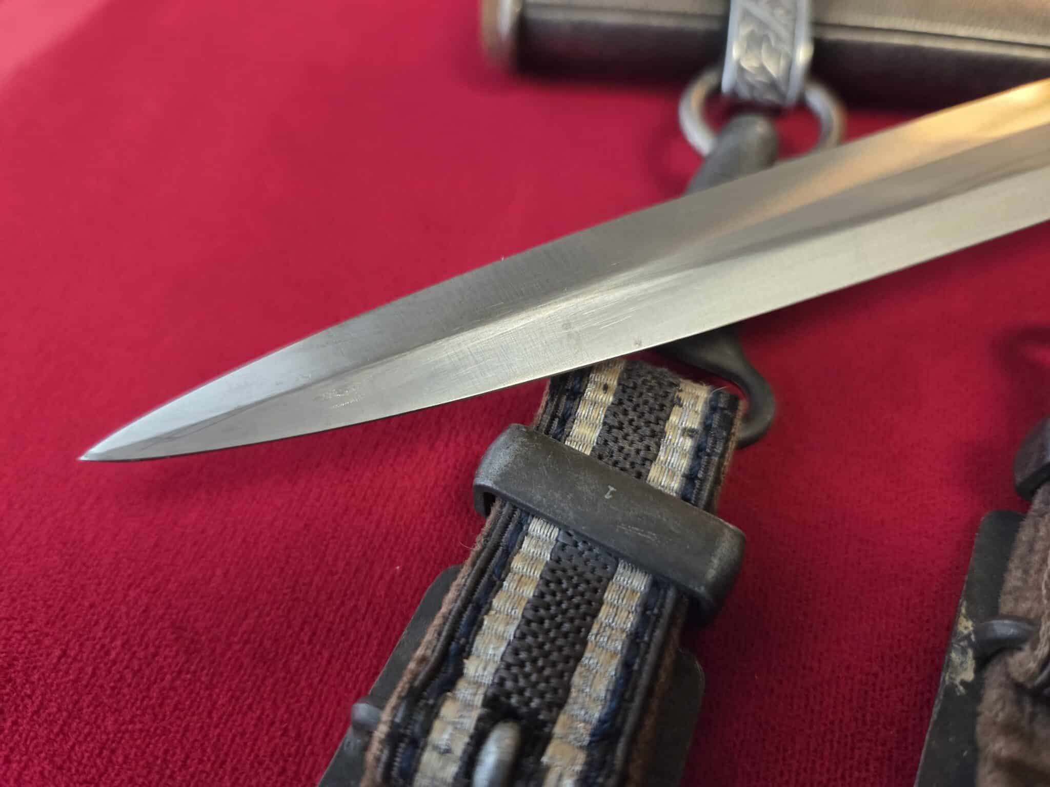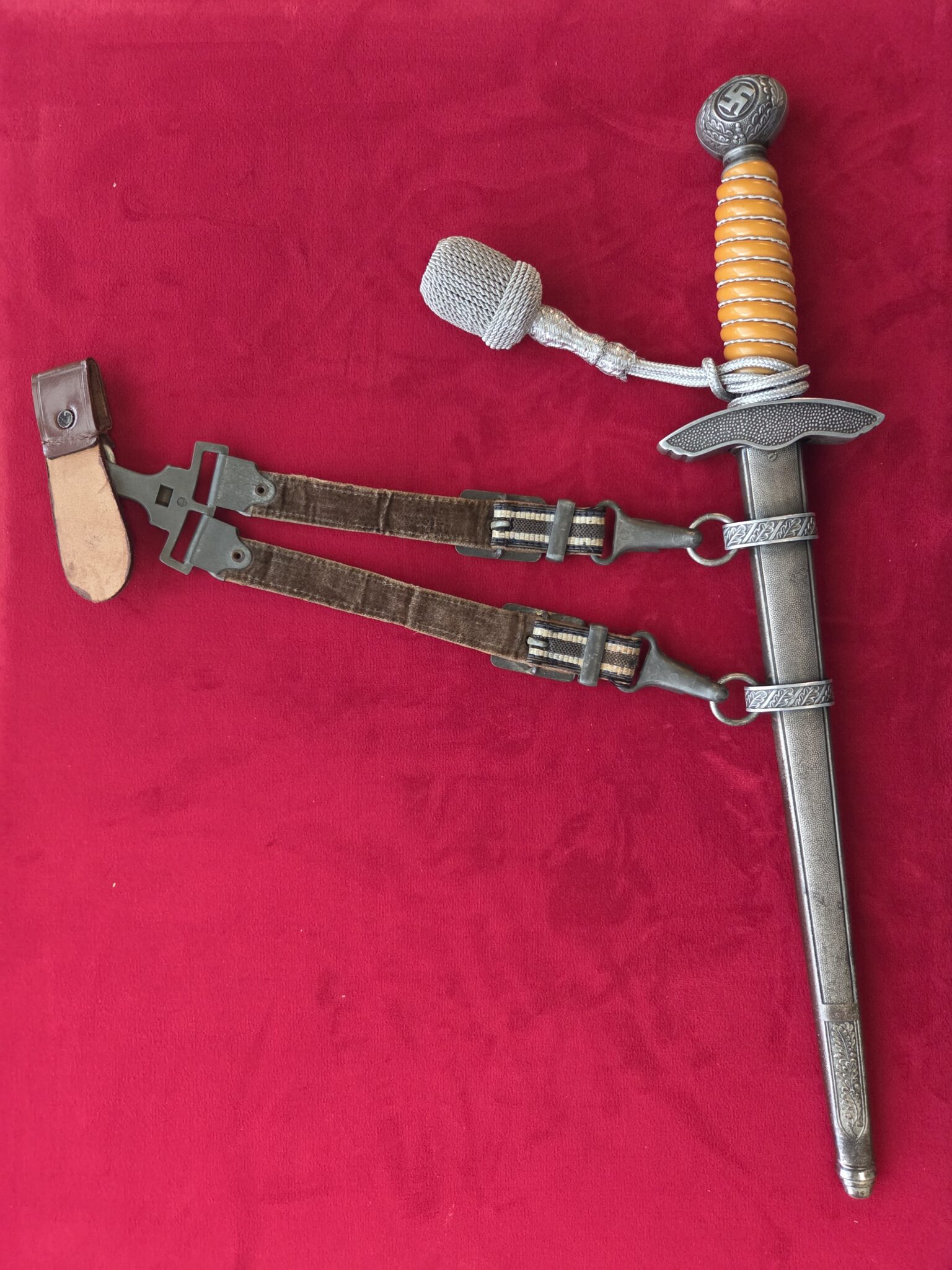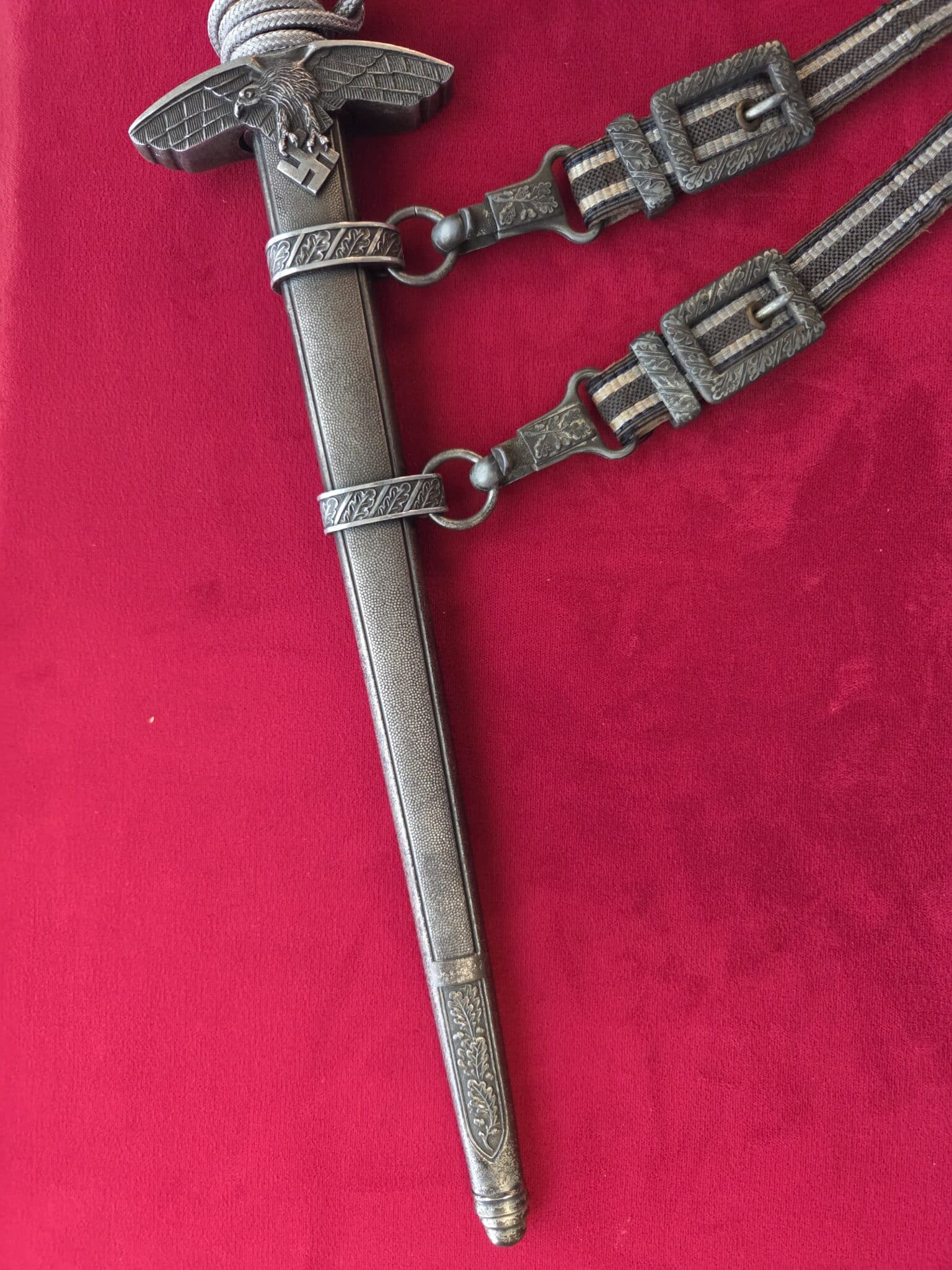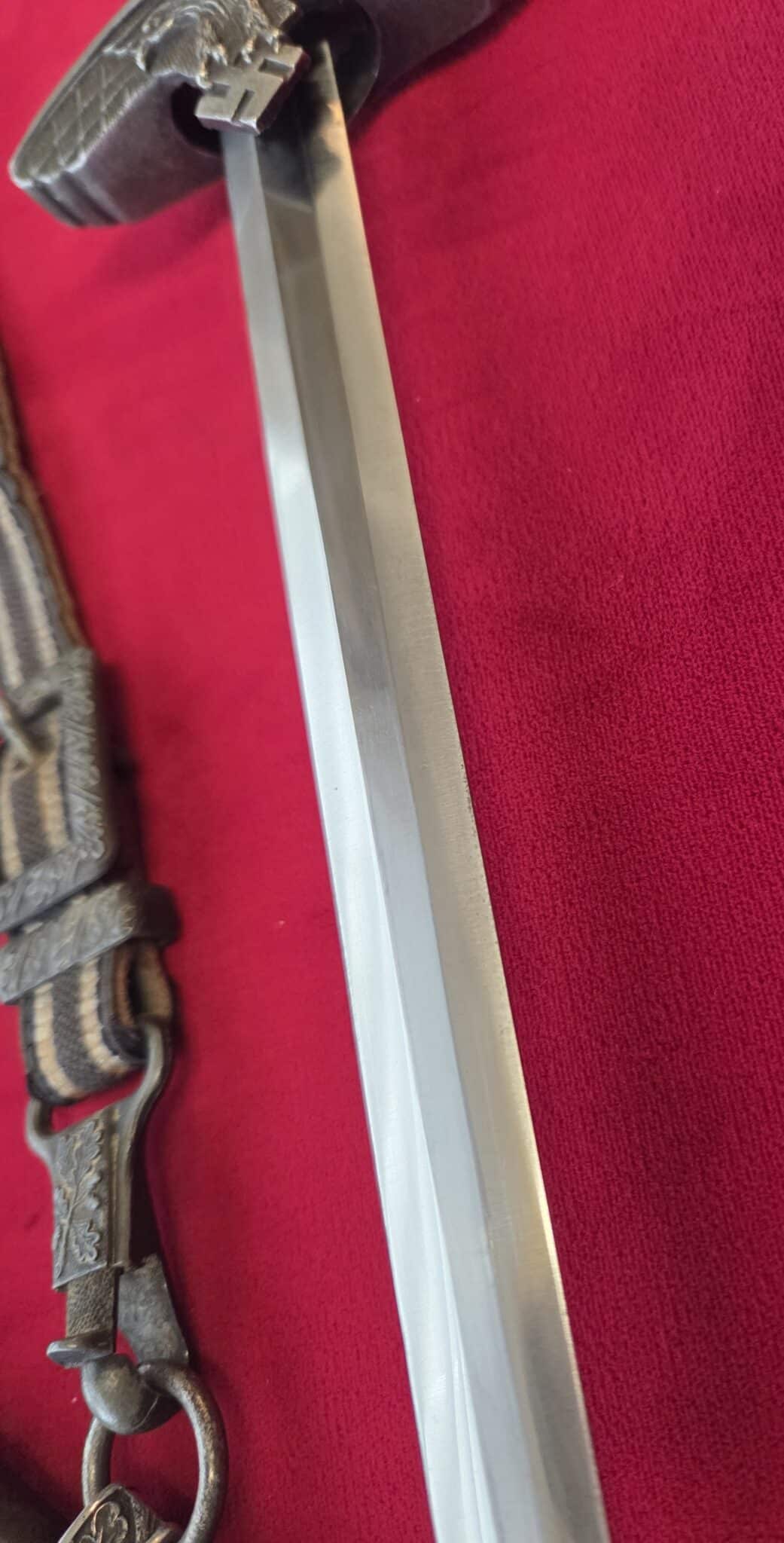 Anton Wingen (knight) maker marked. Blade is free of pitting with no sharpening to edge, and tip of the blade remains in a point. The hilt fittings are dark burnished and very detailed. The orange grip has a silver springy wire wrap. The scabbard is dent free and is dark burnished like the hilt fittings. Scabbard has two suspension bands with oak leaves and two o-rings for connecting the included hangers. Hangers are in EXC++ condition with no fraying and clips in proper working order. Complete with a brown leather teardrop belt loop with eagle stamped on obverse side. MINT condition.
