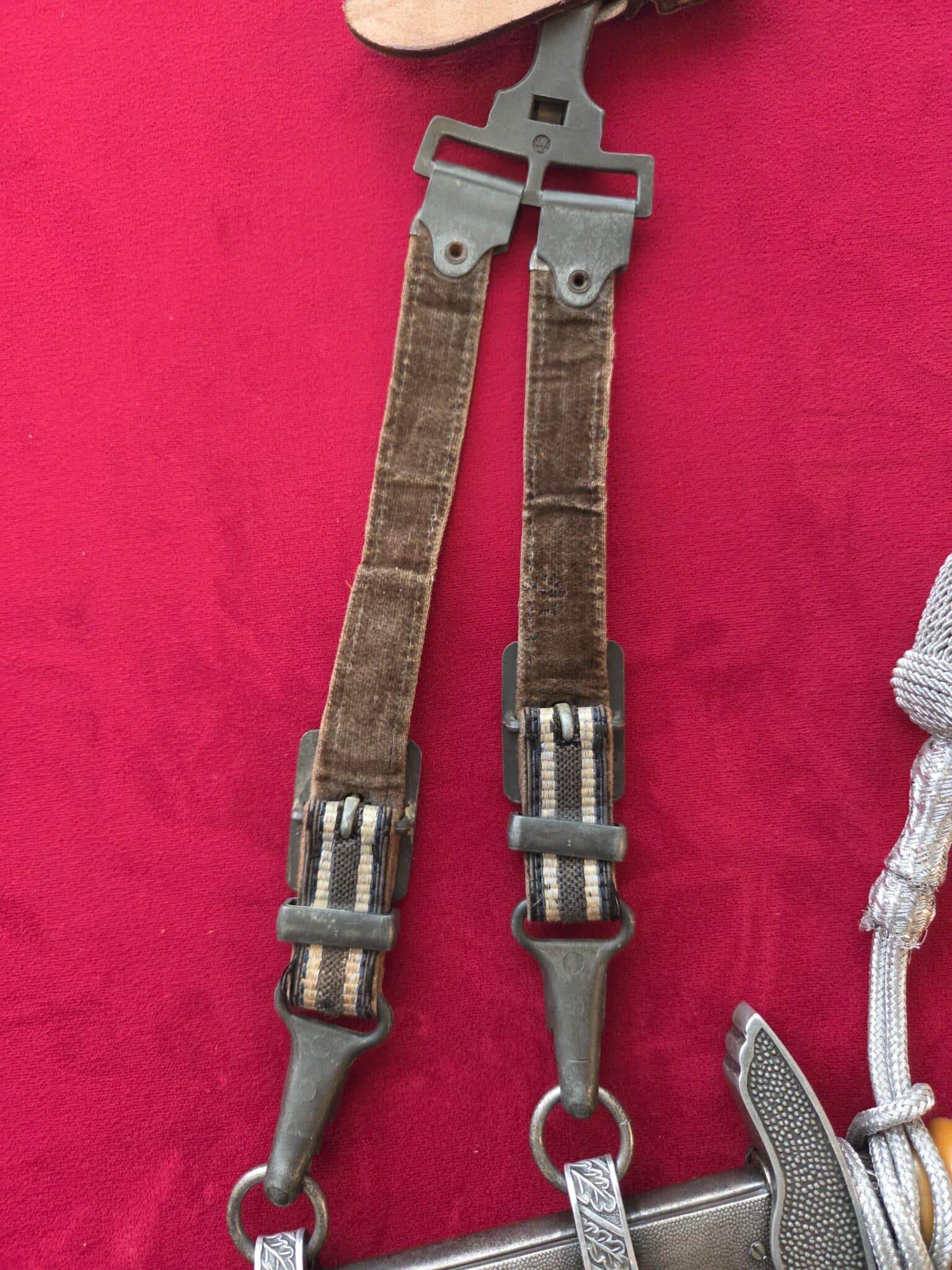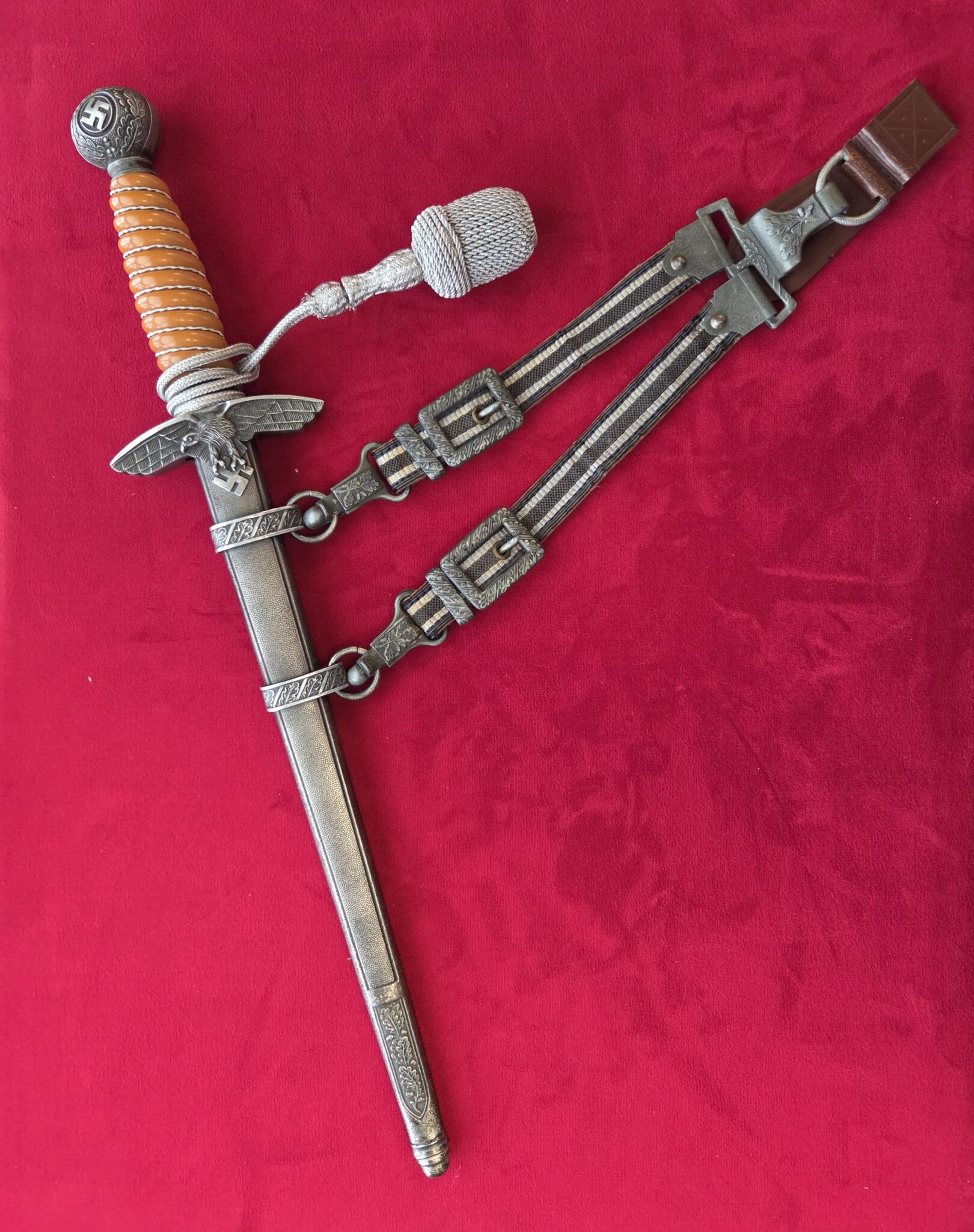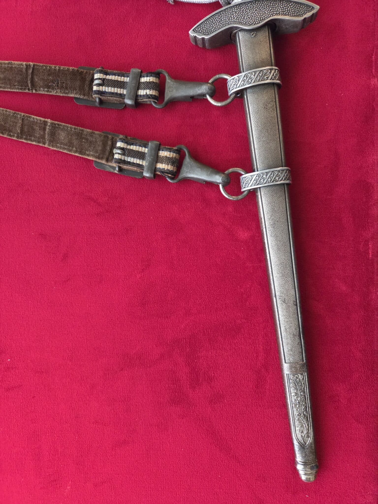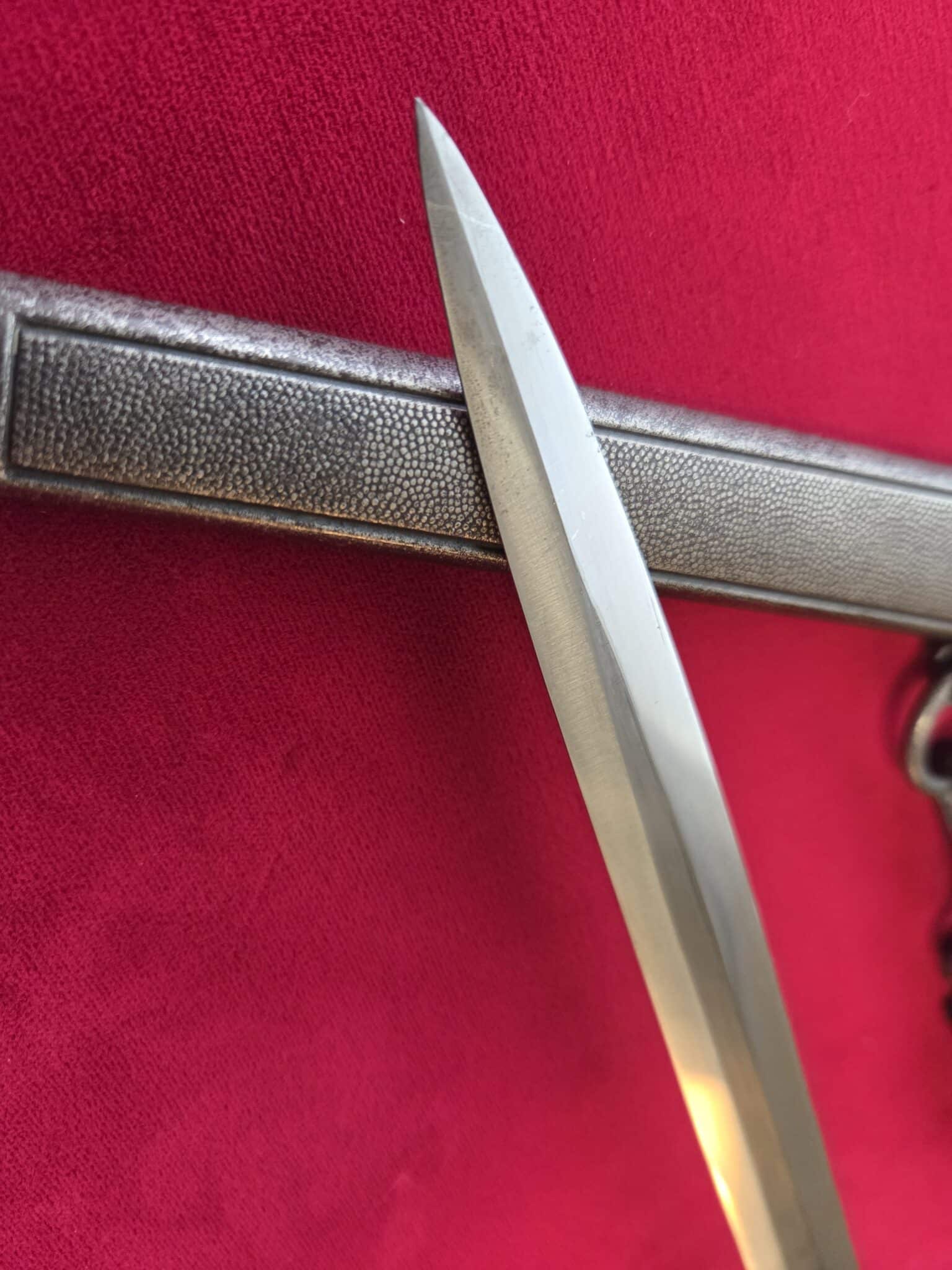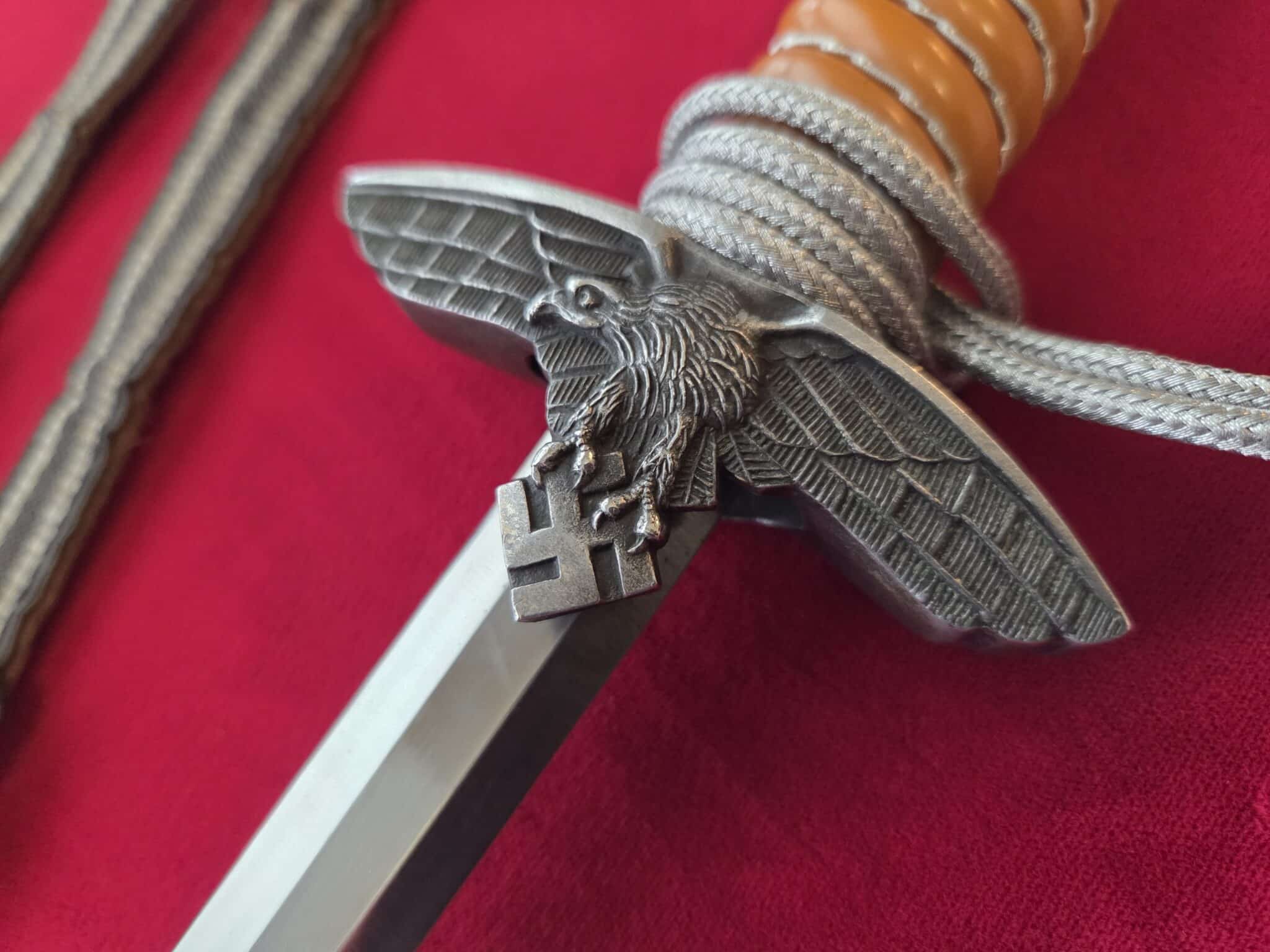 Anton Wingen (knight) maker marked. Blade is free of pitting with no sharpening to edge, and tip of the blade remains in a point. The hilt fittings are dark burnished and very detailed. The orange grip has a silver springy wire wrap. The scabbard is dent free and is dark burnished like the hilt fittings. Scabbard has two suspension bands with oak leaves and two o-rings for connecting the included hangers. Hangers are in EXC++ condition with no fraying and clips in proper working order. Complete with a brown leather teardrop belt loop with eagle stamped on obverse side. MINT condition.