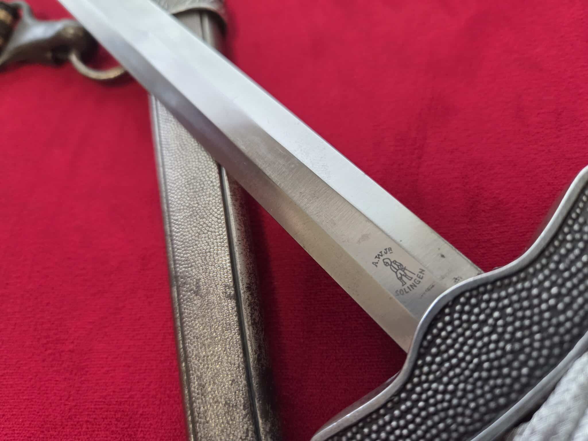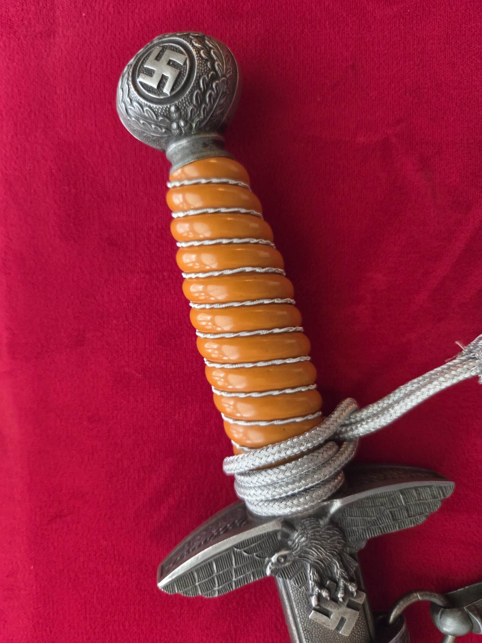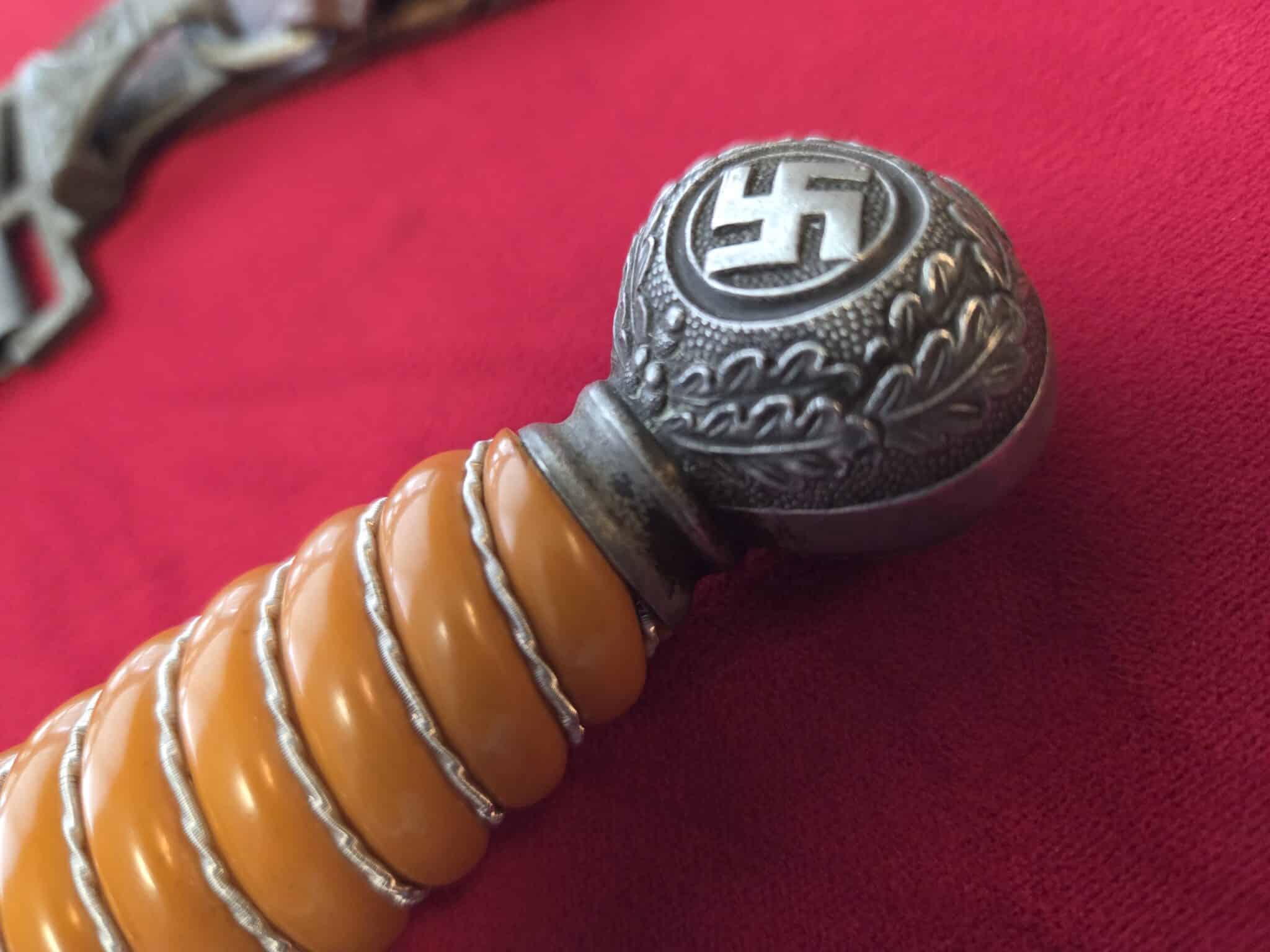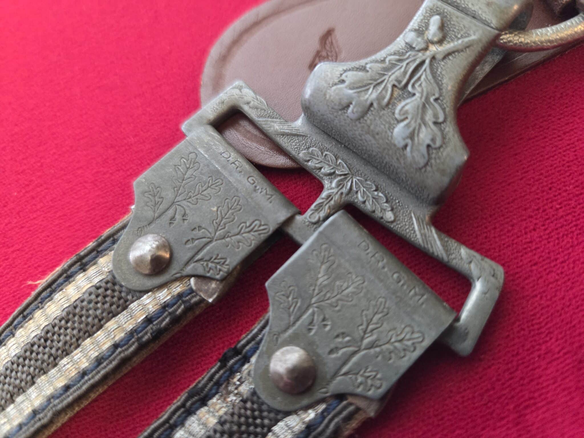 Anton Wingen (knight) maker marked. Blade is free of pitting with no sharpening to edge, and tip of the blade remains in a point. The hilt fittings are dark burnished and very detailed. The orange grip has a silver springy wire wrap. The scabbard is dent free and is dark burnished like the hilt fittings. Scabbard has two suspension bands with oak leaves and two o-rings for connecting the included hangers. Hangers are in EXC++ condition with no fraying and clips in proper working order. Complete with a brown leather teardrop belt loop with eagle stamped on obverse side. MINT condition.
