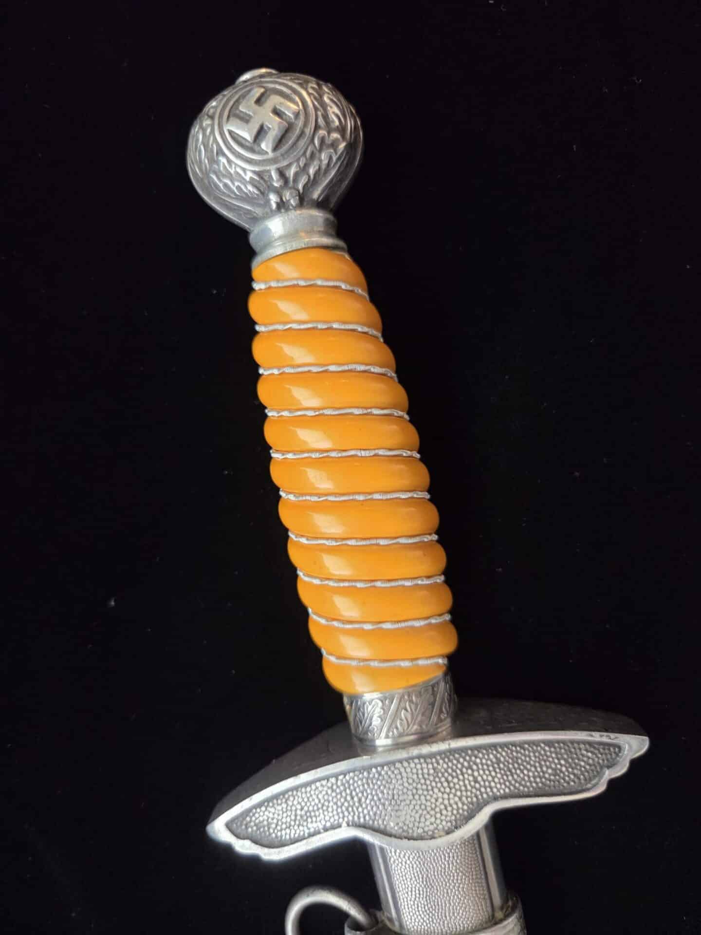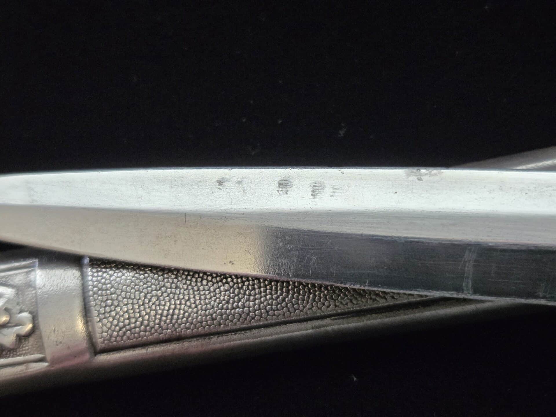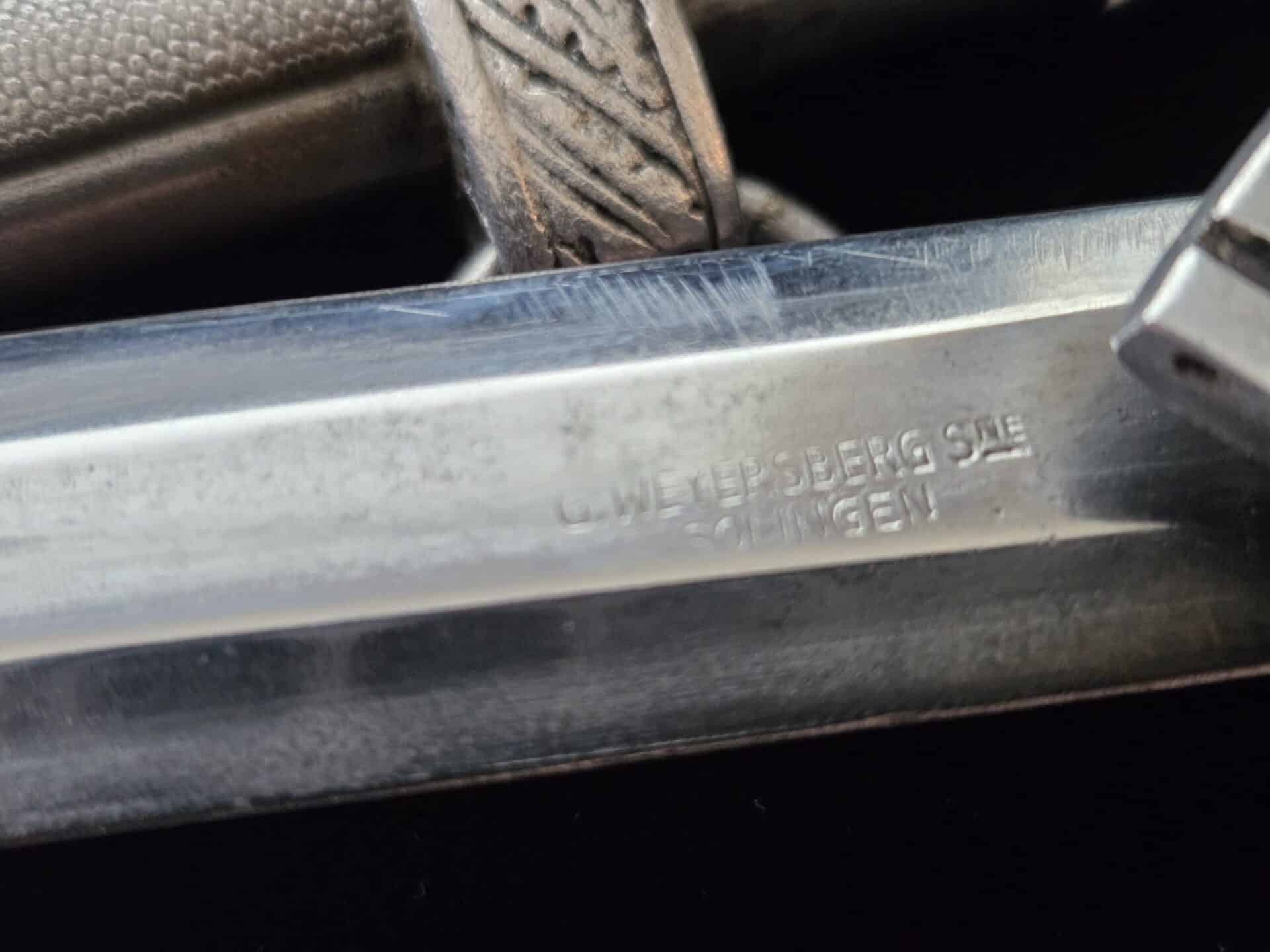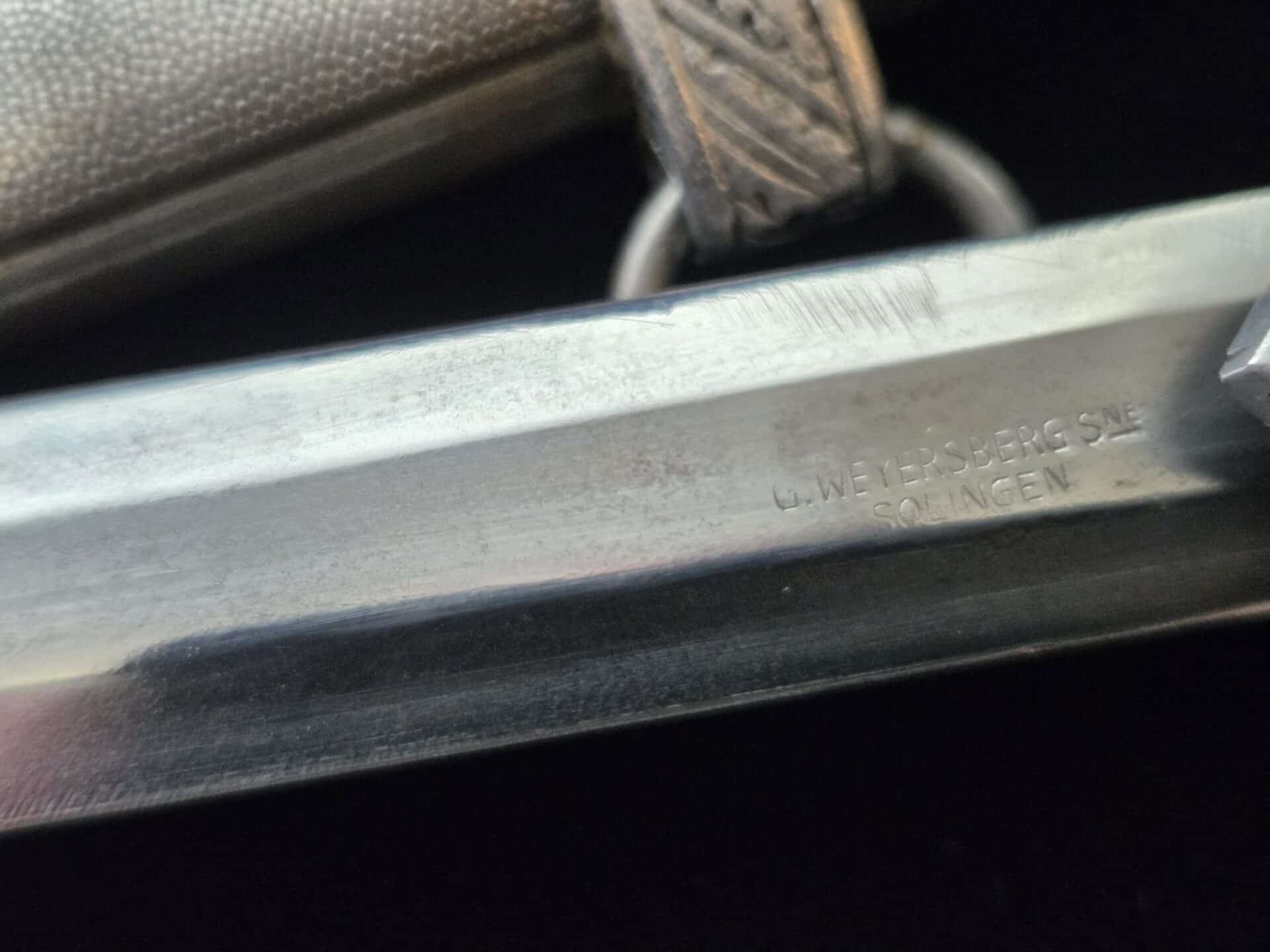 The blade is marked on the obverse ricasso with “G. Weyersberg Sne,” an abbreviation for Gottfried Weyersberg Söhne. The members of the Weyersberg family had been making blades in Solingen for generations and Gottfried’s maker mark is one of the rarest of those to be found. The blade has light graying and a few minor nicks to the cutting edge. The tip of the blade is slightly bent. The original blue pebbled leather buffer pad remains intact. The hilt fittings are intact and the orange grip has no chips and is complete with tighly wrapped silver spring wire.  The scabbard has a dent on both the obverse and reverse side of the lower section.   All retaining screws are intact.