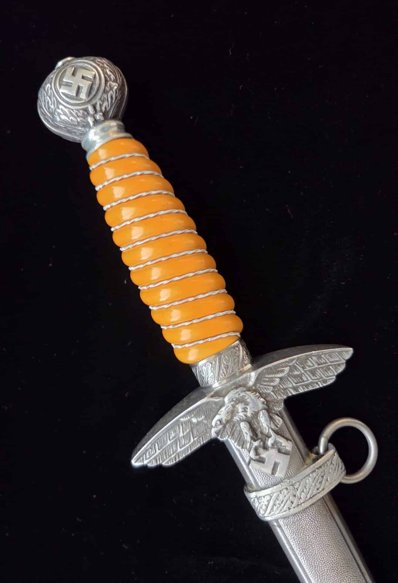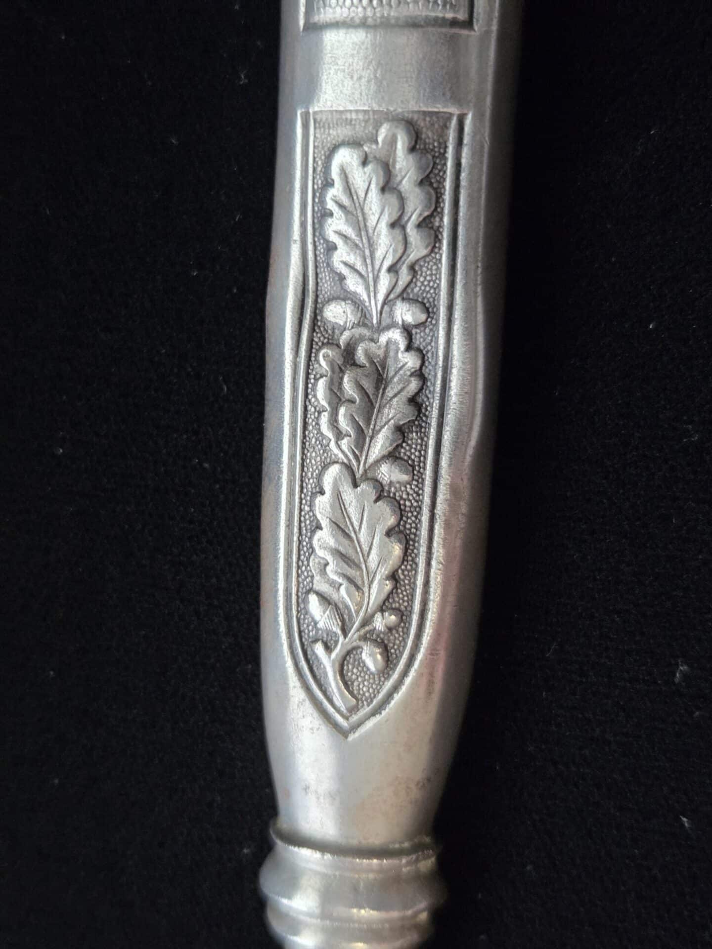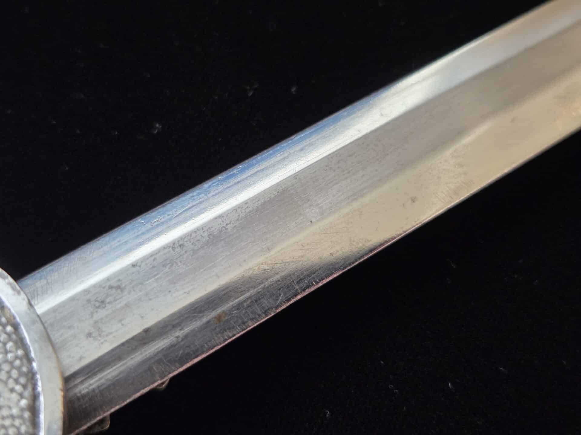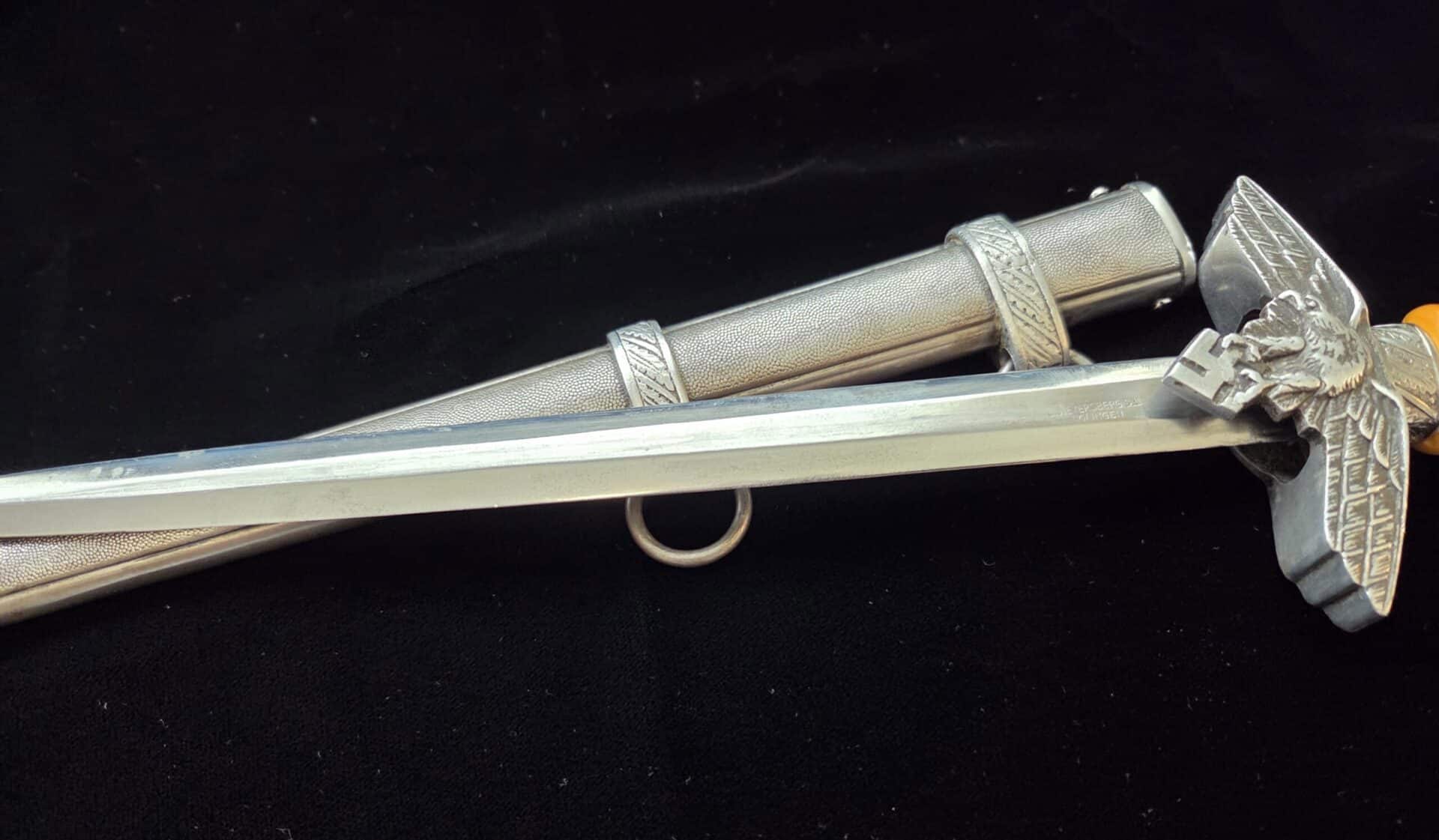 The blade is marked on the obverse ricasso with “G. Weyersberg Sne,” an abbreviation for Gottfried Weyersberg Söhne. The members of the Weyersberg family had been making blades in Solingen for generations and Gottfried’s maker mark is one of the rarest of those to be found. The blade has light graying and a few minor nicks to the cutting edge. The tip of the blade is slightly bent. The original blue pebbled leather buffer pad remains intact. The hilt fittings are intact and the orange grip has no chips and is complete with tighly wrapped silver spring wire.  The scabbard has a dent on both the obverse and reverse side of the lower section.   All retaining screws are intact.