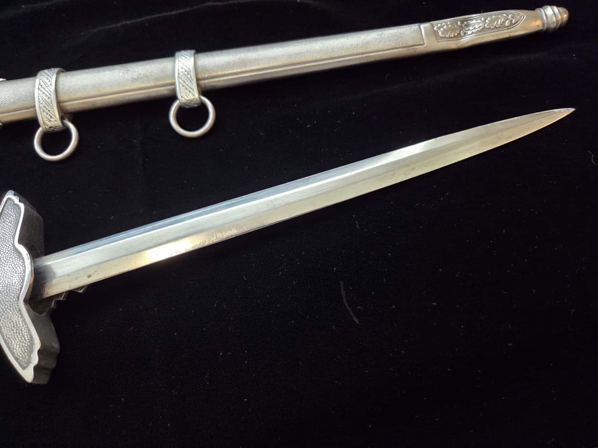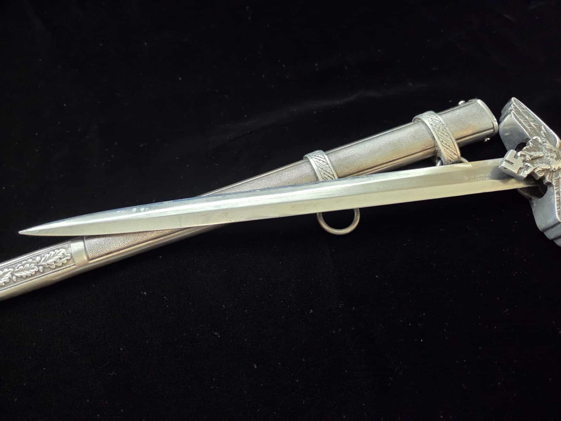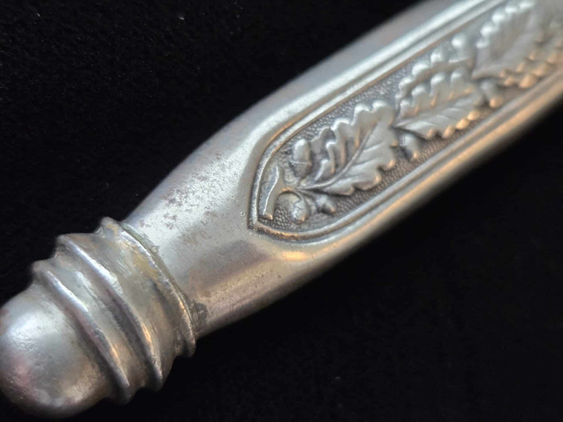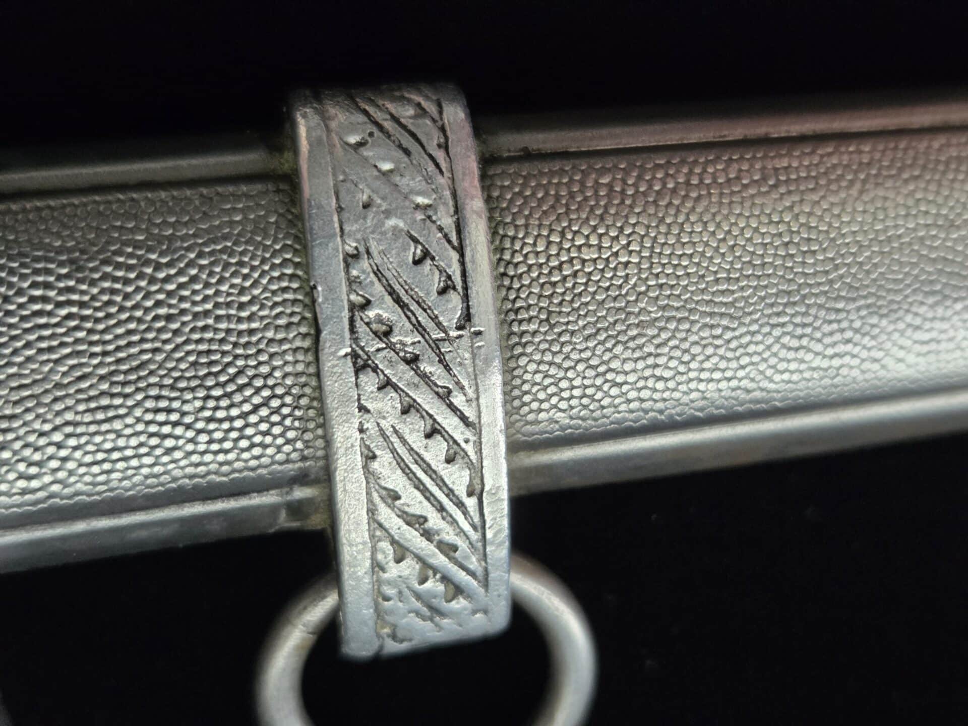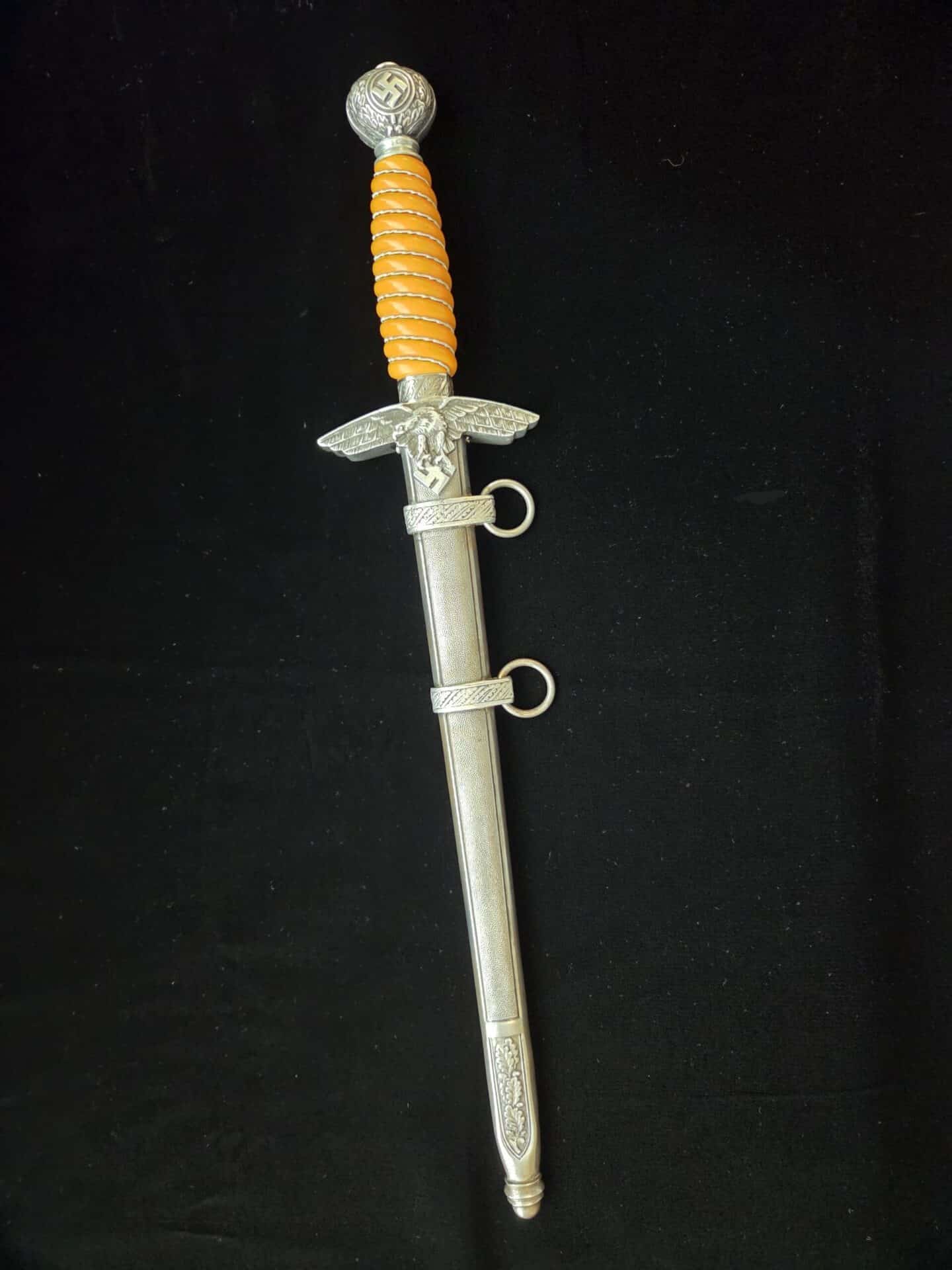 The blade is marked on the obverse ricasso with “G. Weyersberg Sne,” an abbreviation for Gottfried Weyersberg Söhne. The members of the Weyersberg family had been making blades in Solingen for generations and Gottfried’s maker mark is one of the rarest of those to be found. The blade has light graying and a few minor nicks to the cutting edge. The tip of the blade is slightly bent. The original blue pebbled leather buffer pad remains intact. The hilt fittings are intact and the orange grip has no chips and is complete with tighly wrapped silver spring wire.  The scabbard has a dent on both the obverse and reverse side of the lower section.   All retaining screws are intact.