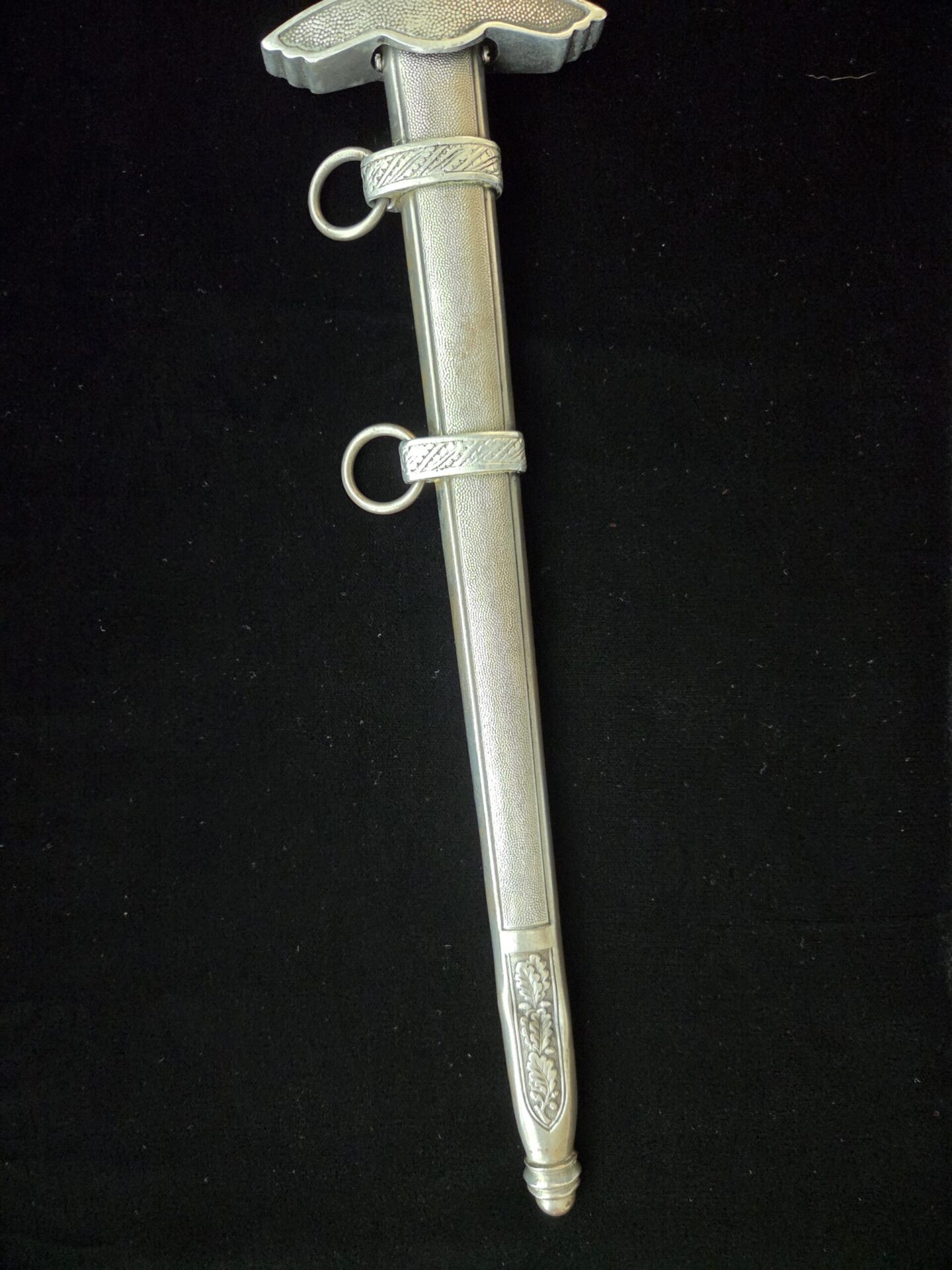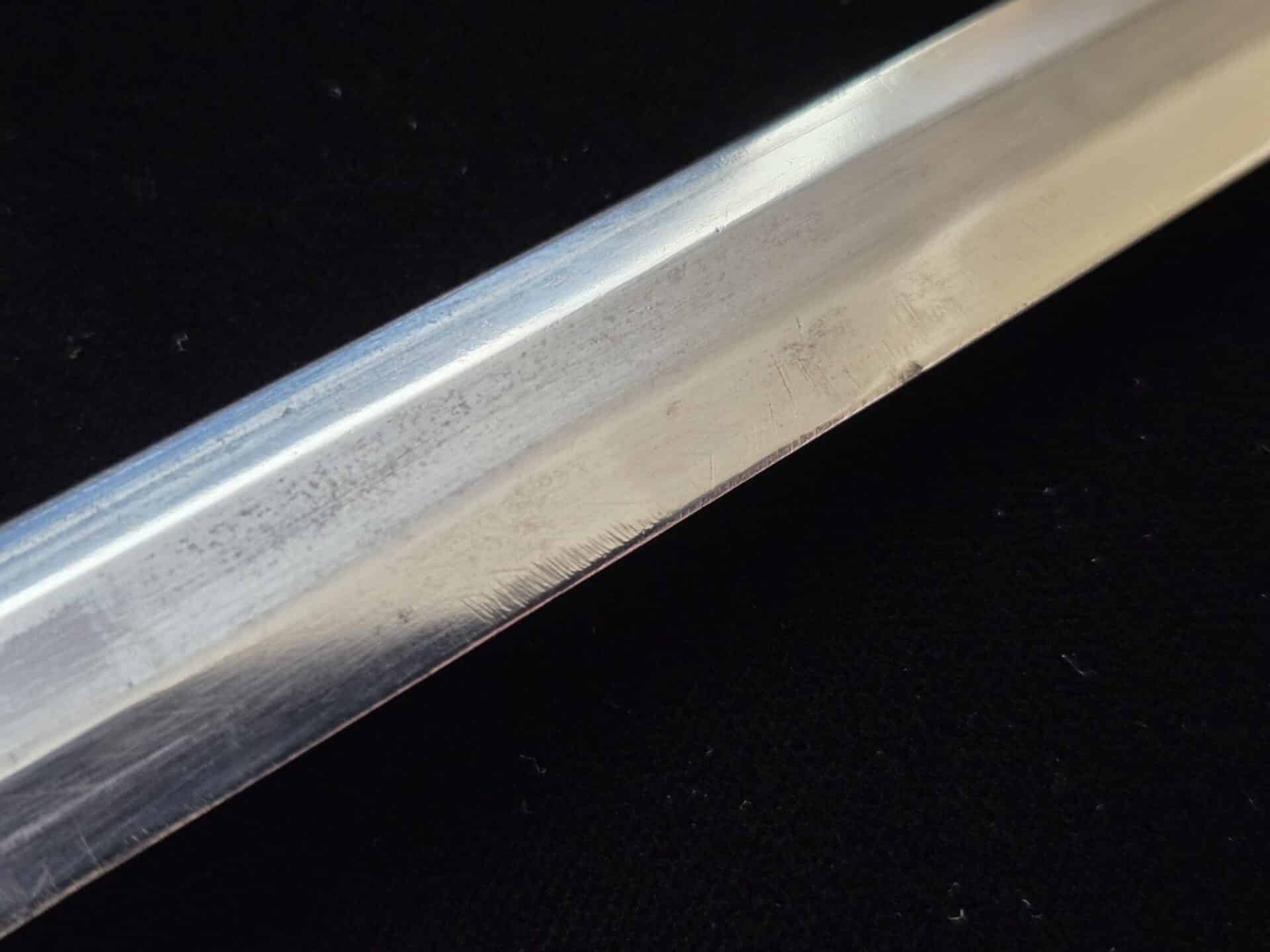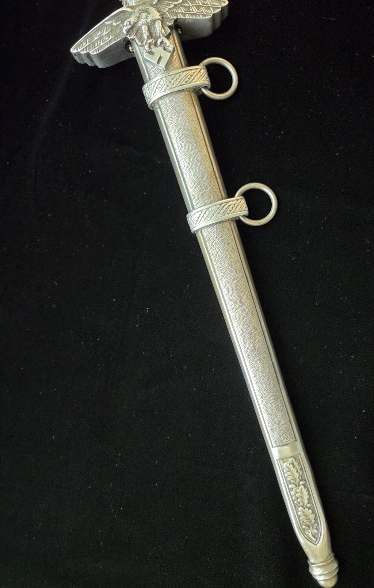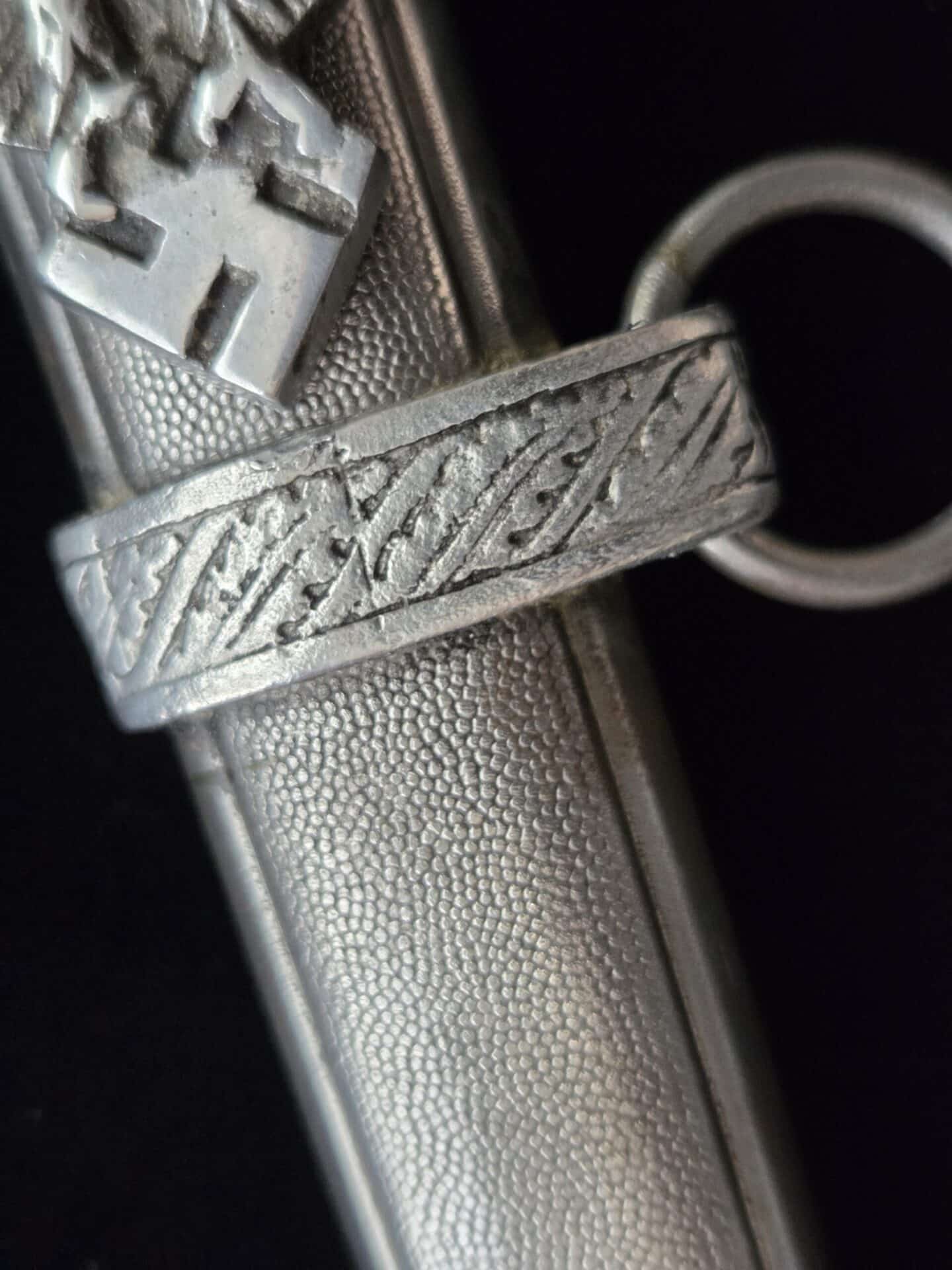 The blade is marked on the obverse ricasso with “G. Weyersberg Sne,” an abbreviation for Gottfried Weyersberg Söhne. The members of the Weyersberg family had been making blades in Solingen for generations and Gottfried’s maker mark is one of the rarest of those to be found. The blade has light graying and a few minor nicks to the cutting edge. The tip of the blade is slightly bent. The original blue pebbled leather buffer pad remains intact. The hilt fittings are intact and the orange grip has no chips and is complete with tighly wrapped silver spring wire.  The scabbard has a dent on both the obverse and reverse side of the lower section.   All retaining screws are intact.