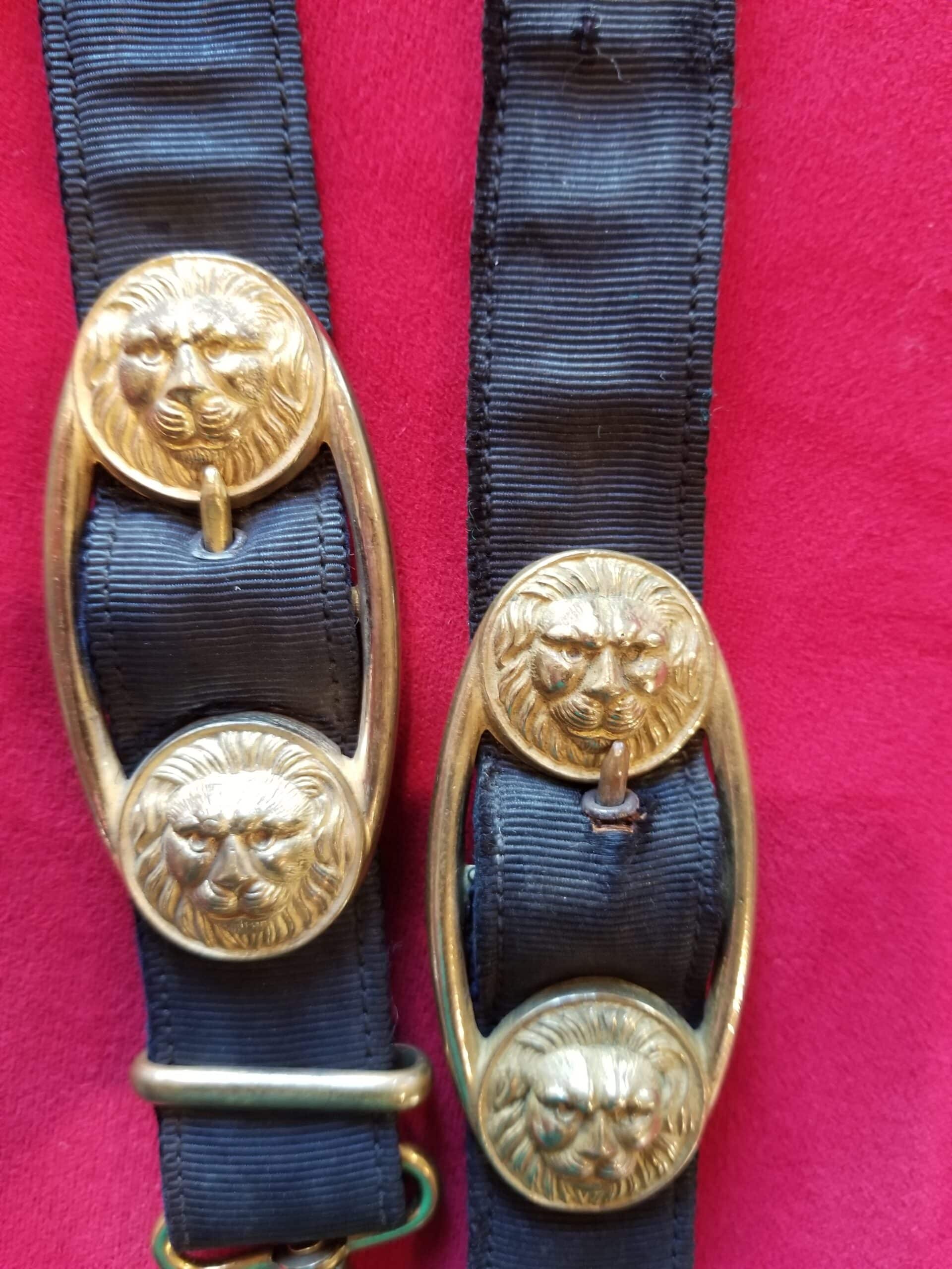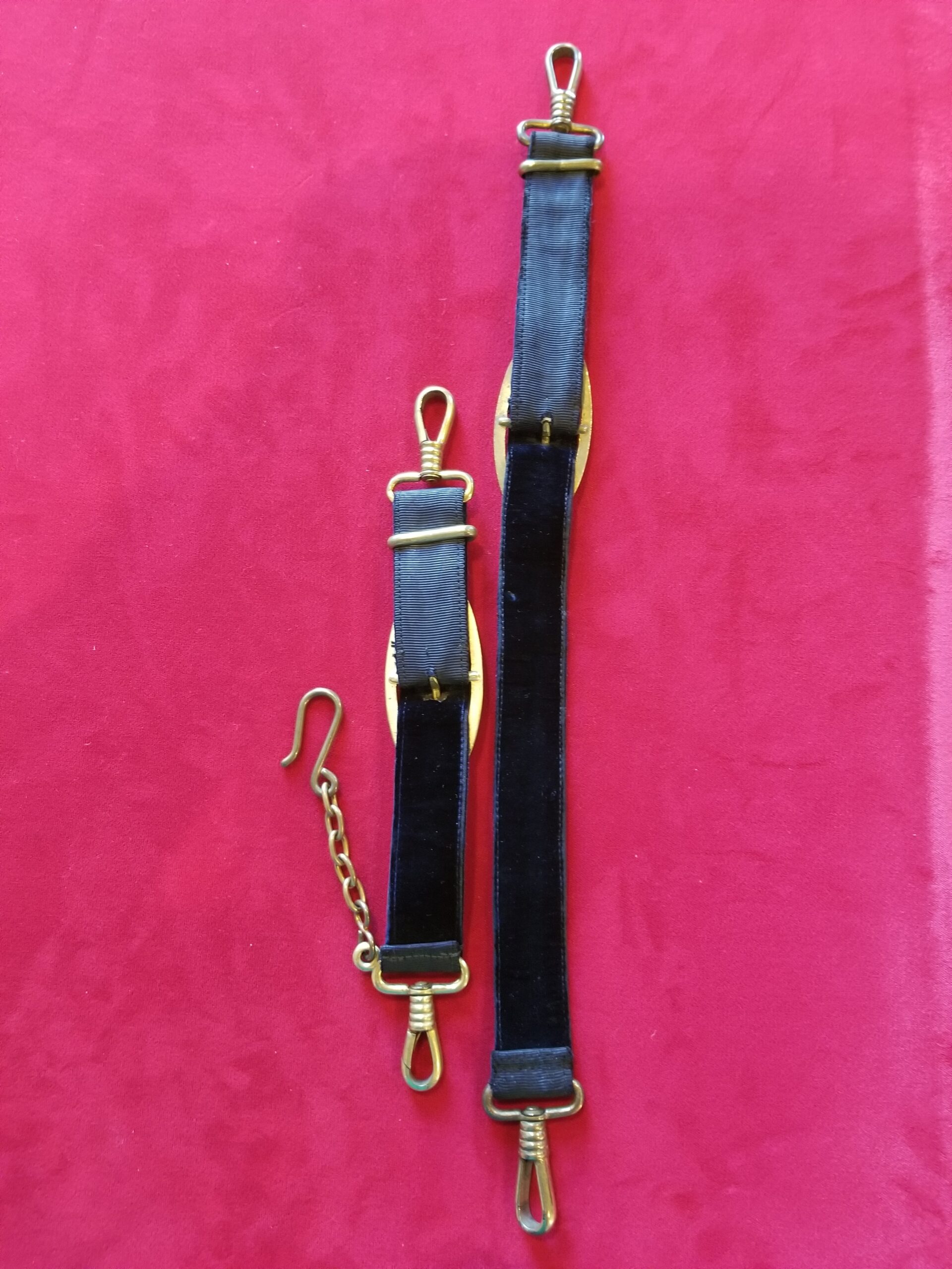 Gilded Navy hangers show light age/wear and no damage or fraying to straps. Fittings are mostly matching throughout with gilded brass buckles and regain chain showing light toning. Please note that we have several specimens available and that the picture posted may not be an exact representation of the other examples we have for sale. EX+/EX++