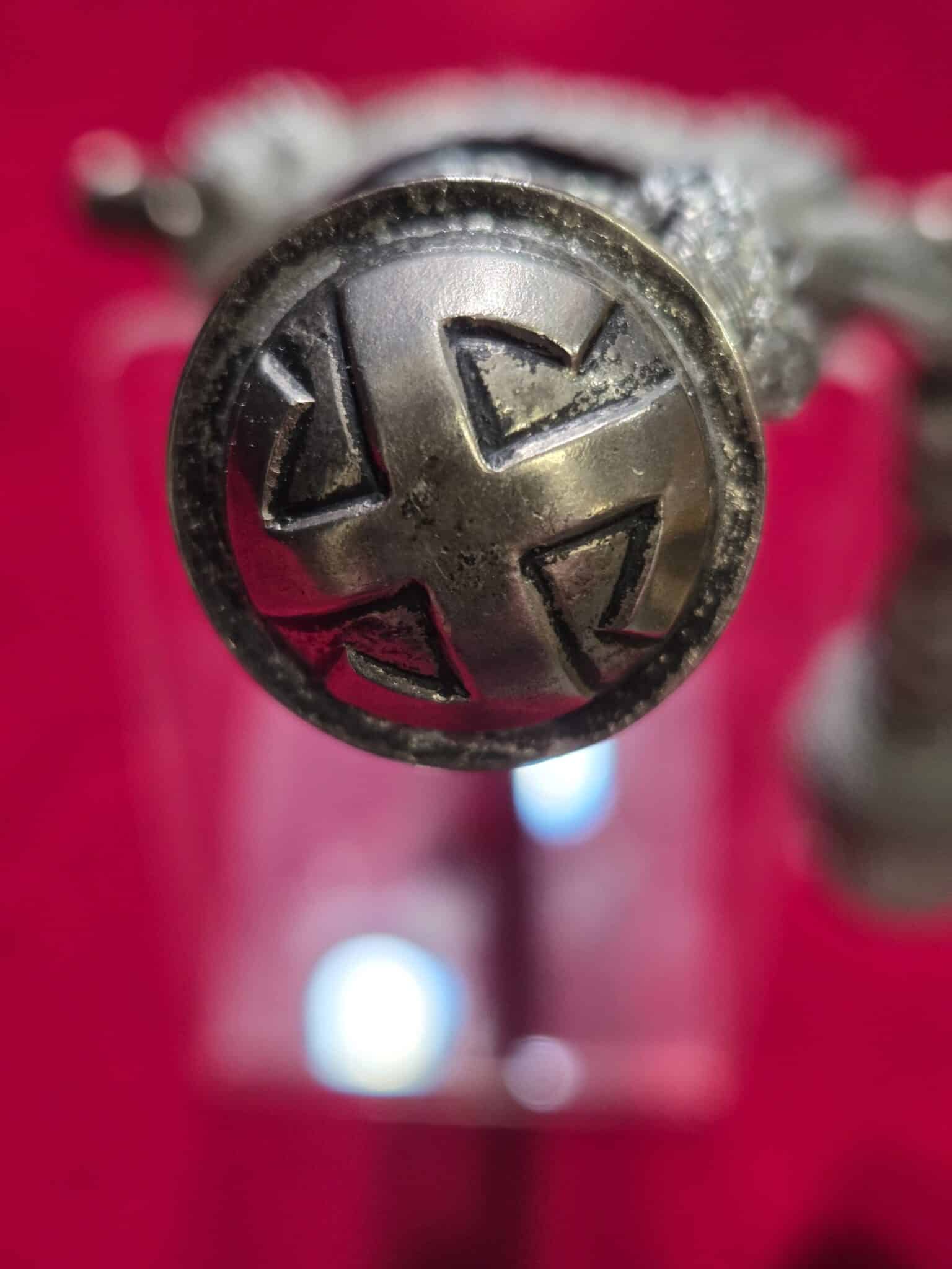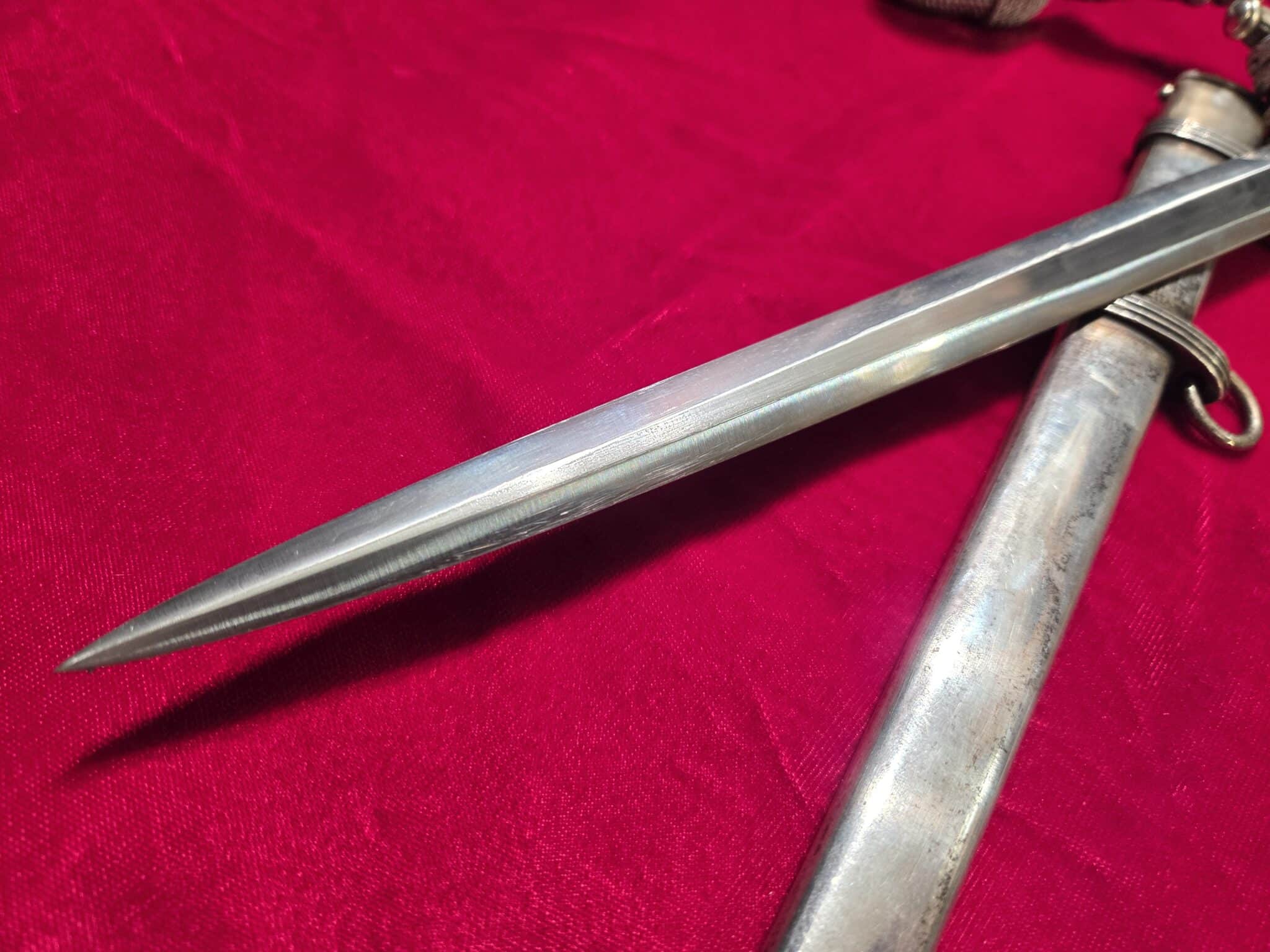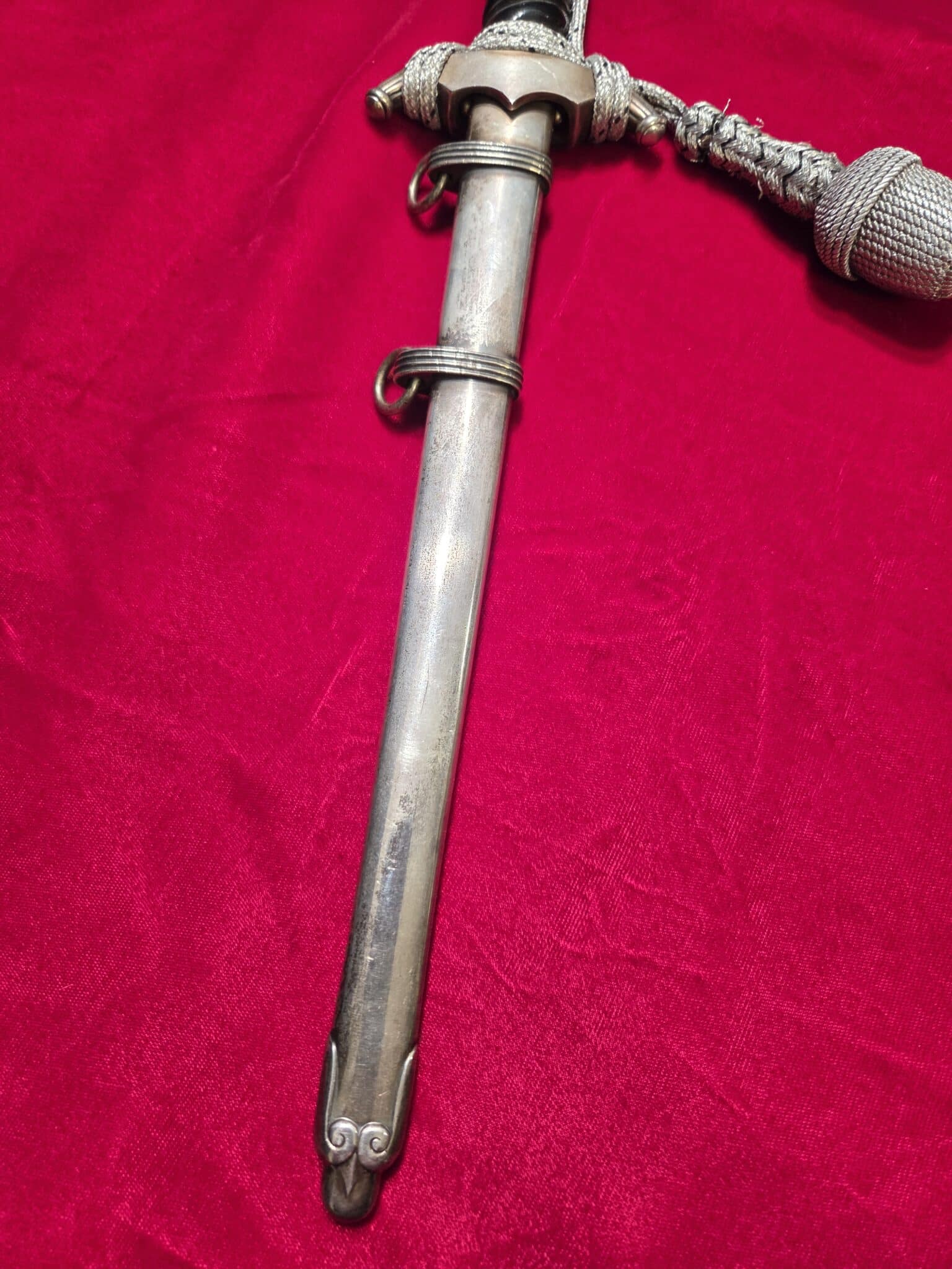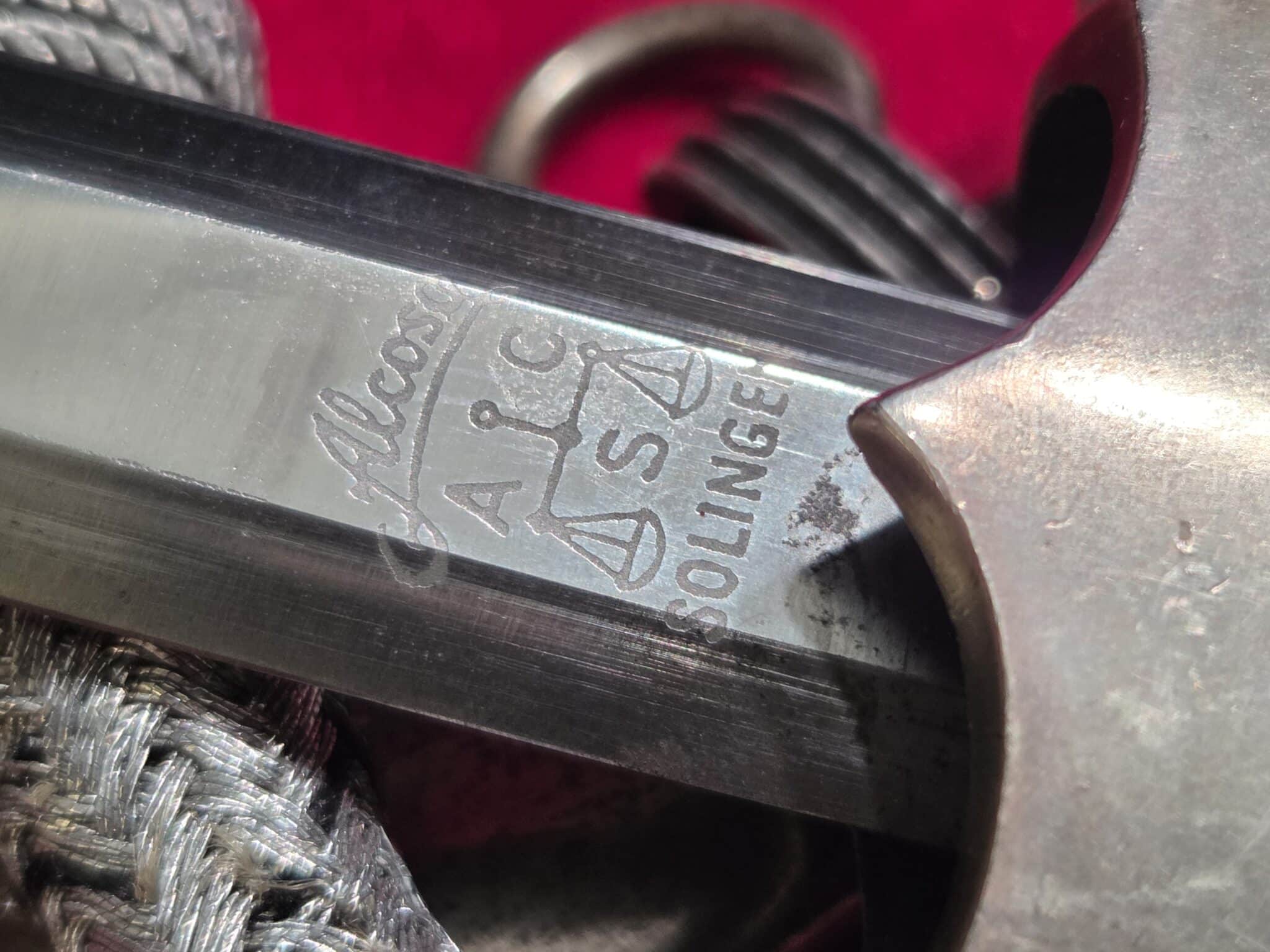 Alcoso (Scales) TM. Hilt fittings show wear/age with patinaed crossguard and spherical pommel with raised sunwheel swastika. Black solid celluloid ridged grip is perfect with no nicks or cracks. Polished blade grades EX++ showing light gray/speckling, tip of blade remains in a point, and is complete with buffer pad. Deeply patinaed scabbard has no dents. Dagger is complete with Bahnschutz portepee which grades EX++/Near MINT.