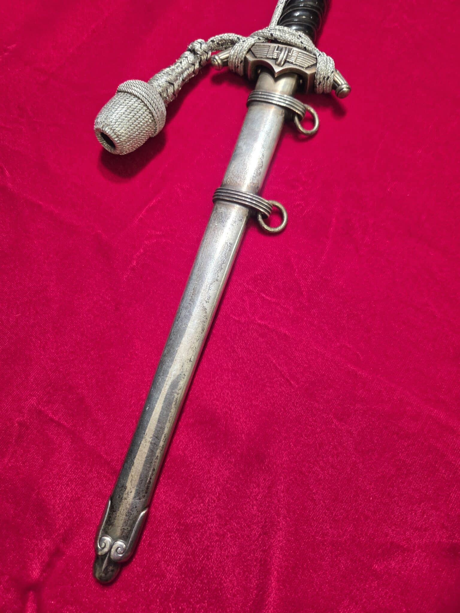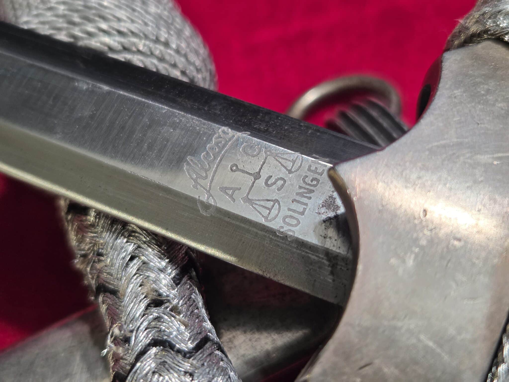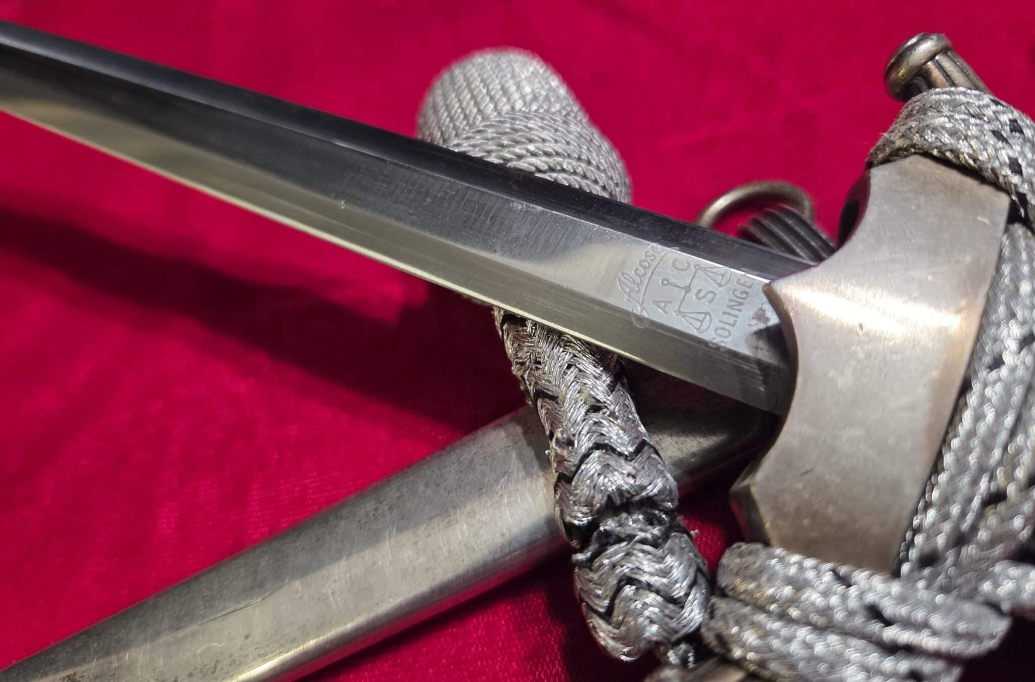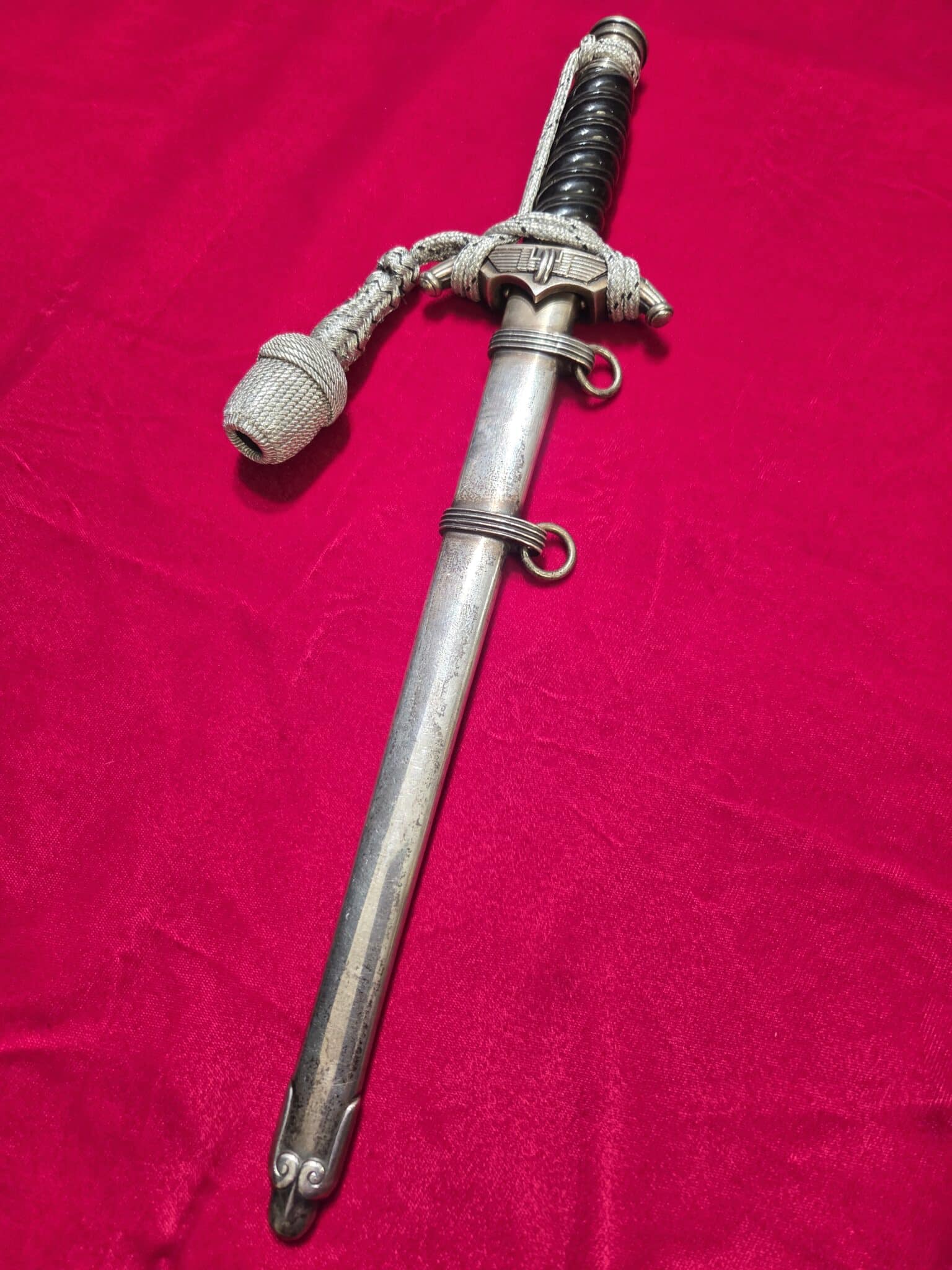 Alcoso (Scales) TM. Hilt fittings show wear/age with patinaed crossguard and spherical pommel with raised sunwheel swastika. Black solid celluloid ridged grip is perfect with no nicks or cracks. Polished blade grades EX++ showing light gray/speckling, tip of blade remains in a point, and is complete with buffer pad. Deeply patinaed scabbard has no dents. Dagger is complete with Bahnschutz portepee which grades EX++/Near MINT.