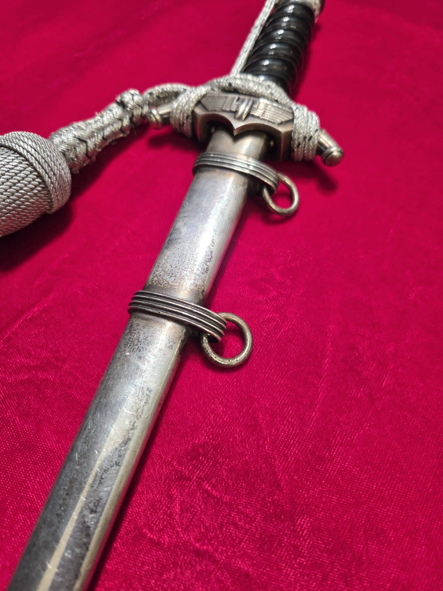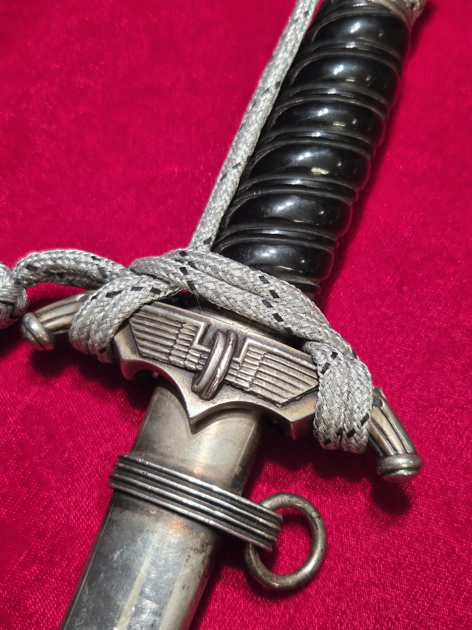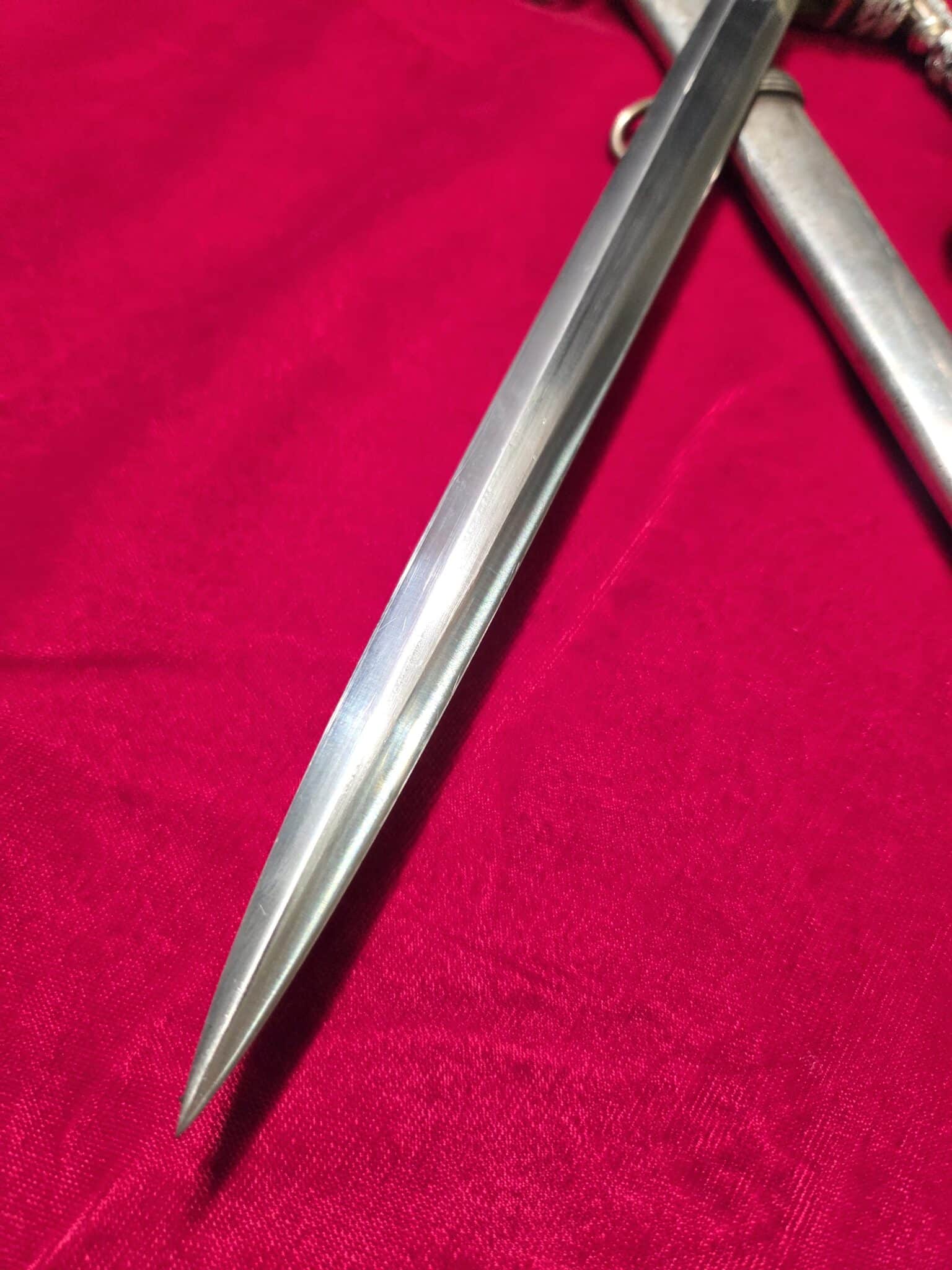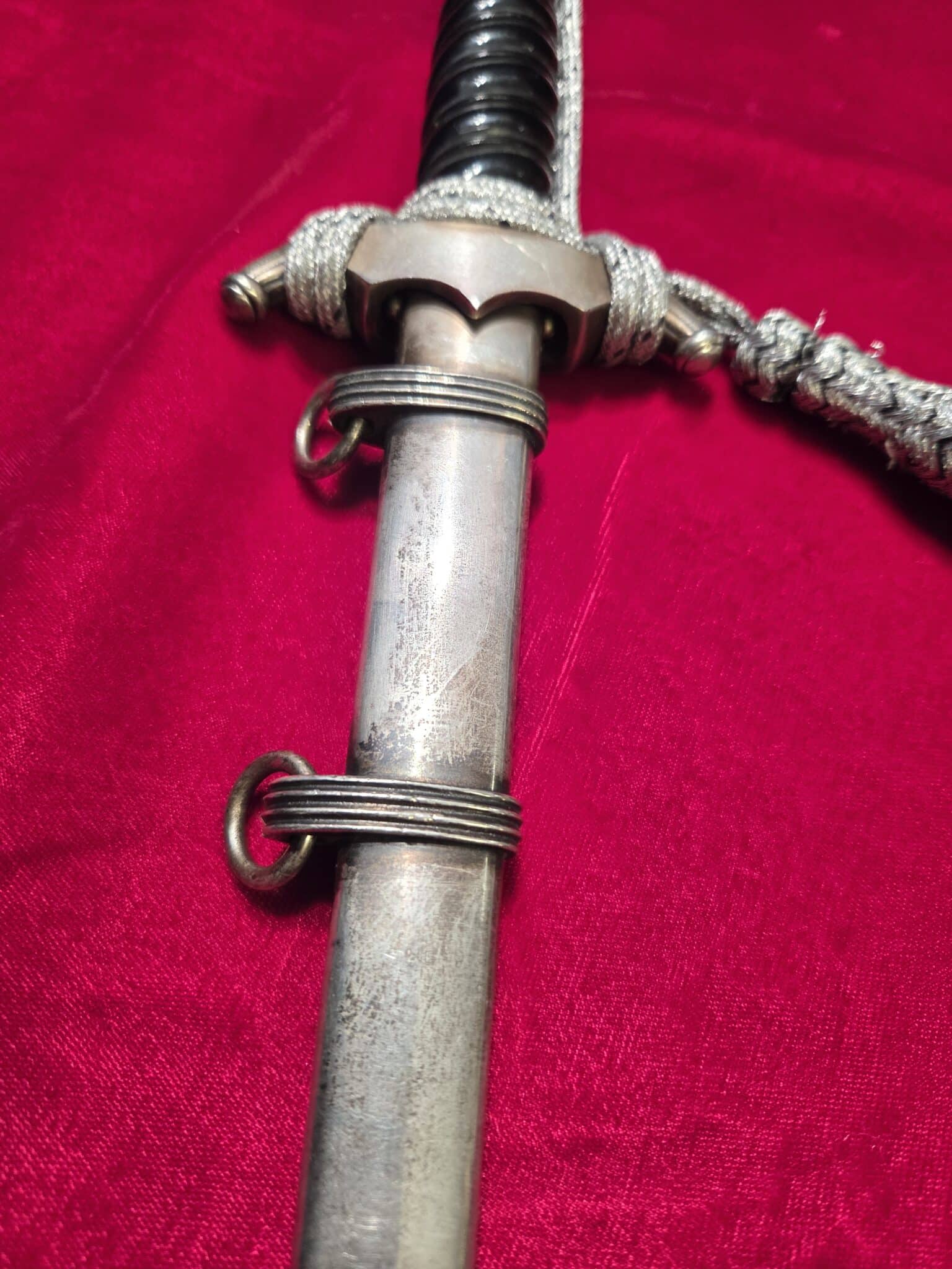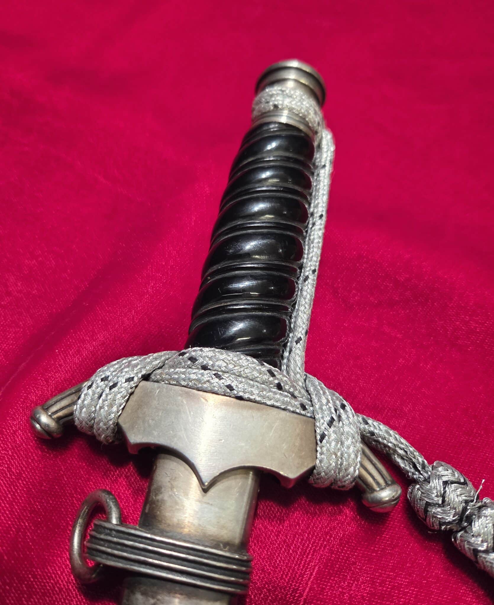 Alcoso (Scales) TM. Hilt fittings show wear/age with patinaed crossguard and spherical pommel with raised sunwheel swastika. Black solid celluloid ridged grip is perfect with no nicks or cracks. Polished blade grades EX++ showing light gray/speckling, tip of blade remains in a point, and is complete with buffer pad. Deeply patinaed scabbard has no dents. Dagger is complete with Bahnschutz portepee which grades EX++/Near MINT.