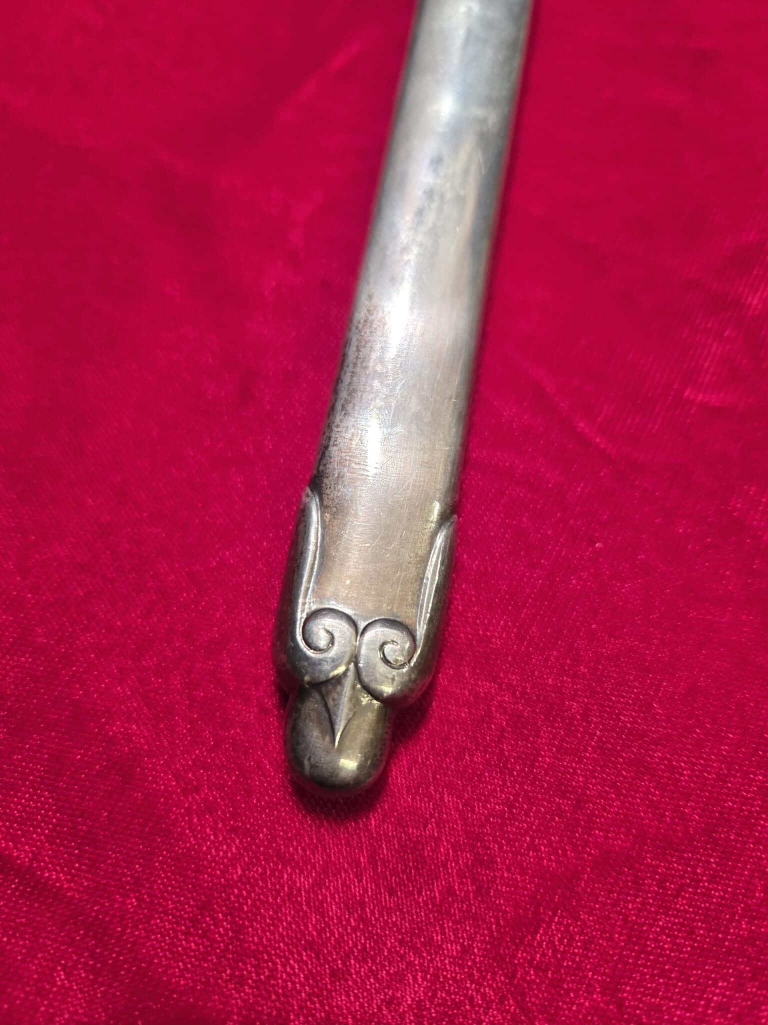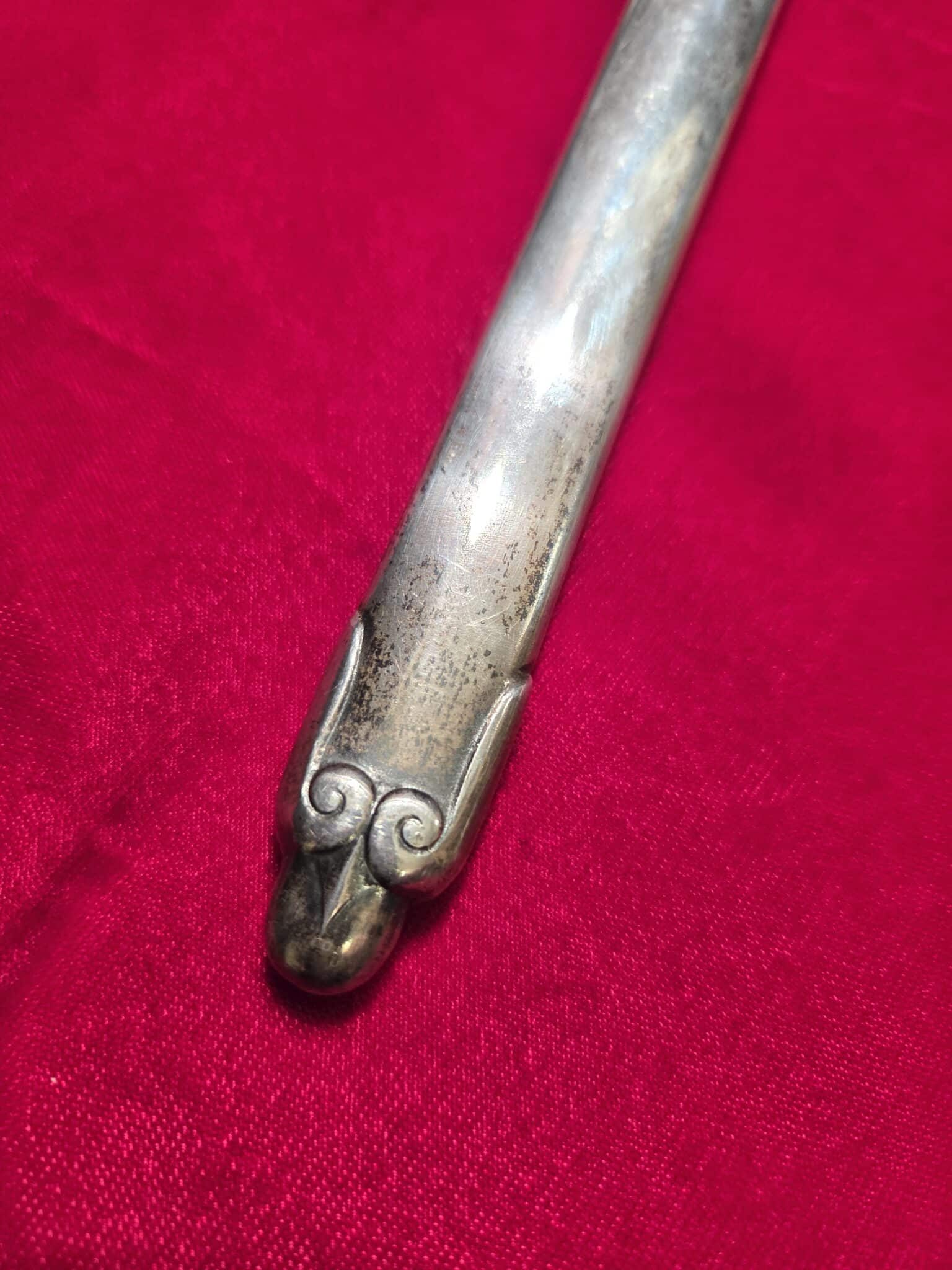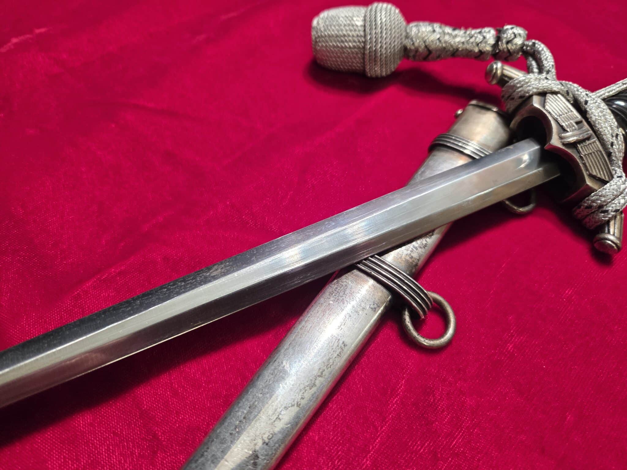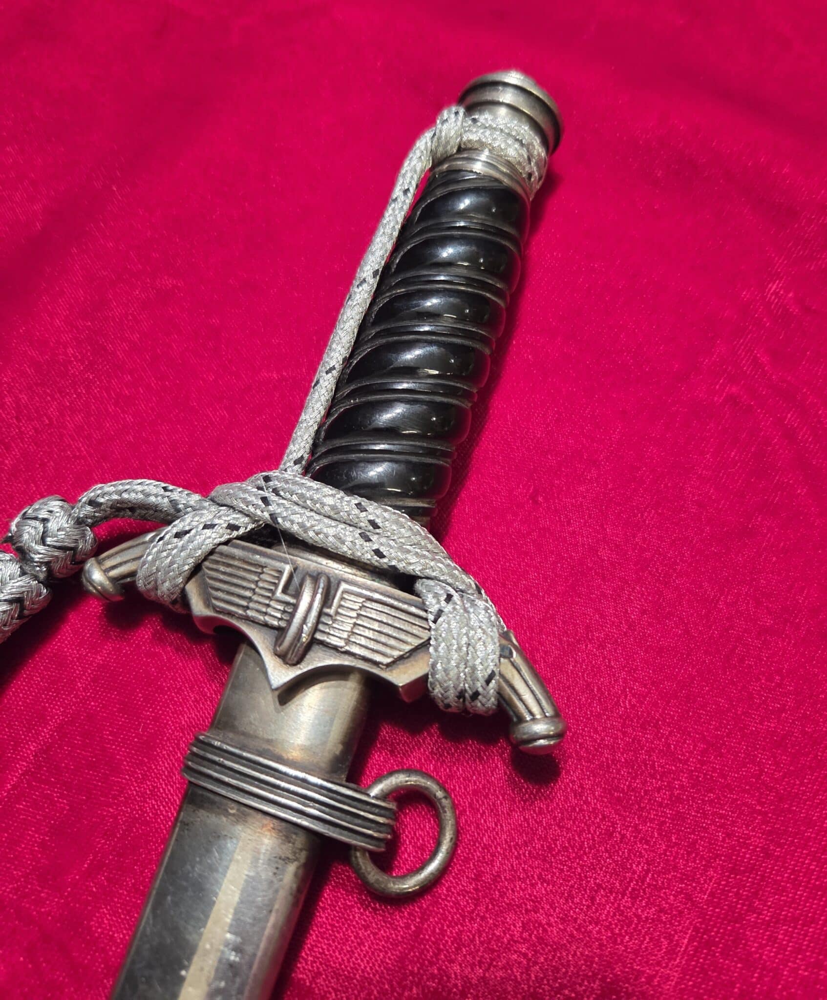 Alcoso (Scales) TM. Hilt fittings show wear/age with patinaed crossguard and spherical pommel with raised sunwheel swastika. Black solid celluloid ridged grip is perfect with no nicks or cracks. Polished blade grades EX++ showing light gray/speckling, tip of blade remains in a point, and is complete with buffer pad. Deeply patinaed scabbard has no dents. Dagger is complete with Bahnschutz portepee which grades EX++/Near MINT.