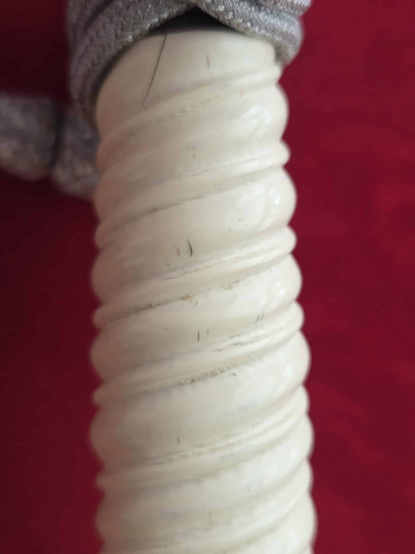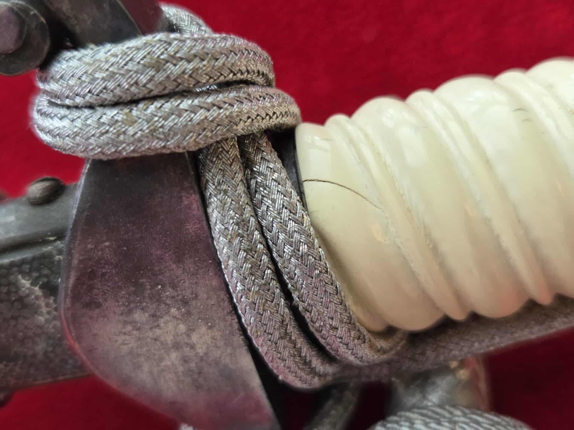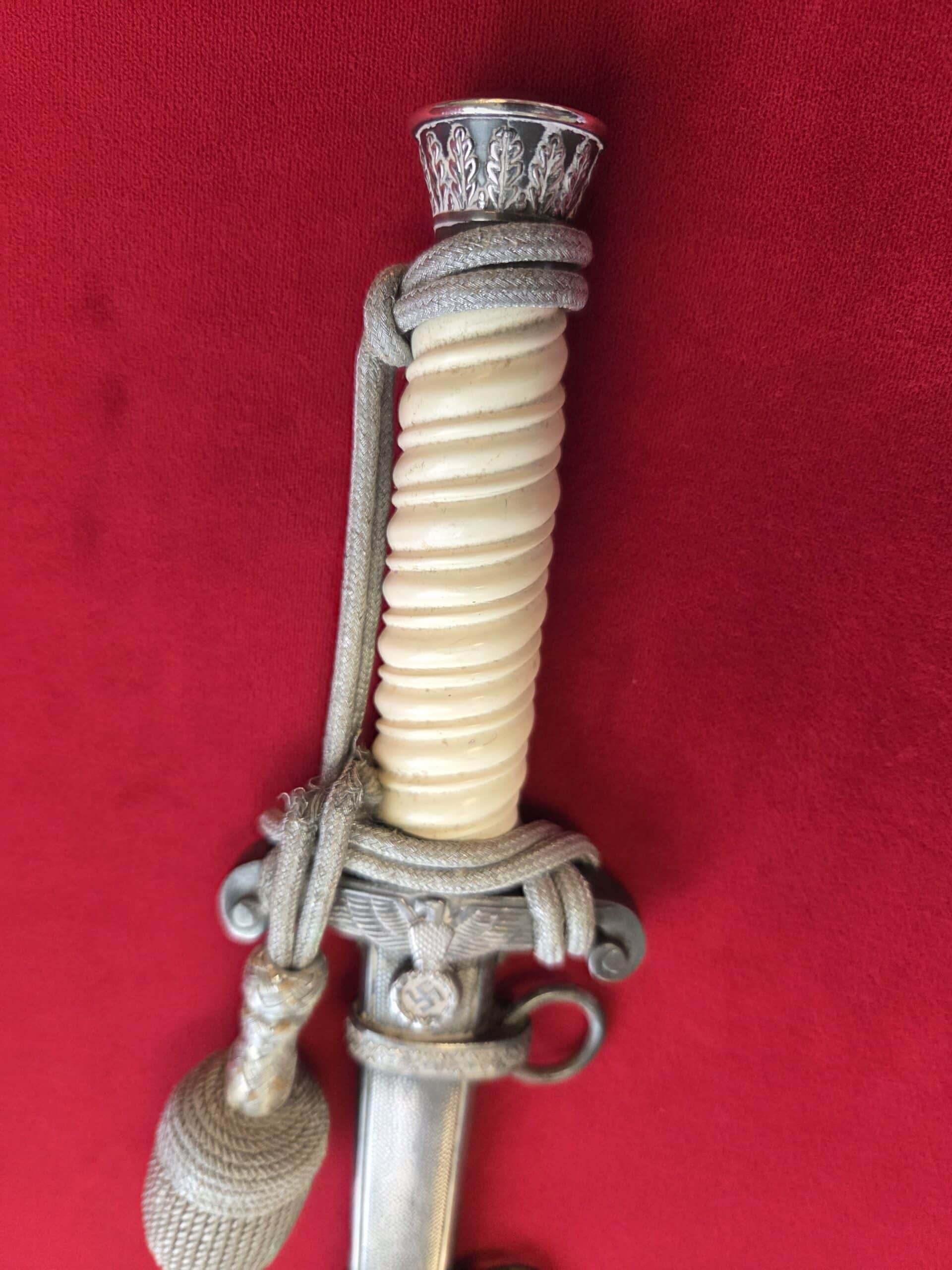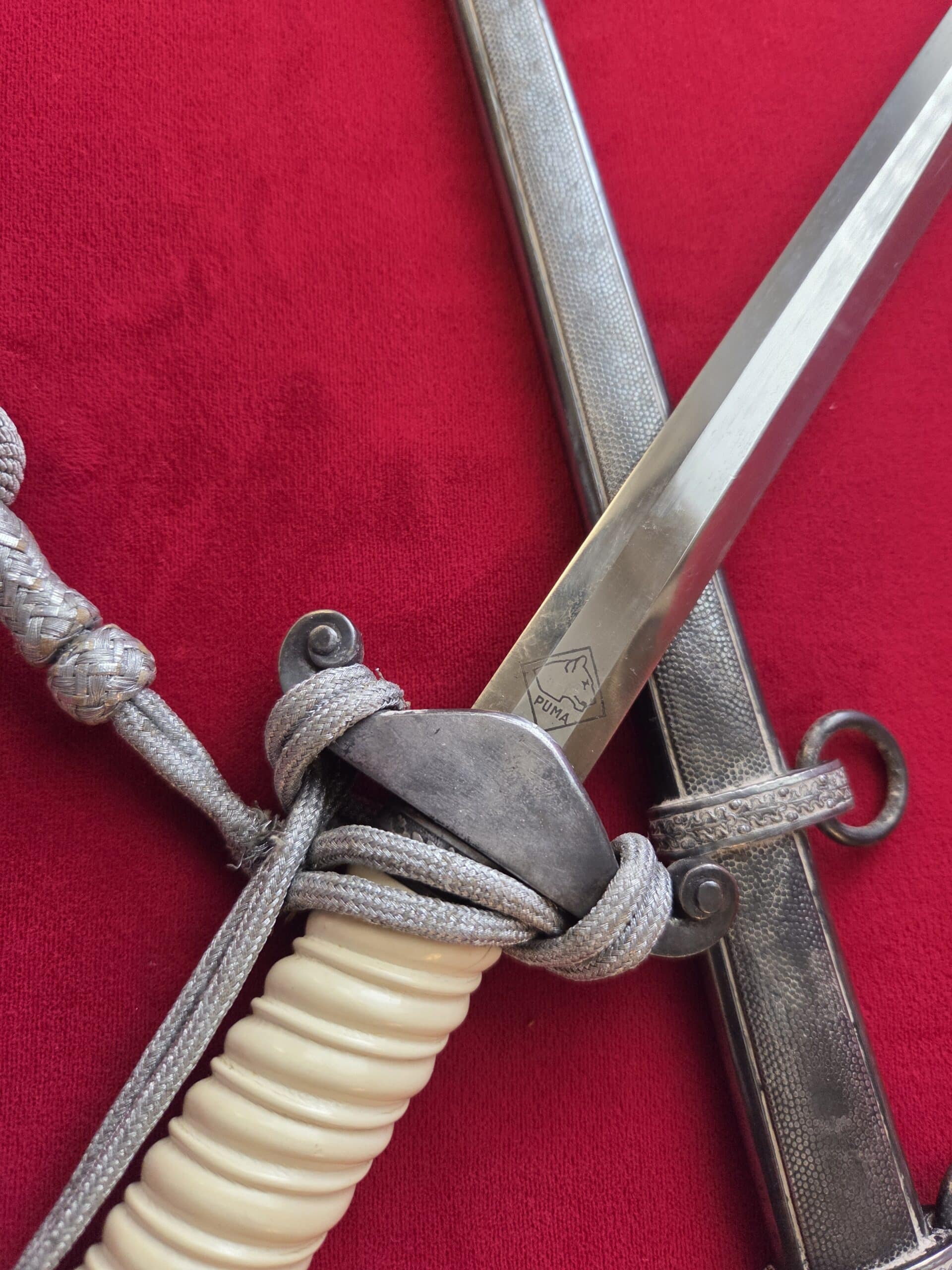 PUMA, SOLINGEN with Puma torso in box TM. Silver-plated hilt fittings display dark age patina to well detailed oak leaf embellished pommel, ferrule and crossguard with well-detailed eagle. Beautiful ivory grip with one hairline crack on reverse side near ferrule. Polished blade grades EX++ showing very light runner marks and no damage. Silver-plated scabbard shows light wear with nicely detailed pebbled panels and oak leaf suspension bands with no dents or depressions. Complete with portepee which shows wear/age.