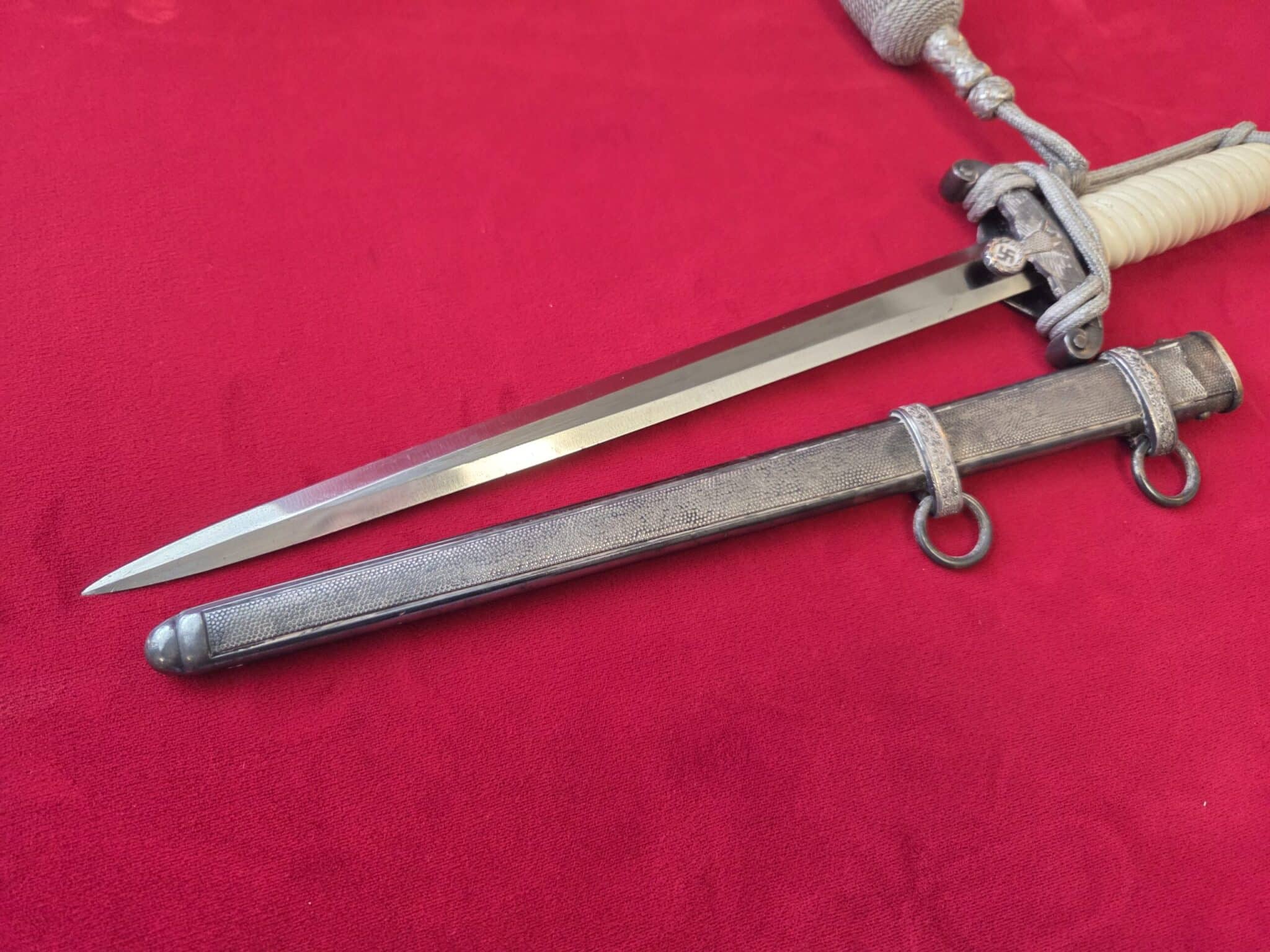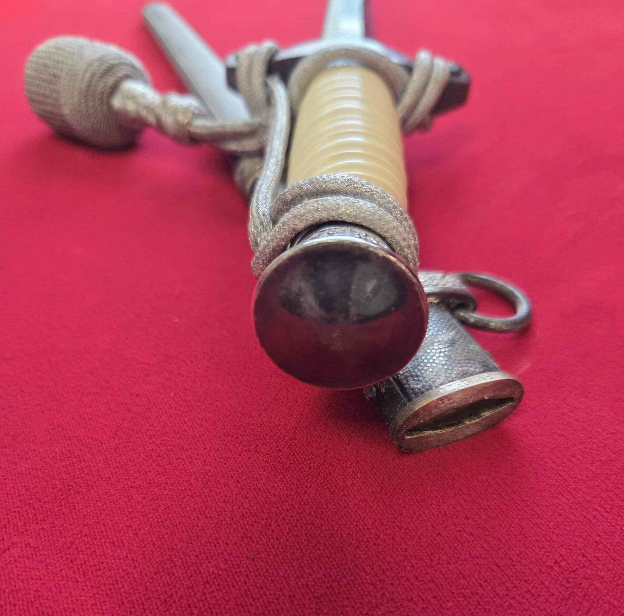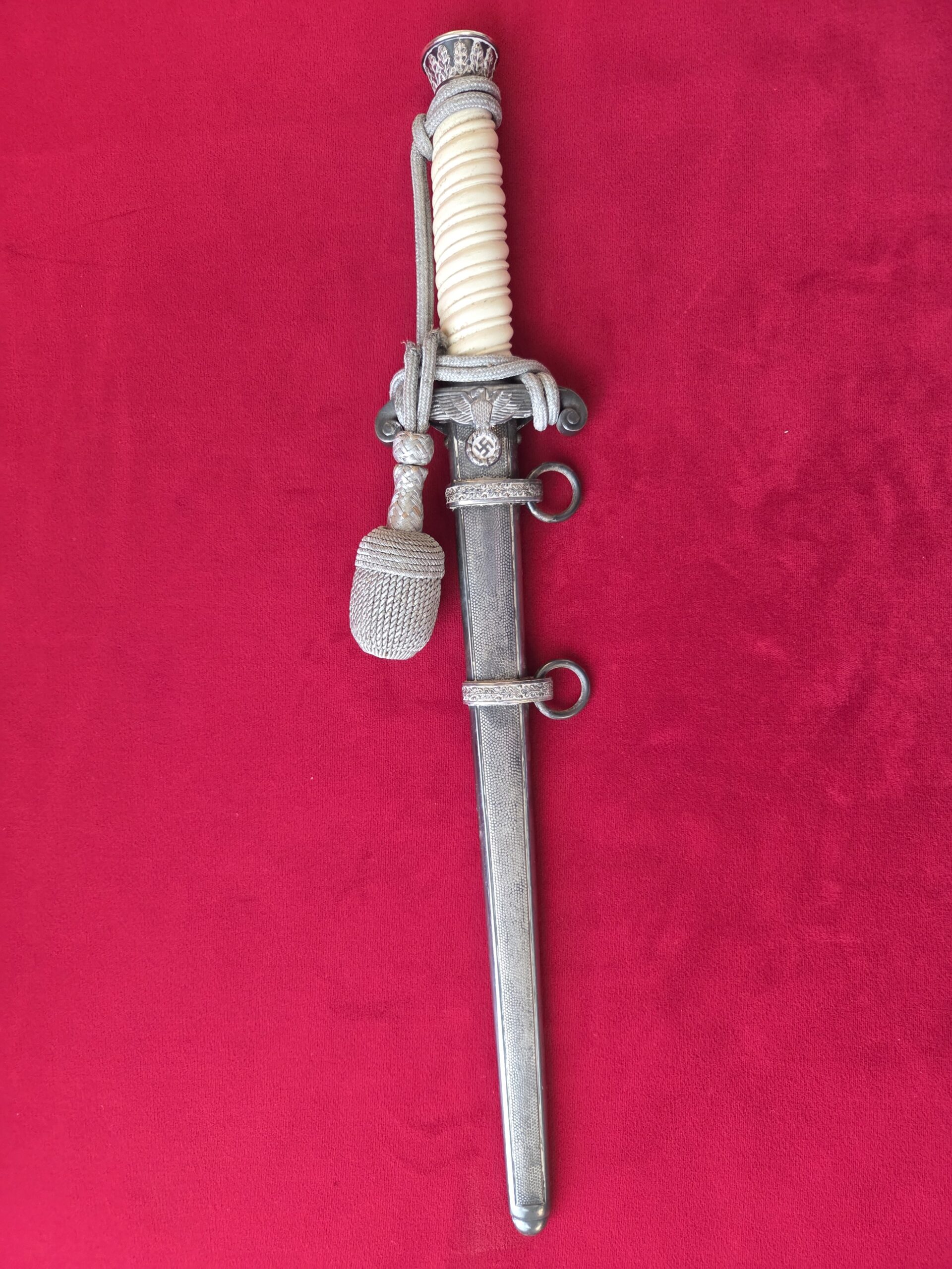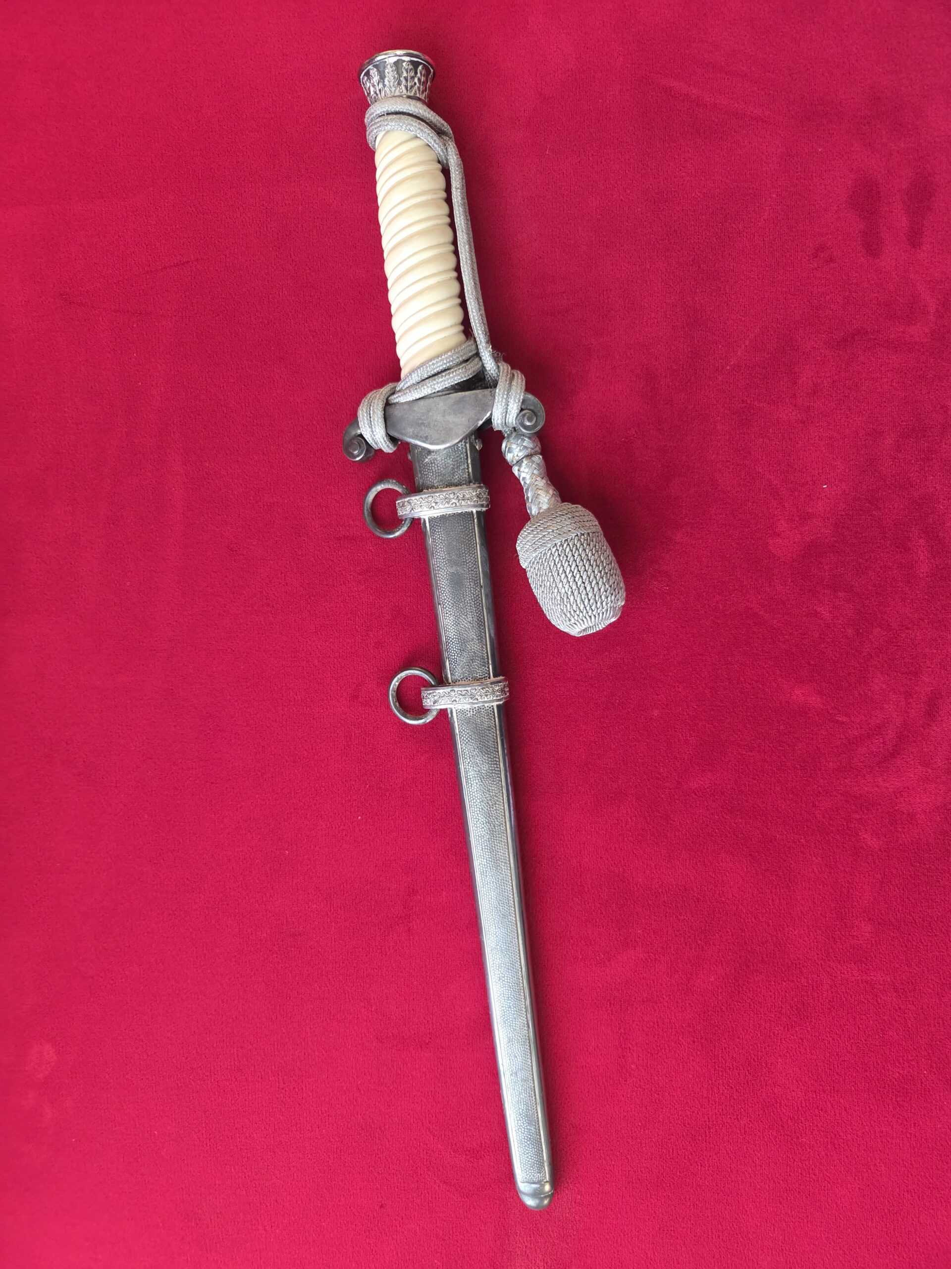 PUMA, SOLINGEN with Puma torso in box TM. Silver-plated hilt fittings display dark age patina to well detailed oak leaf embellished pommel, ferrule and crossguard with well-detailed eagle. Beautiful ivory grip with one hairline crack on reverse side near ferrule. Polished blade grades EX++ showing very light runner marks and no damage. Silver-plated scabbard shows light wear with nicely detailed pebbled panels and oak leaf suspension bands with no dents or depressions. Complete with portepee which shows wear/age.