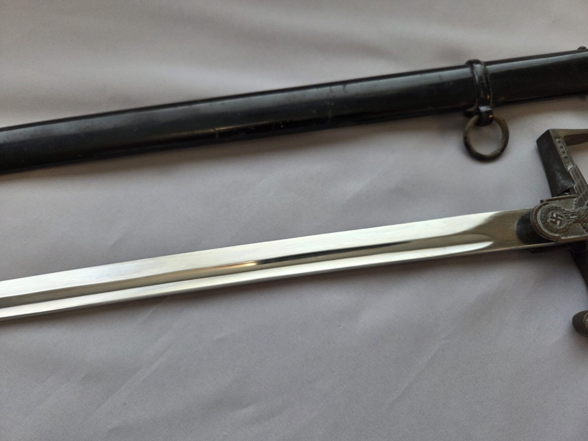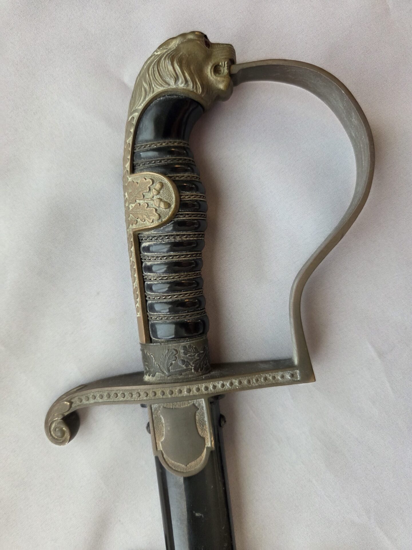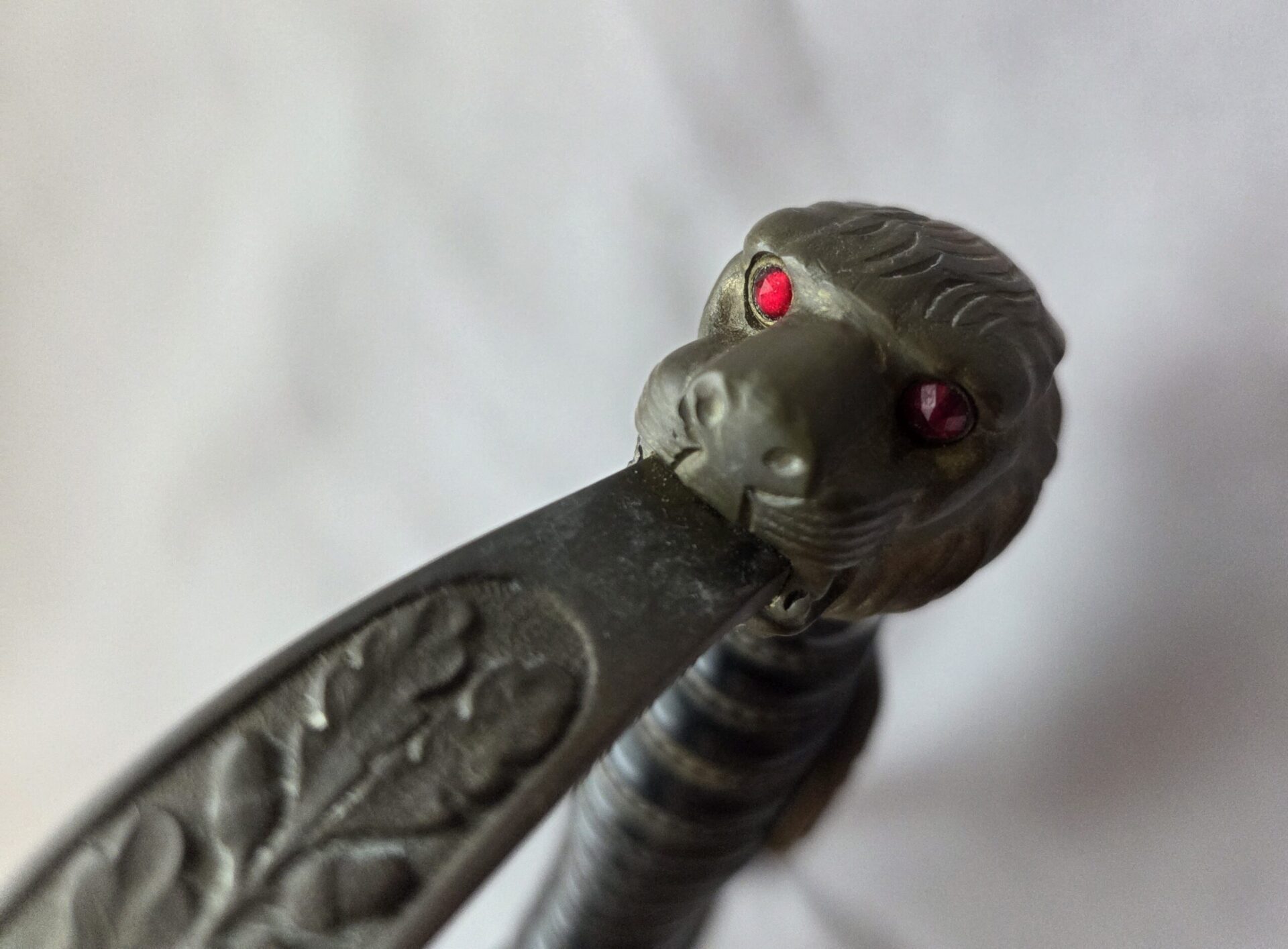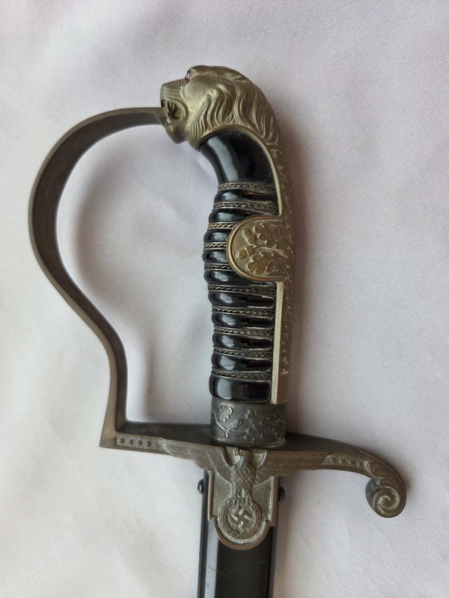 Anton Wingen, Jr., standing knight in armor above Solingen TM. A photograph of this RARE sword appears on page 149 of “Collecting the Edged Weapons of the Third Reich”, Volume I. Much of the muted, honey-gold, fire gilding remaining in the recesses of the lion head pommel with red glass eyes, ferrule, as well as the crossguard. The dent-free steel scabbard retains approximately 85% of the original black enamel showing surface wear/crazing to obverse/reverse including the suspension ring.