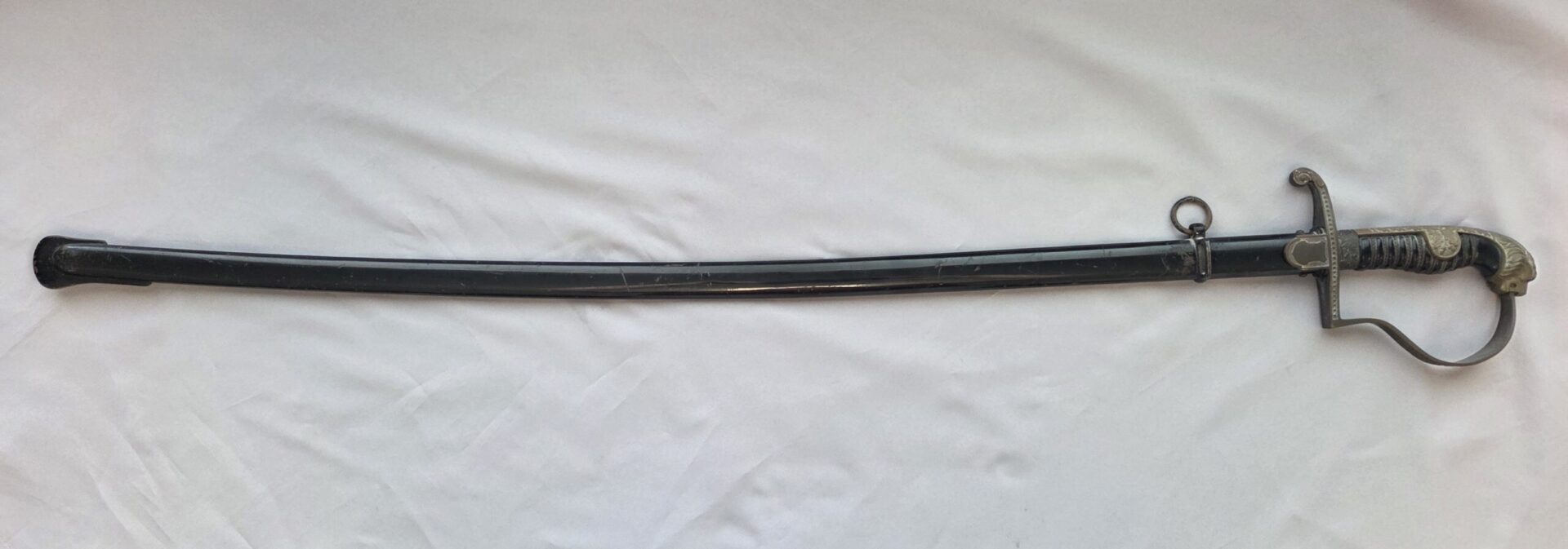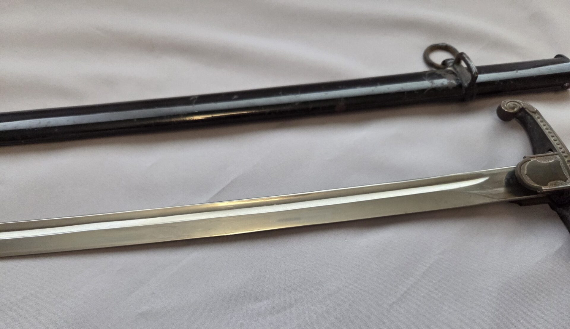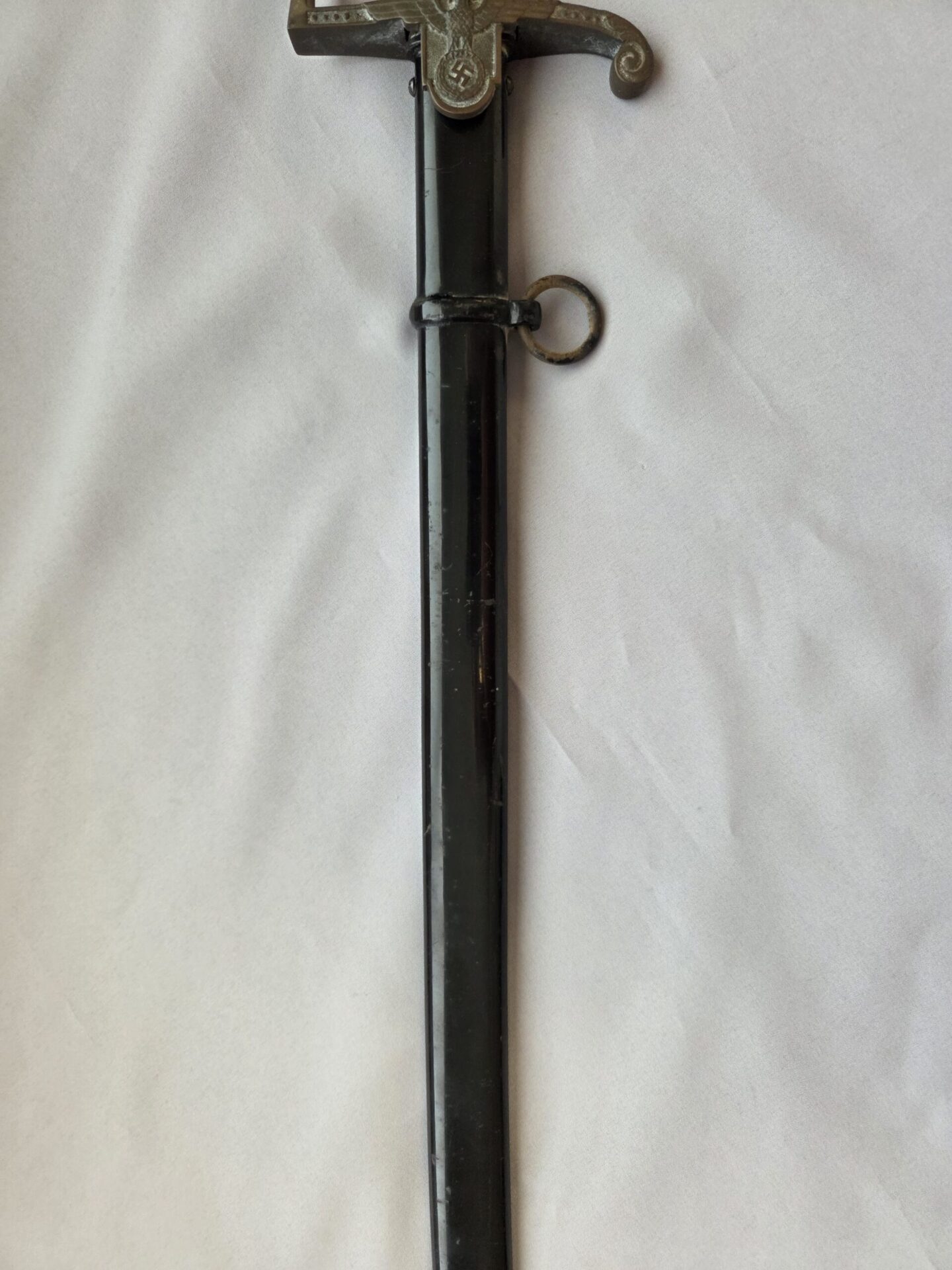 Anton Wingen, Jr., standing knight in armor above Solingen TM. A photograph of this RARE sword appears on page 149 of “Collecting the Edged Weapons of the Third Reich”, Volume I. Much of the muted, honey-gold, fire gilding remaining in the recesses of the lion head pommel with red glass eyes, ferrule, as well as the crossguard. The dent-free steel scabbard retains approximately 85% of the original black enamel showing surface wear/crazing to obverse/reverse including the suspension ring.