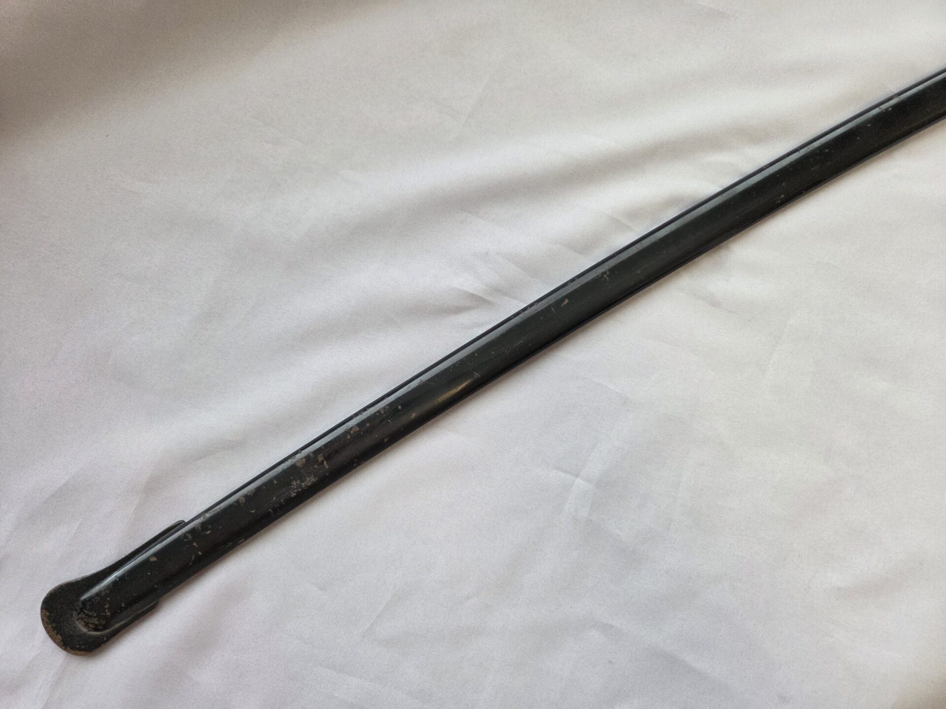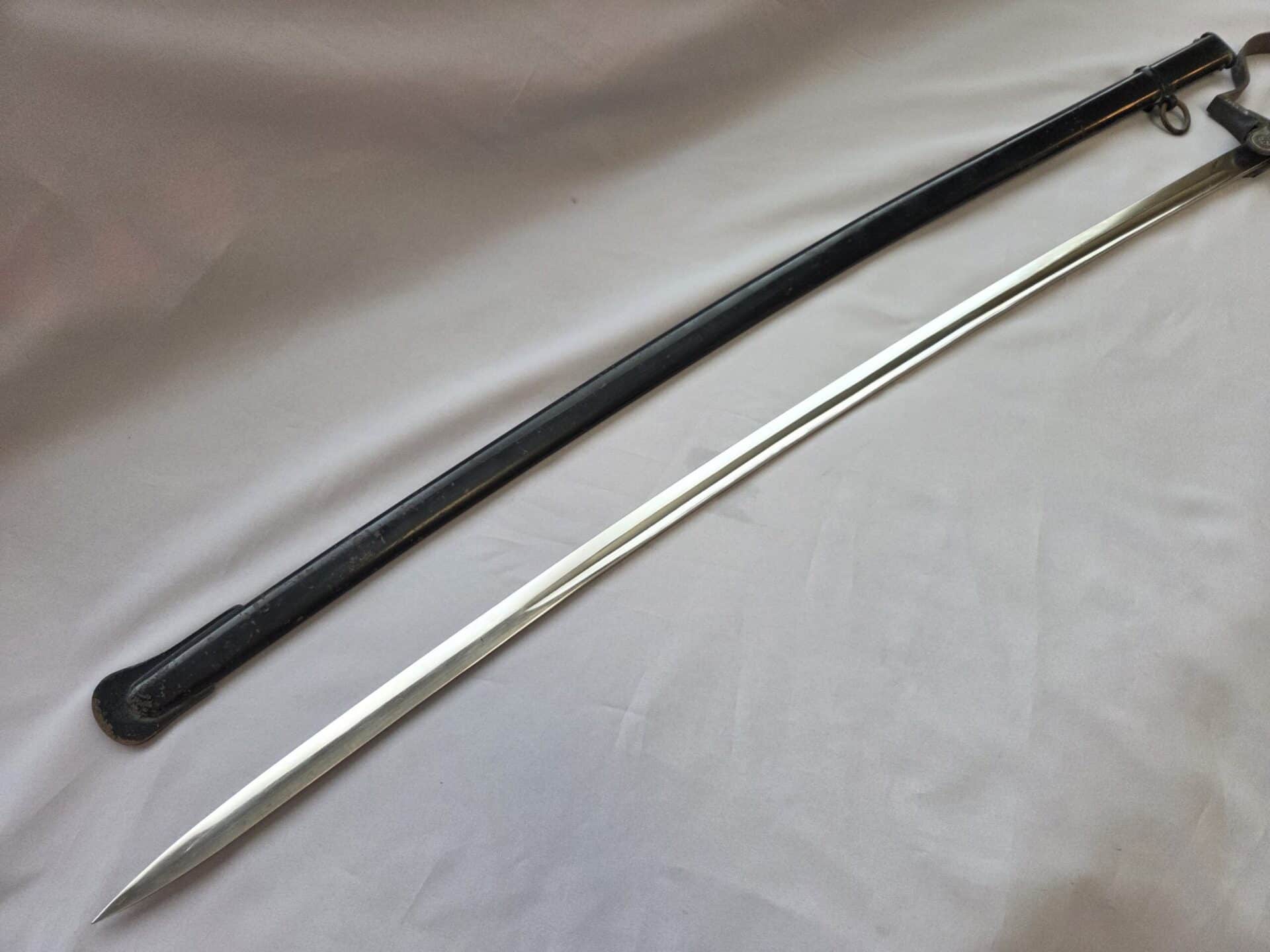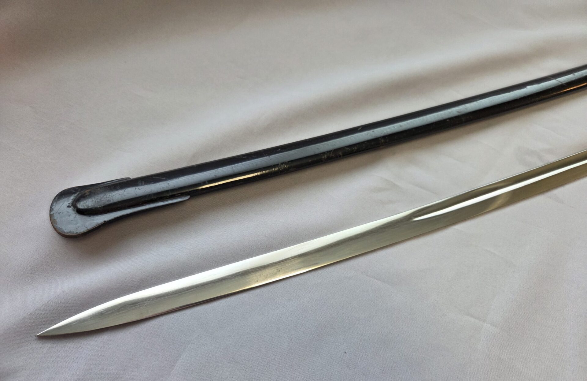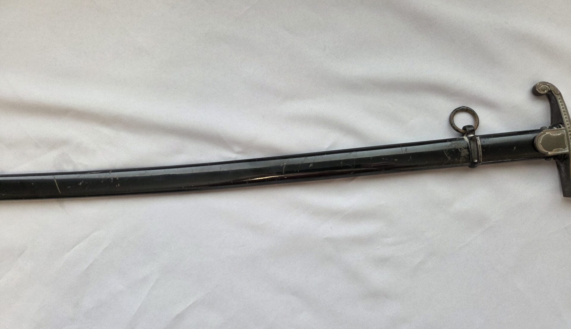 Anton Wingen, Jr., standing knight in armor above Solingen TM. A photograph of this RARE sword appears on page 149 of “Collecting the Edged Weapons of the Third Reich”, Volume I. Much of the muted, honey-gold, fire gilding remaining in the recesses of the lion head pommel with red glass eyes, ferrule, as well as the crossguard. The dent-free steel scabbard retains approximately 85% of the original black enamel showing surface wear/crazing to obverse/reverse including the suspension ring.