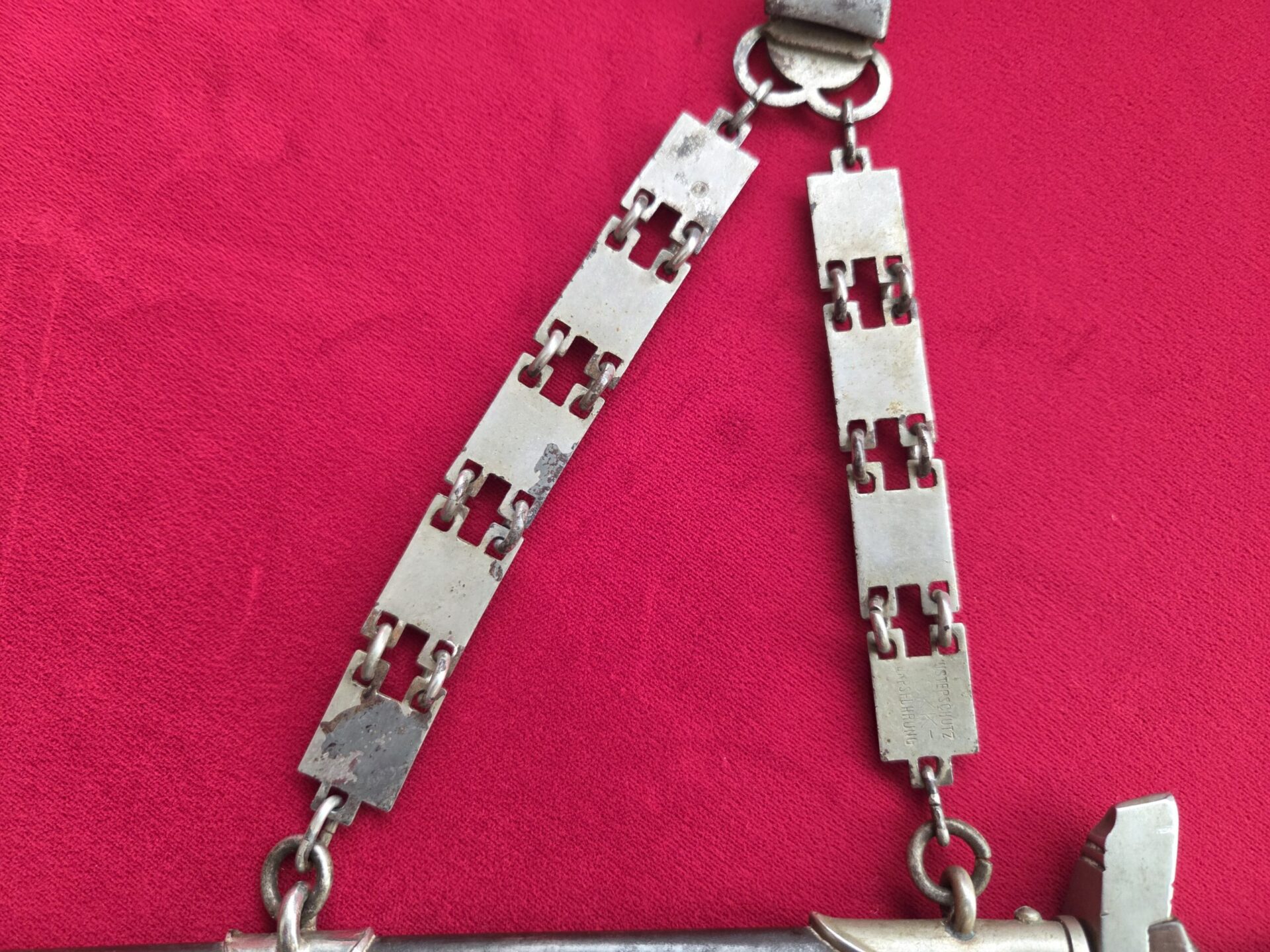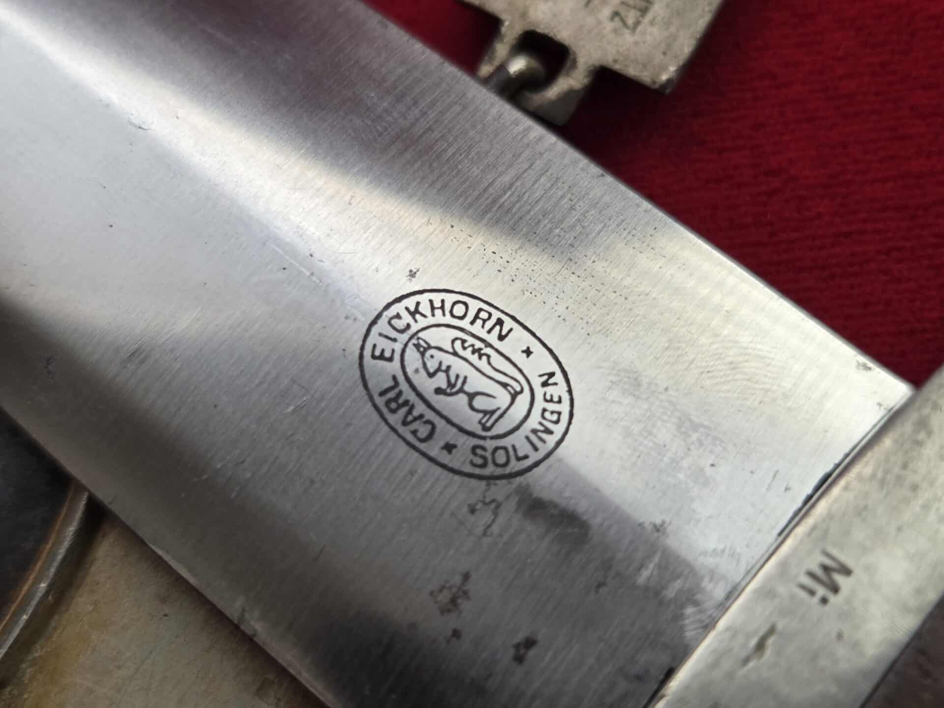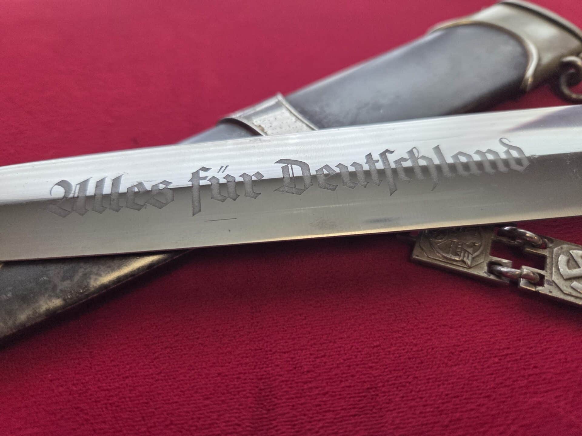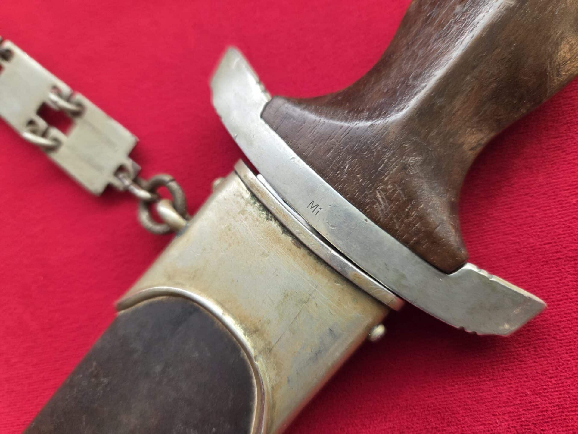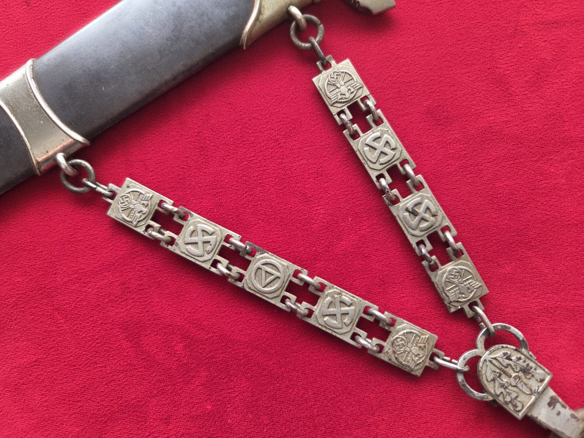 Carl Eickhorn Solingen, squirrel within small double-oval TM. The blade is acid etched with “Alles für Deutschland” motto and retains 100% of dark gray background frosting. There are no nicks to the cutting edge, light runner marks and the tip of the blade remains in a point. The nickel-silver plated crossguards show normal wear and the reverse side of the lower crossguard is marked with “Mi” (Mitte). The deep brown wooden grip has scuff marks but no chips or hairline cracks. The nickel-silver eagle and roundel are properly inset. The anodized steel scabbard is dent free. Four of the five screws remain in place for the nickel-silver plated scabbard fittings. The lower scabbard fitting has one very small ding. The ball has some very tiny indentations but overall in great condition. The chain has four upper and five lower links which consist of the NSKK eagles, sun wheel swastikas and Nordic triangular “Thurs” rune (symbolizing the power of the God Thor). These correct links are stamped “NSKK Korpsfuhrung Musterschutz” and “RZM M5/8″. The clip on the chain functions properly. Complete with leather belt loop in EXC++ condition.
