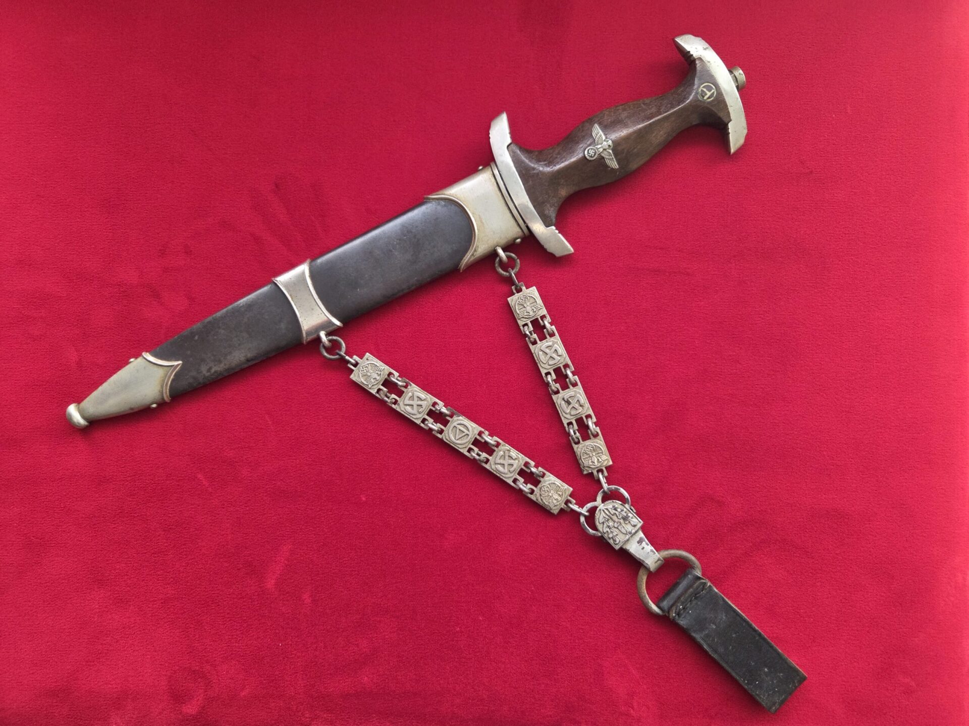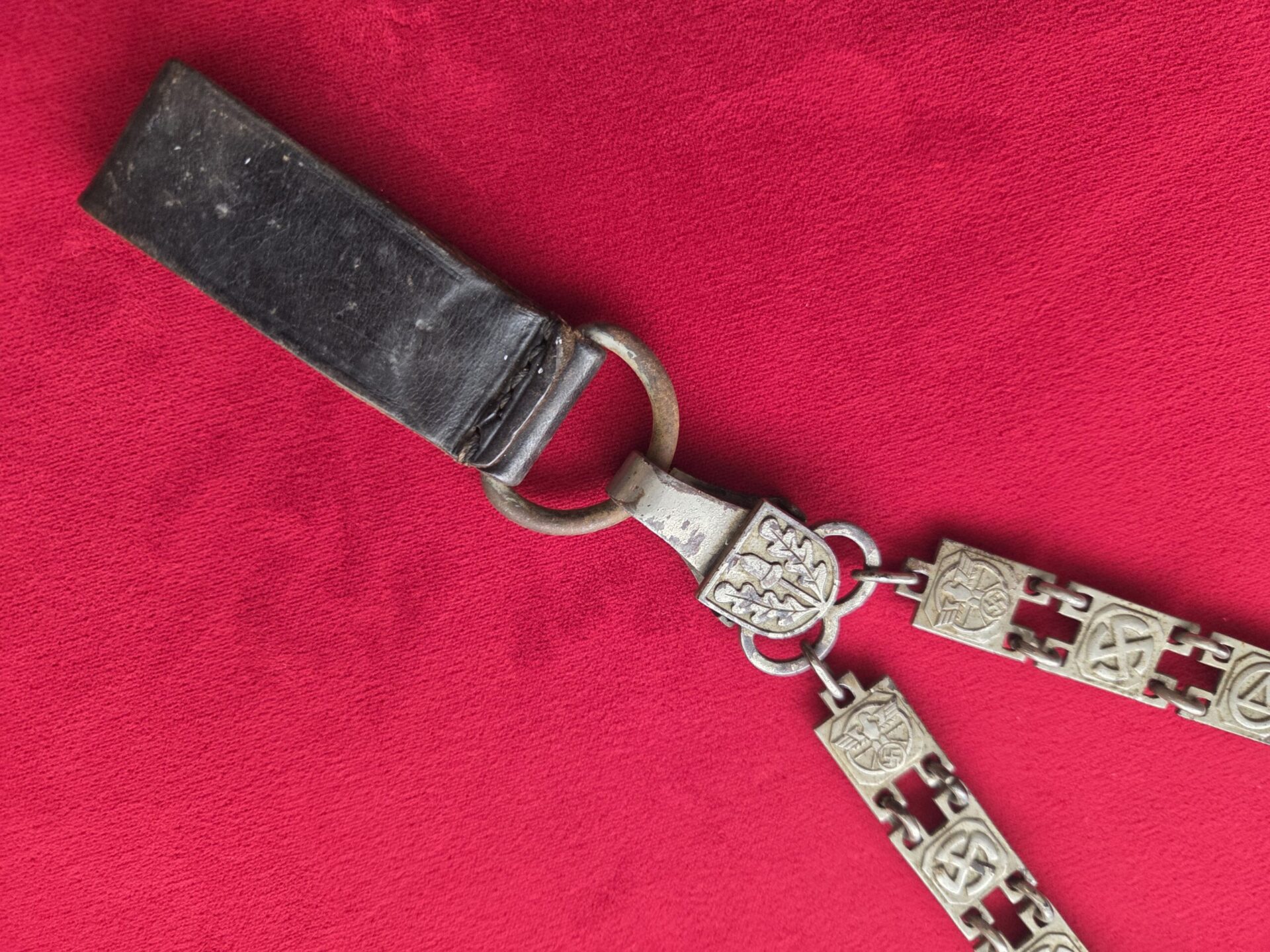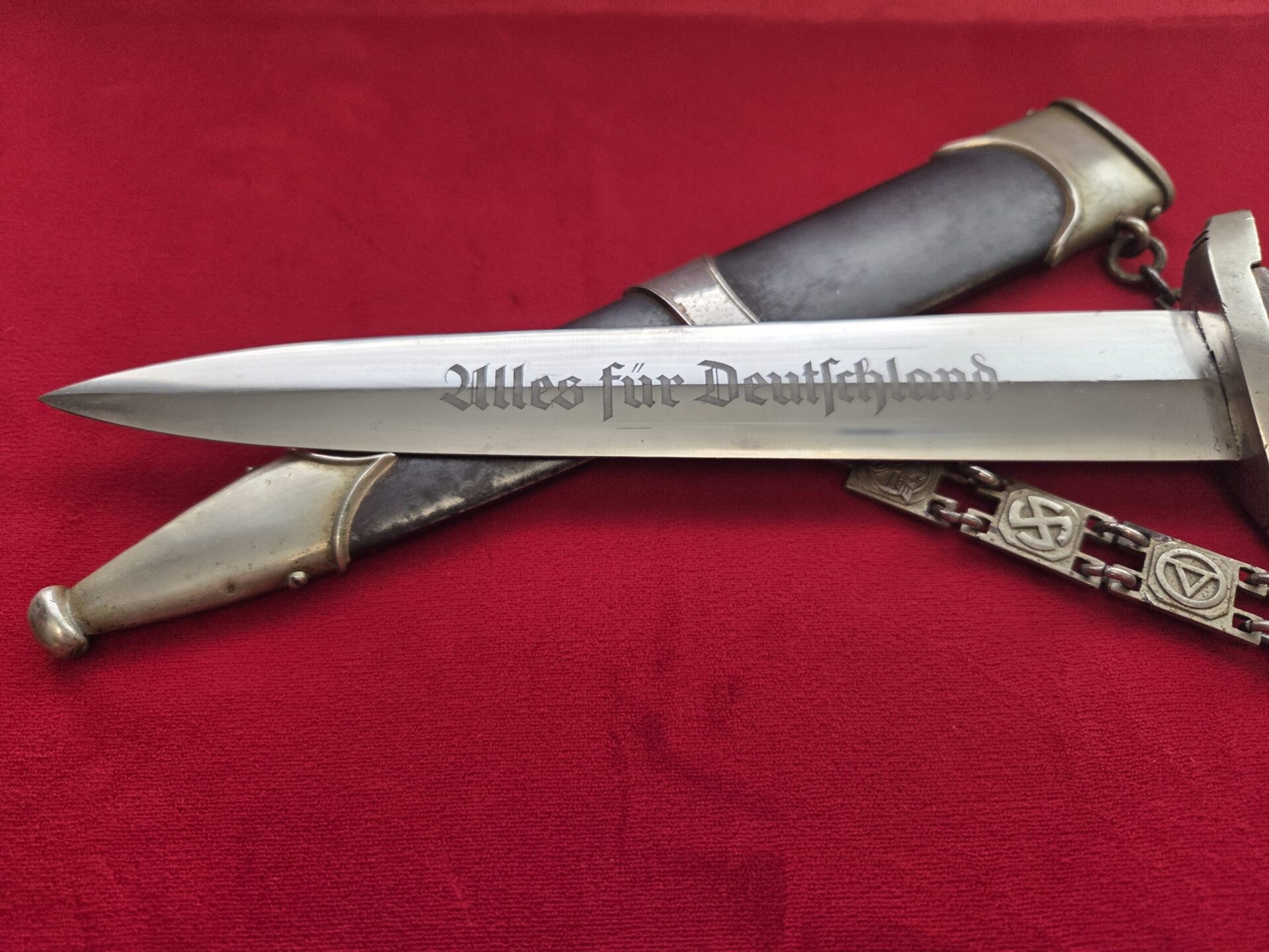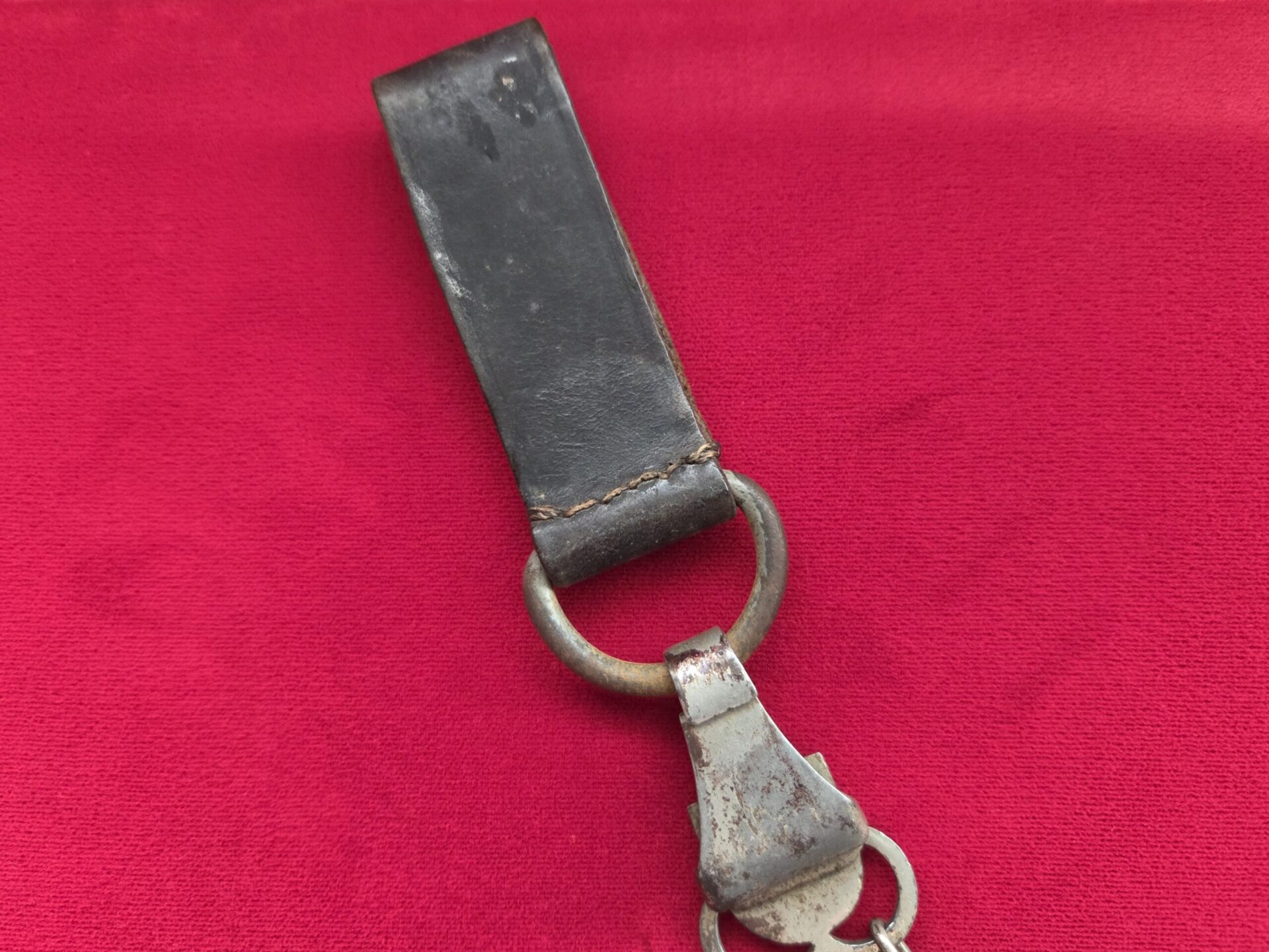 Carl Eickhorn Solingen, squirrel within small double-oval TM. The blade is acid etched with “Alles für Deutschland” motto and retains 100% of dark gray background frosting. There are no nicks to the cutting edge, light runner marks and the tip of the blade remains in a point. The nickel-silver plated crossguards show normal wear and the reverse side of the lower crossguard is marked with “Mi” (Mitte). The deep brown wooden grip has scuff marks but no chips or hairline cracks. The nickel-silver eagle and roundel are properly inset. The anodized steel scabbard is dent free. Four of the five screws remain in place for the nickel-silver plated scabbard fittings. The lower scabbard fitting has one very small ding. The ball has some very tiny indentations but overall in great condition. The chain has four upper and five lower links which consist of the NSKK eagles, sun wheel swastikas and Nordic triangular “Thurs” rune (symbolizing the power of the God Thor). These correct links are stamped “NSKK Korpsfuhrung Musterschutz” and “RZM M5/8″. The clip on the chain functions properly. Complete with leather belt loop in EXC++ condition.