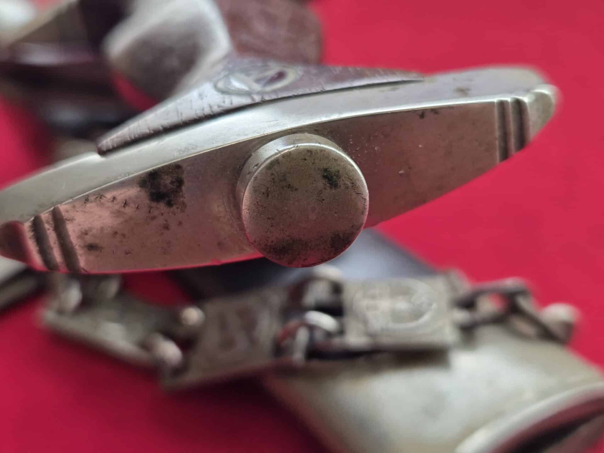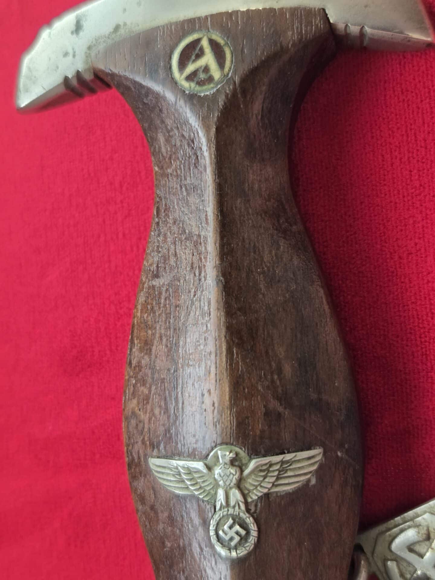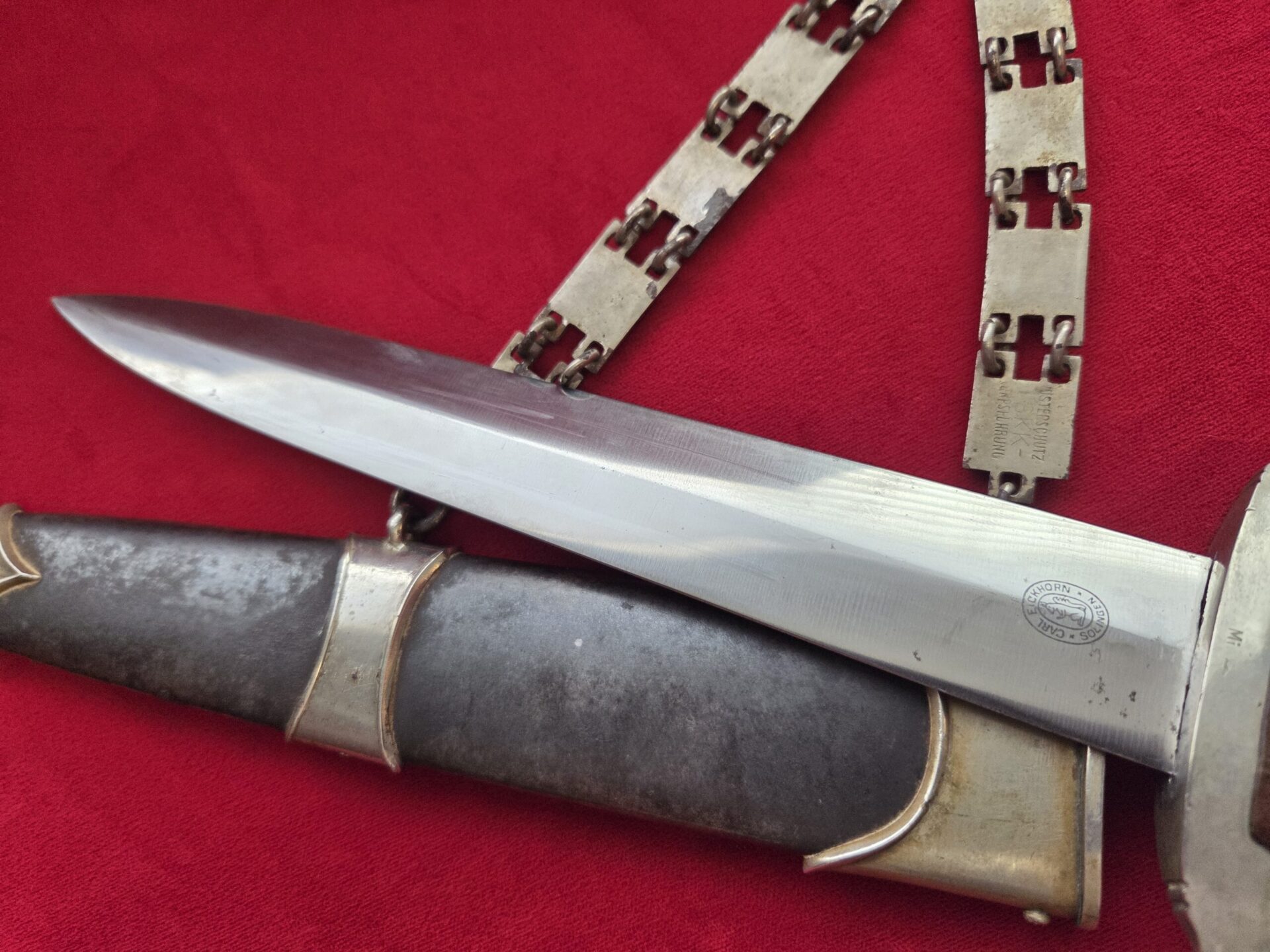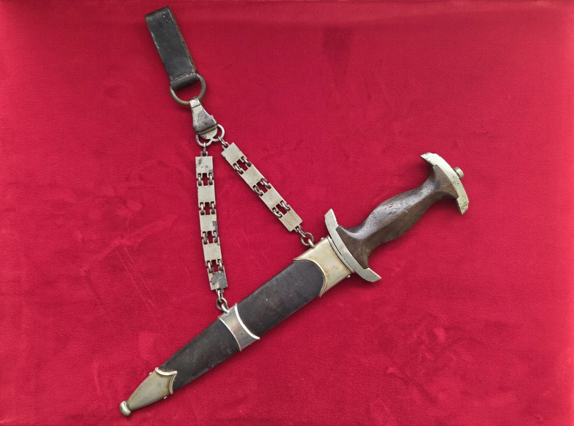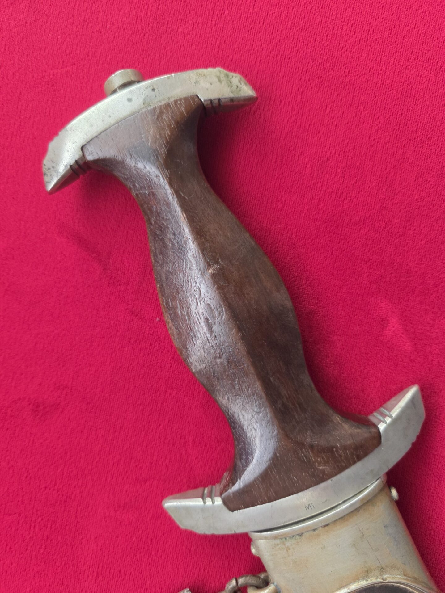 Carl Eickhorn Solingen, squirrel within small double-oval TM. The blade is acid etched with “Alles für Deutschland” motto and retains 100% of dark gray background frosting. There are no nicks to the cutting edge, light runner marks and the tip of the blade remains in a point. The nickel-silver plated crossguards show normal wear and the reverse side of the lower crossguard is marked with “Mi” (Mitte). The deep brown wooden grip has scuff marks but no chips or hairline cracks. The nickel-silver eagle and roundel are properly inset. The anodized steel scabbard is dent free. Four of the five screws remain in place for the nickel-silver plated scabbard fittings. The lower scabbard fitting has one very small ding. The ball has some very tiny indentations but overall in great condition. The chain has four upper and five lower links which consist of the NSKK eagles, sun wheel swastikas and Nordic triangular “Thurs” rune (symbolizing the power of the God Thor). These correct links are stamped “NSKK Korpsfuhrung Musterschutz” and “RZM M5/8″. The clip on the chain functions properly. Complete with leather belt loop in EXC++ condition.