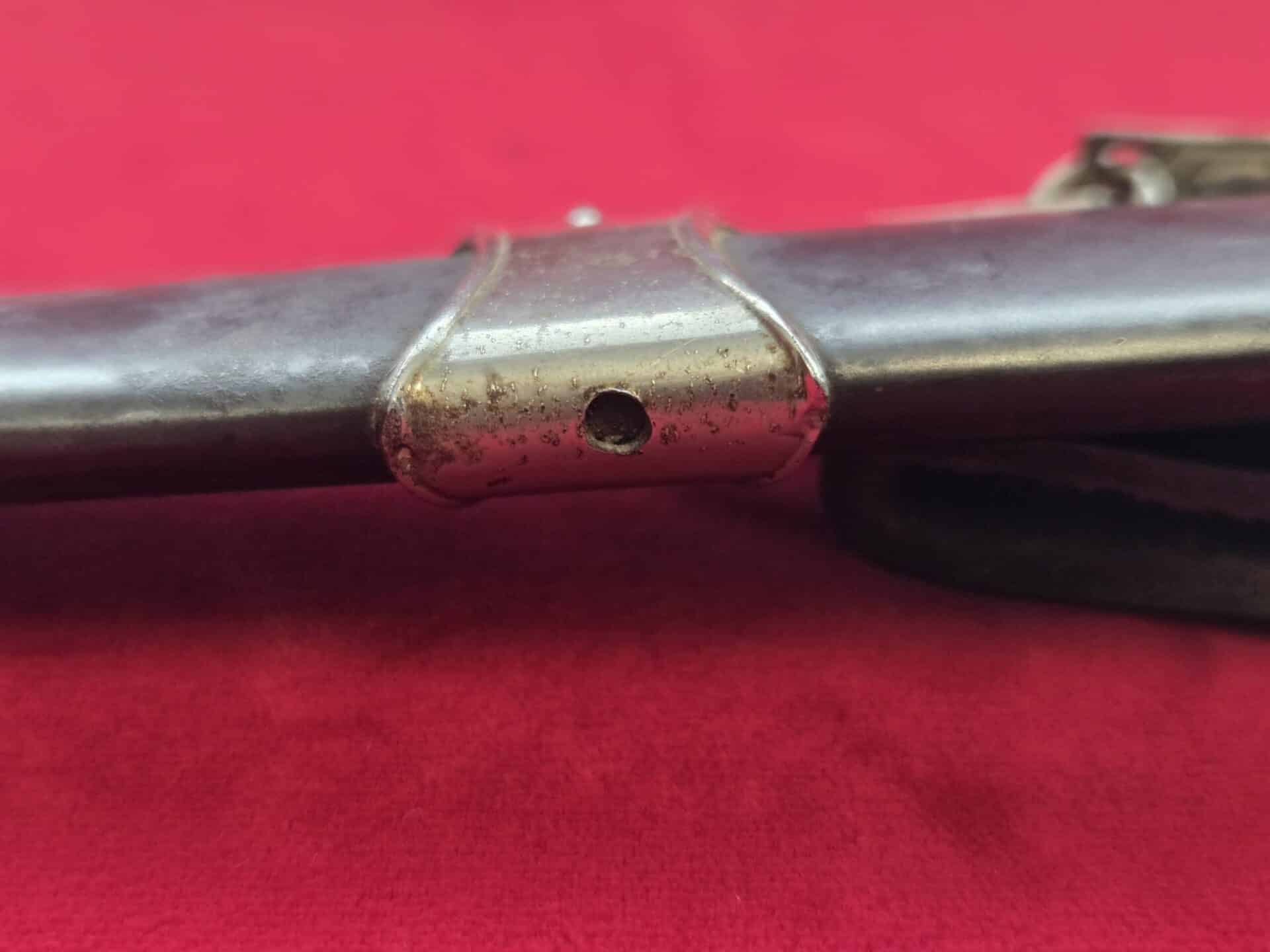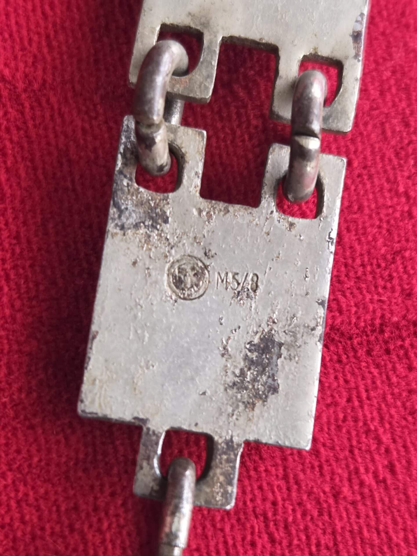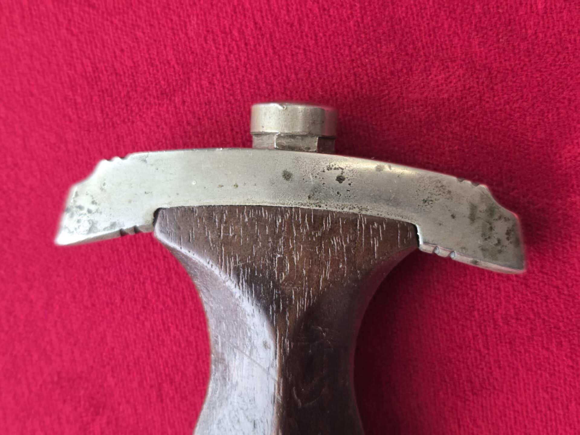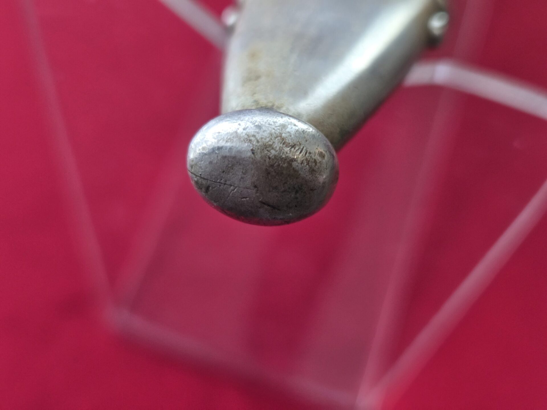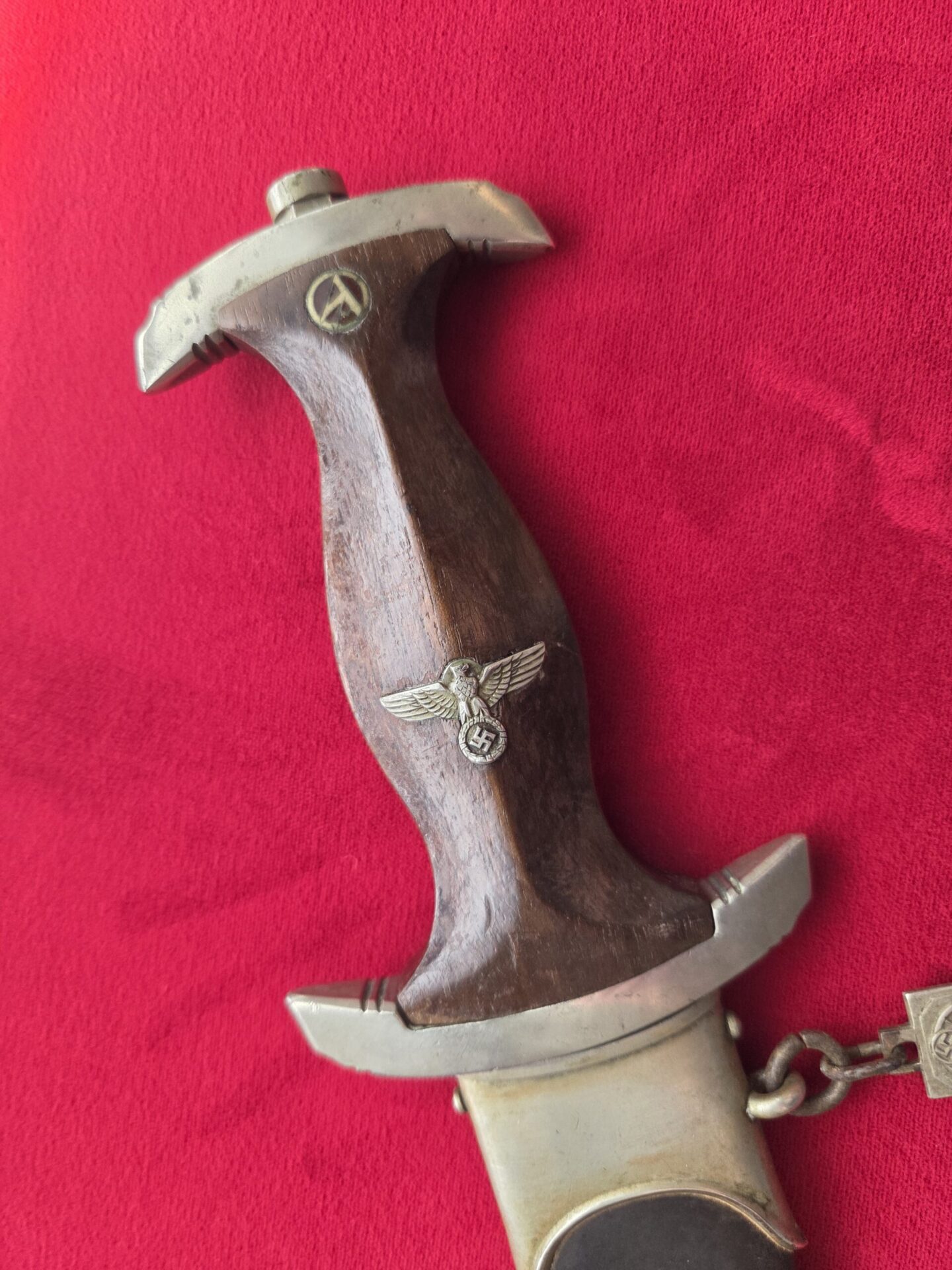 Carl Eickhorn Solingen, squirrel within small double-oval TM. The blade is acid etched with “Alles für Deutschland” motto and retains 100% of dark gray background frosting. There are no nicks to the cutting edge, light runner marks and the tip of the blade remains in a point. The nickel-silver plated crossguards show normal wear and the reverse side of the lower crossguard is marked with “Mi” (Mitte). The deep brown wooden grip has scuff marks but no chips or hairline cracks. The nickel-silver eagle and roundel are properly inset. The anodized steel scabbard is dent free. Four of the five screws remain in place for the nickel-silver plated scabbard fittings. The lower scabbard fitting has one very small ding. The ball has some very tiny indentations but overall in great condition. The chain has four upper and five lower links which consist of the NSKK eagles, sun wheel swastikas and Nordic triangular “Thurs” rune (symbolizing the power of the God Thor). These correct links are stamped “NSKK Korpsfuhrung Musterschutz” and “RZM M5/8″. The clip on the chain functions properly. Complete with leather belt loop in EXC++ condition.