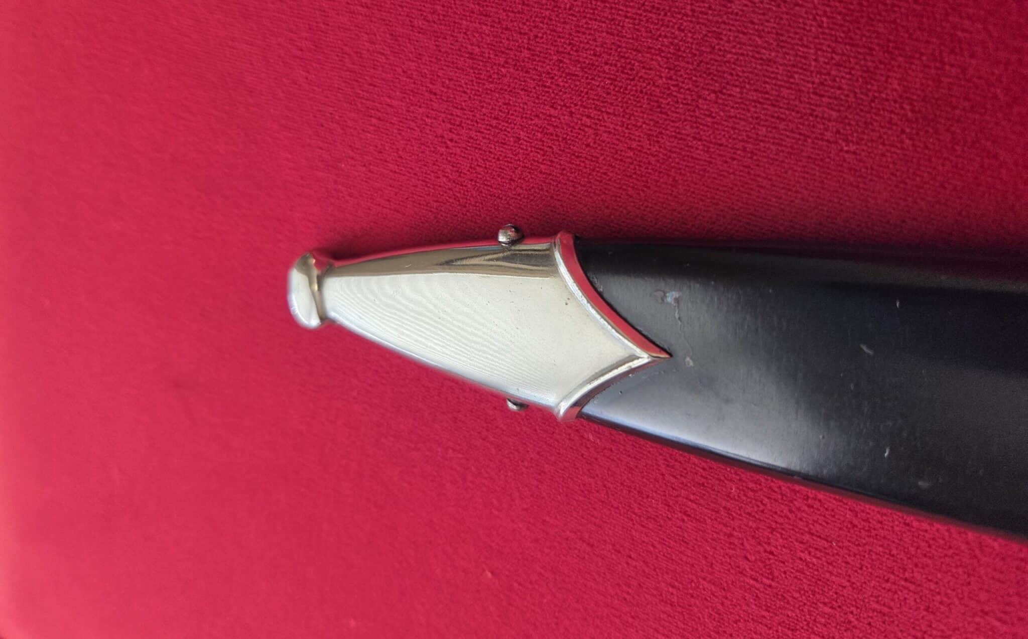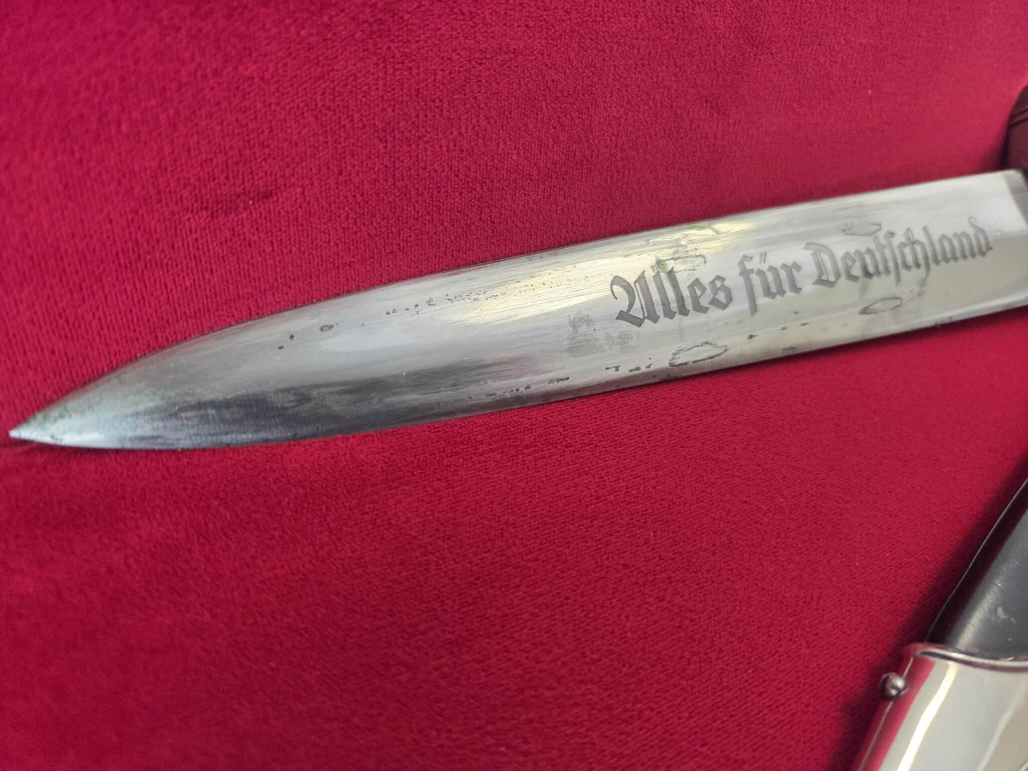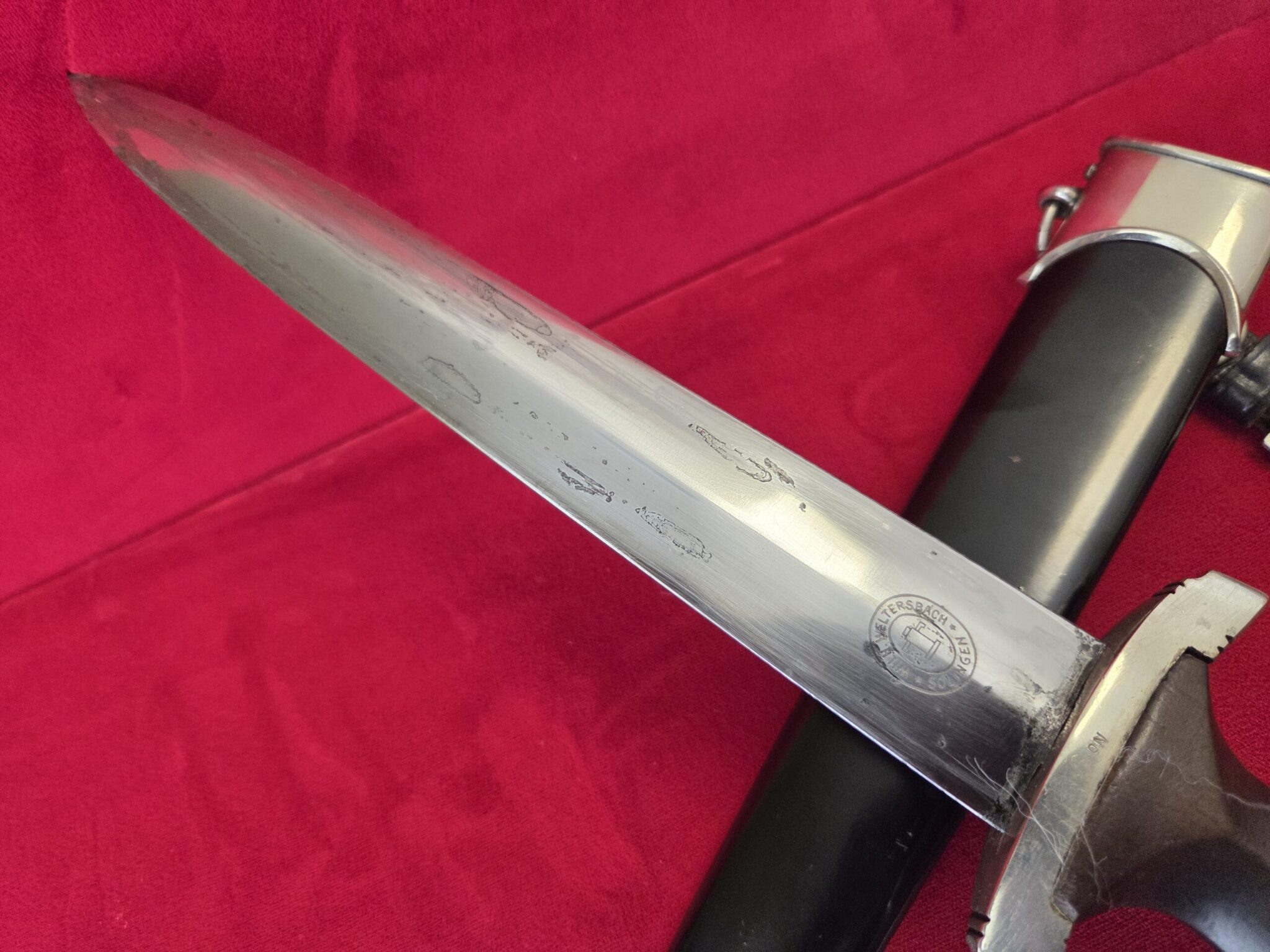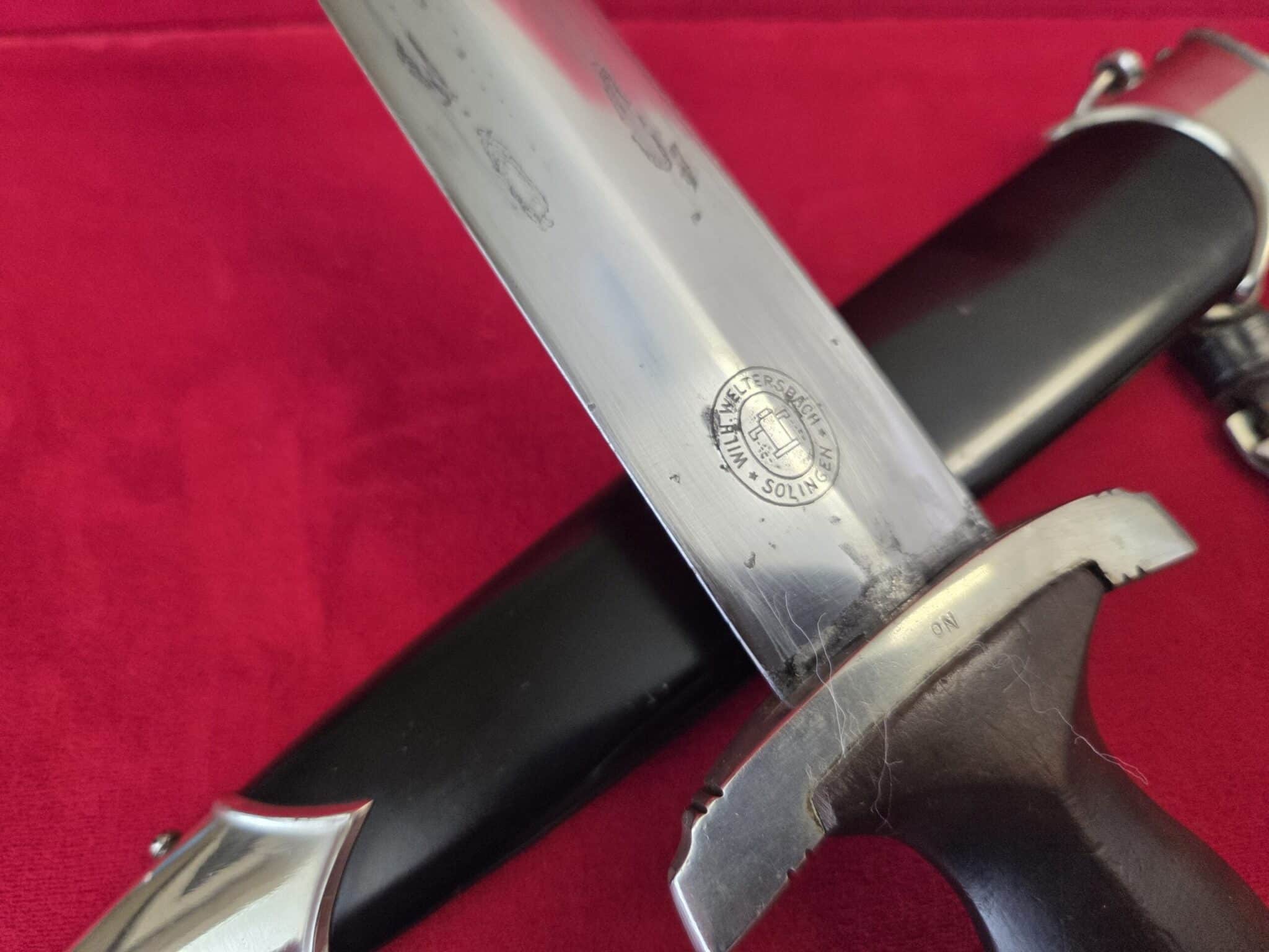 A very rare maker that according to Fisher you only see 1 in 1000 of, which is his rarest category. The blade has no nicks to the cutting edge, light runner marks, the tip is pointed and has speckling throughout. The blade also has the crisp acid etched “Alles für Deutschland” motto and dark “Wilh. Weltersbach Solingen” maker mark. The brown wood grip shows normal wear/age but no chips or cracks. The solid nickel eagle and SA roundel are a perfect fit. The nickel/silver crossguards fit perfectly to the grip with the reverse side of the lower district marked with “No”. The black painted scabbard retains 99% of its paint and remains completely dent free! The scabbard fittings are dent free, including the ball. All four scabbard screws are present. The brown leather hanger is in EXC++ condition.