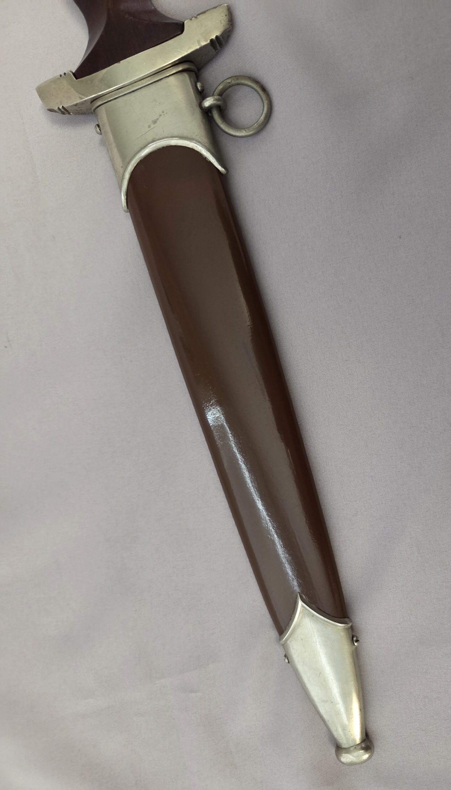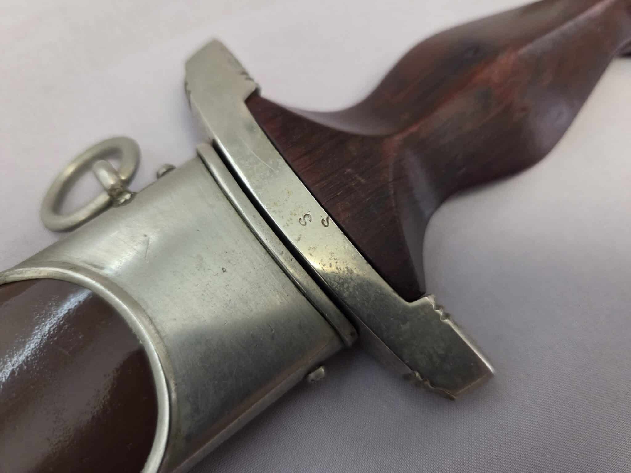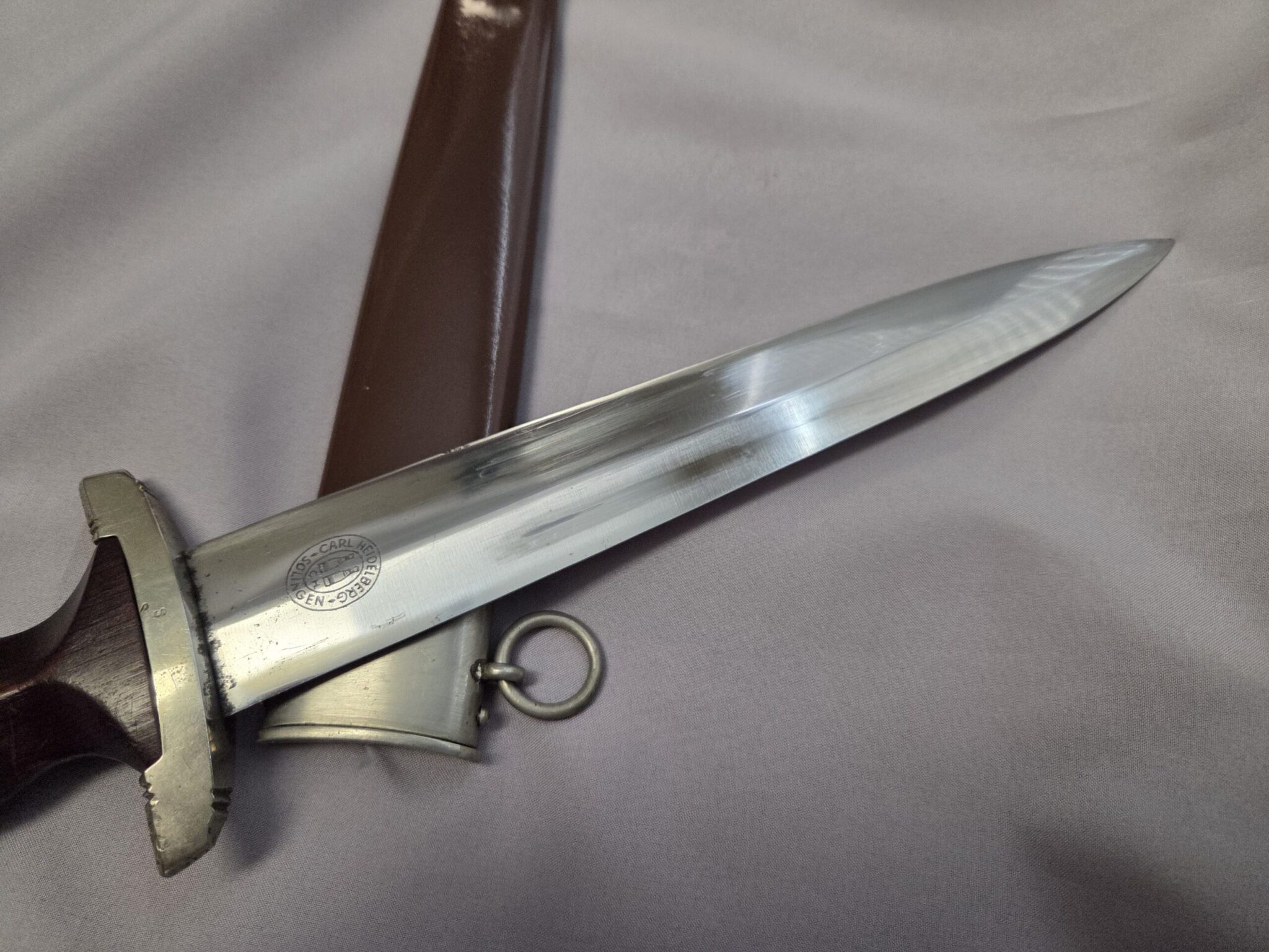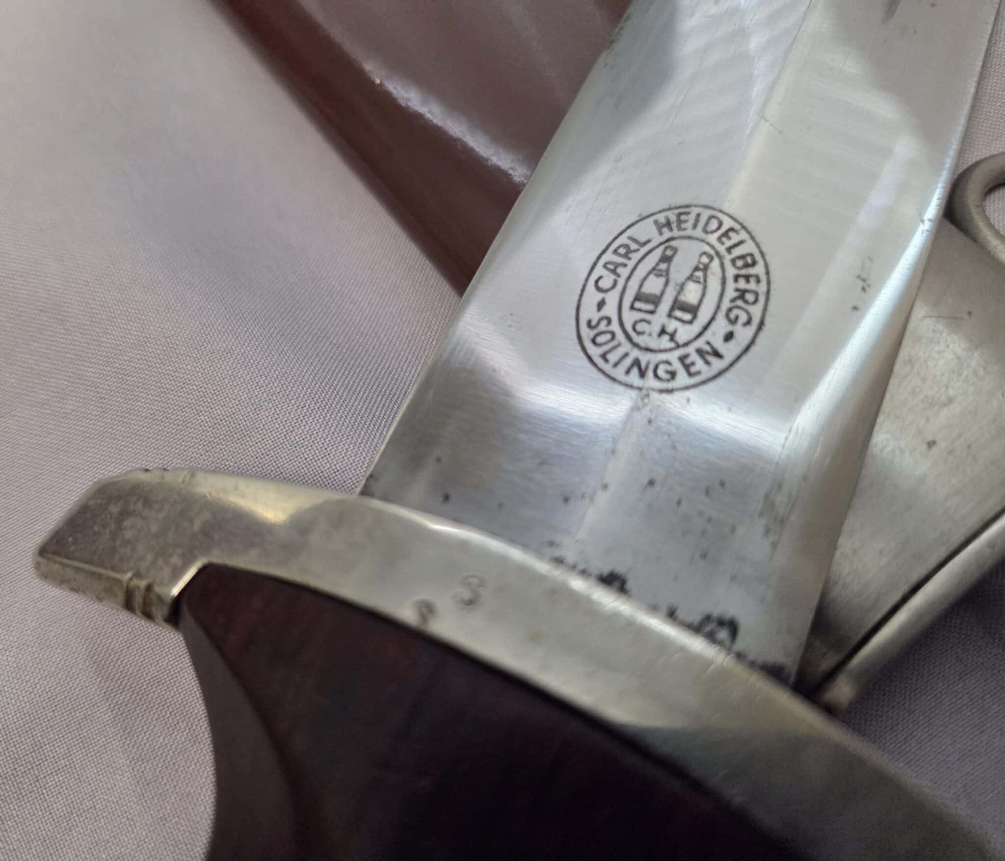 Carl Heidelberg, Solingen, two bottles above “C.H.” within a double-oval TM. Early nickel/silver fittings. Grip has a few indentations on the reverse side of grip but overall in EXC++ condition. Lower reverse crossguard marked “S” and has a second “S” marking which apparently was an error at the factory. Blade will grade EX++ showing light runner marks but no nicks to the cutting edge and the tip remains in a point. Scabbard shows a slight dent on the reverse lower side. Nickel/silver scabbard fittings with a few depressions in lower fitting, ball has a few minor dents. All 4 screws are in place.