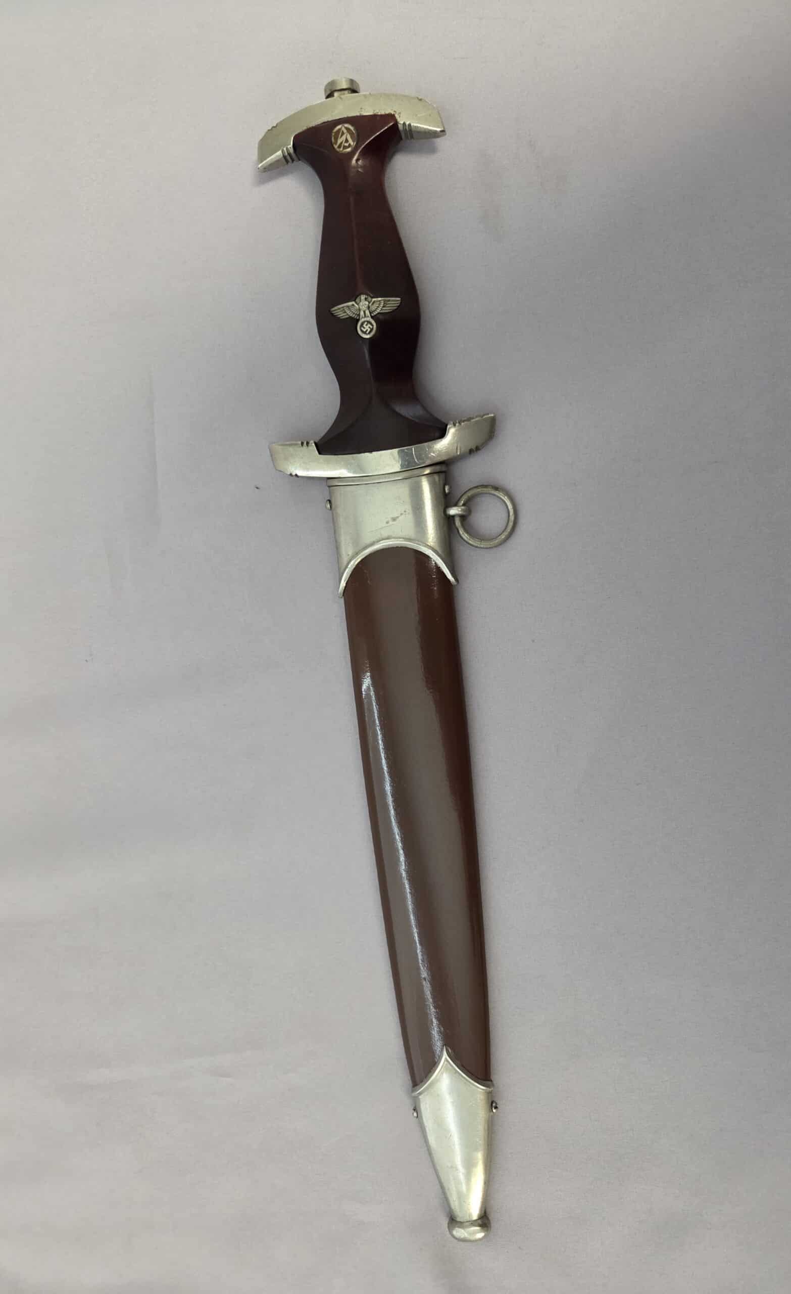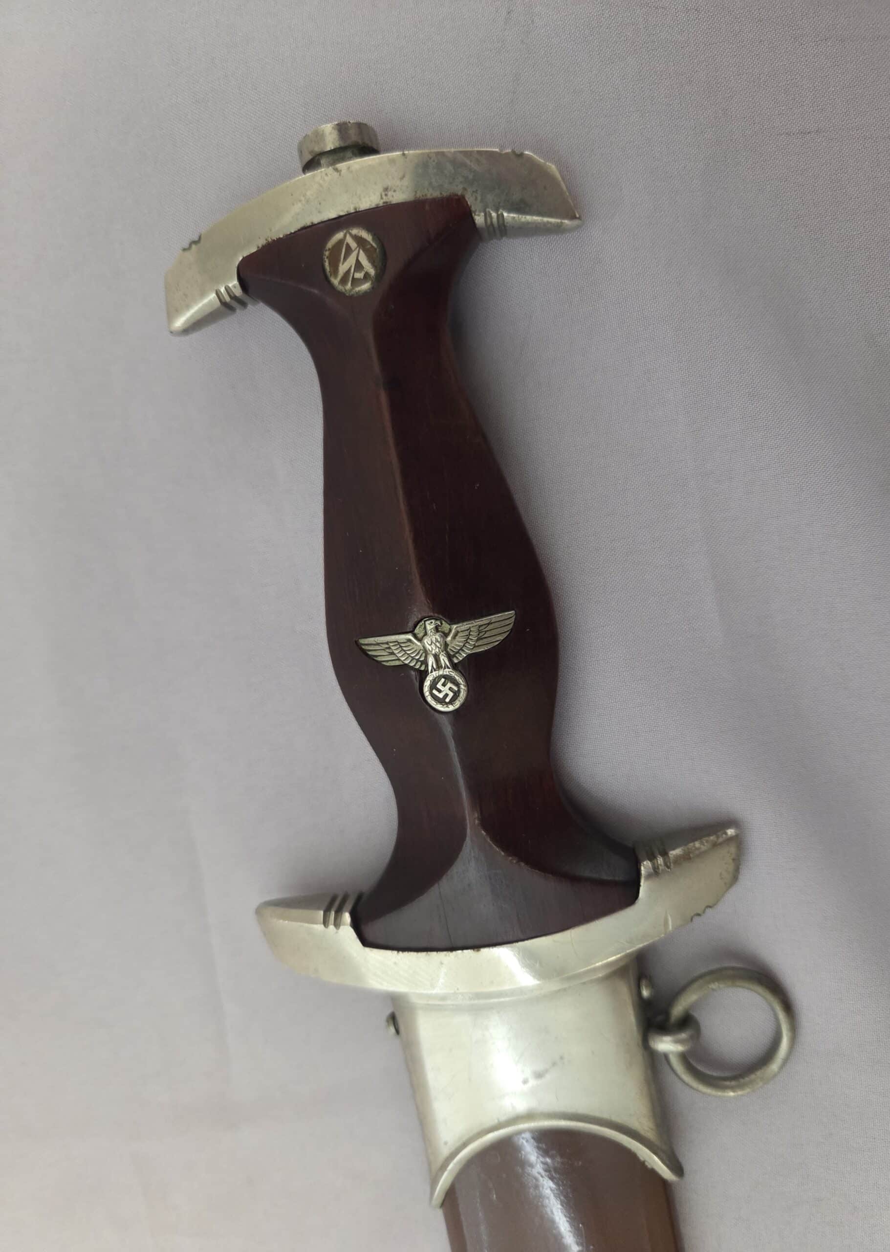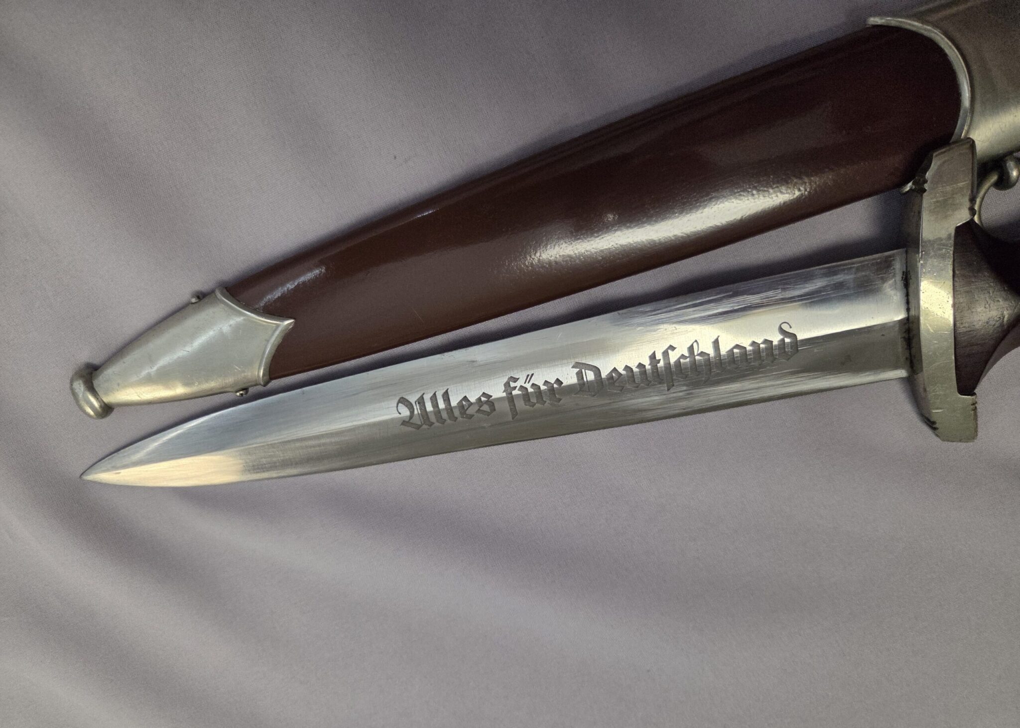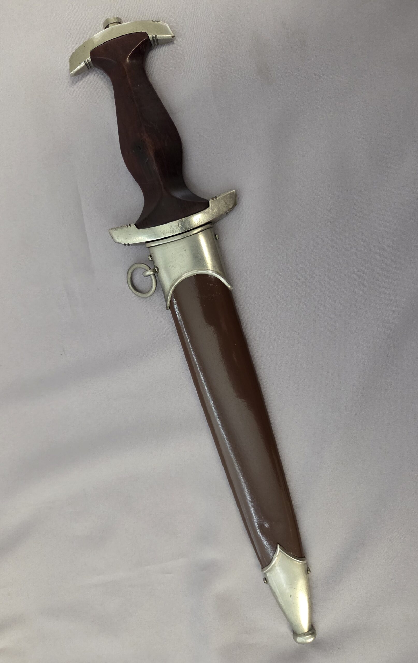 Carl Heidelberg, Solingen, two bottles above “C.H.” within a double-oval TM. Early nickel/silver fittings. Grip has a few indentations on the reverse side of grip but overall in EXC++ condition. Lower reverse crossguard marked “S” and has a second “S” marking which apparently was an error at the factory. Blade will grade EX++ showing light runner marks but no nicks to the cutting edge and the tip remains in a point. Scabbard shows a slight dent on the reverse lower side. Nickel/silver scabbard fittings with a few depressions in lower fitting, ball has a few minor dents. All 4 screws are in place.