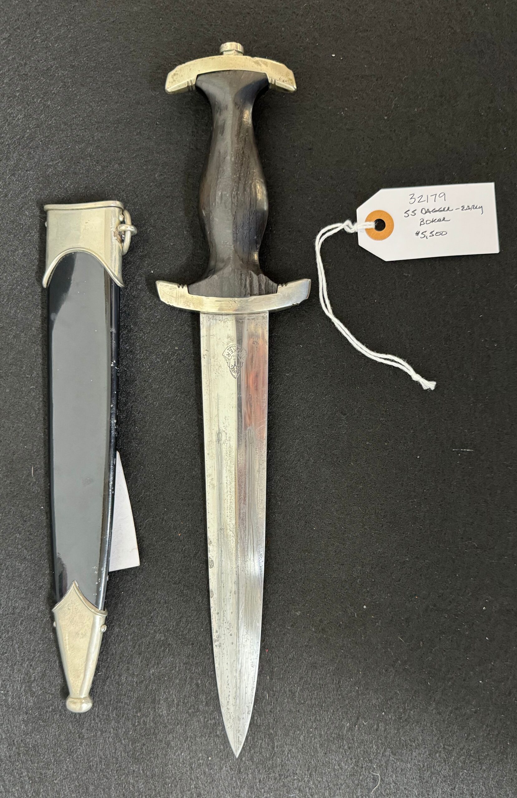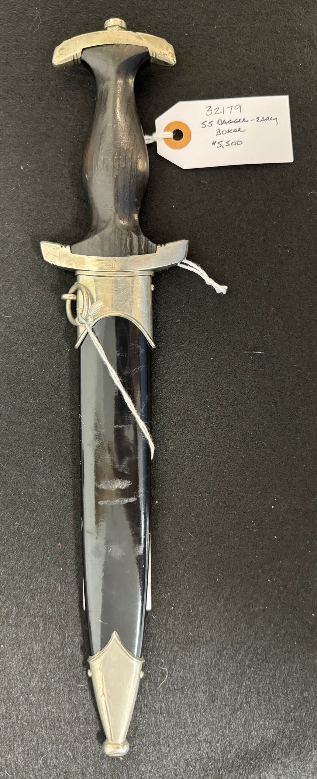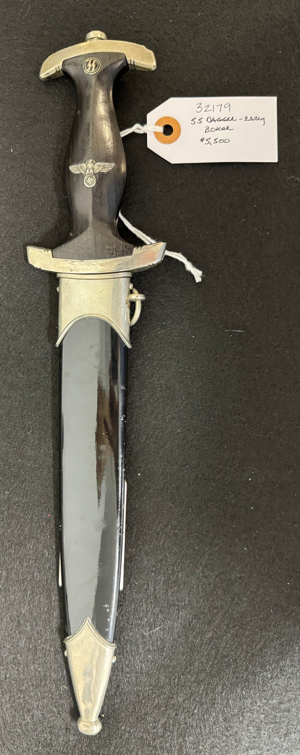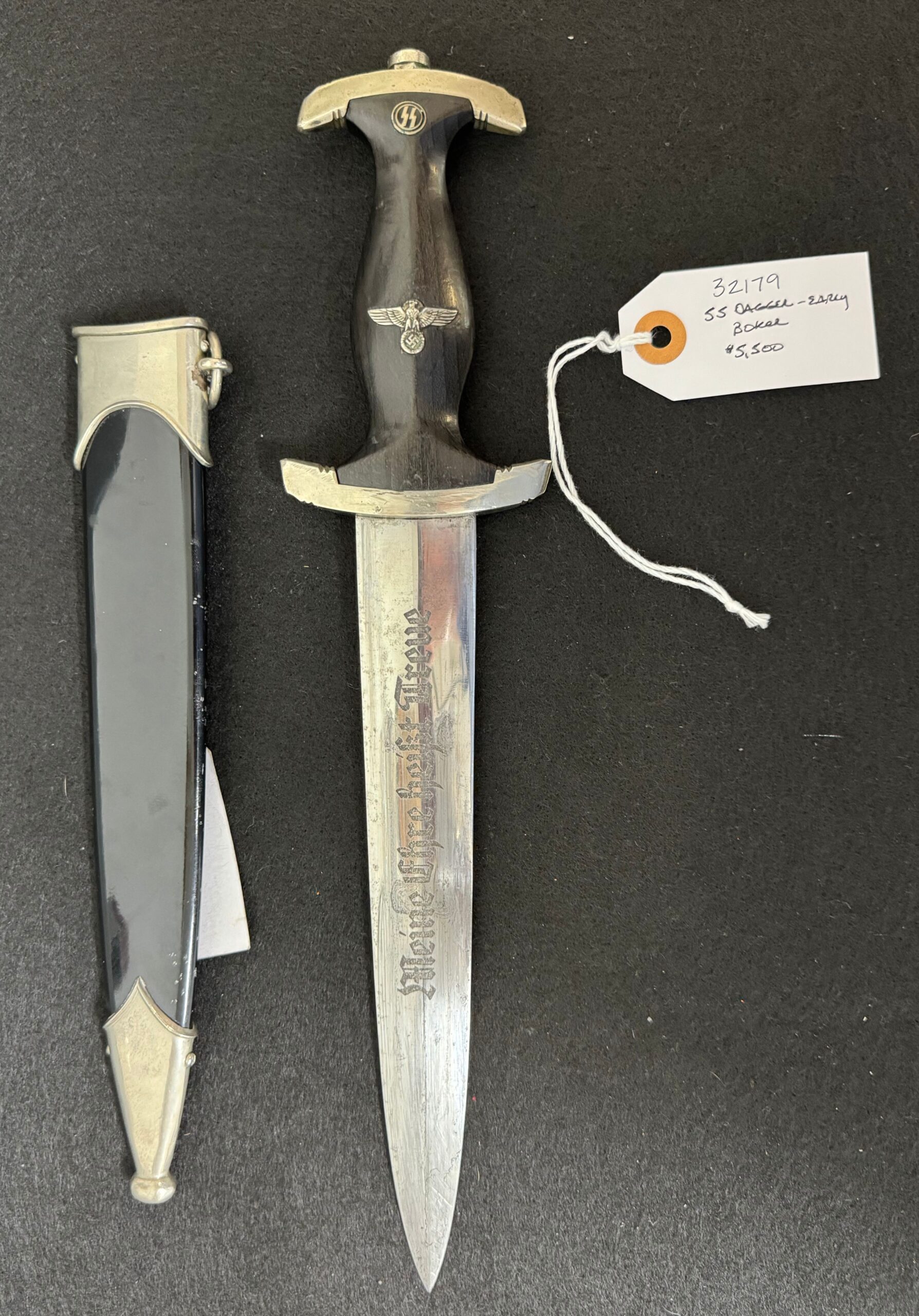 BOKER, SOLINGEN with stylized “tree of life” in ornately framed TM. Very nice early SS dagger with nickel silver fittings showing some wear to inset eagle, SS runes and grip showing some imperfections with a decent chip to the lower obverse. Lower crossguard is group stamped “III” for Berlin. Blade shows speckling and spotting with deeply etched motto retaining 70% of the light gray background frosting. Scabbard shows some surface wear with most of the lacquer remaining. Dent-free nickel silver scabbard fittings show light surface wear/age patina.