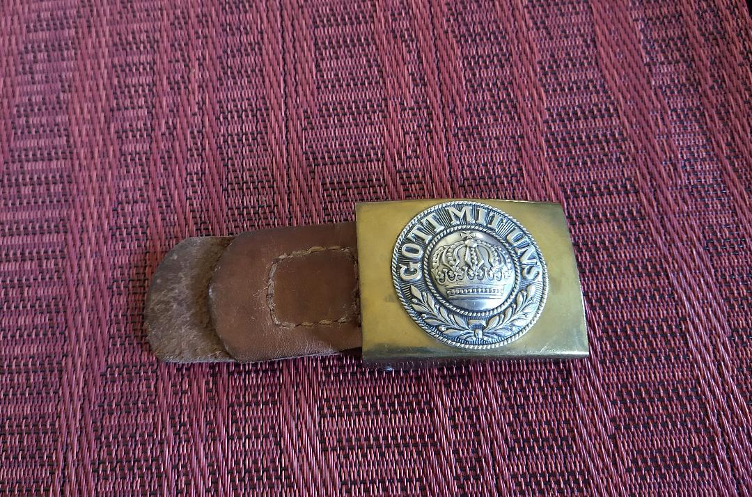 Unmarked belt buckle with leather tab.  Early unmarked brass belt buckle shows very minor surface wear but no damage.  Silver center motif shows Prussian Crown and motto:  GOTT MIT UNS.  Exc++