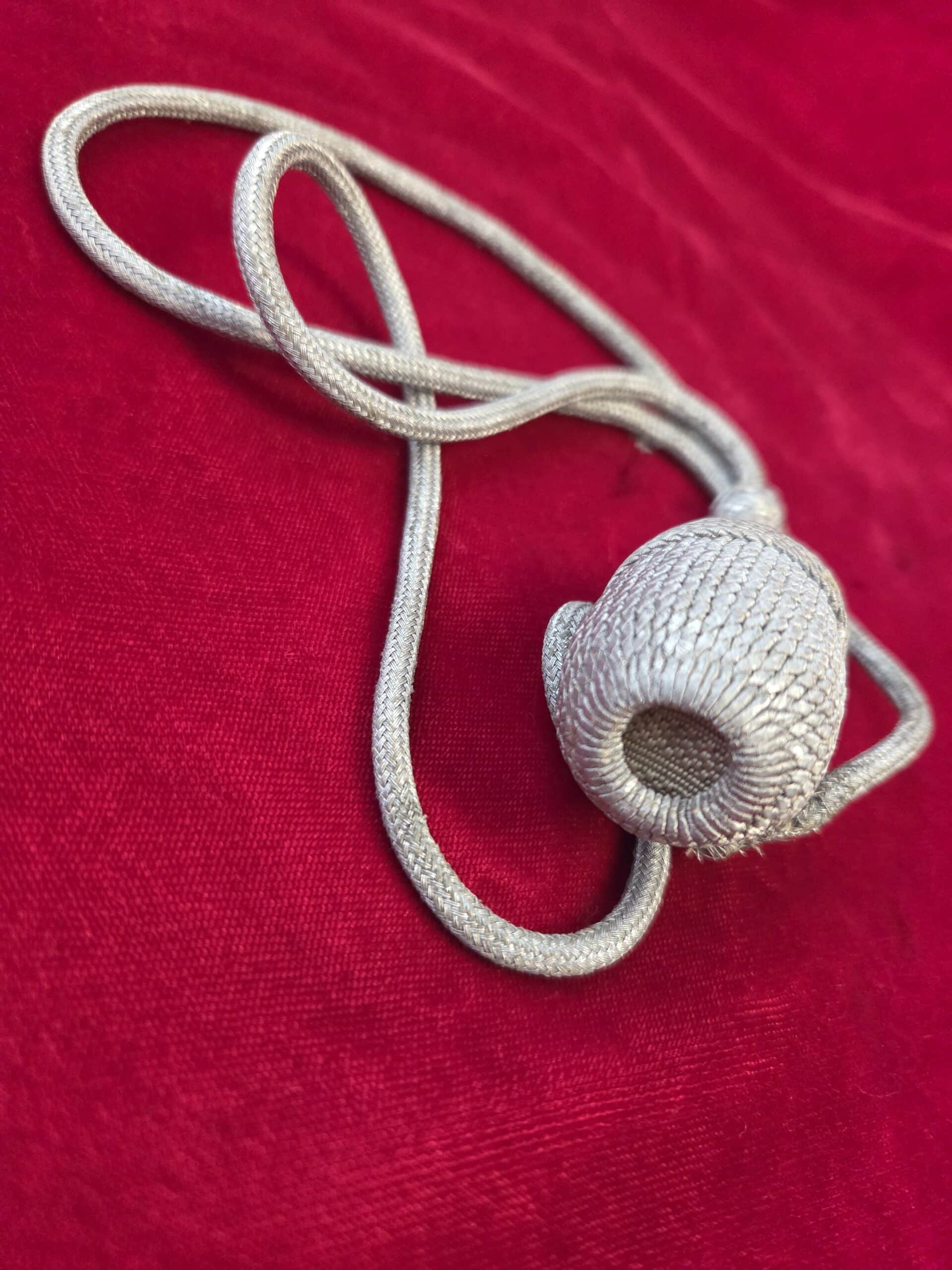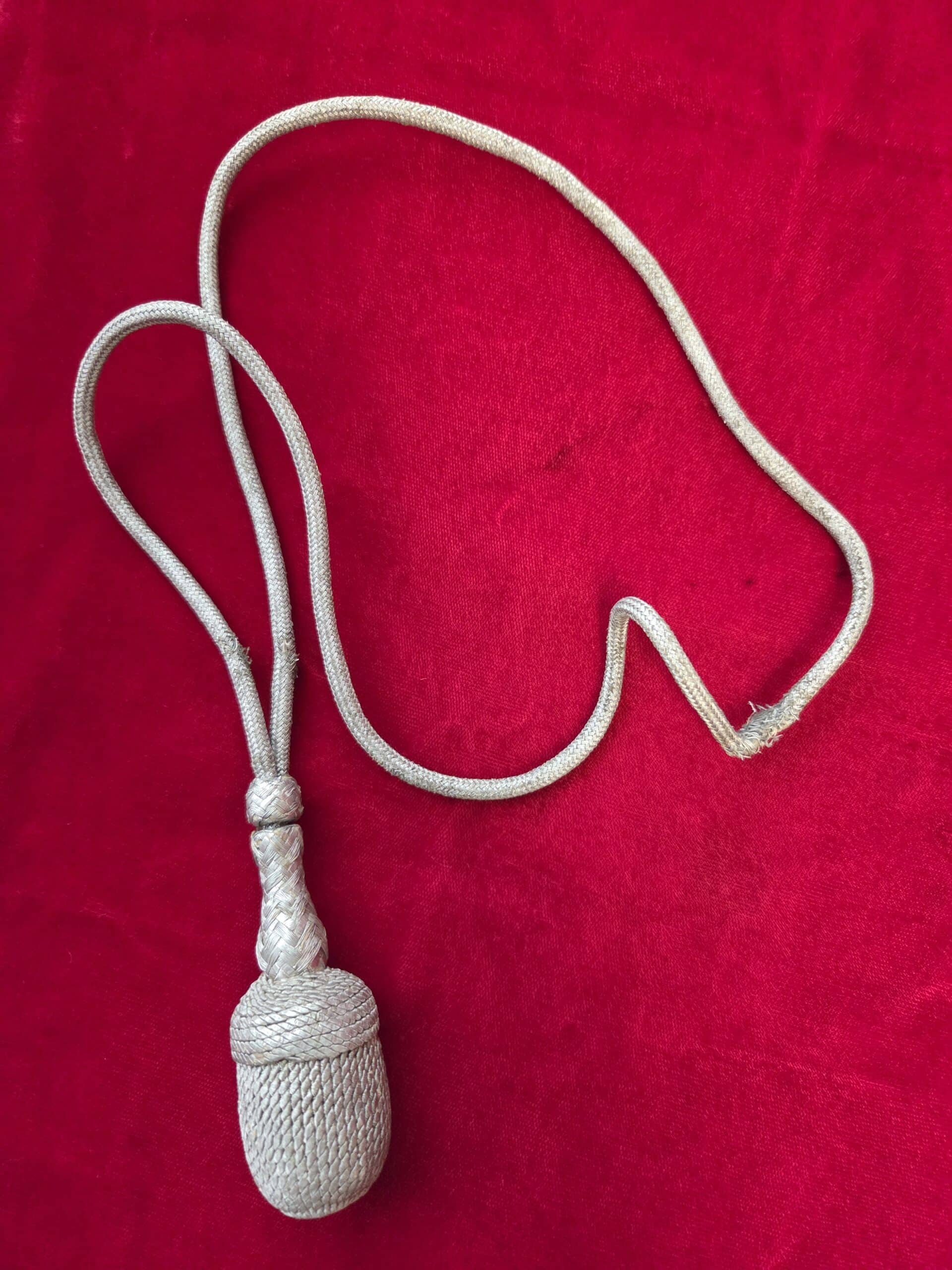 An original Army pattern portepee, 42cm long, in EX condition showing minor wear and a spot of fraying to the cord. It is wrapped in flat and rolled silver-aluminum thread. Standard size acorn.