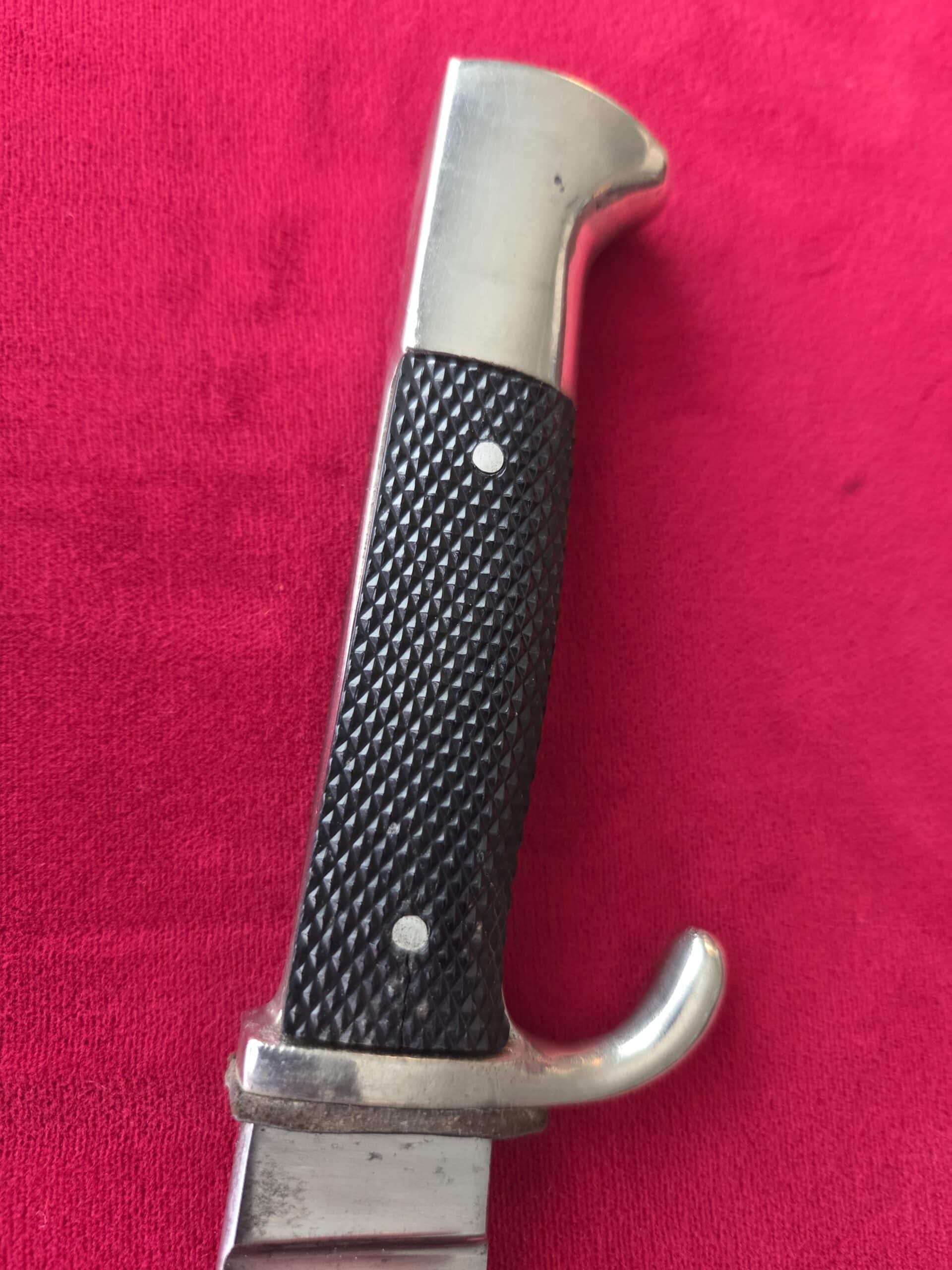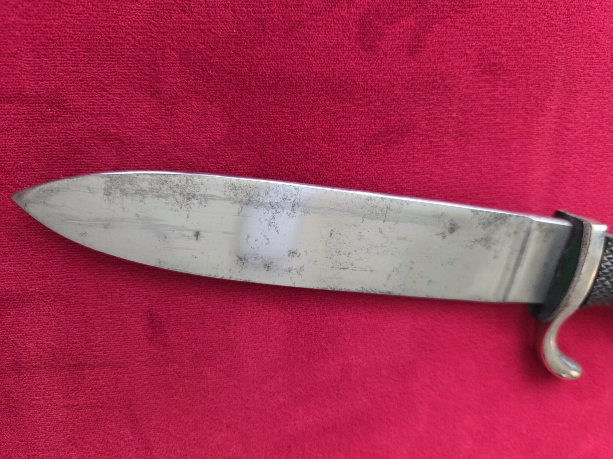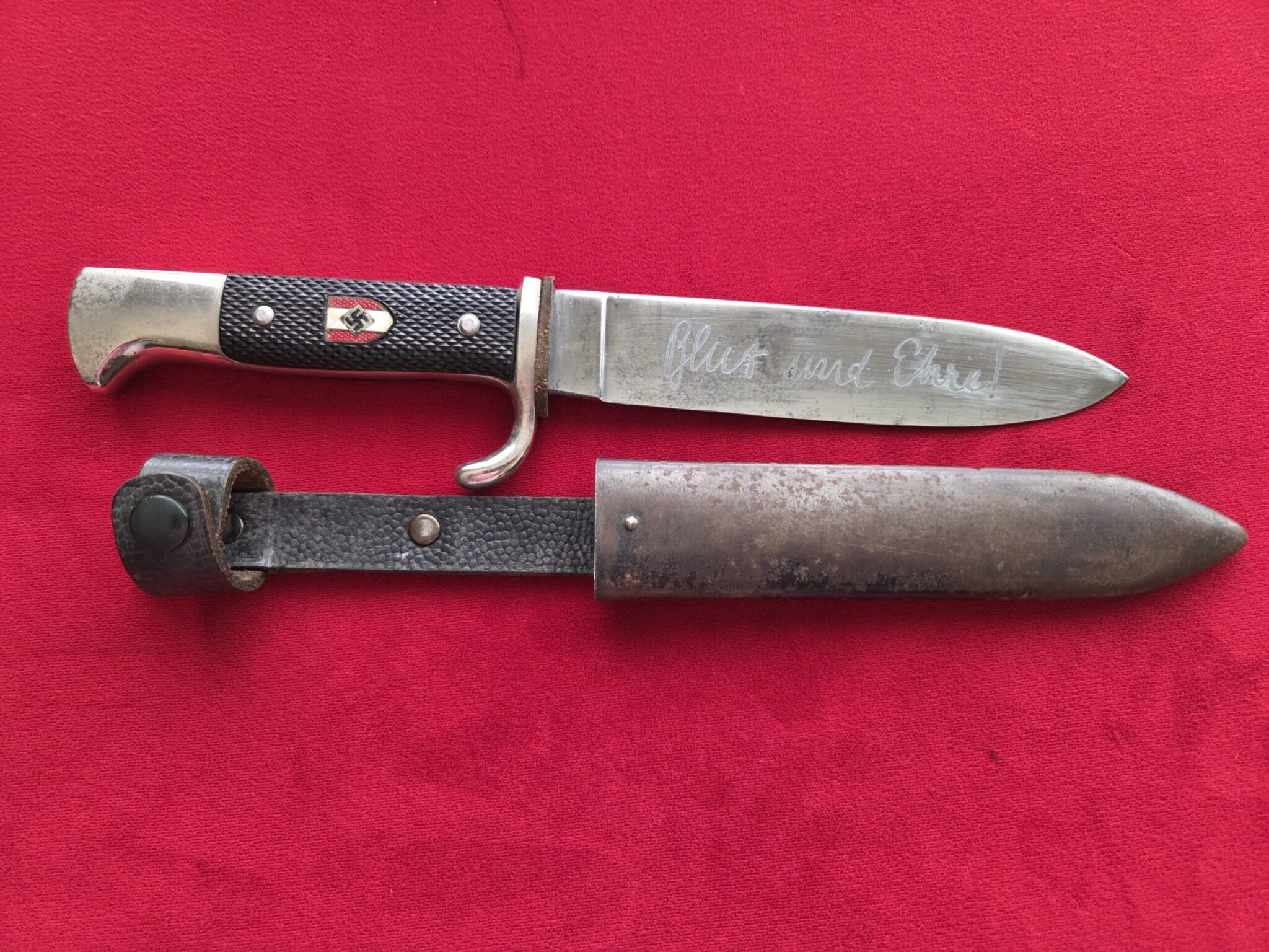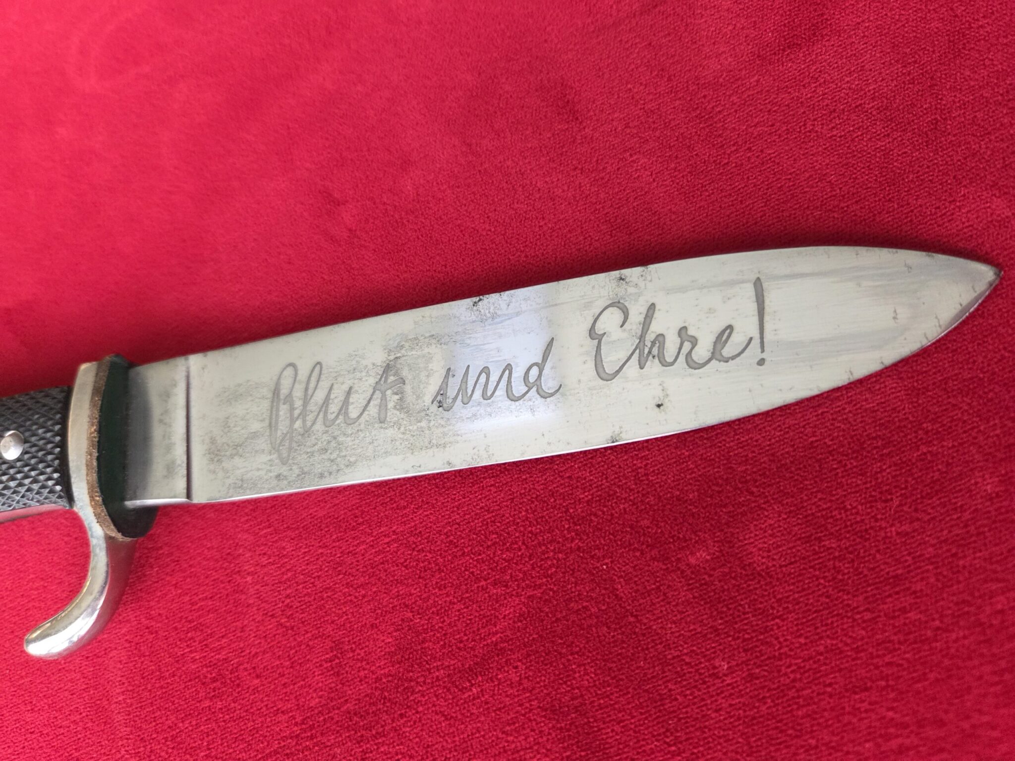 No maker. The “Blut und Ehre!” motto is very visible on blade. Complete with buffer pad. The hilt shows normal wear/age to the original nickel plating. The grip plates are intact but slightly loose. The enamel grip insignia is bright and inset in the grip plate. The scabbard is missing the majority of its black paint, but the leather is in EXC++ condition and the snap is intact. Definitely a classic desirable collector’s items from the third Reich in used condition.