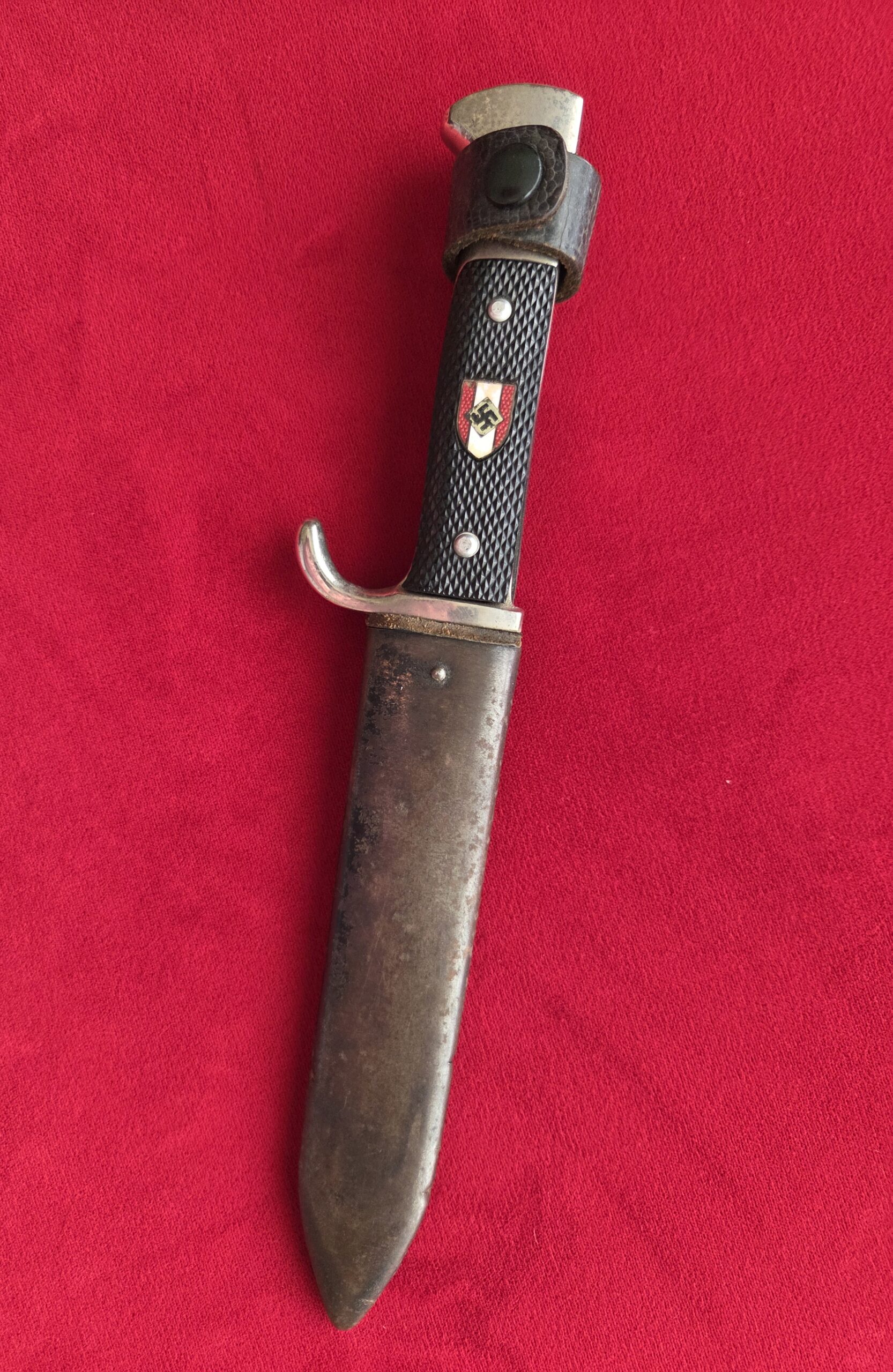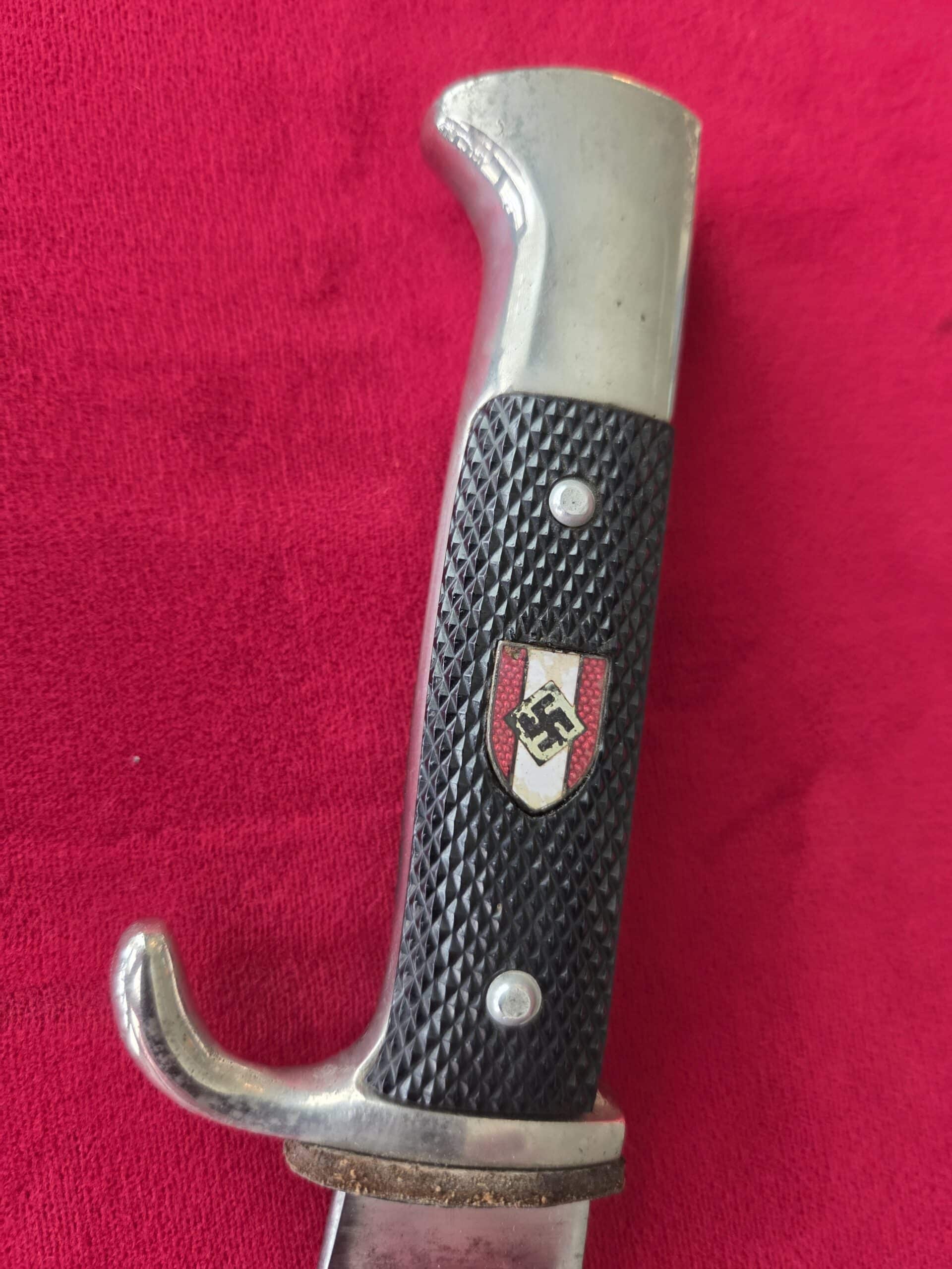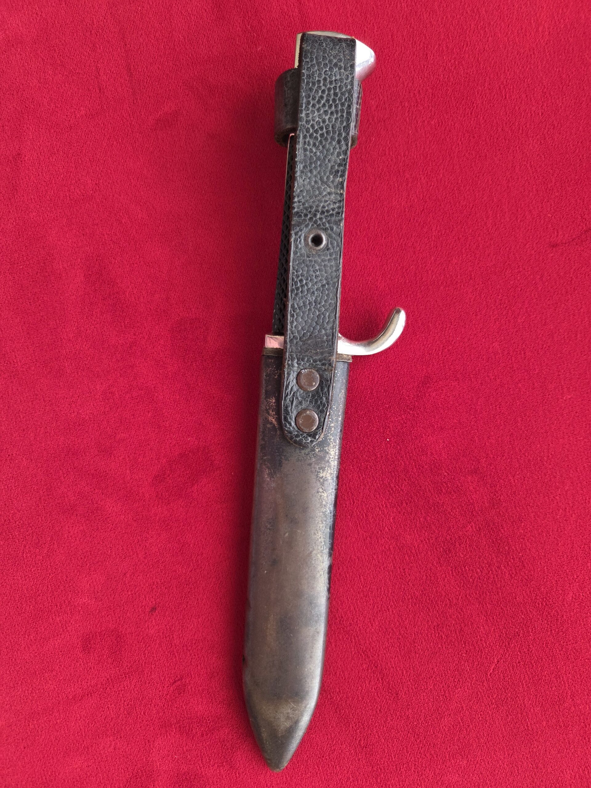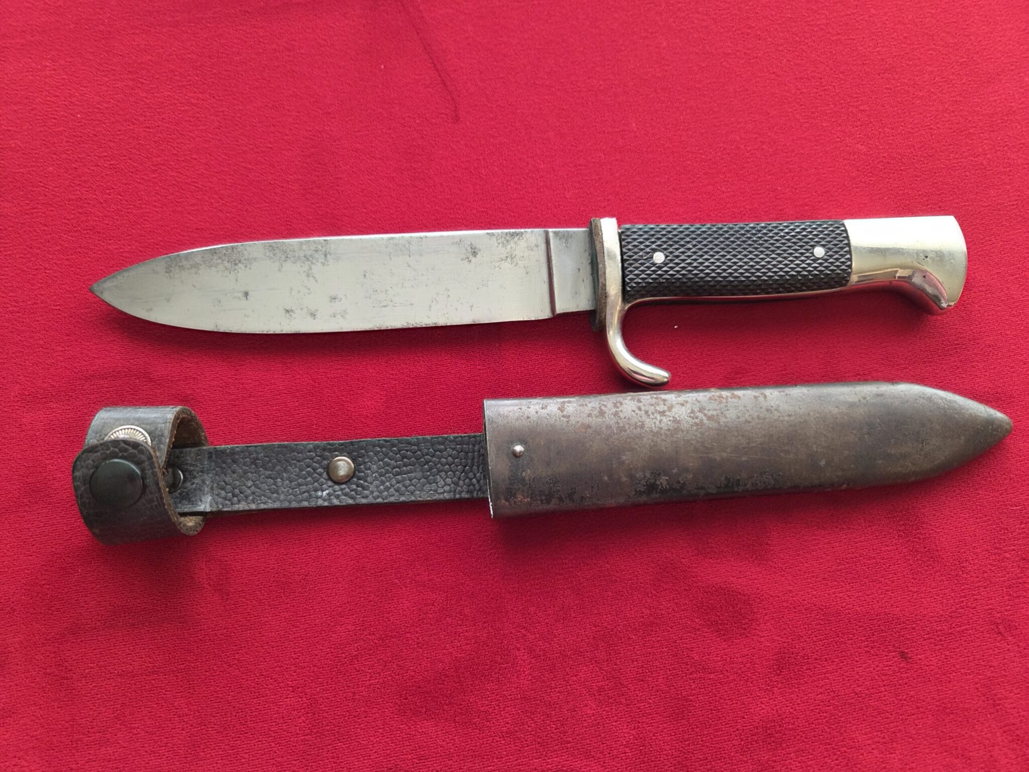 No maker. The “Blut und Ehre!” motto is very visible on blade. Complete with buffer pad. The hilt shows normal wear/age to the original nickel plating. The grip plates are intact but slightly loose. The enamel grip insignia is bright and inset in the grip plate. The scabbard is missing the majority of its black paint, but the leather is in EXC++ condition and the snap is intact. Definitely a classic desirable collector’s items from the third Reich in used condition.