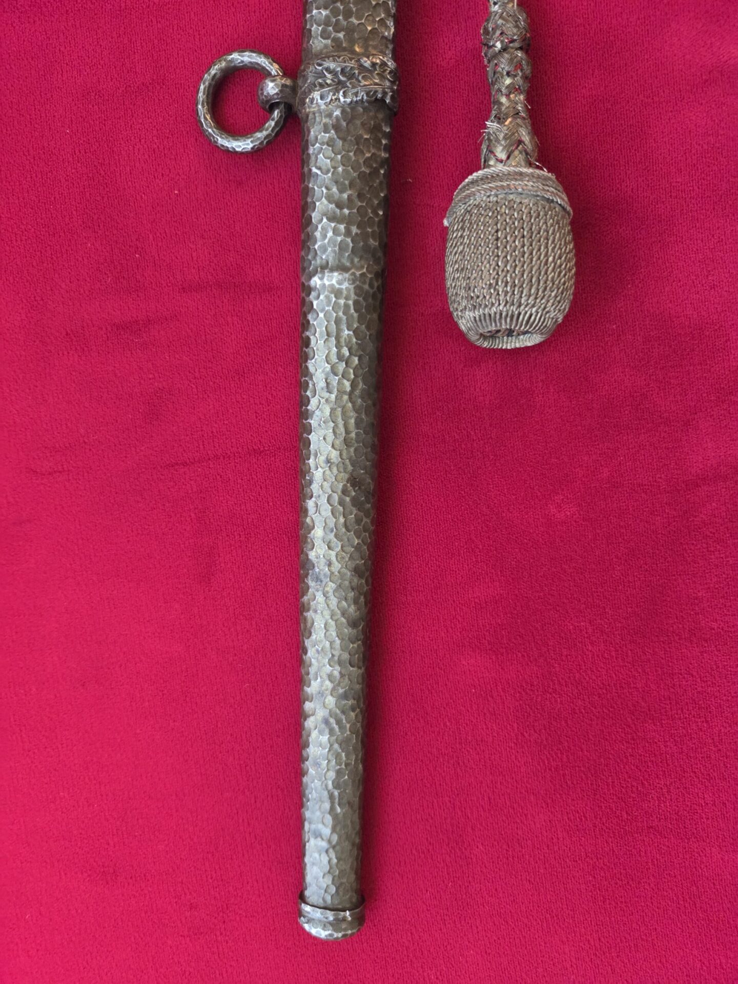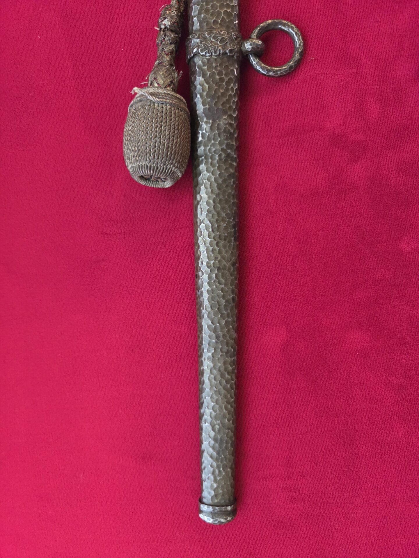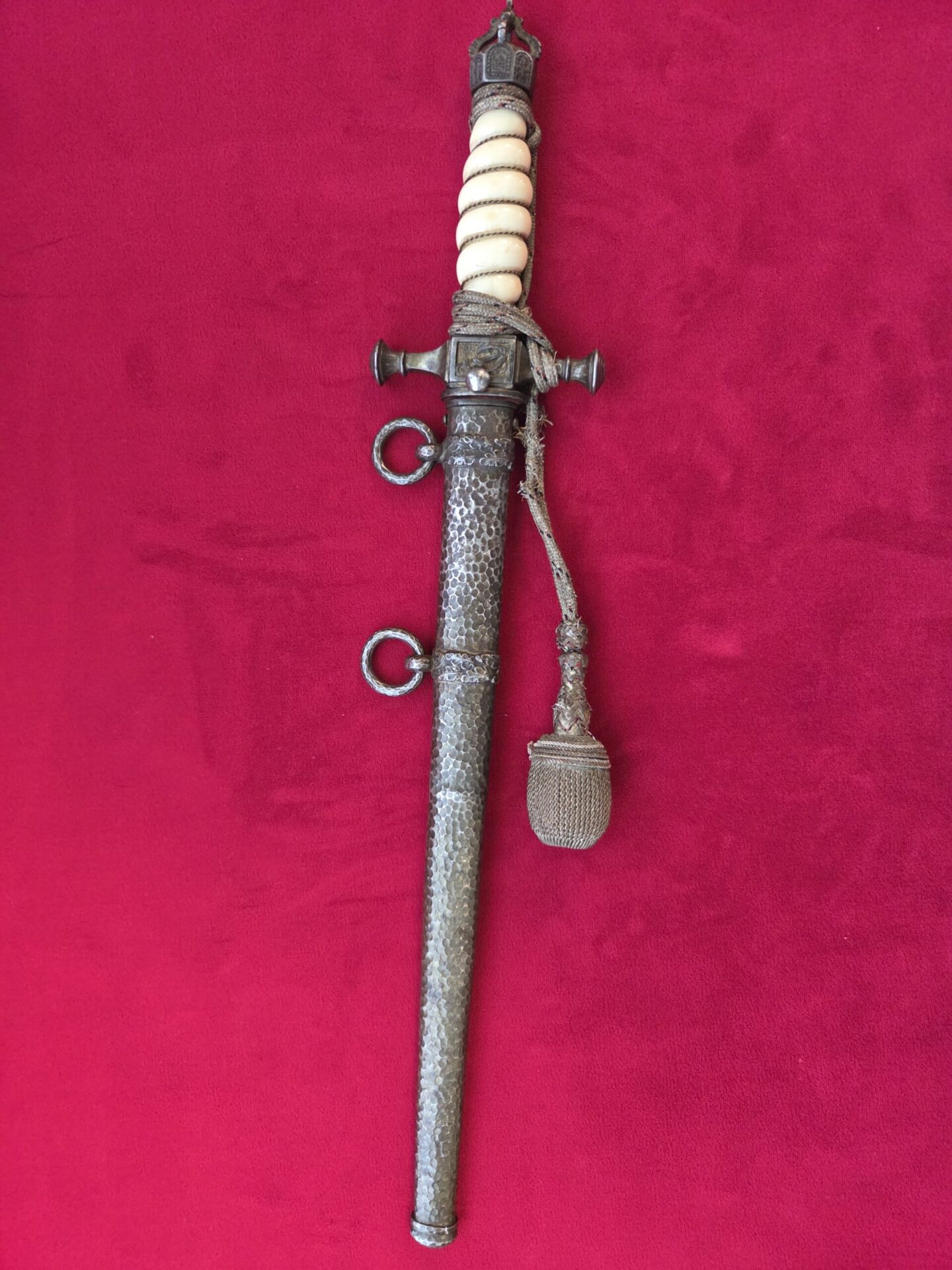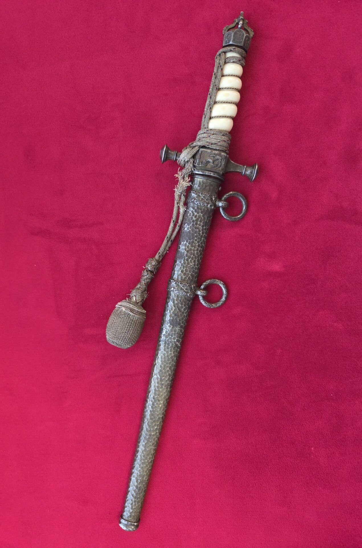 A rare Imperial German Navy Officer’s dagger, measuring 16 1/2 inches total length when inserted into the scabbard. It features an 8 3/4 inch long unsharpened Damascus steel blade, with dual narrow fullers. Complete with red felt buffer pad. The hilt consists of a gilded bronze crossguard, featuring double-sided central fouled anchors, and a functional push-button release. The grip is off-white bone with original twisted wire, shows age/wear but is chip free. The pommel is the German State Crown. The pebbled scabbard shows much wear/age, with one minor indentation just below the lower suspension band on the obverse side. The portepee is tied to the hilt, has fraying and shows wear/age.
