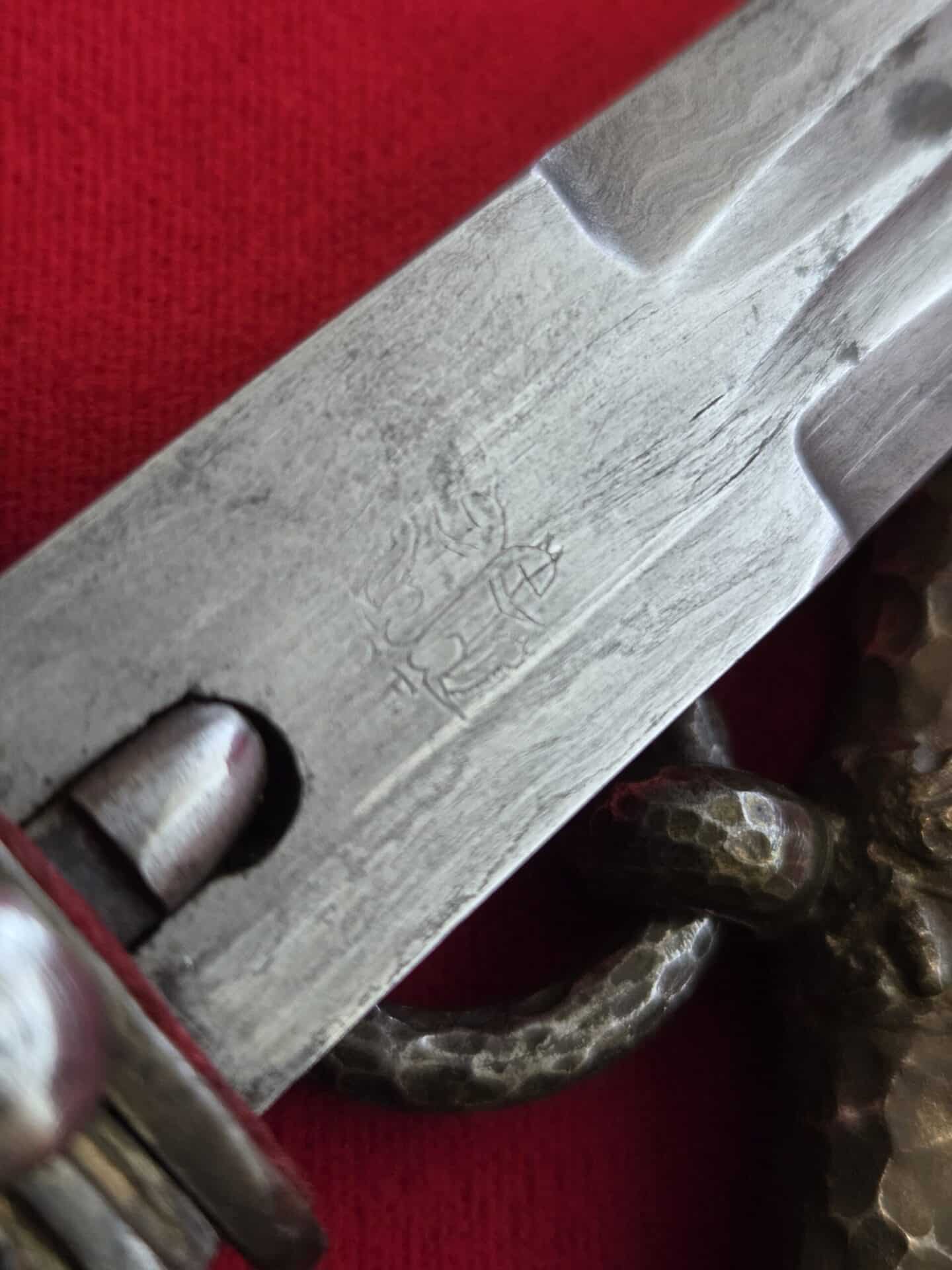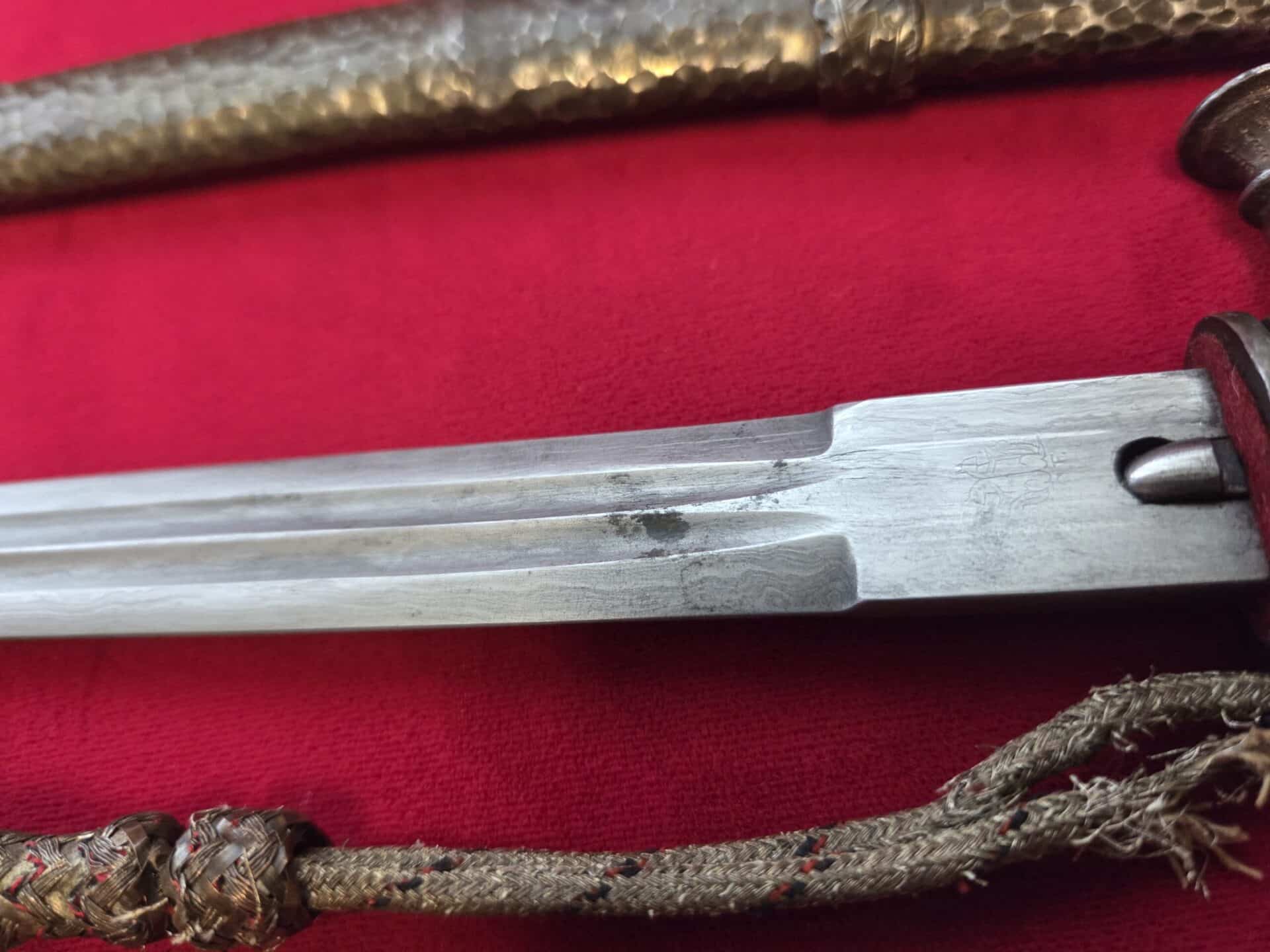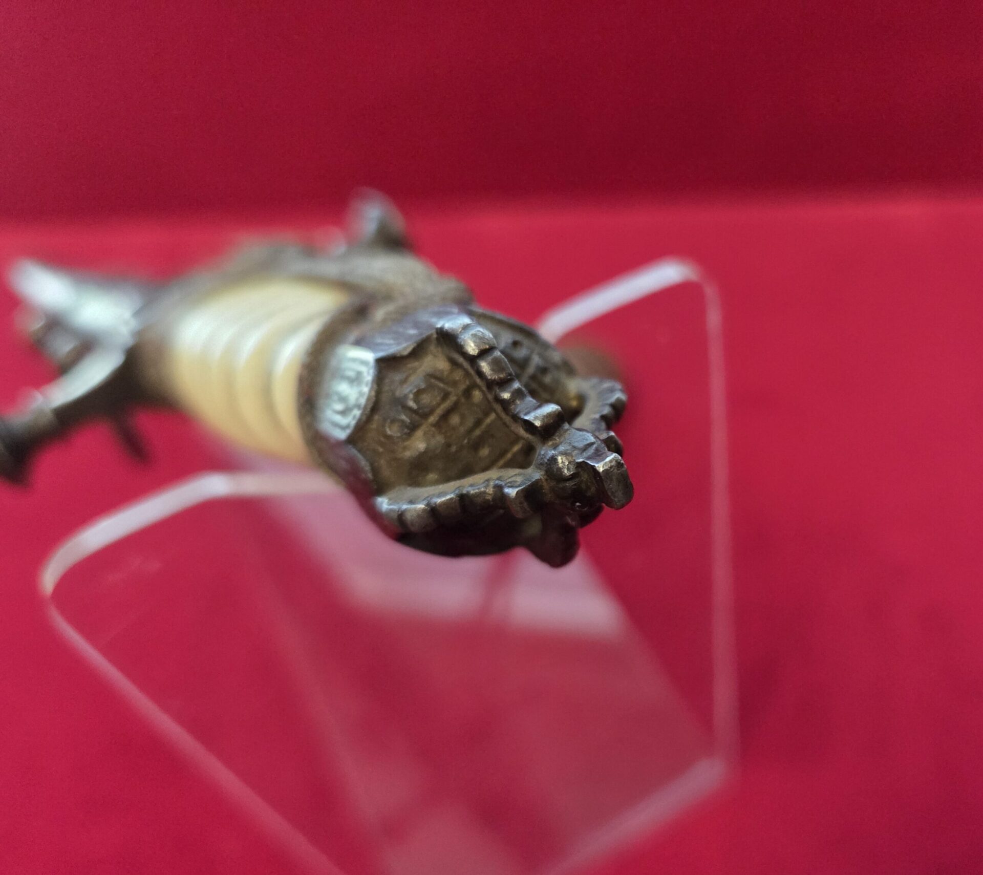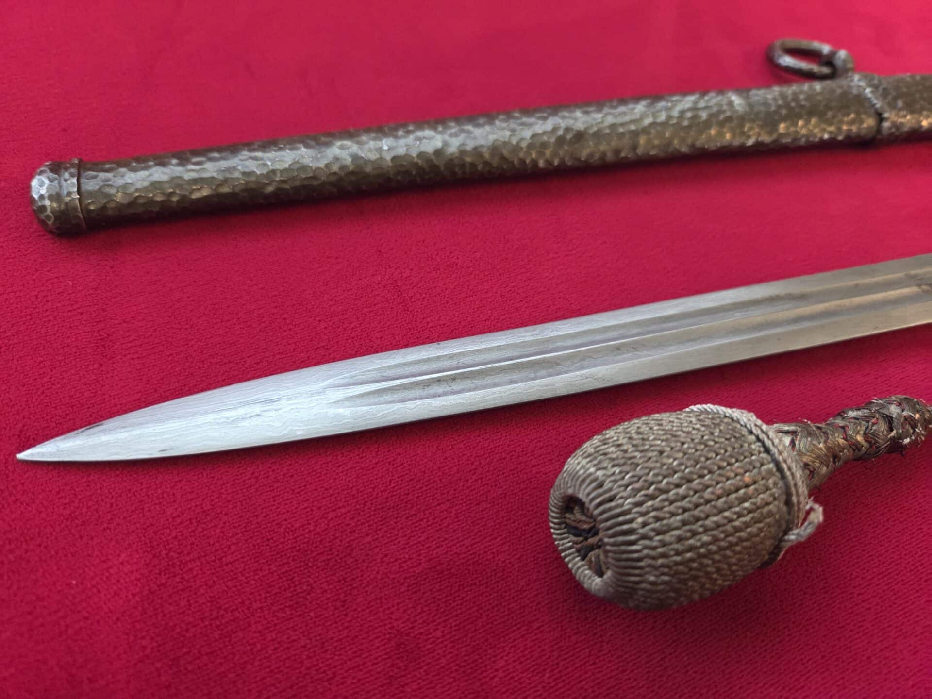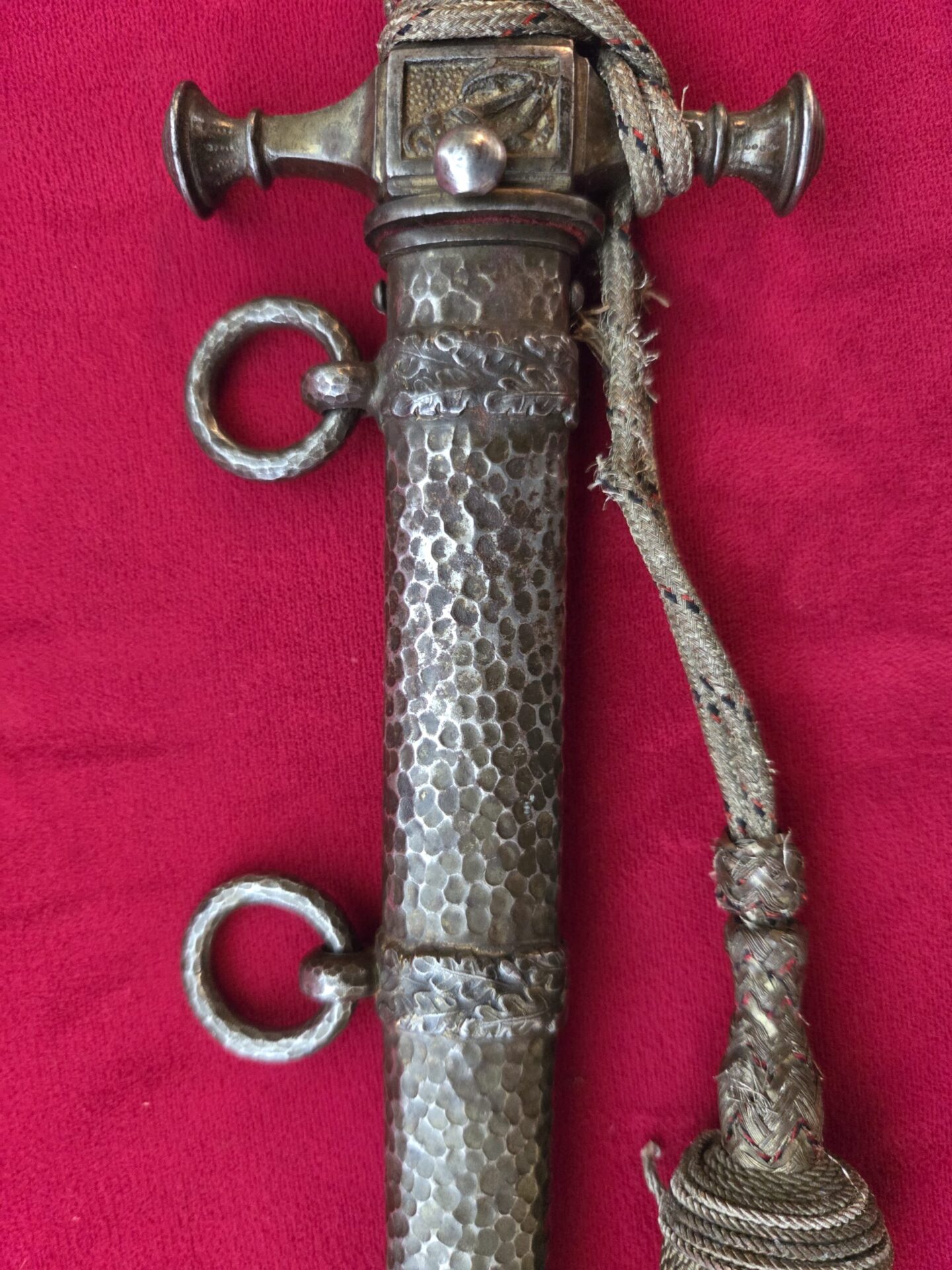 A rare Imperial German Navy Officer’s dagger, measuring 16 1/2 inches total length when inserted into the scabbard. It features an 8 3/4 inch long unsharpened Damascus steel blade, with dual narrow fullers. Complete with red felt buffer pad. The hilt consists of a gilded bronze crossguard, featuring double-sided central fouled anchors, and a functional push-button release. The grip is off-white bone with original twisted wire, shows age/wear but is chip free. The pommel is the German State Crown. The pebbled scabbard shows much wear/age, with one minor indentation just below the lower suspension band on the obverse side. The portepee is tied to the hilt, has fraying and shows wear/age.