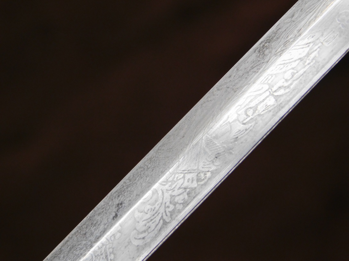 Armored Kinight’s torso (WKC). Gilded brass hilt fittings show surface wear/age and much darkening to highlights with 85% of the gold factory gilding remaining to the Imperial Pattern Crown pommel and fouled anchor crossguard. Beautifully toned bone grip shows almost no surface wear with no visible cracks or chips. Plated, double etched blade grades EX showing surface wear/runner marks, speckling and minor nicks toward the lower half along the cutting edge. Gilded brass, lighting bolt scabbard shows light wear/age and NO dents or damage to scabbard body. EX.
