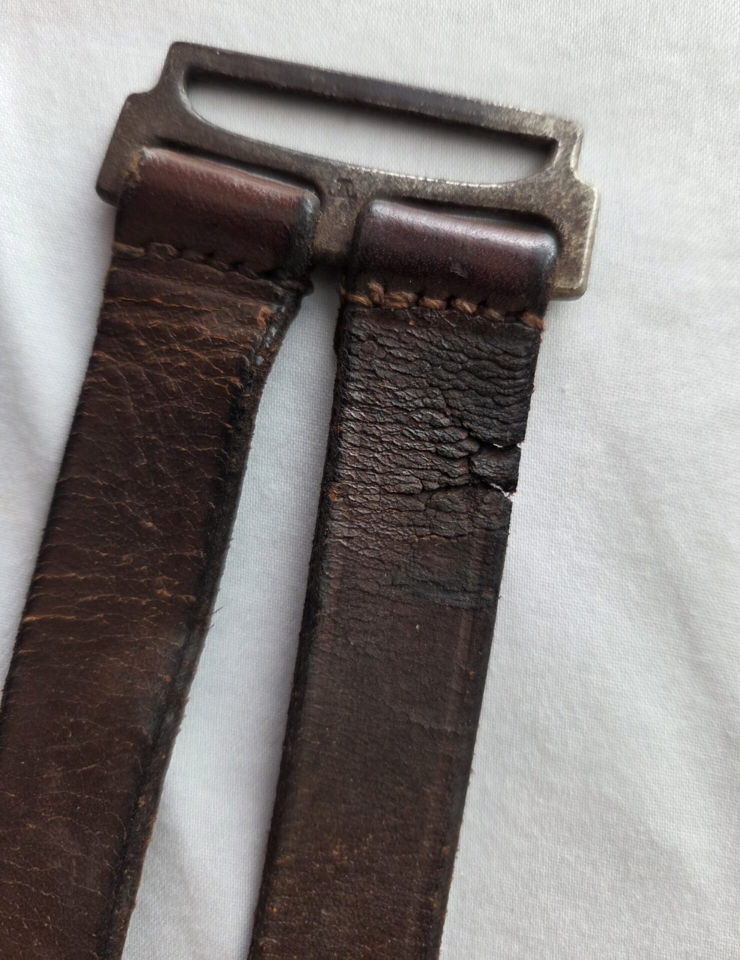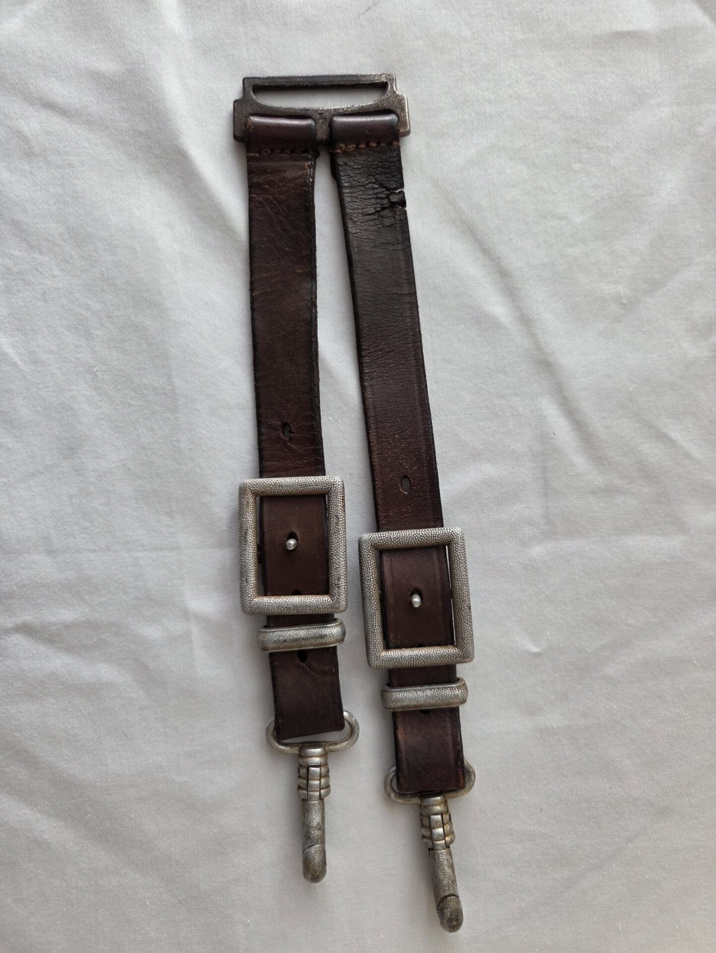 The buckles, bands and clips are aluminum-alloy with a decorative pebbled design throughout. The clips work properly. The two brown leather hanger pieces have adjustment puncture holes and are in EX++/Near MINT condition. They measure approximately 9 1/2 inches long.