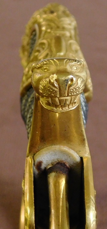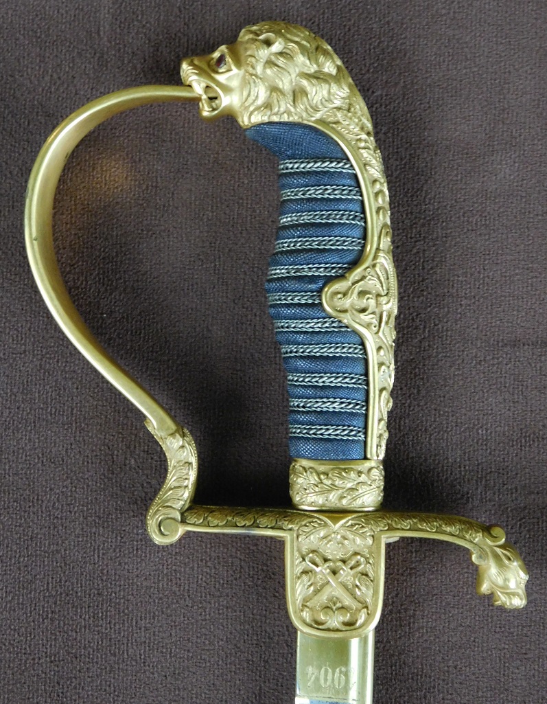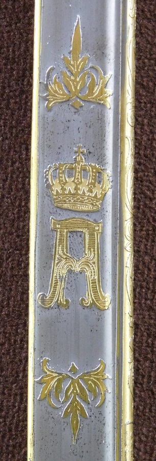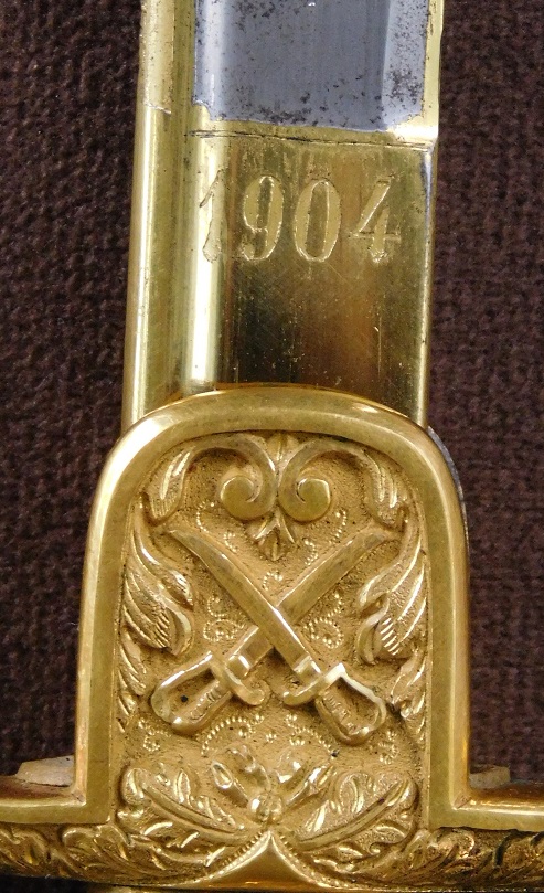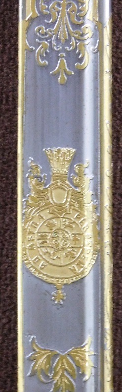 Presented to Friedrich Frhr. Cotta von Cottendorg (dob 11/5/1868), a Lieutenant in Ulan Regt. 20 and later a Rittmeister in Res Ulan Regt. 20 (See Imperial Rangliste 1894-1912). The presenter appears to be Otto Frhr. Von Lindenfels (dob 28/9/1868), Rittmeister in Ulan Regt. 20 in 1905-1918. Since both officers with the names were in the same regiment at the same time, it is pretty compelling that the correct two officers have been identified. Both officers were made Rittmeisters in 1905 and this may have been the occasion of the presentation of the sword. Beautiful genuine Damascus steel blade features the presentation and “Eisenhauer Damast-Stahl” (the finest Damascus steel) with raised letters on a gold background. The recipients family crest is etched on the reverse langet. Original black lacquer scabbard is completely dent-free. EX++.