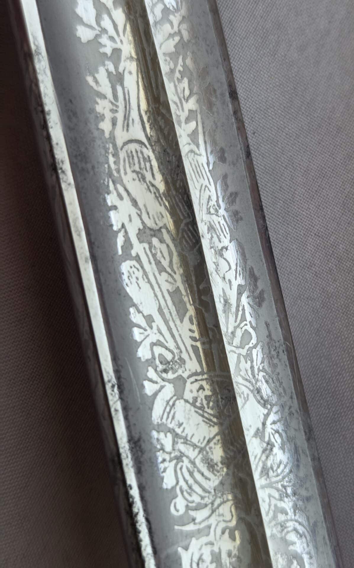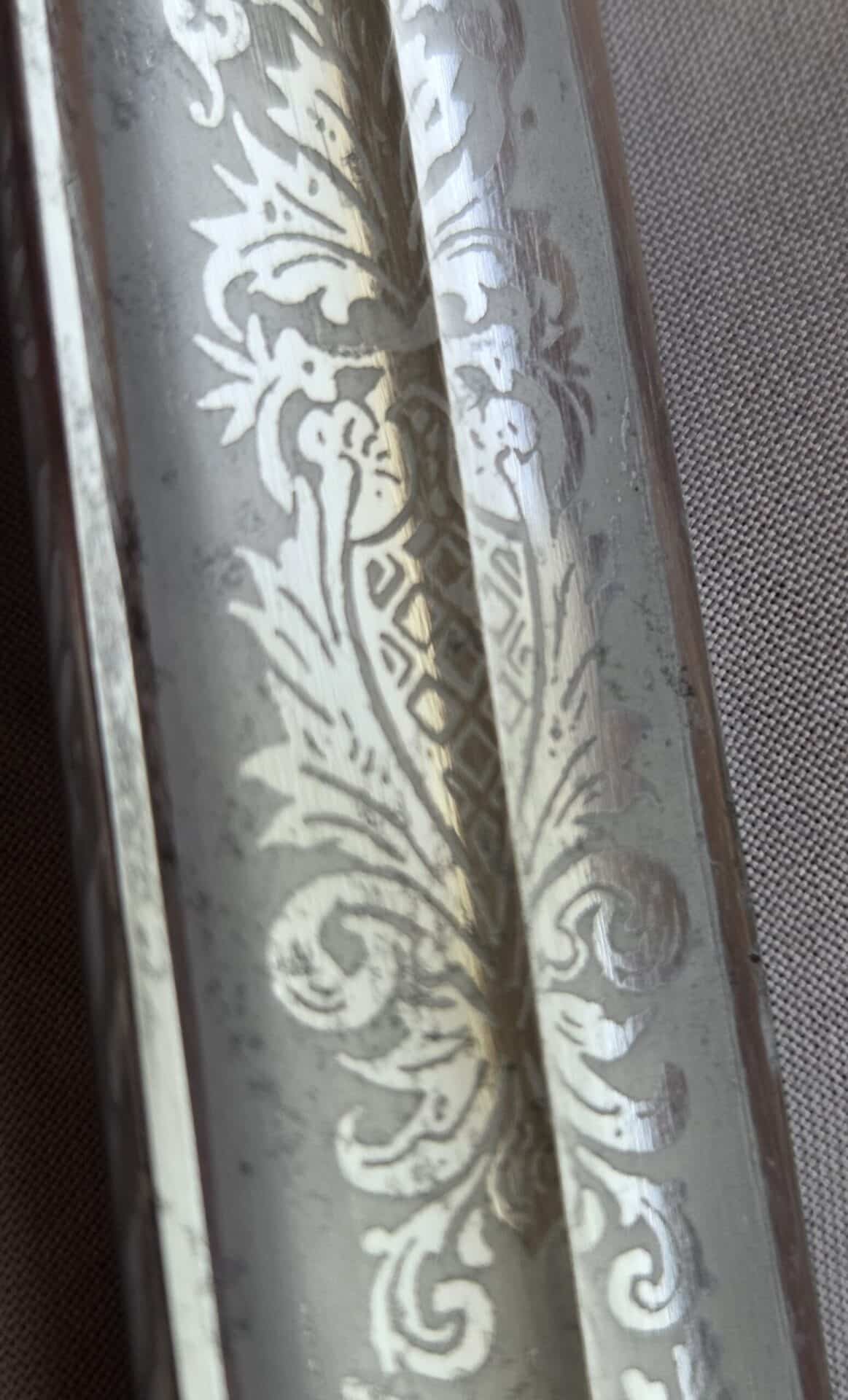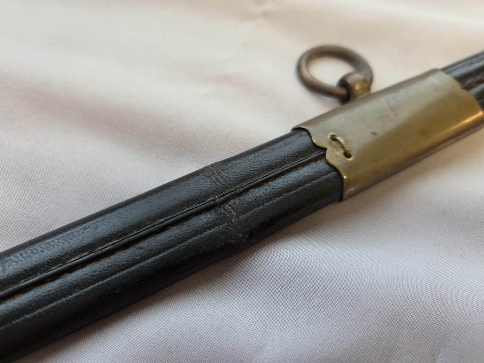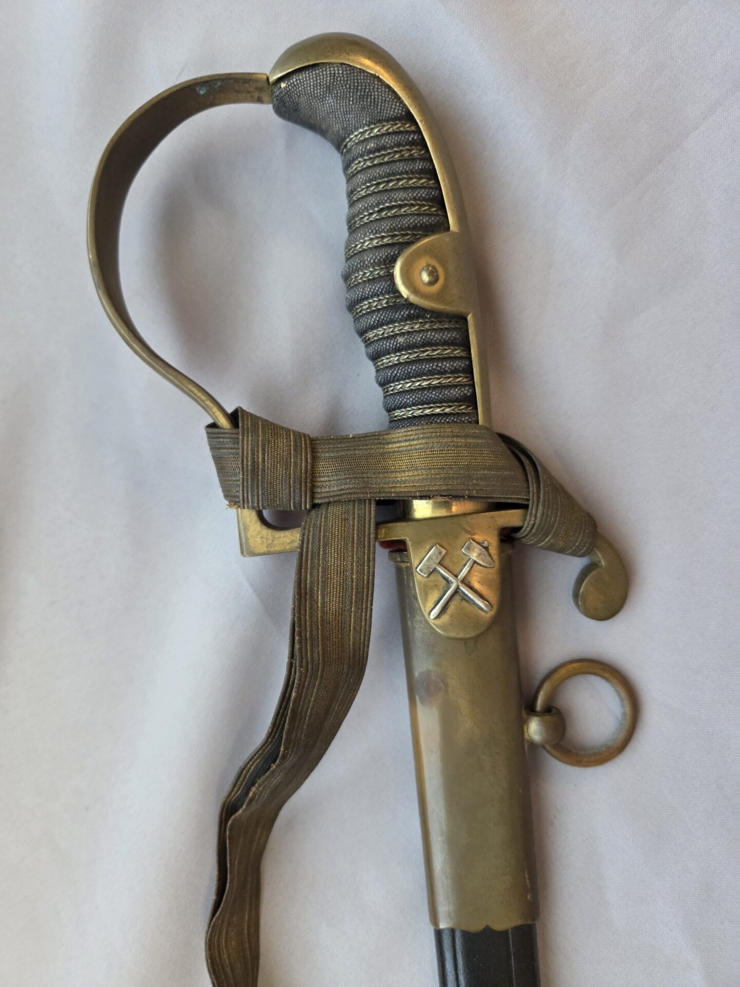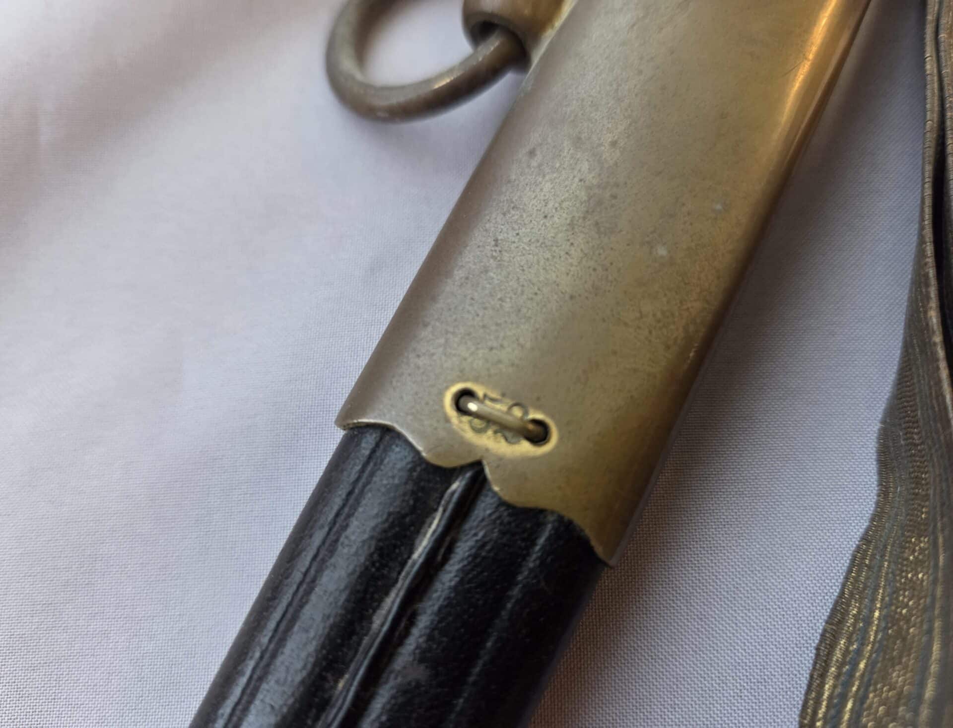 Side-by-side king’s head & knight’s head above WK&C TM. An illustration of this pattern sword appears in the Imperial Weyersberg, Kirschbaum & Cie. Sales catalog as pattern No. 139 (Bergmanns – Schleppsäbel). Plain, gilded brass hilt fittings show normal surface wear with portions of the gilding remaining on pommel/backstrap, knuckle-bow and crossguard. A silver miners’ hammer and mallet insignia of the Mining Service (Bergbau) is pinned to the obverse langet. Black sharkskin grip shows light surface wear with one small nick to sharkskin/wooden base on upper obverse, but no damage to the tight triple-silver wire wrap. Plated, triple-etched blade measuring 32″ in length grades EX+ features 13″ long etched panels on both obverse and reverse with floral and military equipment motifs on light gray frosted background. Both panels, as well as the laurel leaf motif on the blade spine, show only minor wear to the background frosting. Blade shows minor gray speckling but no nicks to cutting edge and is complete with original red felt blade buffer pad. Black leather scabbard shows surface wear/scuffs and one dent just below the middle brass fitting on both sides. No rips, tears or damage to the reverse stitching. Upper, center, and lower gilded brass fittings show traces of gilding and complete with all three retaining staples present. Each brass fitting under the staples is identically numbered “52”. The original Miner’s gold bullion sword knot with black stripes grades EX+ showing stains from wear/age patina, but no rips or fraying.