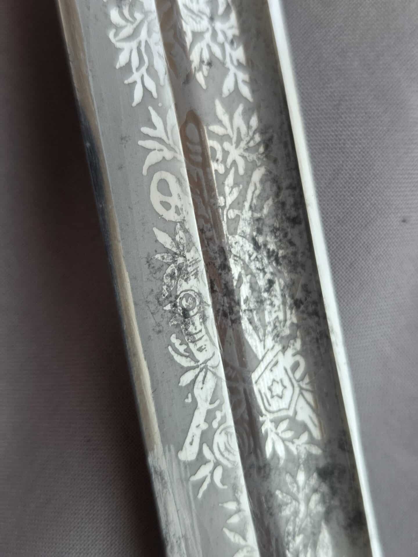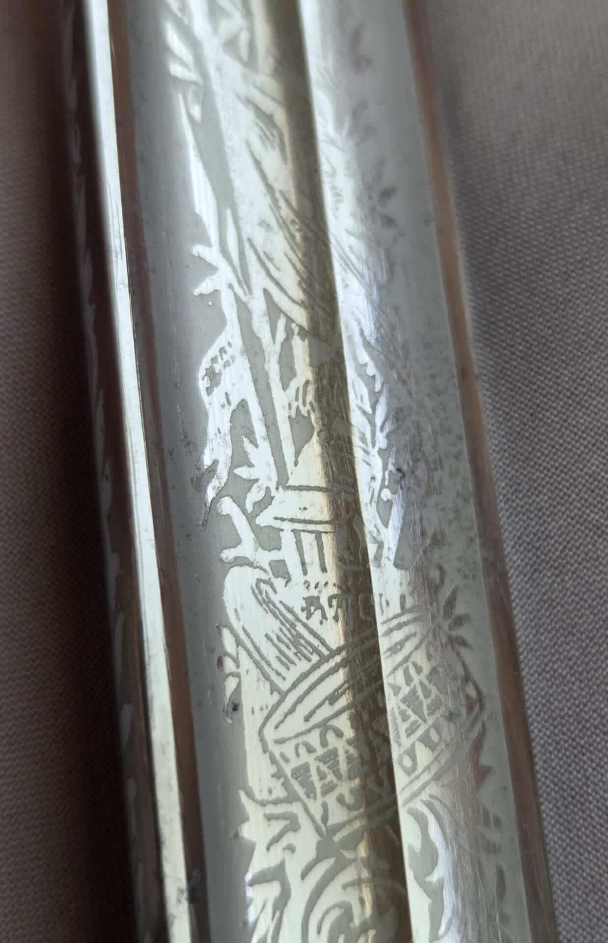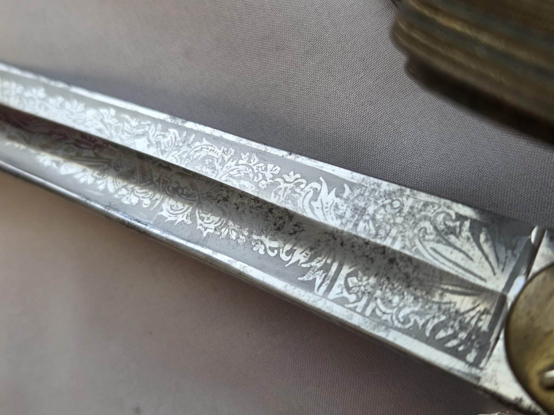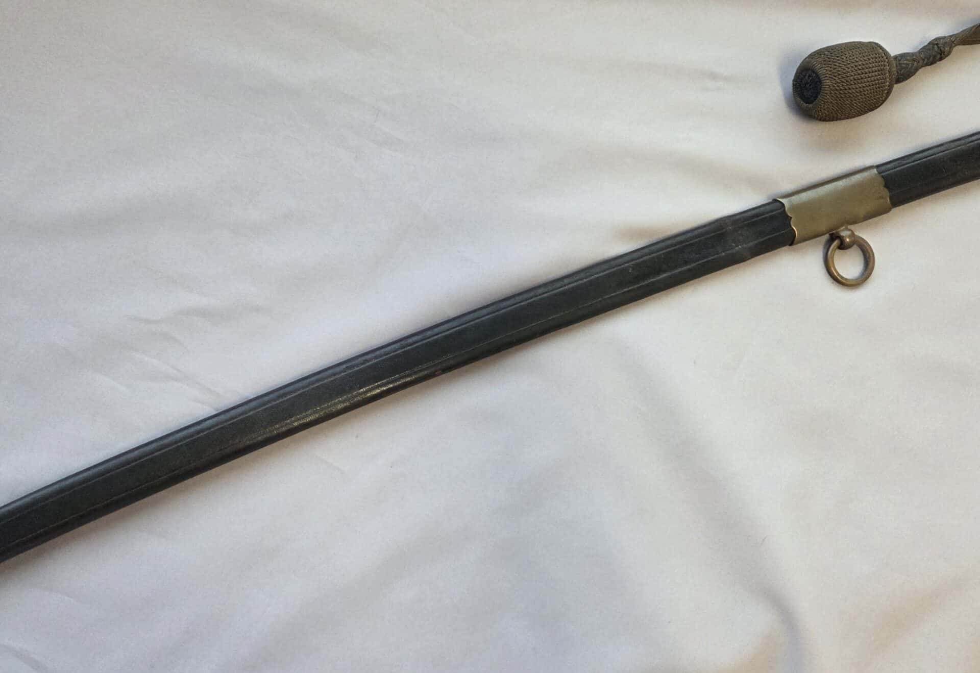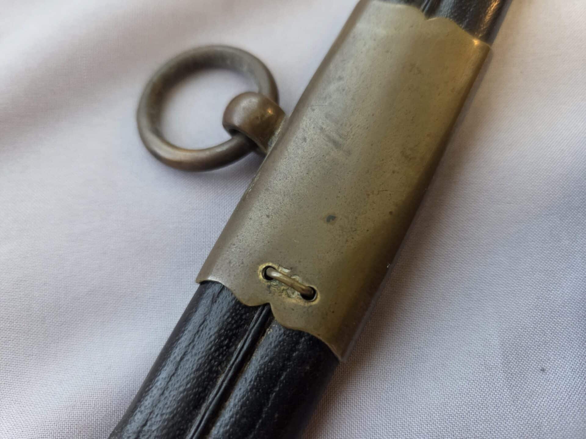 Side-by-side king’s head & knight’s head above WK&C TM. An illustration of this pattern sword appears in the Imperial Weyersberg, Kirschbaum & Cie. Sales catalog as pattern No. 139 (Bergmanns – Schleppsäbel). Plain, gilded brass hilt fittings show normal surface wear with portions of the gilding remaining on pommel/backstrap, knuckle-bow and crossguard. A silver miners’ hammer and mallet insignia of the Mining Service (Bergbau) is pinned to the obverse langet. Black sharkskin grip shows light surface wear with one small nick to sharkskin/wooden base on upper obverse, but no damage to the tight triple-silver wire wrap. Plated, triple-etched blade measuring 32″ in length grades EX+ features 13″ long etched panels on both obverse and reverse with floral and military equipment motifs on light gray frosted background. Both panels, as well as the laurel leaf motif on the blade spine, show only minor wear to the background frosting. Blade shows minor gray speckling but no nicks to cutting edge and is complete with original red felt blade buffer pad. Black leather scabbard shows surface wear/scuffs and one dent just below the middle brass fitting on both sides. No rips, tears or damage to the reverse stitching. Upper, center, and lower gilded brass fittings show traces of gilding and complete with all three retaining staples present. Each brass fitting under the staples is identically numbered “52”. The original Miner’s gold bullion sword knot with black stripes grades EX+ showing stains from wear/age patina, but no rips or fraying.