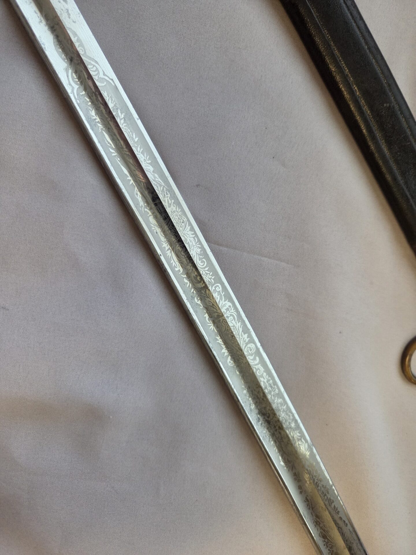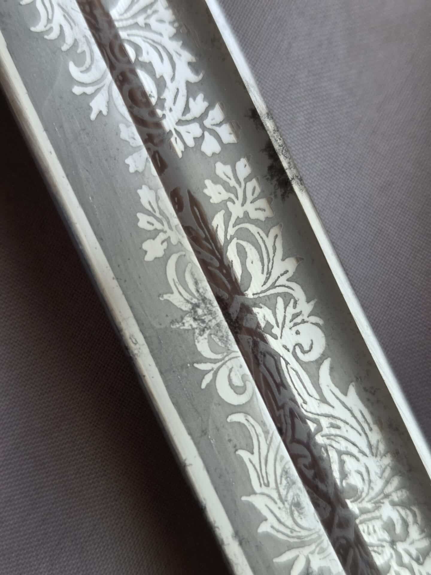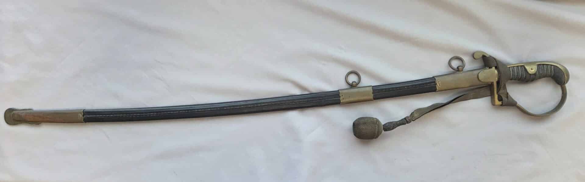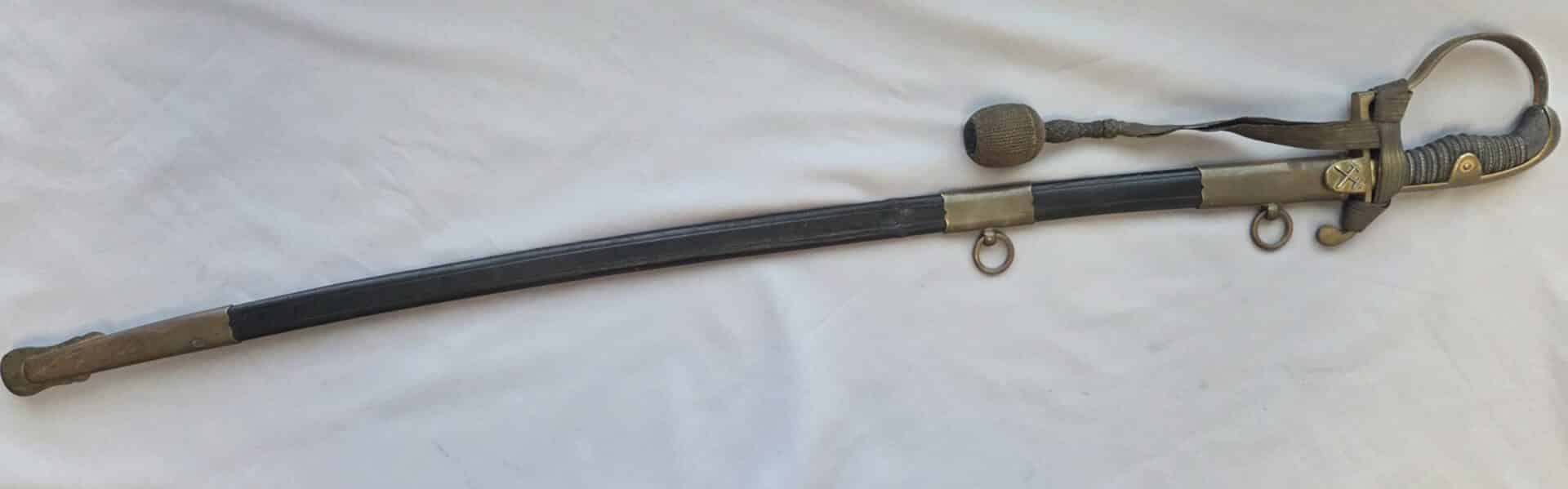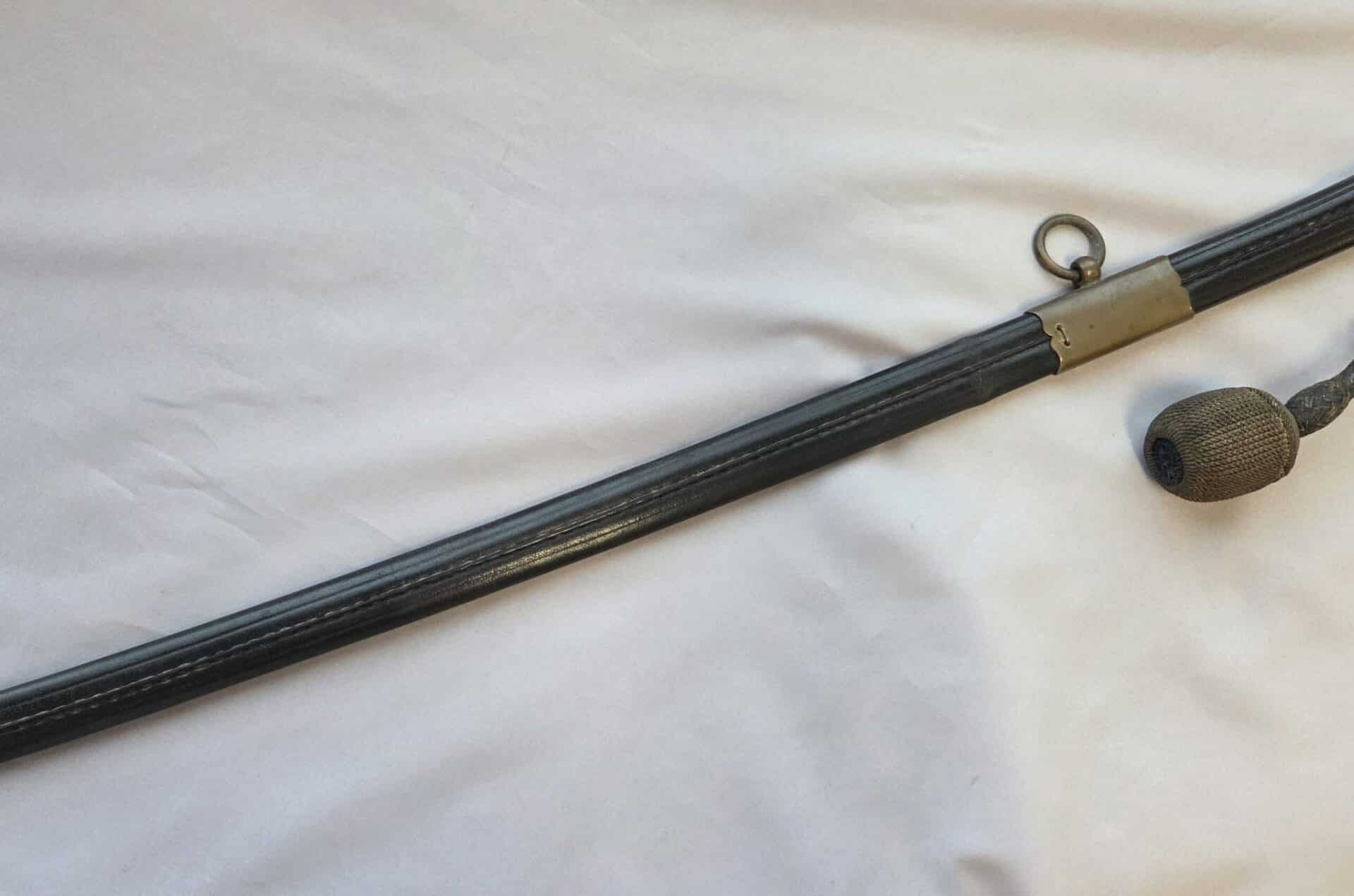 Side-by-side king’s head & knight’s head above WK&C TM. An illustration of this pattern sword appears in the Imperial Weyersberg, Kirschbaum & Cie. Sales catalog as pattern No. 139 (Bergmanns – Schleppsäbel). Plain, gilded brass hilt fittings show normal surface wear with portions of the gilding remaining on pommel/backstrap, knuckle-bow and crossguard. A silver miners’ hammer and mallet insignia of the Mining Service (Bergbau) is pinned to the obverse langet. Black sharkskin grip shows light surface wear with one small nick to sharkskin/wooden base on upper obverse, but no damage to the tight triple-silver wire wrap. Plated, triple-etched blade measuring 32″ in length grades EX+ features 13″ long etched panels on both obverse and reverse with floral and military equipment motifs on light gray frosted background. Both panels, as well as the laurel leaf motif on the blade spine, show only minor wear to the background frosting. Blade shows minor gray speckling but no nicks to cutting edge and is complete with original red felt blade buffer pad. Black leather scabbard shows surface wear/scuffs and one dent just below the middle brass fitting on both sides. No rips, tears or damage to the reverse stitching. Upper, center, and lower gilded brass fittings show traces of gilding and complete with all three retaining staples present. Each brass fitting under the staples is identically numbered “52”. The original Miner’s gold bullion sword knot with black stripes grades EX+ showing stains from wear/age patina, but no rips or fraying.