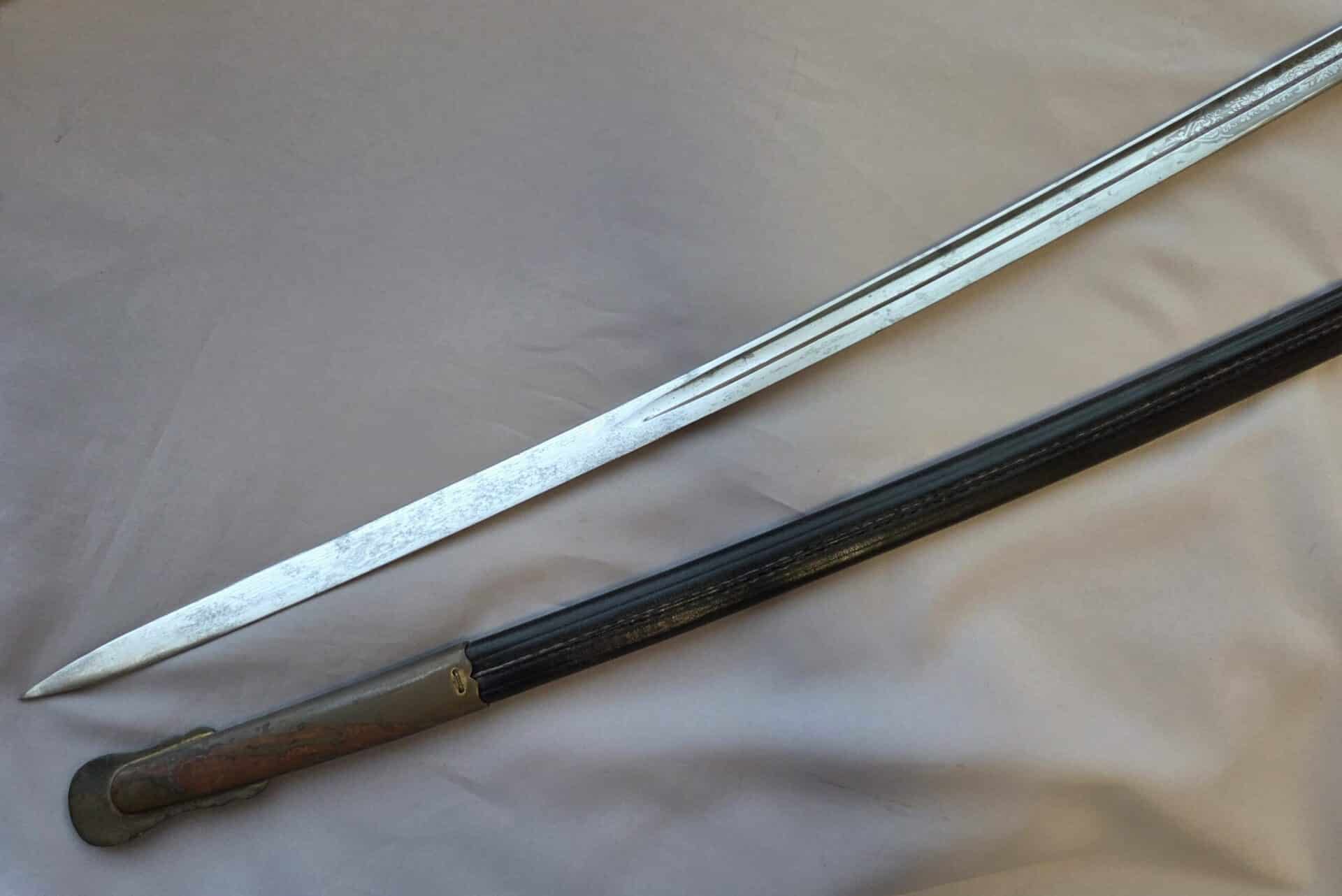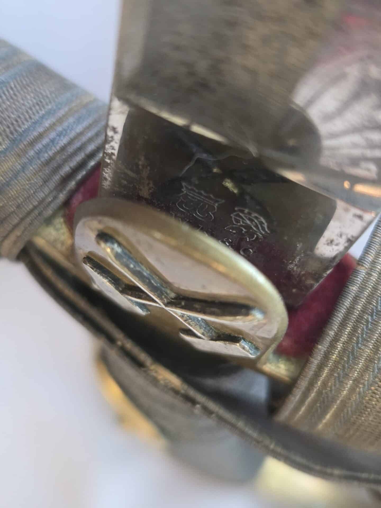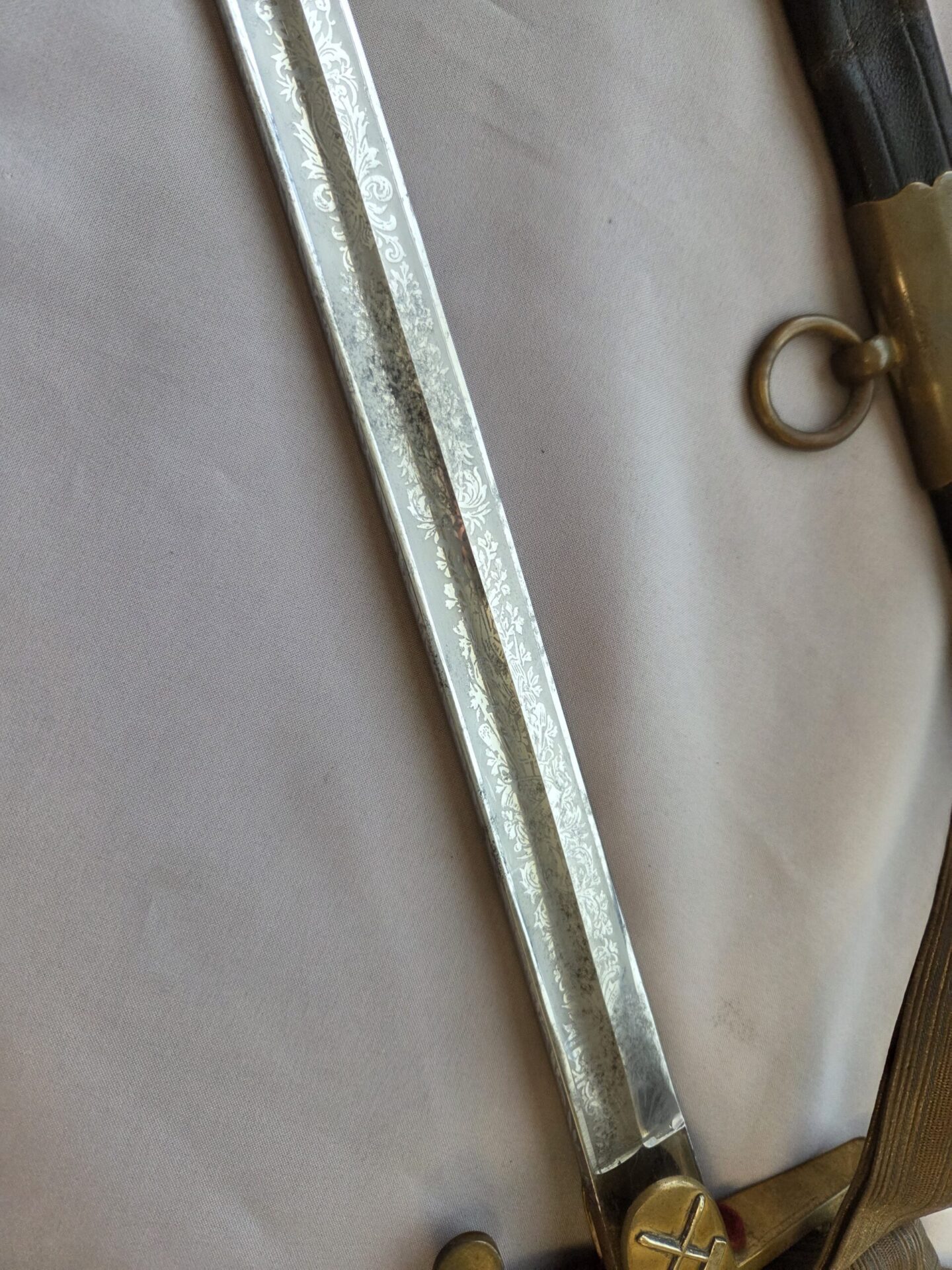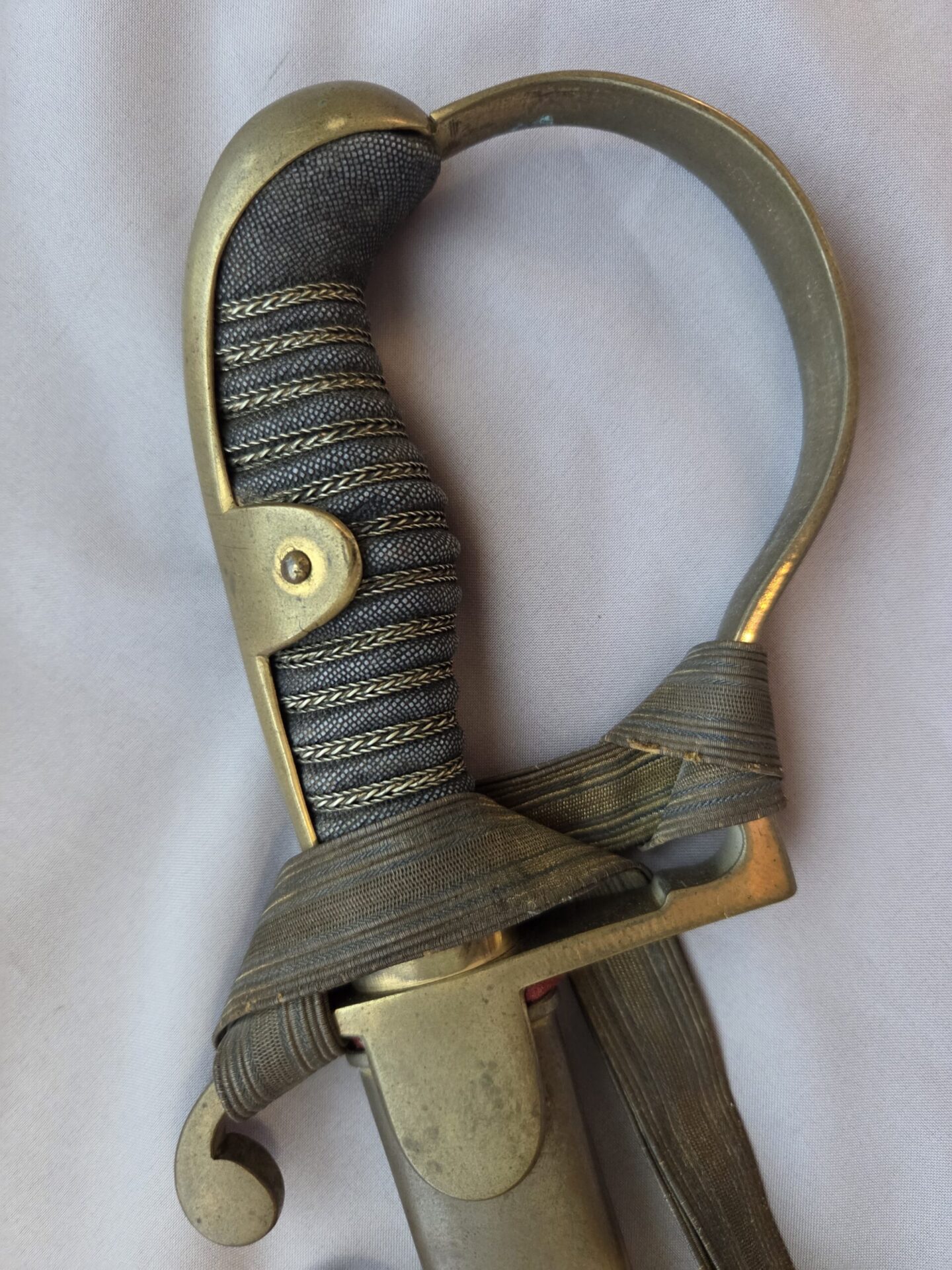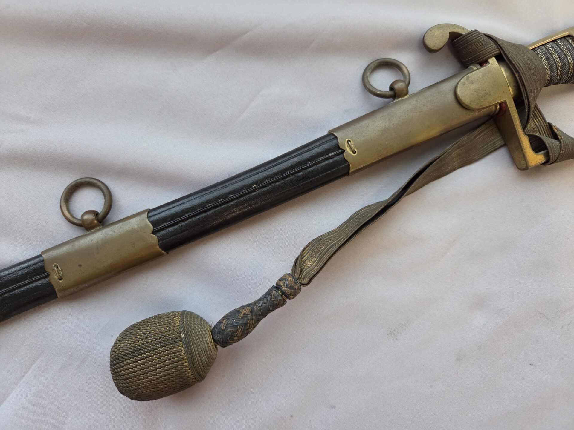 Side-by-side king’s head & knight’s head above WK&C TM. An illustration of this pattern sword appears in the Imperial Weyersberg, Kirschbaum & Cie. Sales catalog as pattern No. 139 (Bergmanns – Schleppsäbel). Plain, gilded brass hilt fittings show normal surface wear with portions of the gilding remaining on pommel/backstrap, knuckle-bow and crossguard. A silver miners’ hammer and mallet insignia of the Mining Service (Bergbau) is pinned to the obverse langet. Black sharkskin grip shows light surface wear with one small nick to sharkskin/wooden base on upper obverse, but no damage to the tight triple-silver wire wrap. Plated, triple-etched blade measuring 32″ in length grades EX+ features 13″ long etched panels on both obverse and reverse with floral and military equipment motifs on light gray frosted background. Both panels, as well as the laurel leaf motif on the blade spine, show only minor wear to the background frosting. Blade shows minor gray speckling but no nicks to cutting edge and is complete with original red felt blade buffer pad. Black leather scabbard shows surface wear/scuffs and one dent just below the middle brass fitting on both sides. No rips, tears or damage to the reverse stitching. Upper, center, and lower gilded brass fittings show traces of gilding and complete with all three retaining staples present. Each brass fitting under the staples is identically numbered “52”. The original Miner’s gold bullion sword knot with black stripes grades EX+ showing stains from wear/age patina, but no rips or fraying.