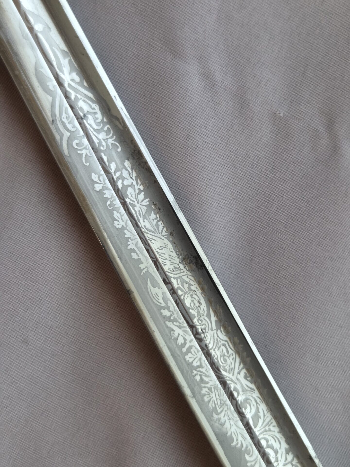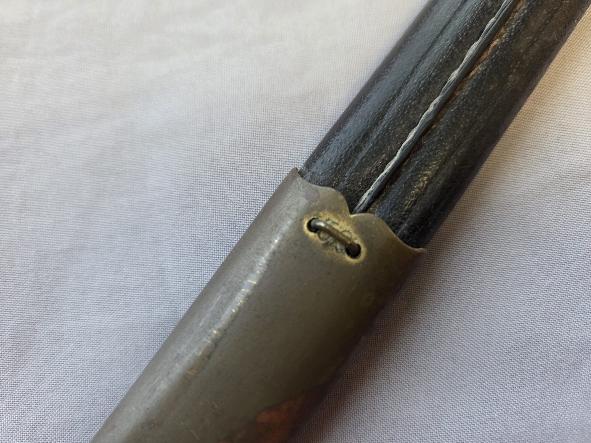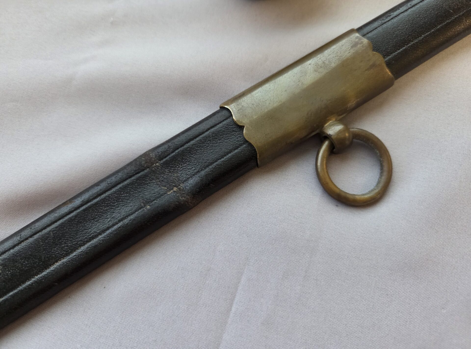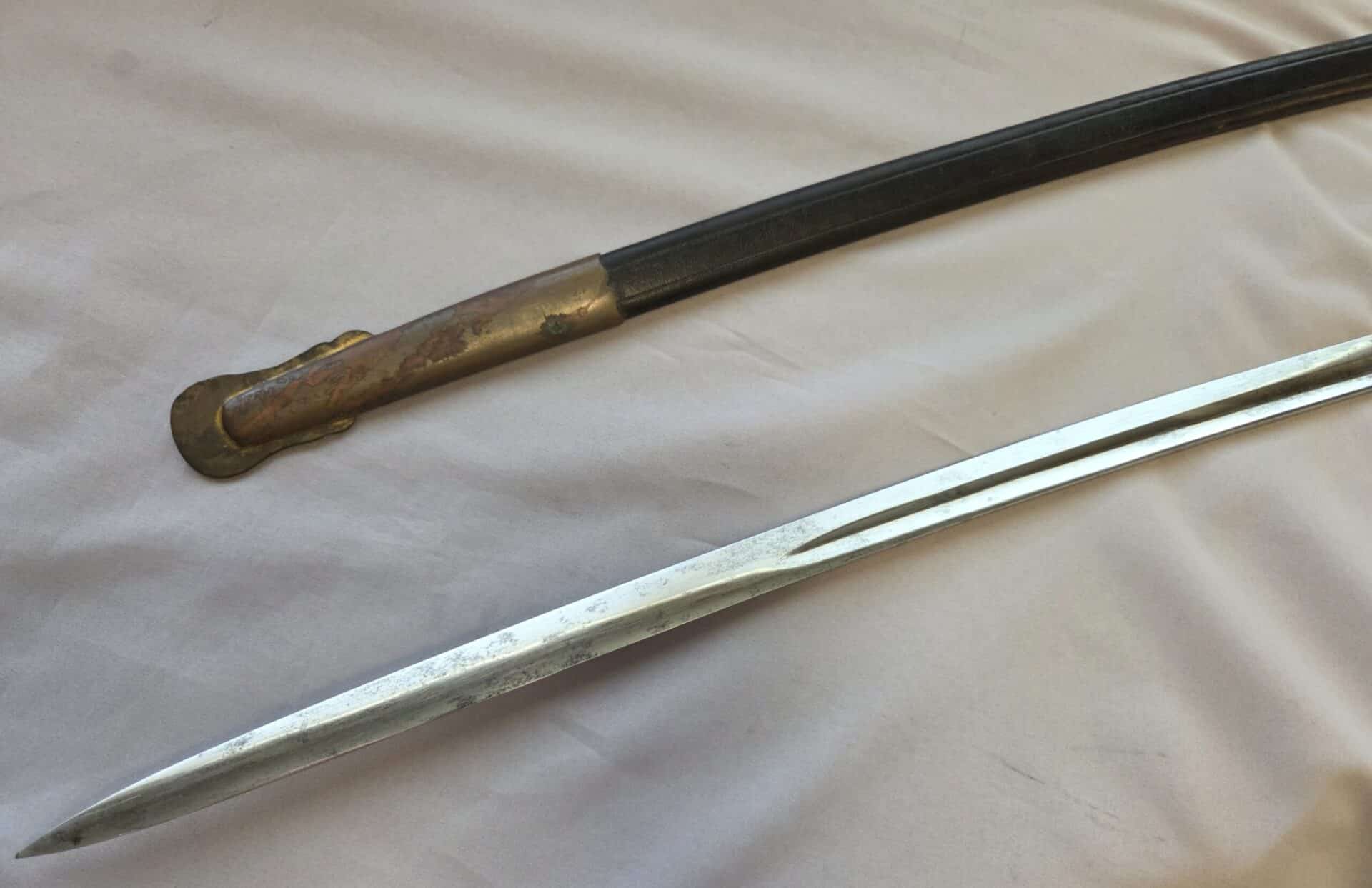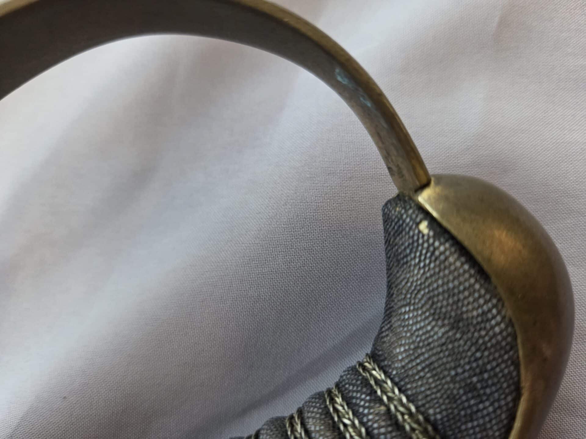 Side-by-side king’s head & knight’s head above WK&C TM. An illustration of this pattern sword appears in the Imperial Weyersberg, Kirschbaum & Cie. Sales catalog as pattern No. 139 (Bergmanns – Schleppsäbel). Plain, gilded brass hilt fittings show normal surface wear with portions of the gilding remaining on pommel/backstrap, knuckle-bow and crossguard. A silver miners’ hammer and mallet insignia of the Mining Service (Bergbau) is pinned to the obverse langet. Black sharkskin grip shows light surface wear with one small nick to sharkskin/wooden base on upper obverse, but no damage to the tight triple-silver wire wrap. Plated, triple-etched blade measuring 32″ in length grades EX+ features 13″ long etched panels on both obverse and reverse with floral and military equipment motifs on light gray frosted background. Both panels, as well as the laurel leaf motif on the blade spine, show only minor wear to the background frosting. Blade shows minor gray speckling but no nicks to cutting edge and is complete with original red felt blade buffer pad. Black leather scabbard shows surface wear/scuffs and one dent just below the middle brass fitting on both sides. No rips, tears or damage to the reverse stitching. Upper, center, and lower gilded brass fittings show traces of gilding and complete with all three retaining staples present. Each brass fitting under the staples is identically numbered “52”. The original Miner’s gold bullion sword knot with black stripes grades EX+ showing stains from wear/age patina, but no rips or fraying.
