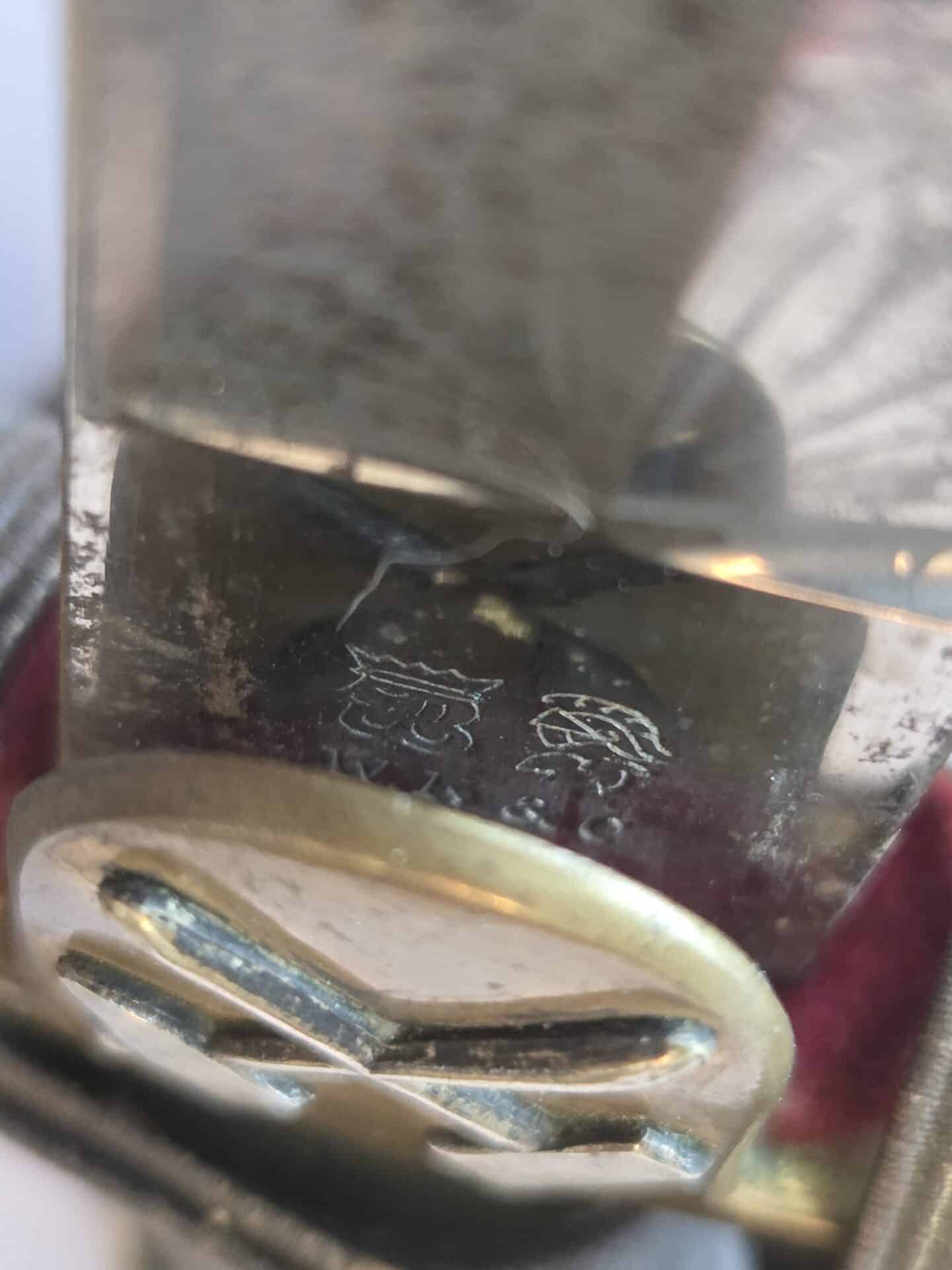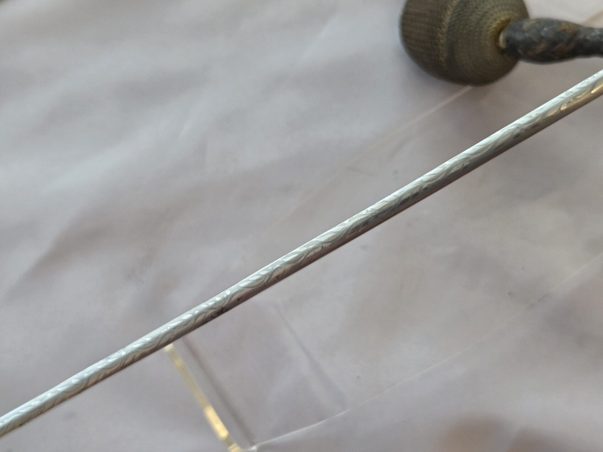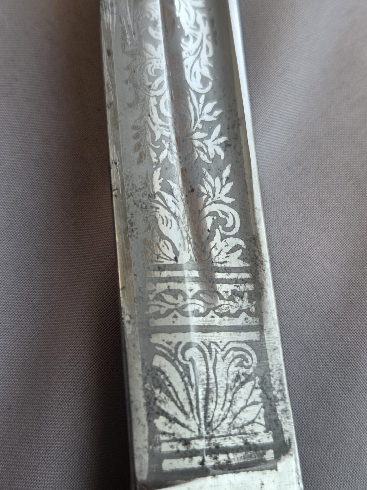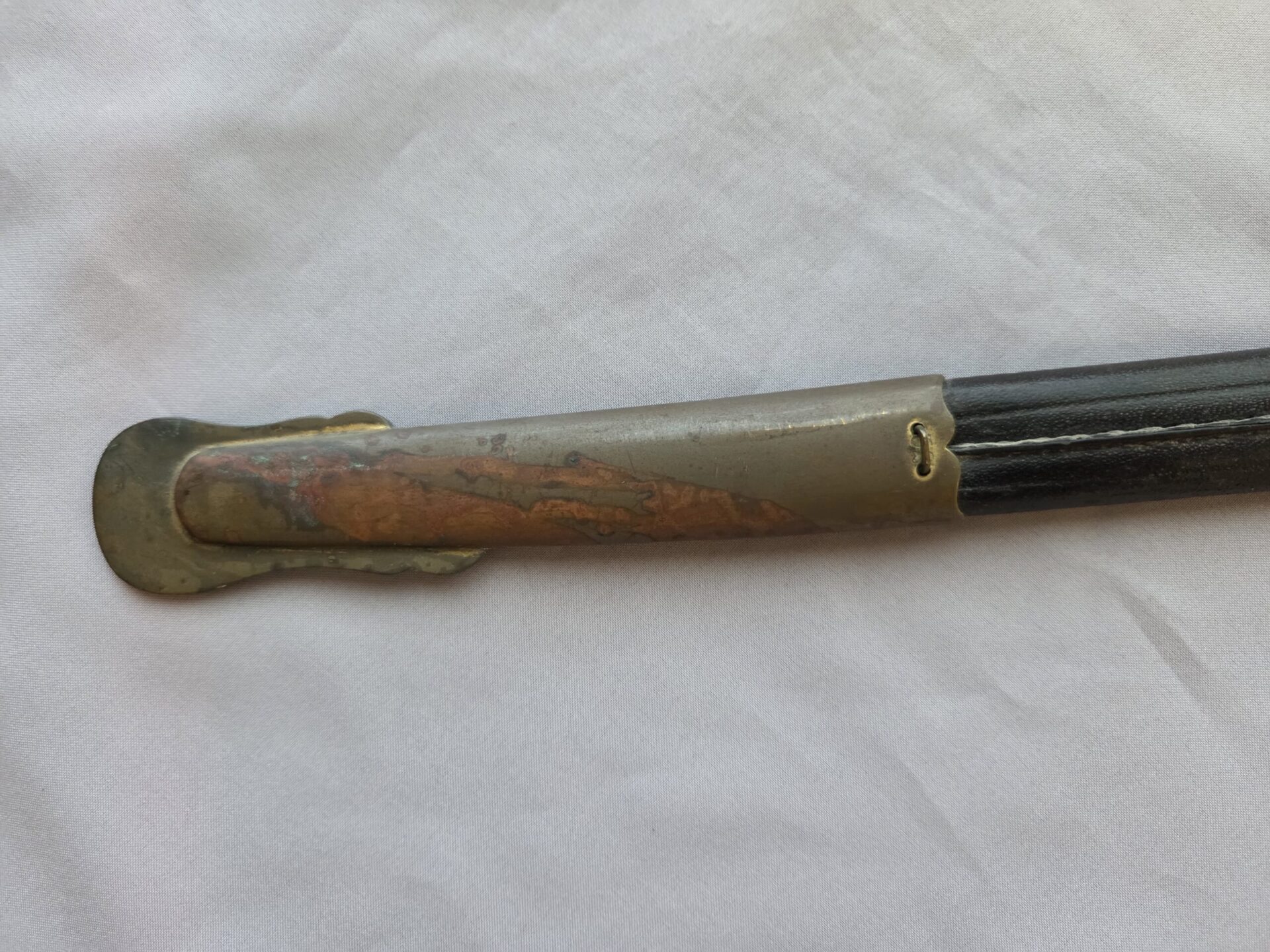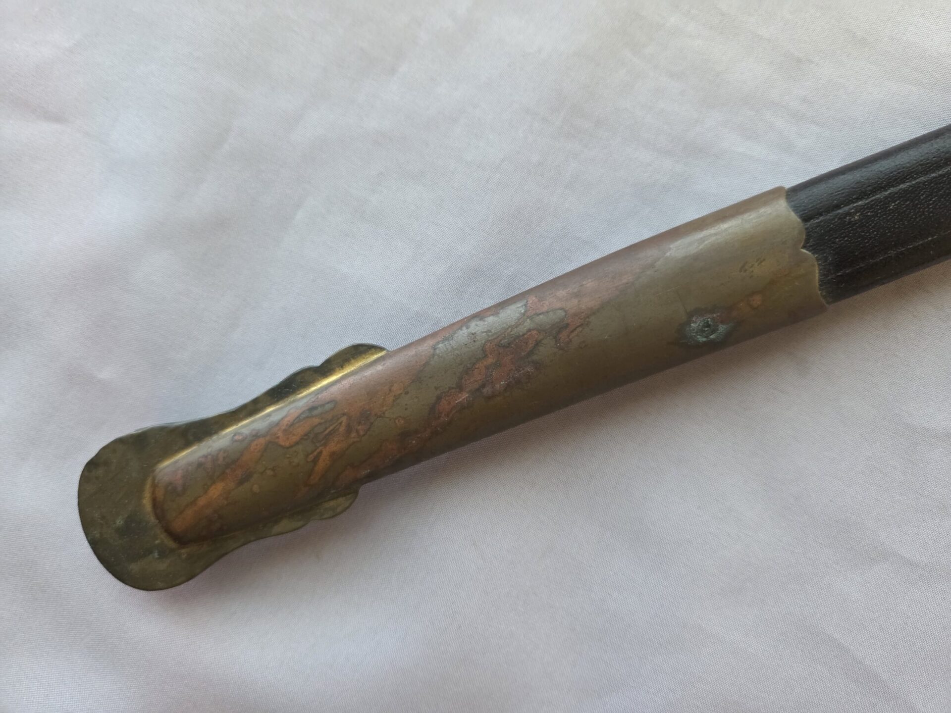 Side-by-side king’s head & knight’s head above WK&C TM. An illustration of this pattern sword appears in the Imperial Weyersberg, Kirschbaum & Cie. Sales catalog as pattern No. 139 (Bergmanns – Schleppsäbel). Plain, gilded brass hilt fittings show normal surface wear with portions of the gilding remaining on pommel/backstrap, knuckle-bow and crossguard. A silver miners’ hammer and mallet insignia of the Mining Service (Bergbau) is pinned to the obverse langet. Black sharkskin grip shows light surface wear with one small nick to sharkskin/wooden base on upper obverse, but no damage to the tight triple-silver wire wrap. Plated, triple-etched blade measuring 32″ in length grades EX+ features 13″ long etched panels on both obverse and reverse with floral and military equipment motifs on light gray frosted background. Both panels, as well as the laurel leaf motif on the blade spine, show only minor wear to the background frosting. Blade shows minor gray speckling but no nicks to cutting edge and is complete with original red felt blade buffer pad. Black leather scabbard shows surface wear/scuffs and one dent just below the middle brass fitting on both sides. No rips, tears or damage to the reverse stitching. Upper, center, and lower gilded brass fittings show traces of gilding and complete with all three retaining staples present. Each brass fitting under the staples is identically numbered “52”. The original Miner’s gold bullion sword knot with black stripes grades EX+ showing stains from wear/age patina, but no rips or fraying.