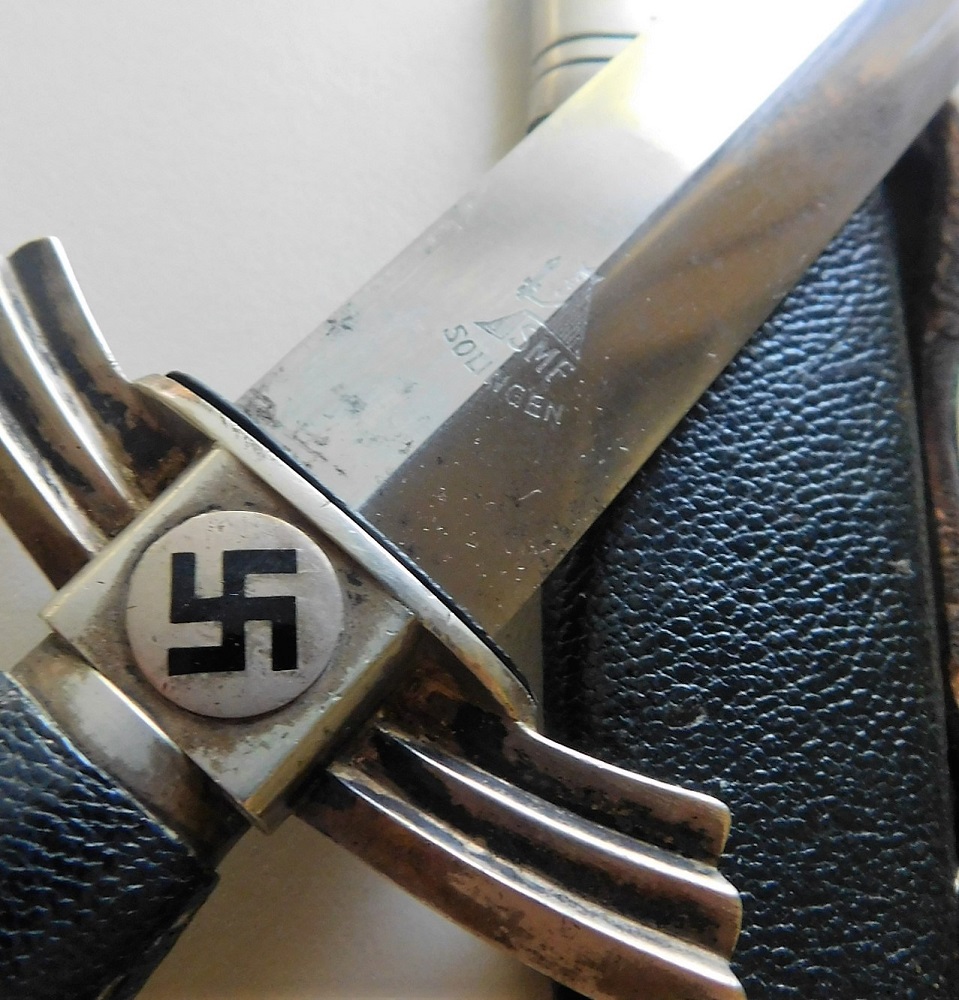 SMF, SOLINGEN with seated king holding sword TM. Nickel-silver hilt fittings show some wear and patina to exposed surfaces with near-perfect black enamel on the crossguard quillon block swastikas. The tip of the right crossguard is stamped with the letter “K” with the tip of the left crossguard marked with the waffenamt. The underside of the crossguard is stamped with “TS2” and “125.” The blue leather covered grip shows some surface wear with no rips, tears or fading to the leather but very slight lifting to seam. Blade grades EX+ showing surface wear/runner marks and speckling throughout and is complete with blue leather blade buffer pad. Dent-free, blue leather covered scabbard shows almost NO surface wear and and grades EX++. Nickel-silver scabbard fittings show light wear and age patina and are complete with undamaged scabbard screws, with one minor dent to lower ball. Scabbard throat is stamped with the NSFK Icarus symbol and waffenamt, along with “N” and “206”. The integral black leather hanger is complete with silver planchet, unmarked clip and grades EX- showing much surface wear but no rips or tears to leather.