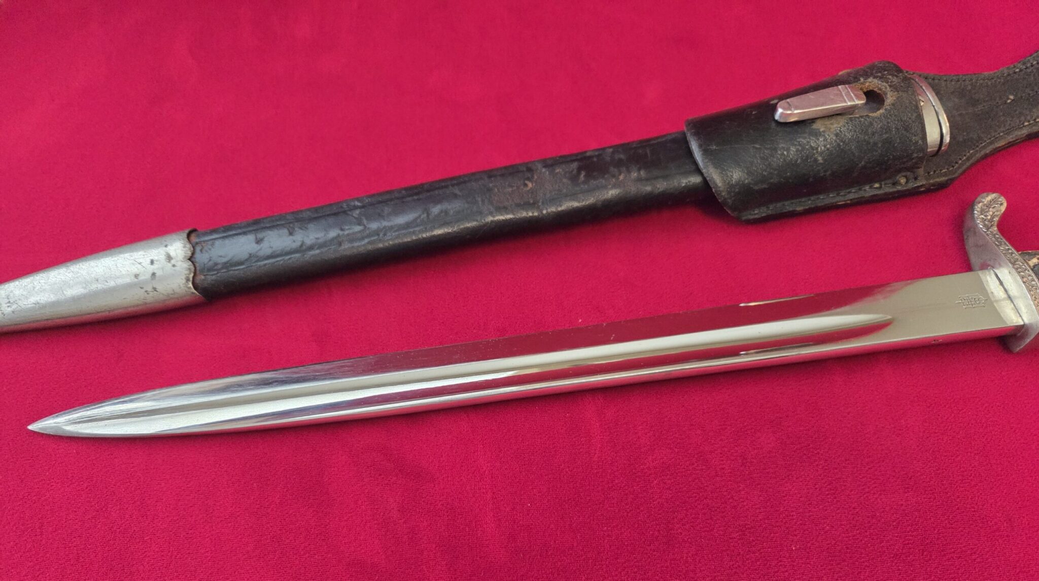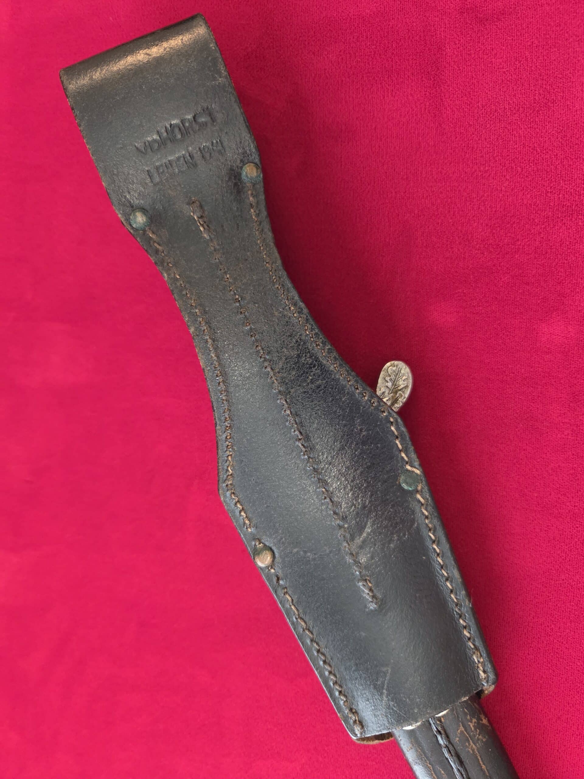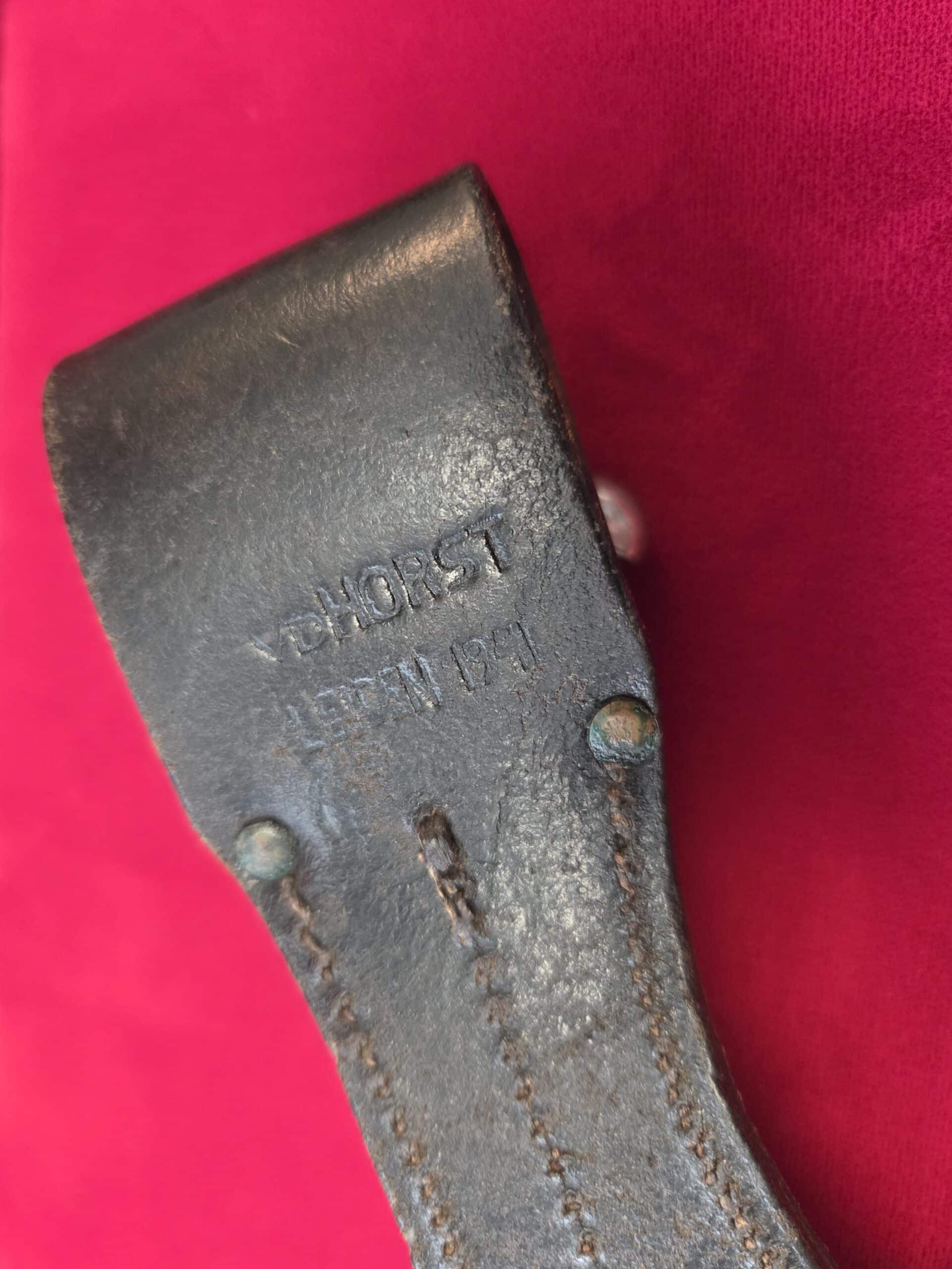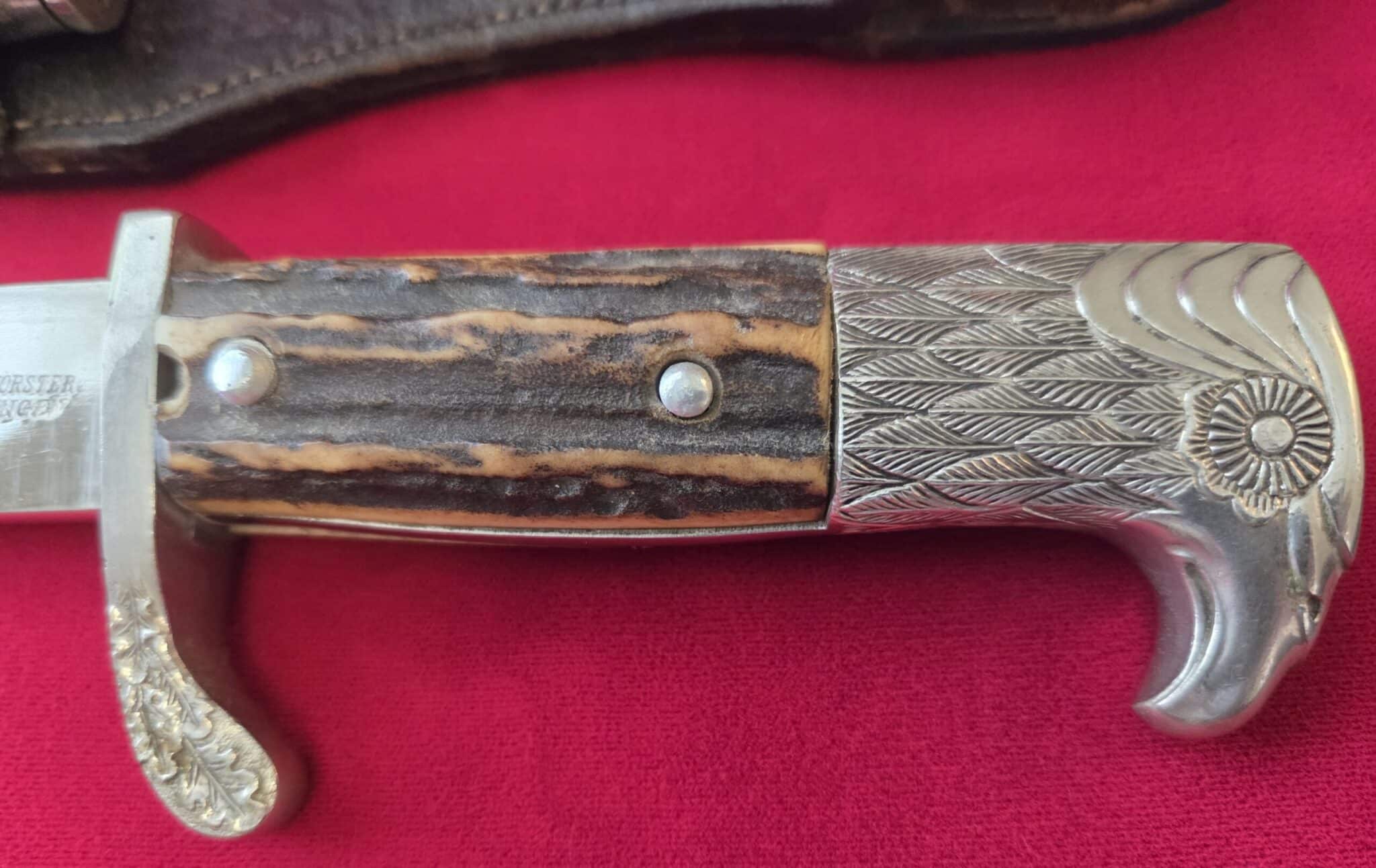 Double maker marked blade with reverse stamped in two parallel lines E.F. HORSTER and SOLINGEN. Obverse stamped with stylized double H, S and sword. Silver hilt fittings show light surface wear to eagle head pommel and oak leaf embellished crossguard. Dark brown, shortened stag horn grip plates show virtually no surface wear with no cracks and one chip on reverse side above crossguard. Third Reich period police grip emblem with eagle surmounted by oak leaf wreath shows almost no wear. Plated blade grades EX++ showing minor surface wear/runner marks and minor speckling/graying to plating. Blade is correctly marked on the spine with asterisk over the letter “K”. Black leather scabbard and scabbard fittings show surface wear but no dents. Black frog grades EX++/Near MINT and is marked on the back “vdHORST, LEIDEN 1941”.