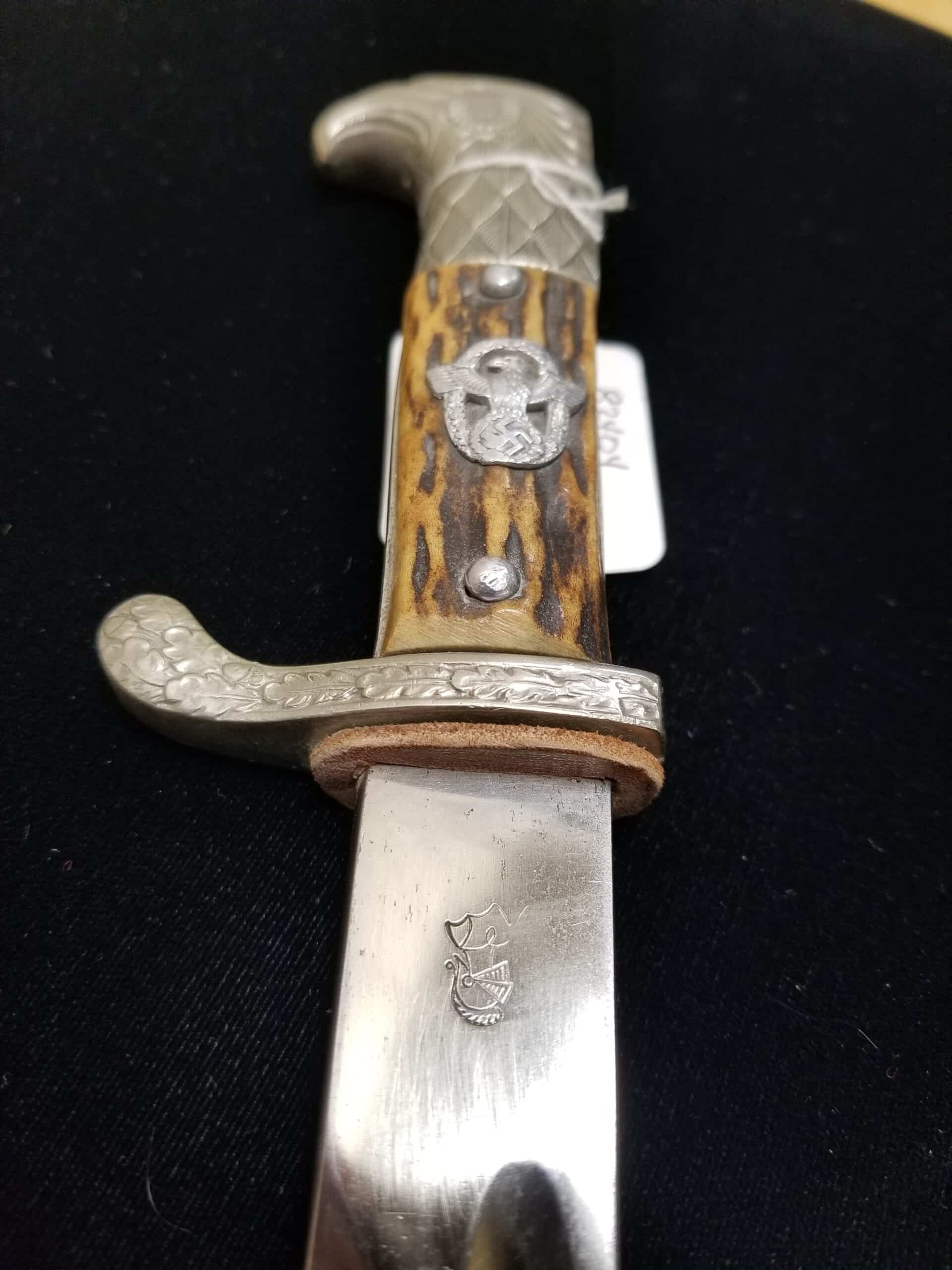 This bayonet is double stamped with the “Weyersberg, Kirschbaum & Cie., Solingen” on reverse and the knight’s head emblem on the obverse side. The edge of the blade has the numbers “B367” and the blade has speckling throughout. The grip is in MINT condition with stag grip plates showing no damage. The wreathed national eagle grip emblem is properly set and also in MINT condition. The eagle head pommel numbered “05” near the crossguard plus the oakleaf crossguard are in great shape, showing only very minor wear and age. The original leather buffer pad is present. The scabbard is black leather, has rippling down the obverse side from age and wear and has a crack in the leather along the left edging approximately 1.5” long. The upper scabbard fitting is numbered “B328”, engraved with “Augsburg 1939” and has the original screw in place. The lower scabbard fitting has a couple dents near the ball which also has a couple small dings. It has its original frog, made of black patent leather and shows some age deterioration, however the leather remains supple as so often they become rock hard and brittle. The reverse side of the oakleaf crossguard and the upper fitting on the scabbard have matching numbers “S.B. 5546”.