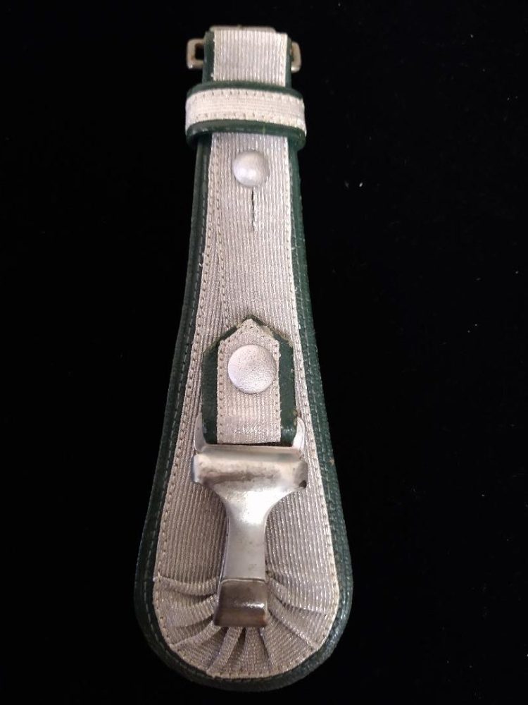 Shows no wear to green leather backing, aluminum bullion facing, nor nickel-plated clip. Appropriate for Army, Police or Waffen-SS swords. Rare accoutrement in flawless condition. MINT
