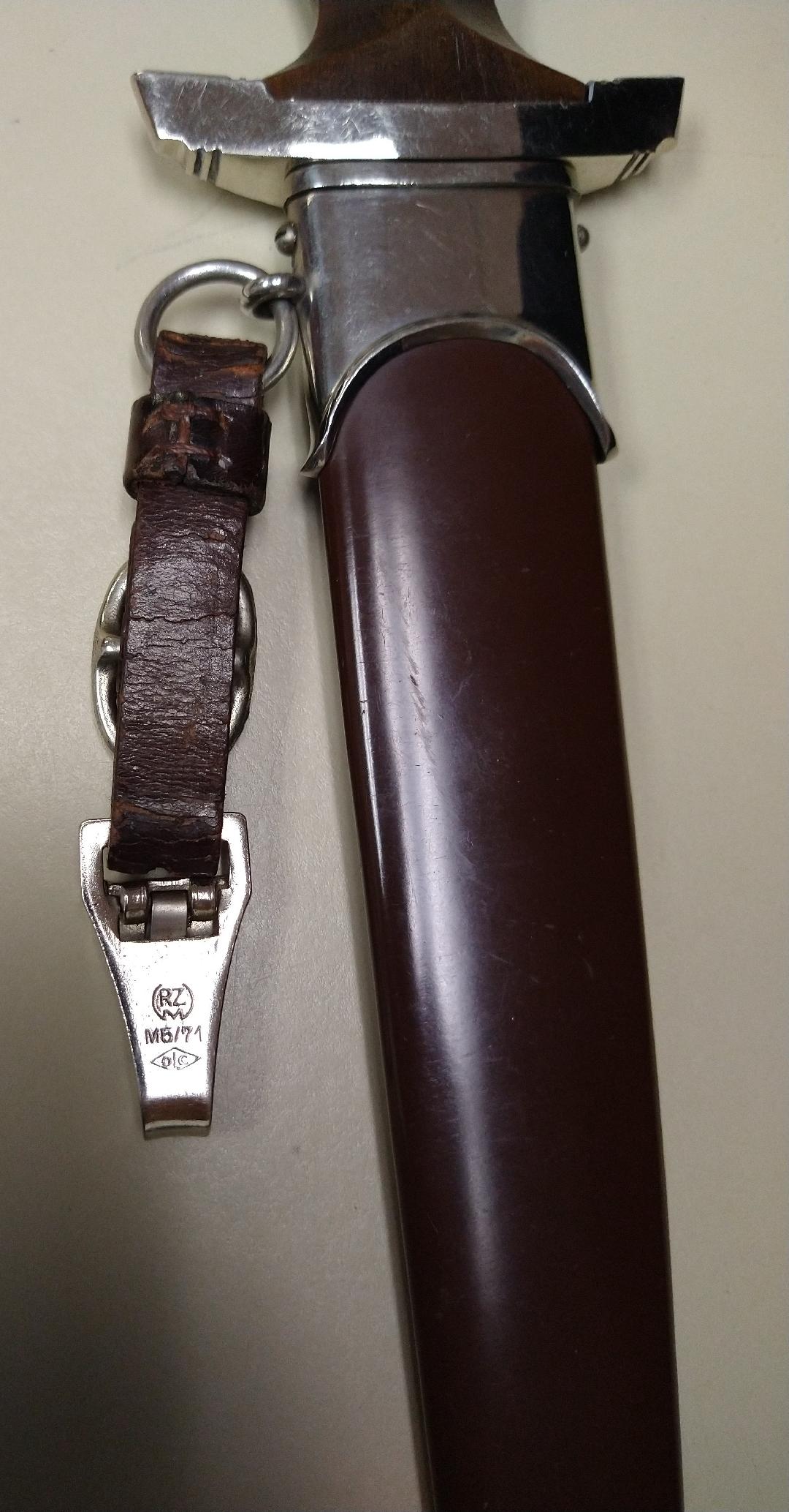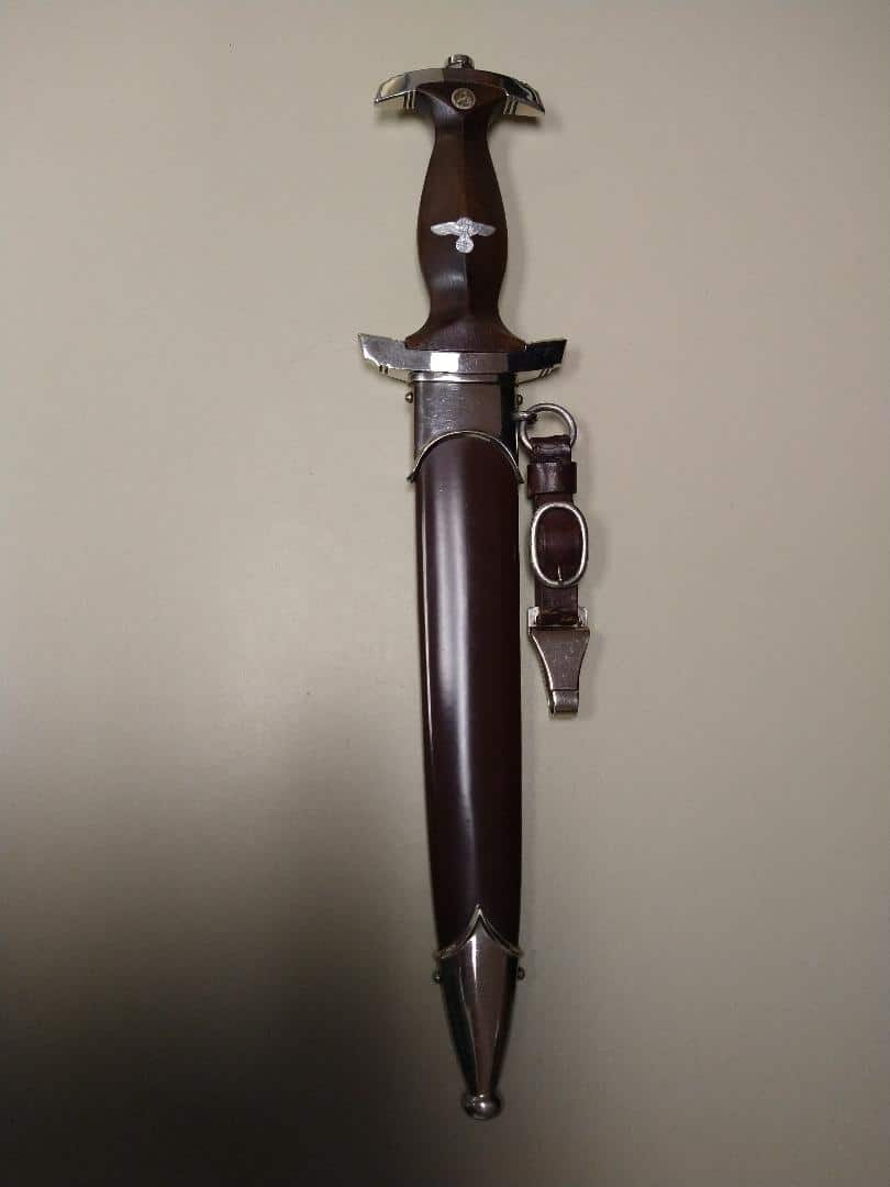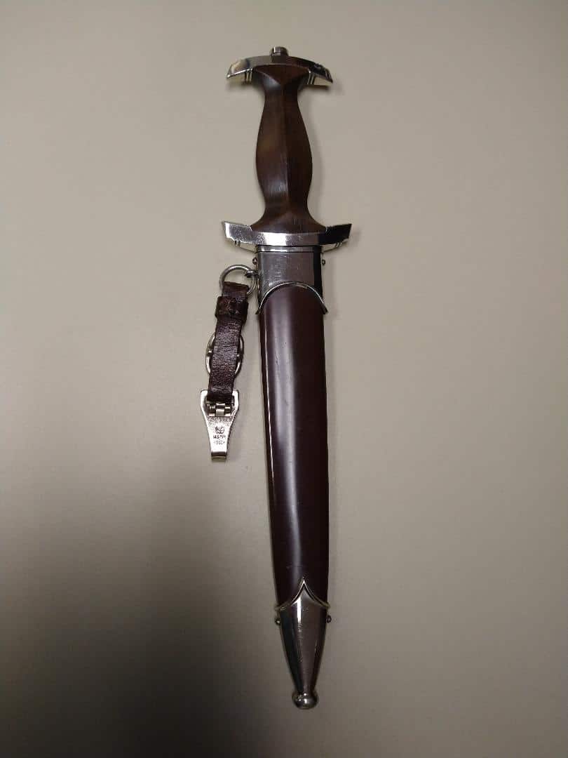 “RZM 7/66” marked and dated “1941”. Aluminum grip eagle and SA insert properly inset. Blade grades Exc++ with no nicks to cutting edge, deeply etched motto retains nearly 100% of light gray background frosting and has has some runner marks. Scabbard retains 99% paint and has one small dent in ball of the bottom fitting. Complete with a hanger that is “RZM M5/71 OLC” marked. Exc++