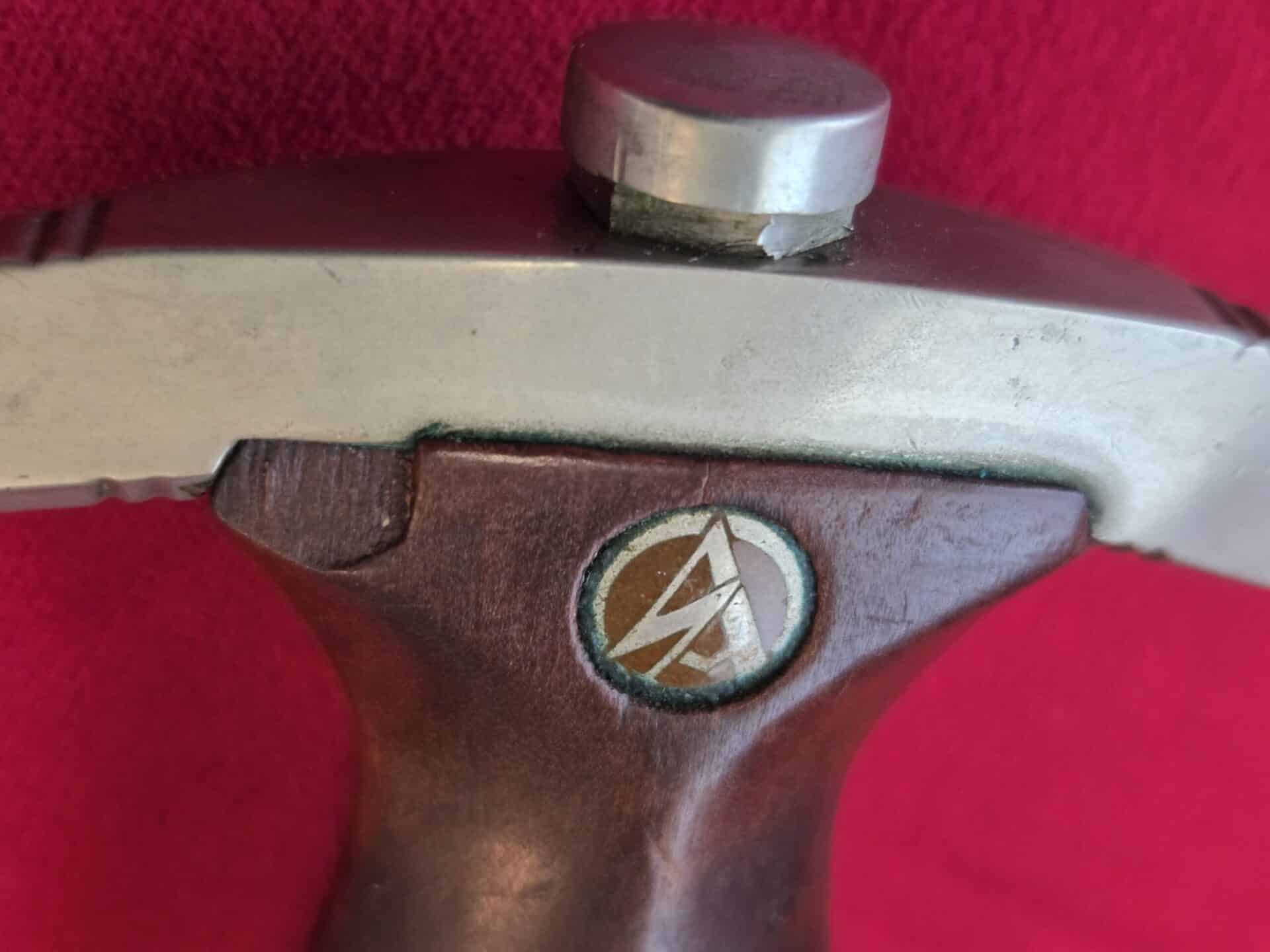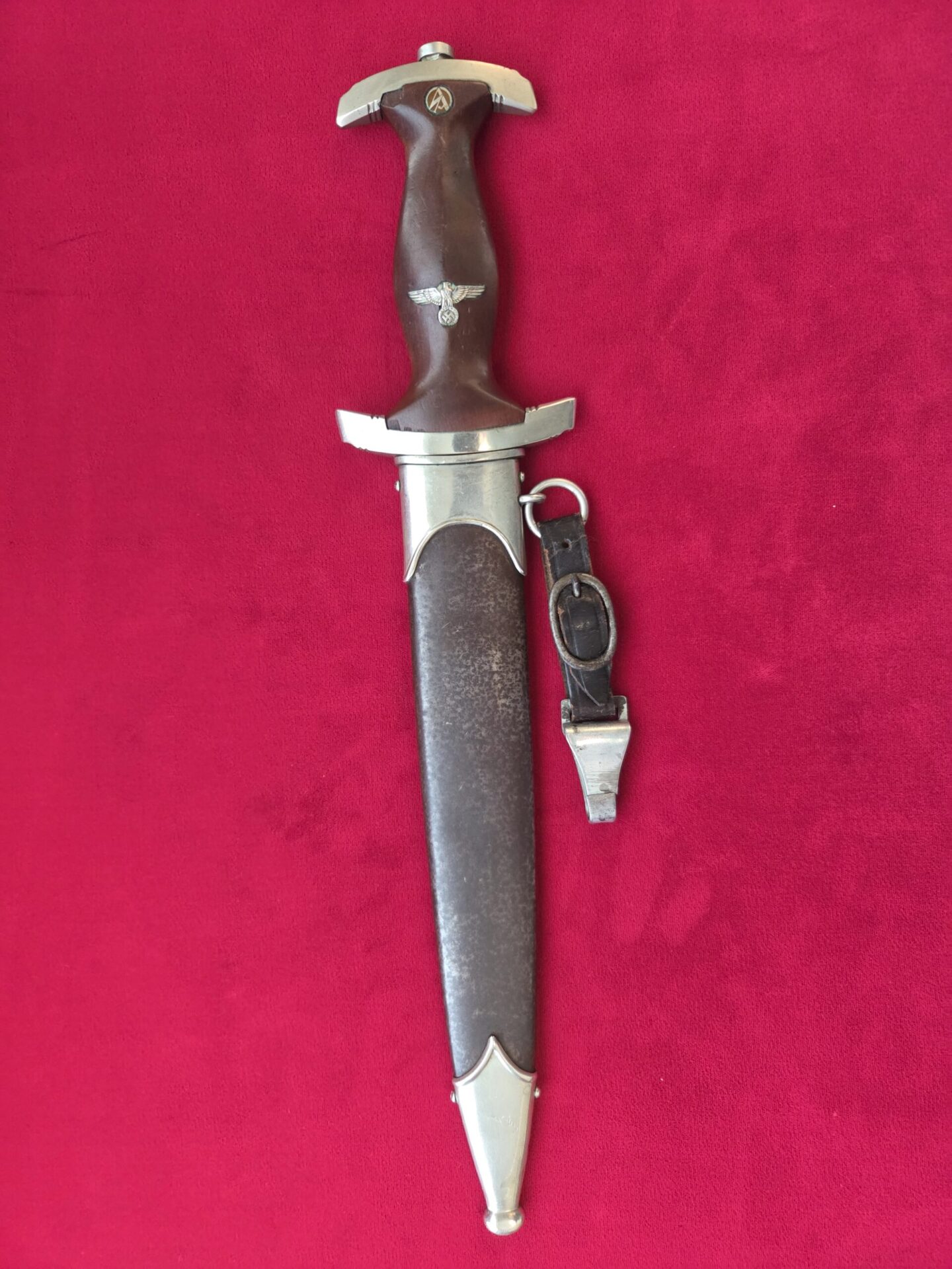 H&M circled by Herbertz & Meurer – Solingen trademark. It rates 8 out of 10 on McSarr’s SA rarity rating. The blade grades an Exc with graying/speckling throughout, some nicks to cutting edge, and motto retains 90% of its’ frosting. The hilt fittings are nickel silver and show normal age/wear. The lower crossguard reverse has the “He” marking for Hessen. The brown grip has a couple chips on the obverse side; one near the upper crossguard and one near the lower crossguard. The nickel silver eagle insert and SA roundel are both properly set. Anodized scabbard is missing the majority of its paint but is dent free. The scabbard fittings show wear with scratches on the lower fitting and a couple minor dents in the ball. All four scabbard screws remain in place. The hanger is RZM marked L2/338/141 on the reverse side as well as the clip is also RZM marked M5/74 olc.